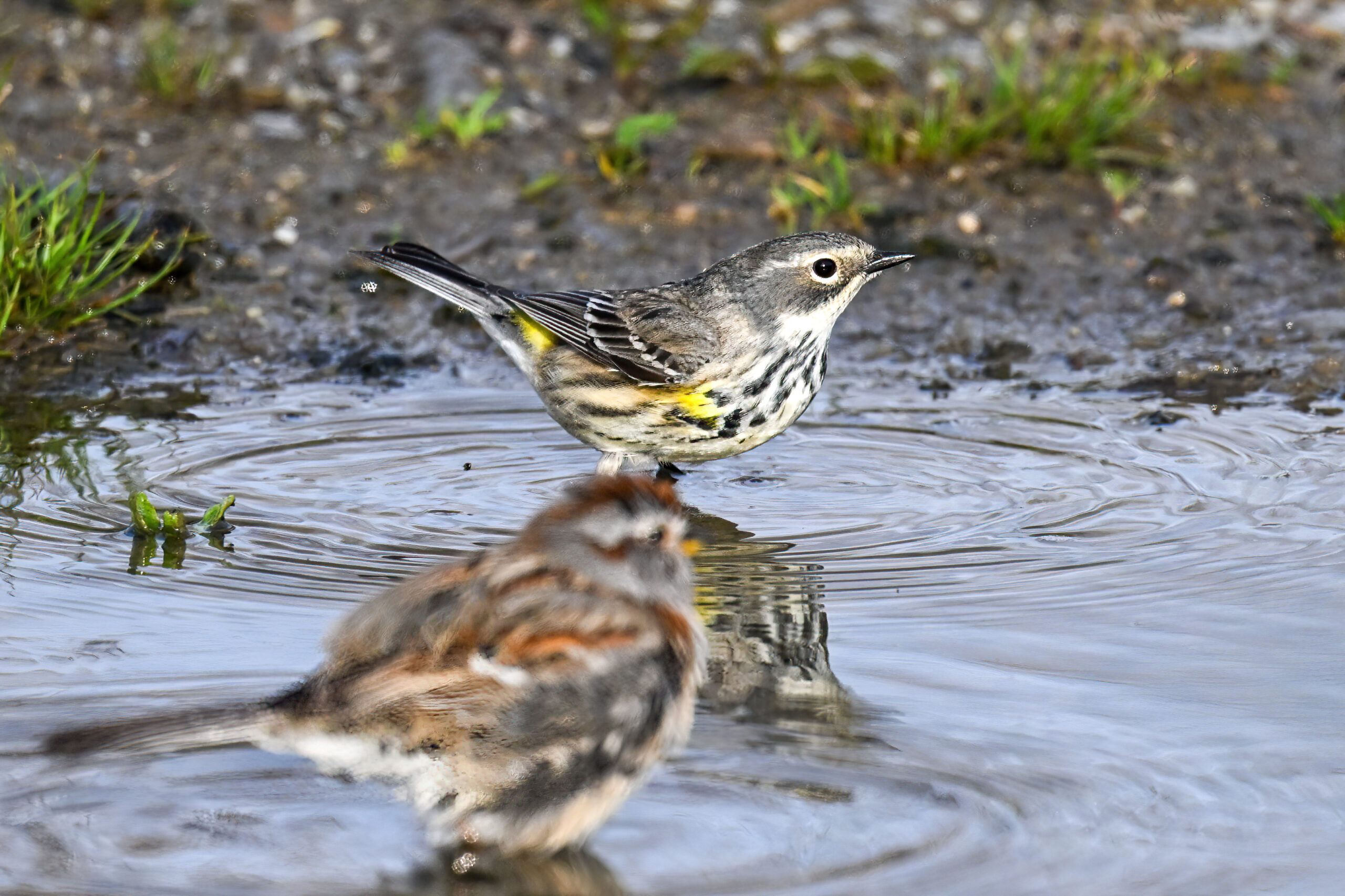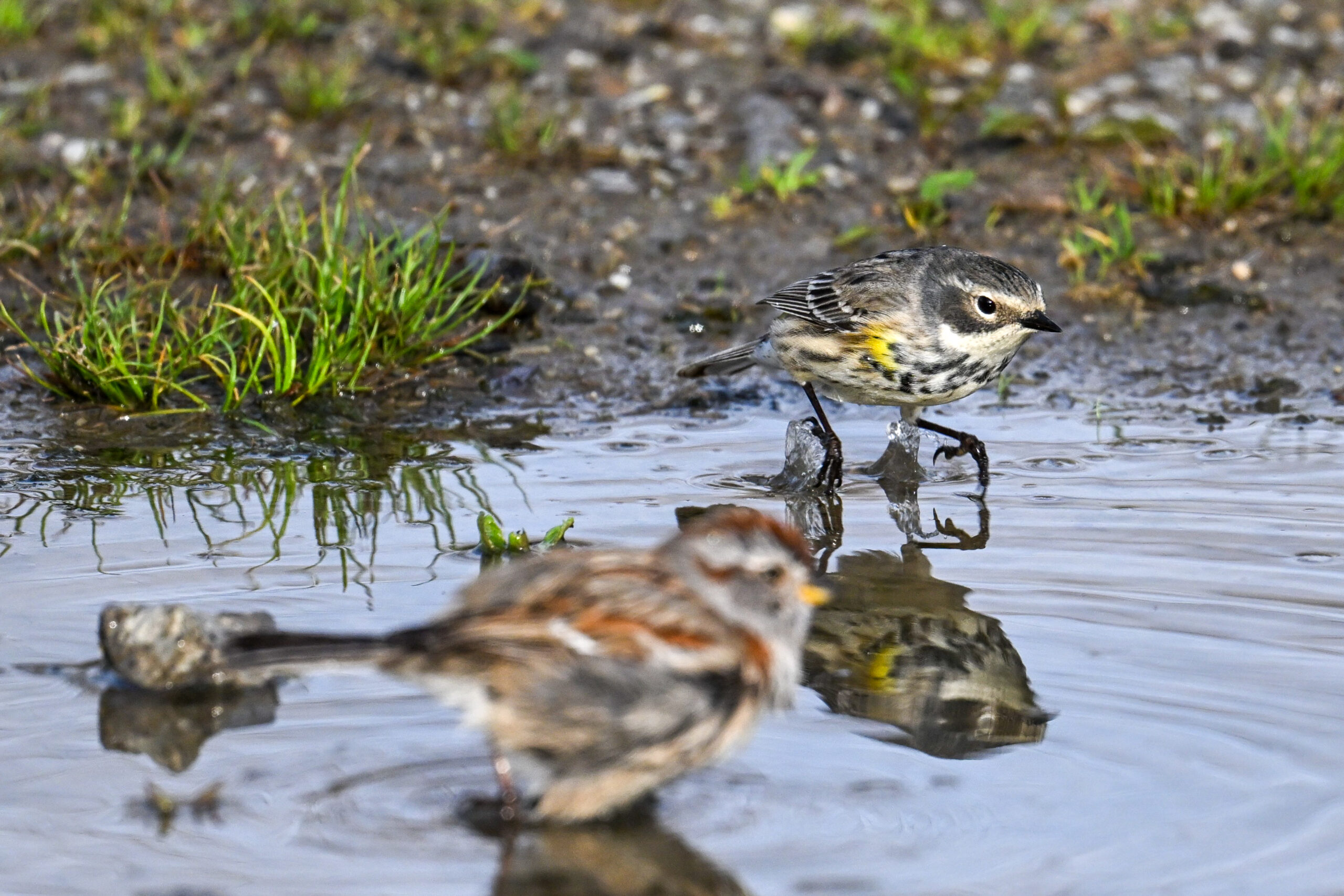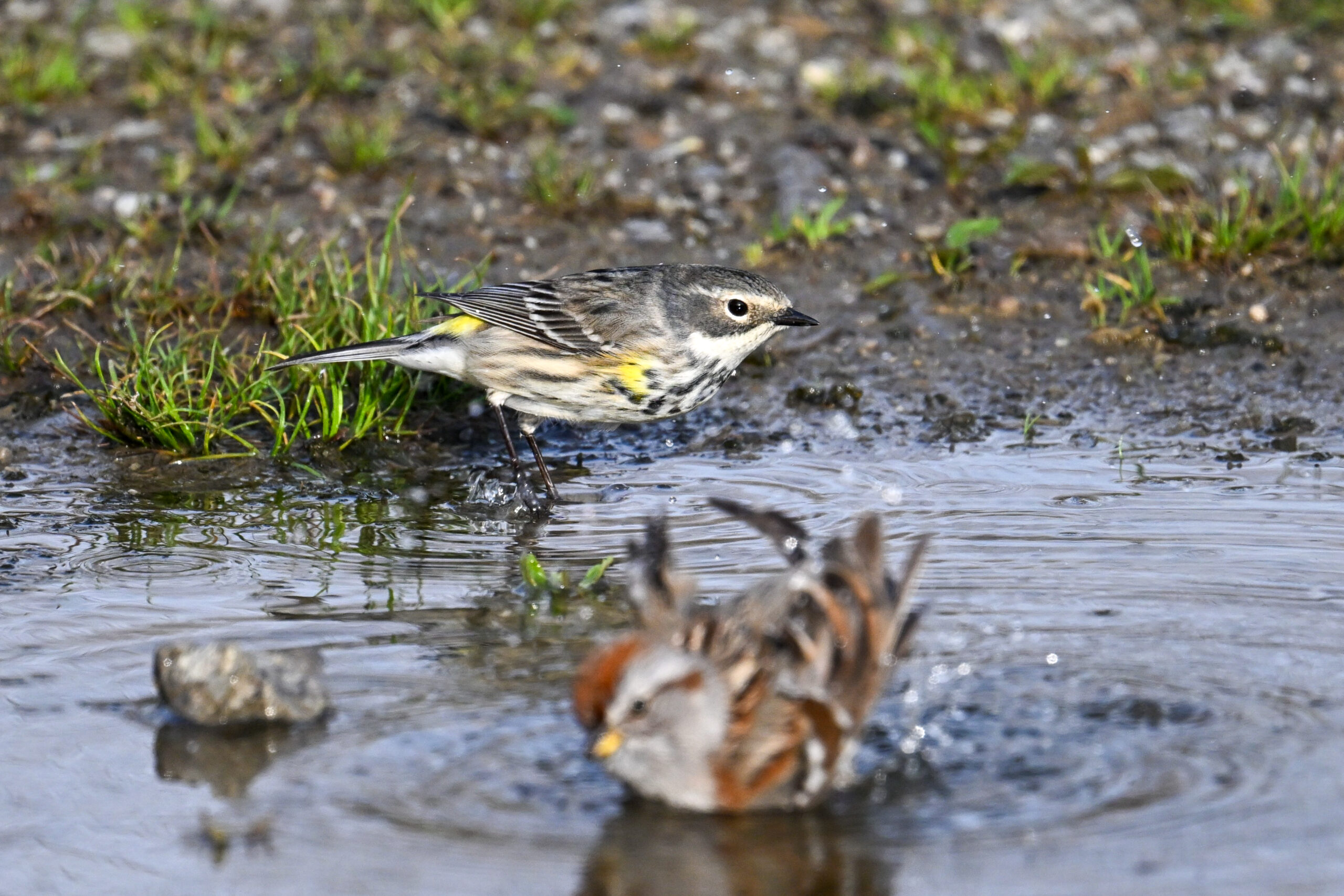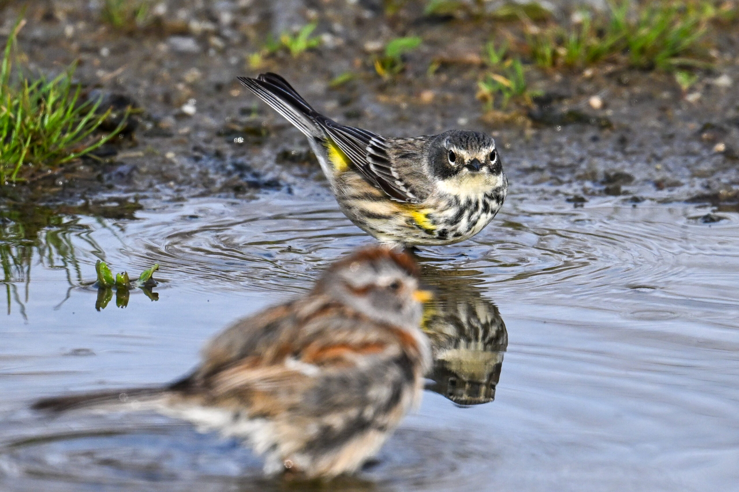 Celebrating one of the first BirdingPI.com warblers of the year w/ beautiful Yellow-rumped Warbler at Presque Isle State Park the other day (proximate an American Tree Sparrow @ bathing):