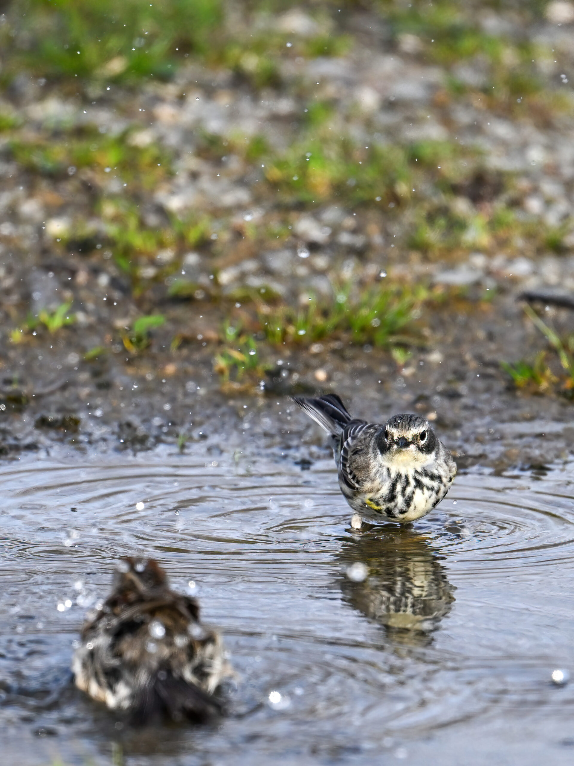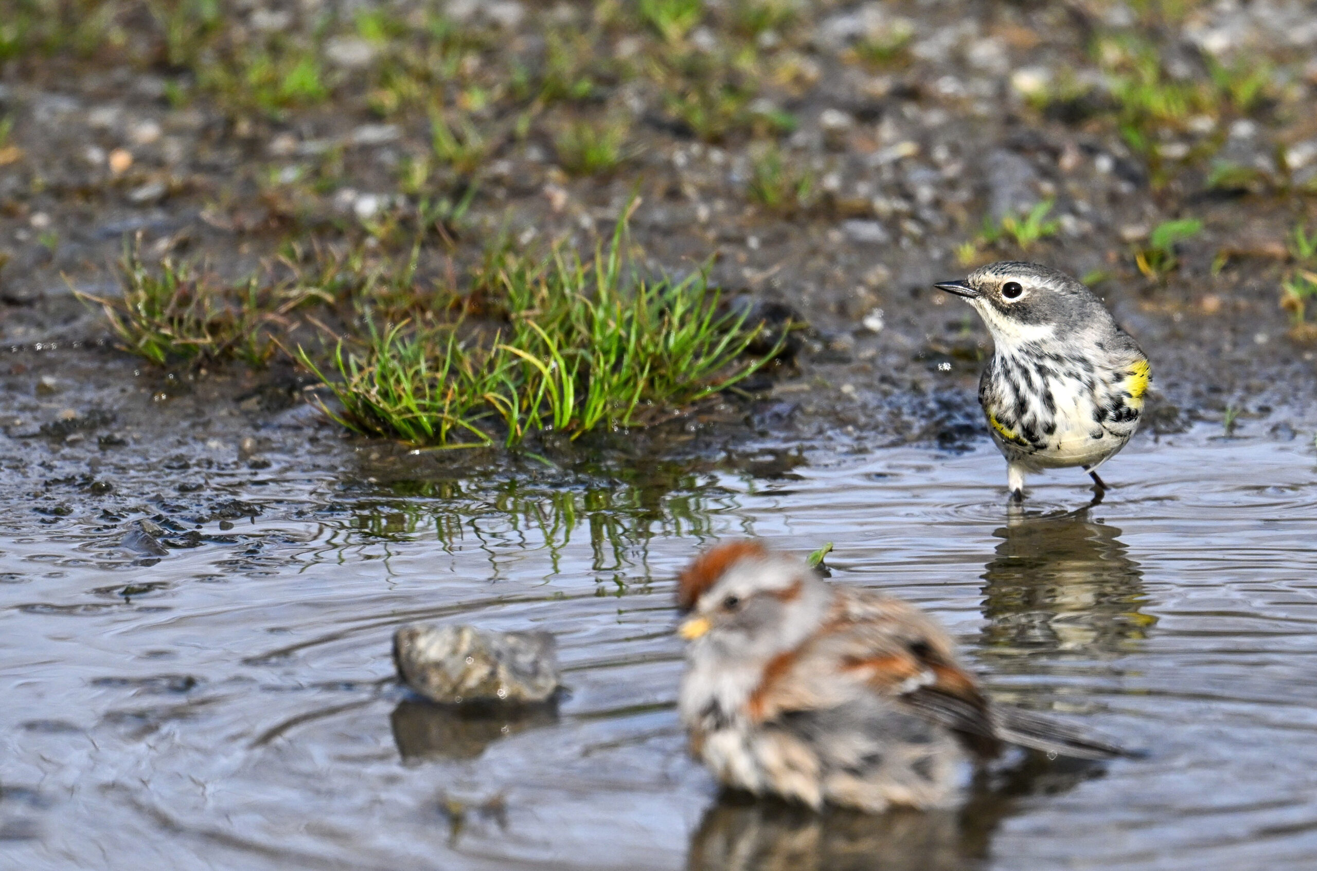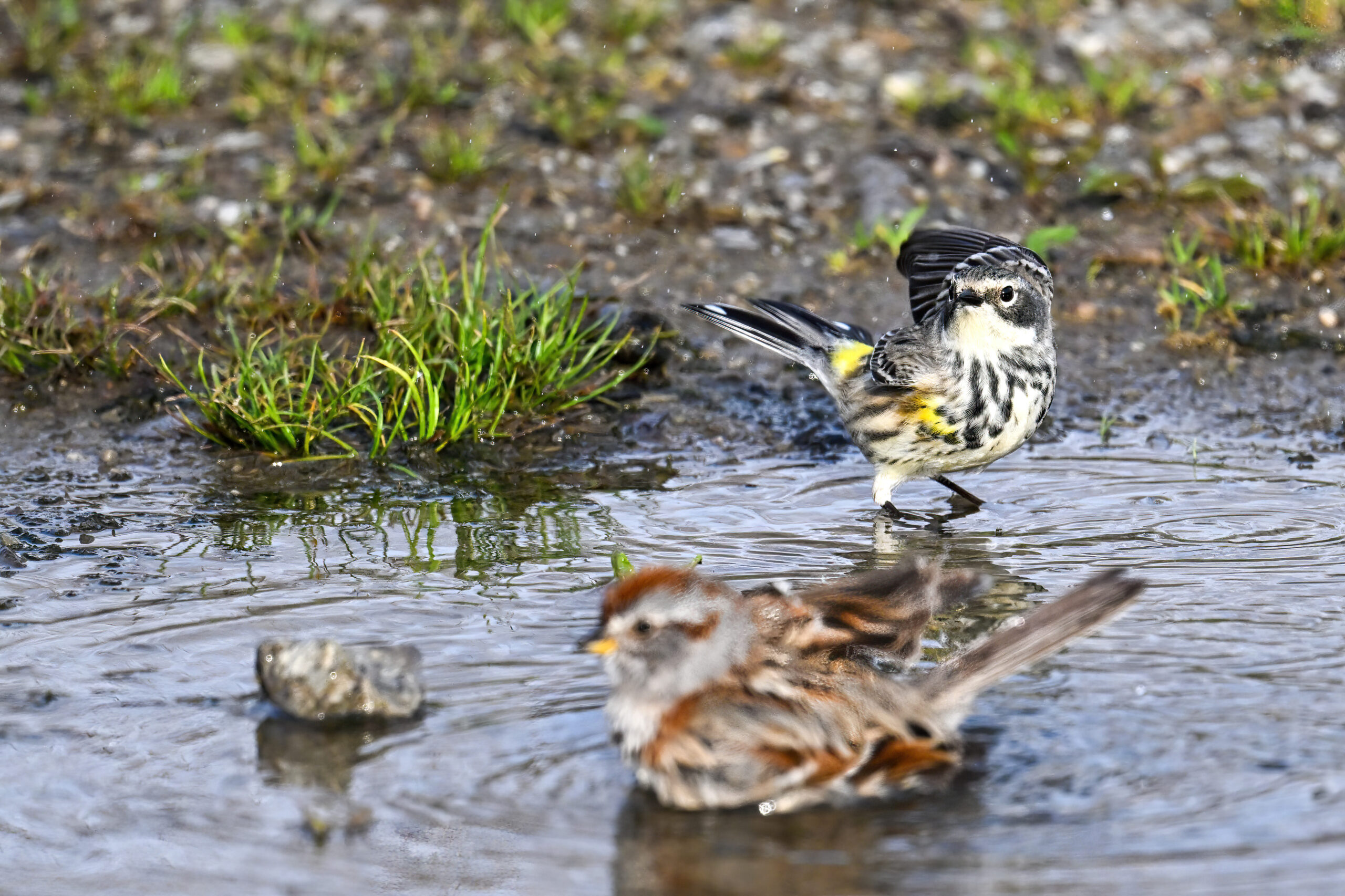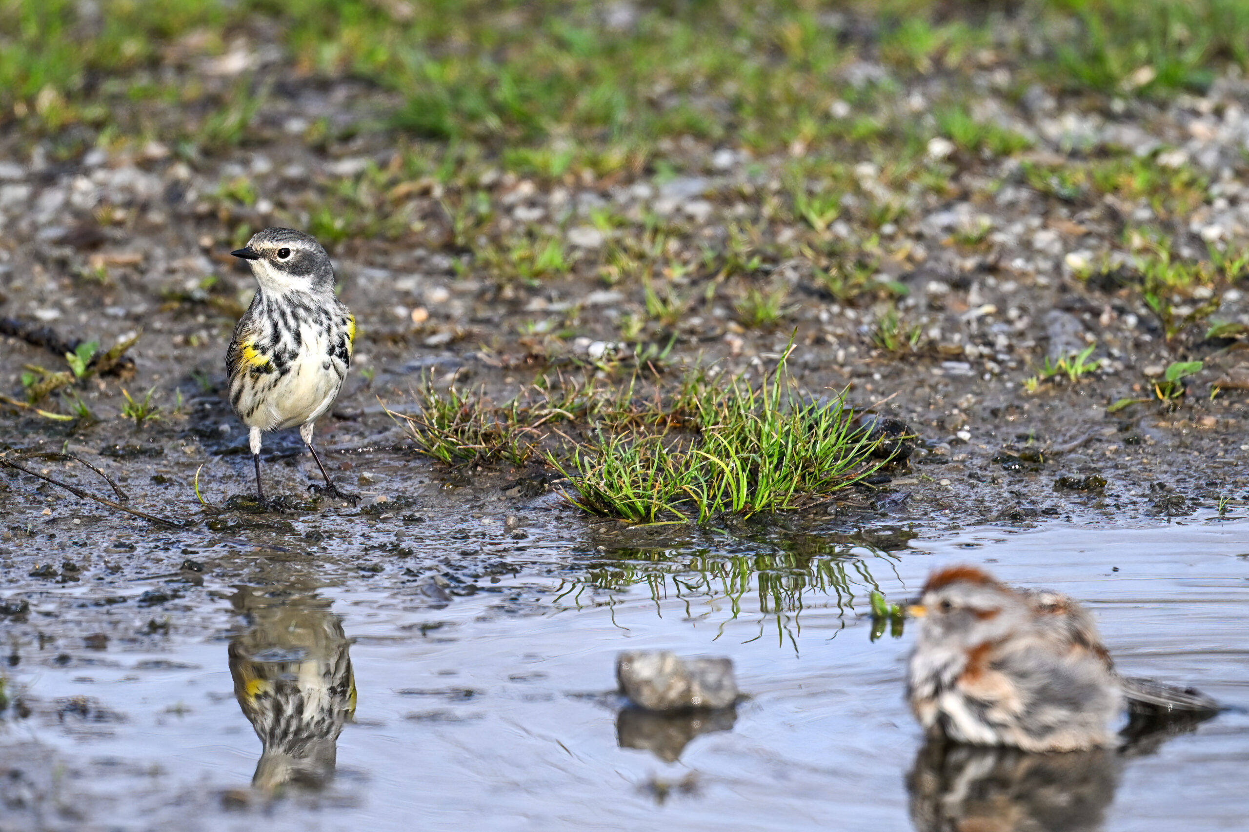 Celebrating one of the first BirdingPI.com warblers of the year w/ beautiful Yellow-rumped Warbler at Presque Isle State Park the other day (proximate an American Tree Sparrow @ bathing):