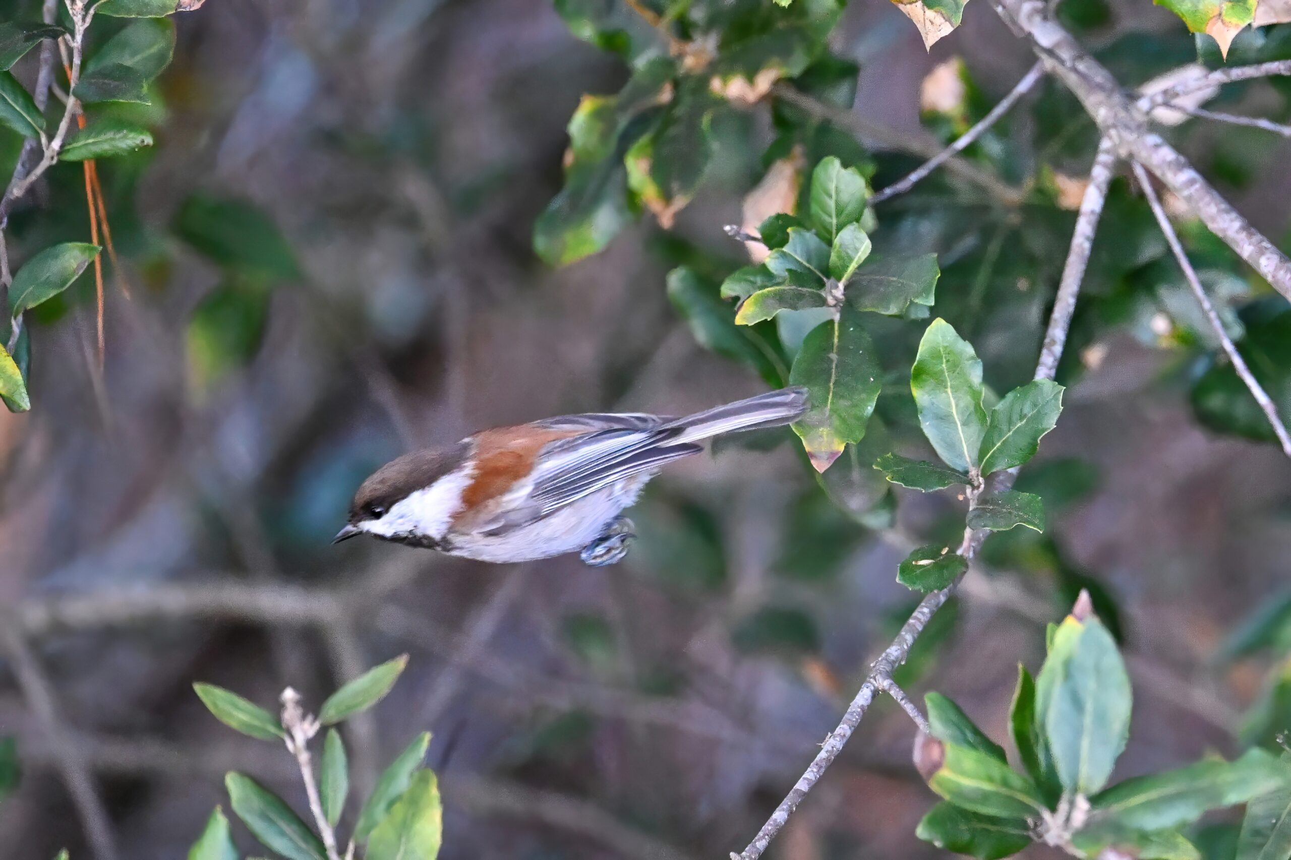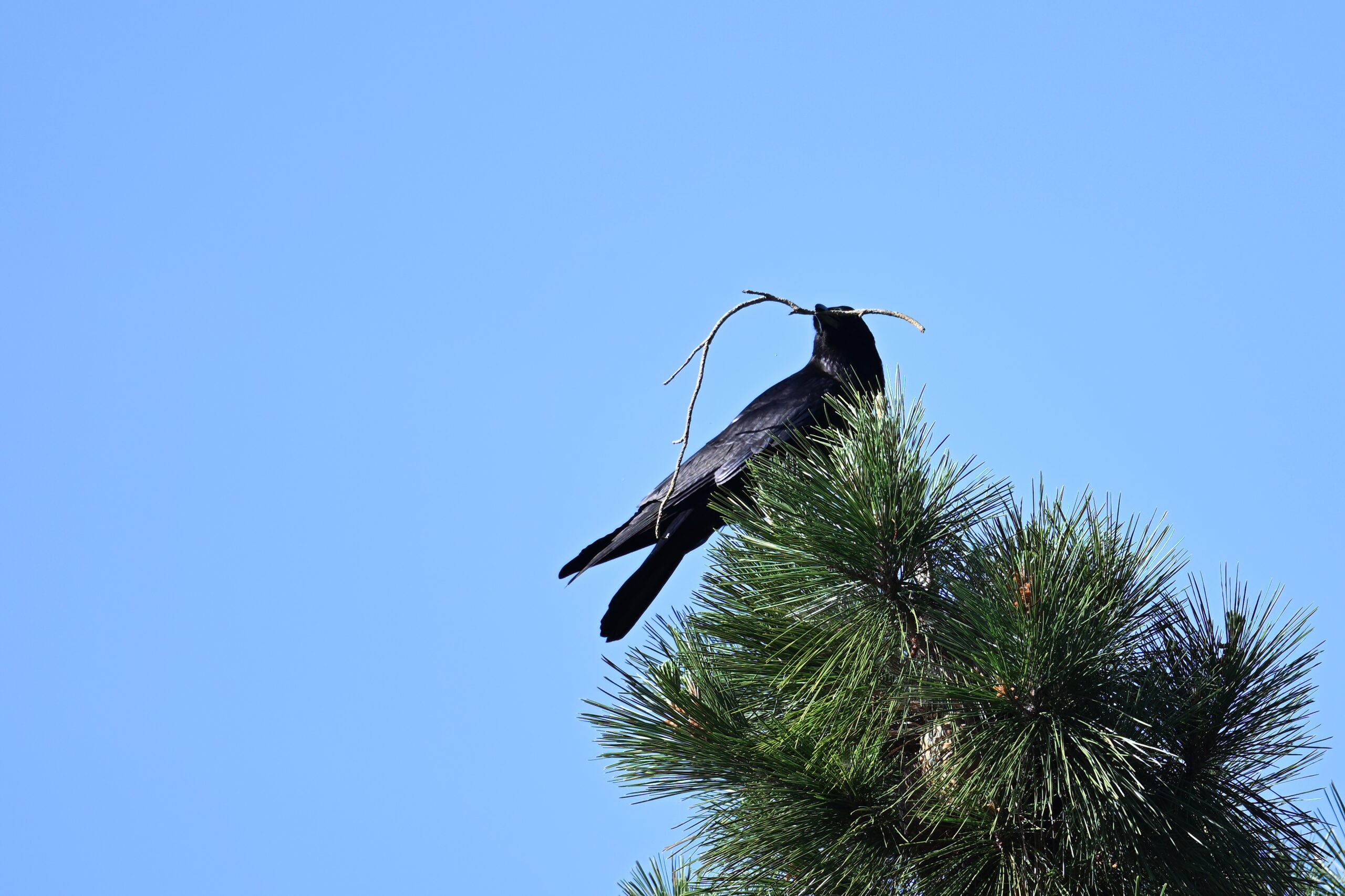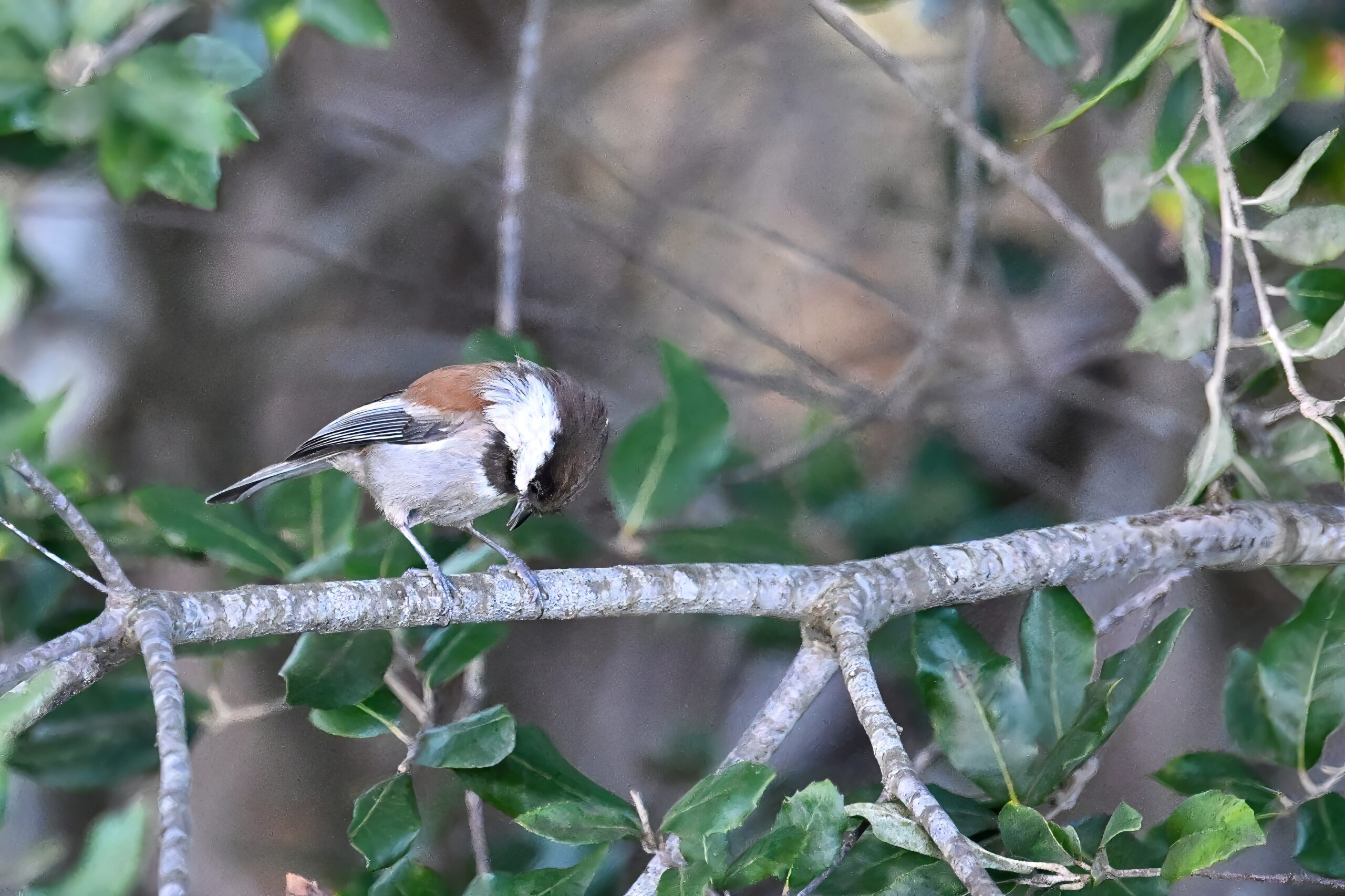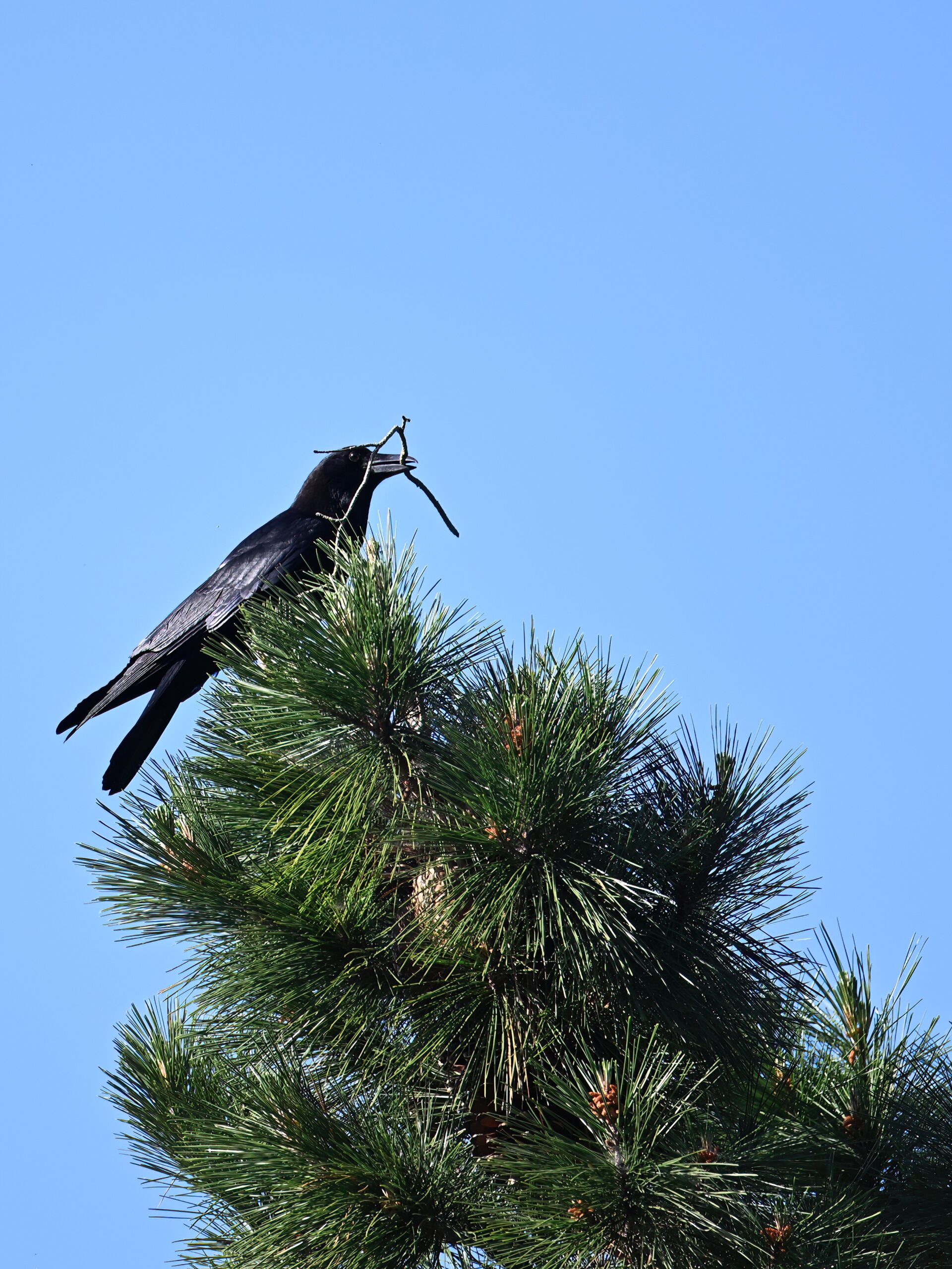 Back to March at the lovely campus of the College of San Mateo in San Mateo, California, featuring beautiful Chestnut-backed Chickadee x American Crow exhibiting “carrying nesting material” behaviour: