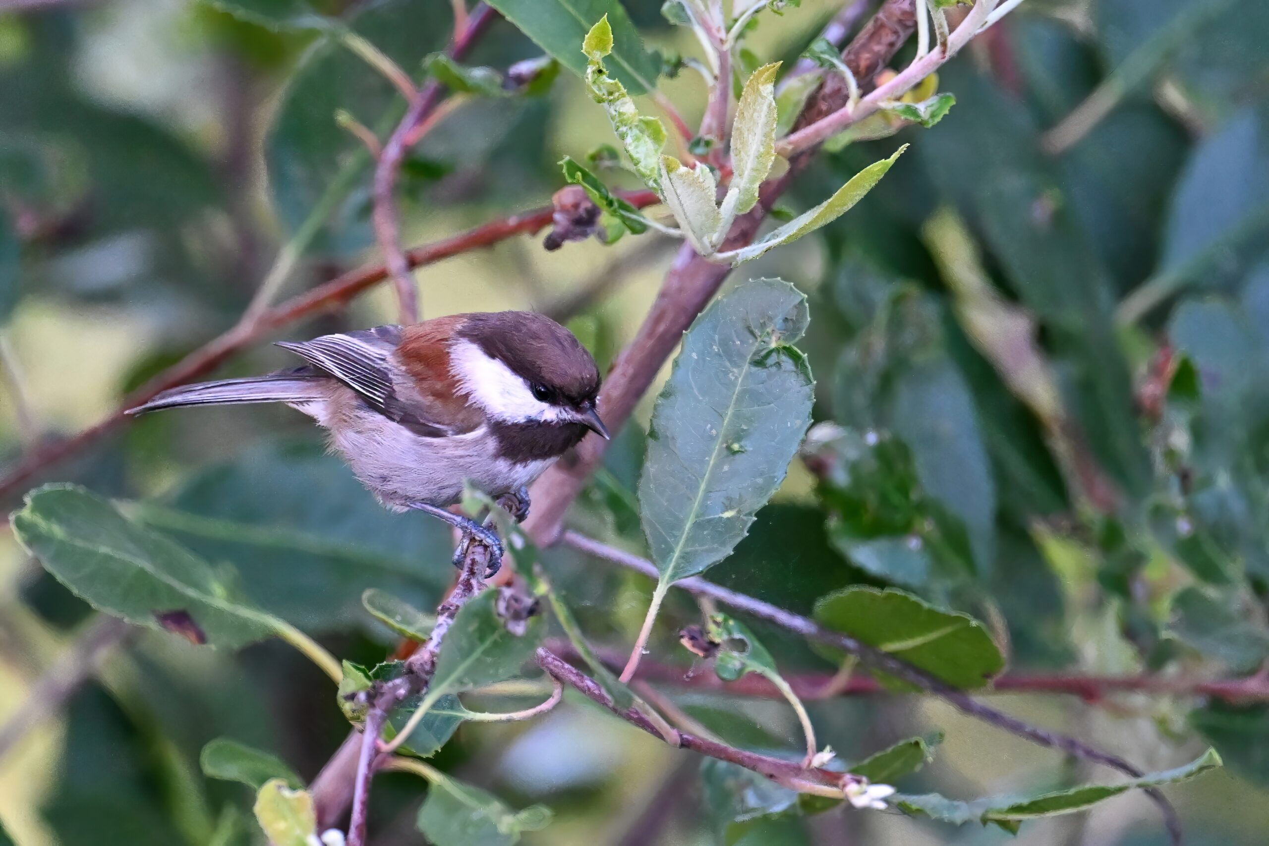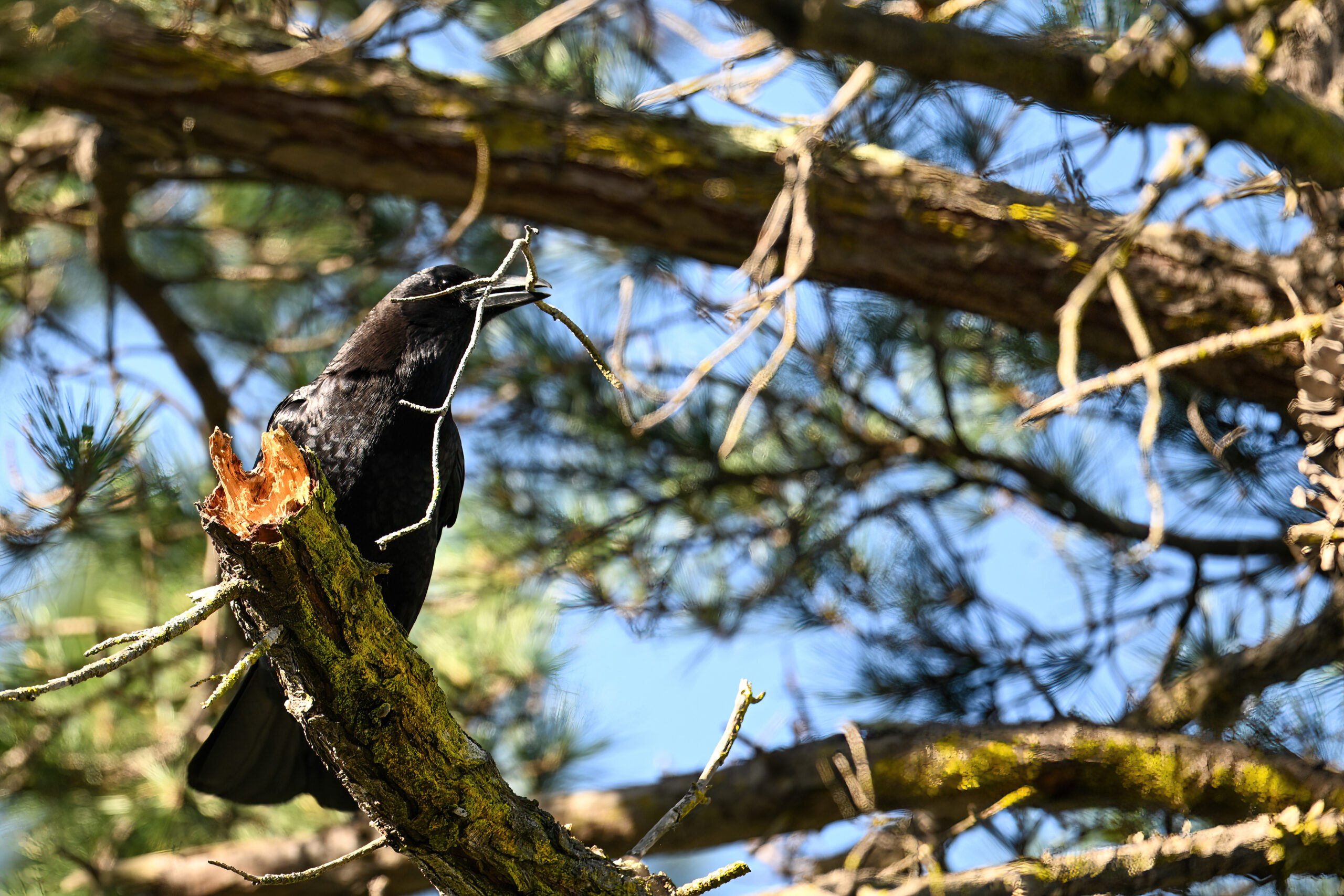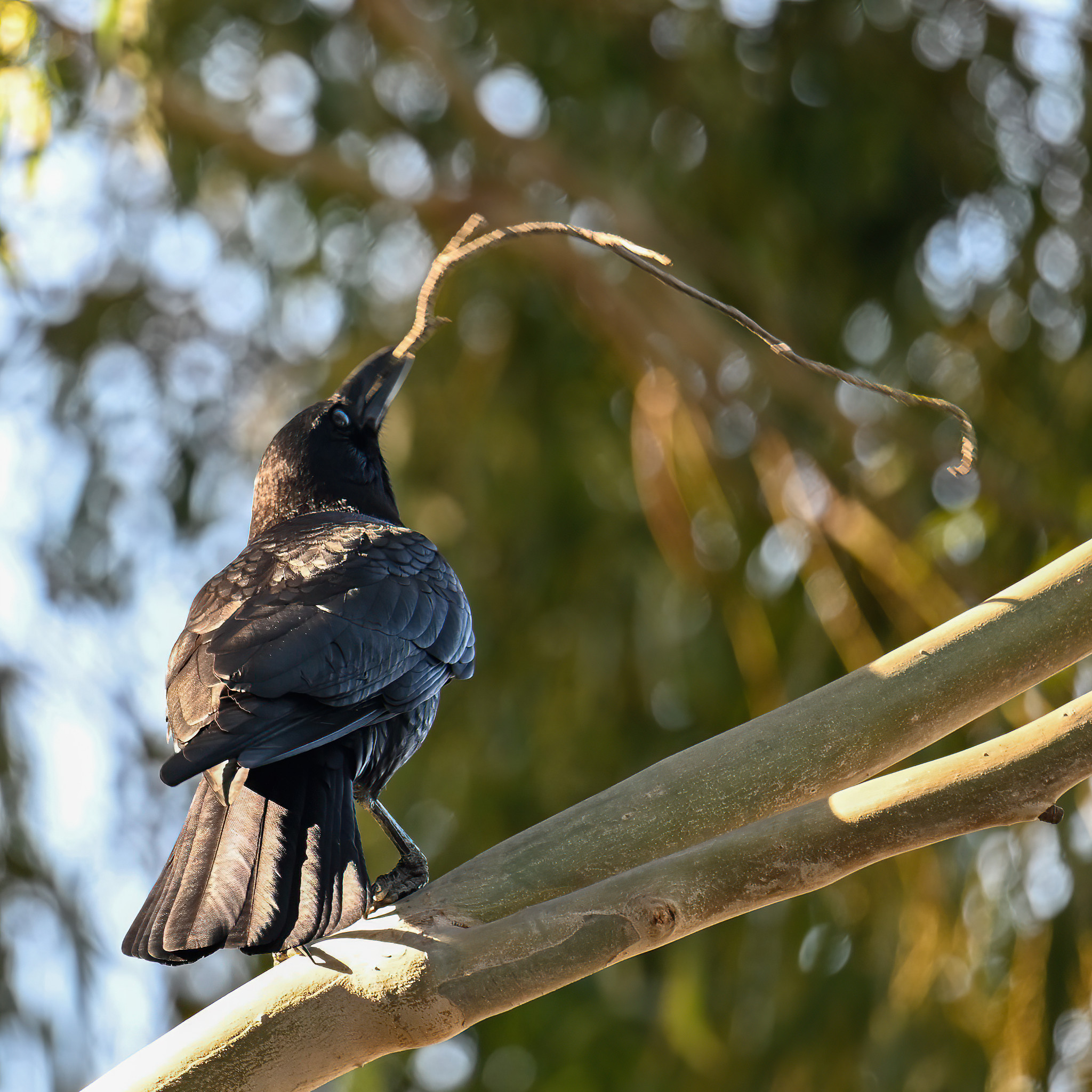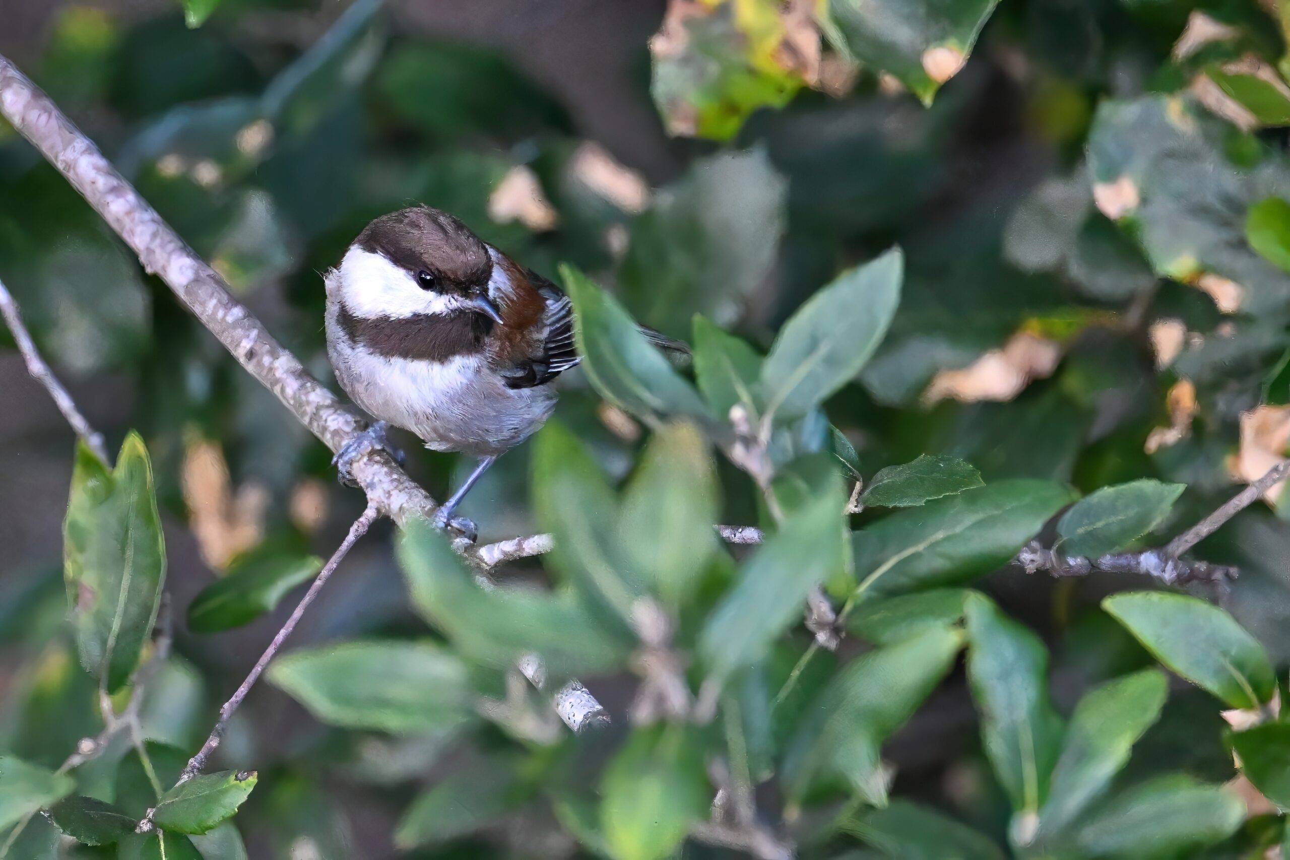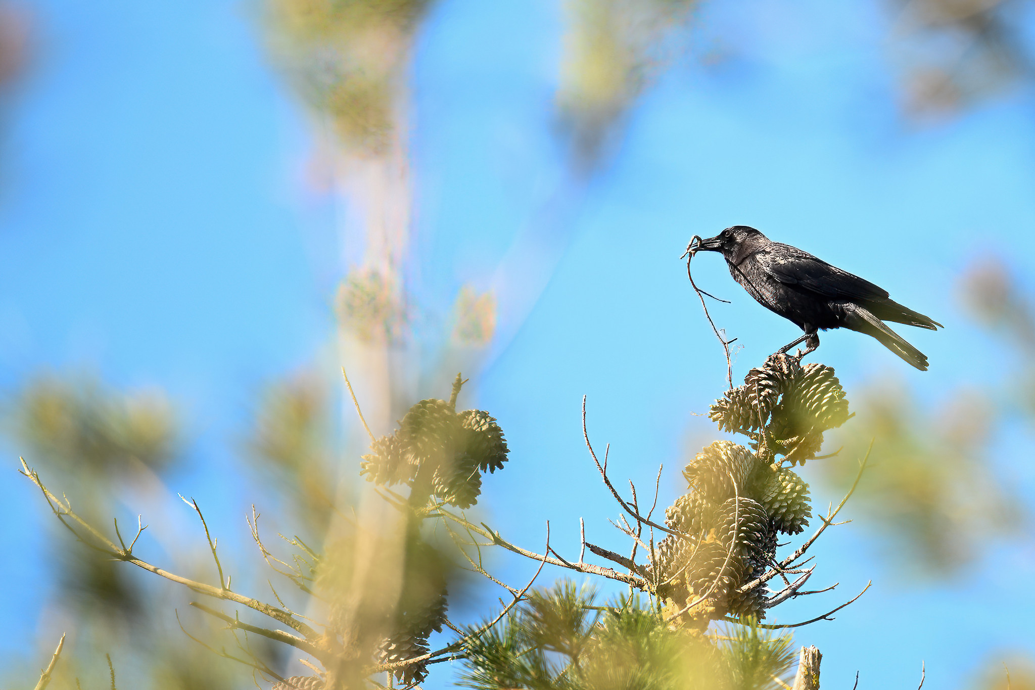 Back to March at the lovely campus of the College of San Mateo in San Mateo, California, featuring beautiful Chestnut-backed Chickadee x American Crow exhibiting “carrying nesting material” behaviour:
