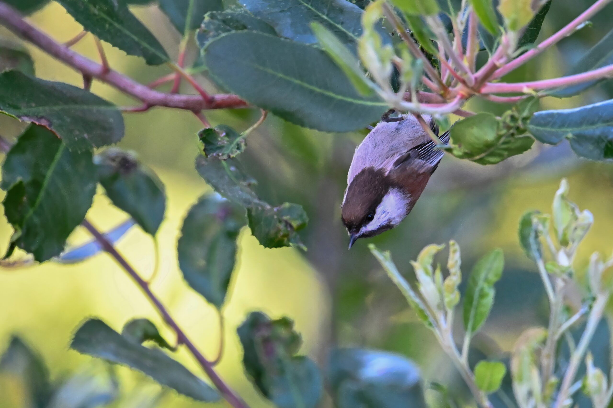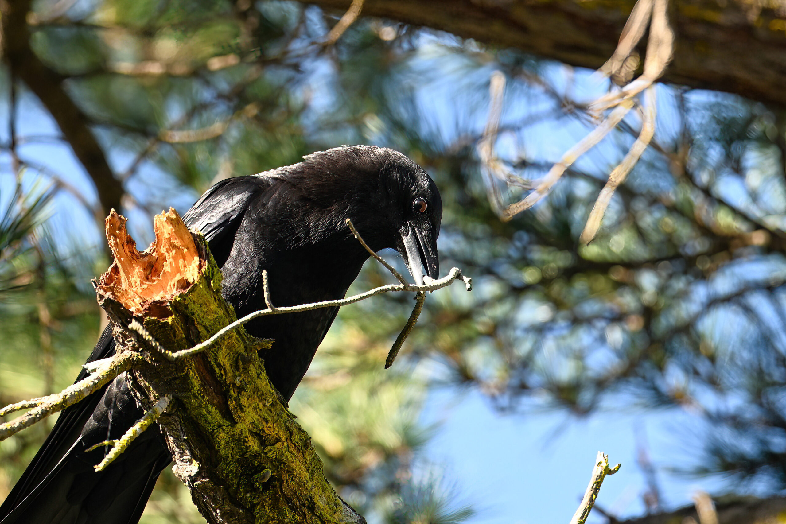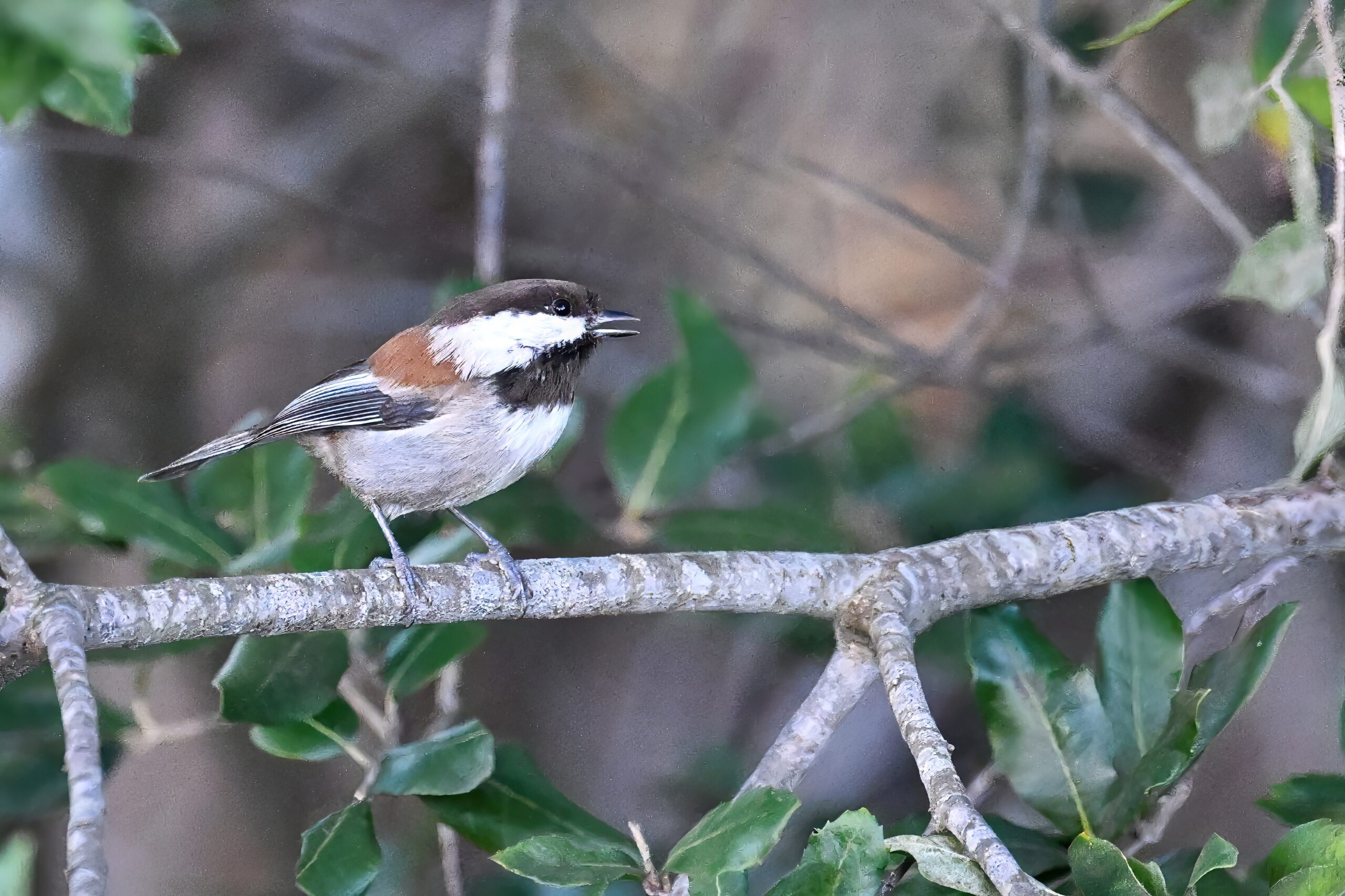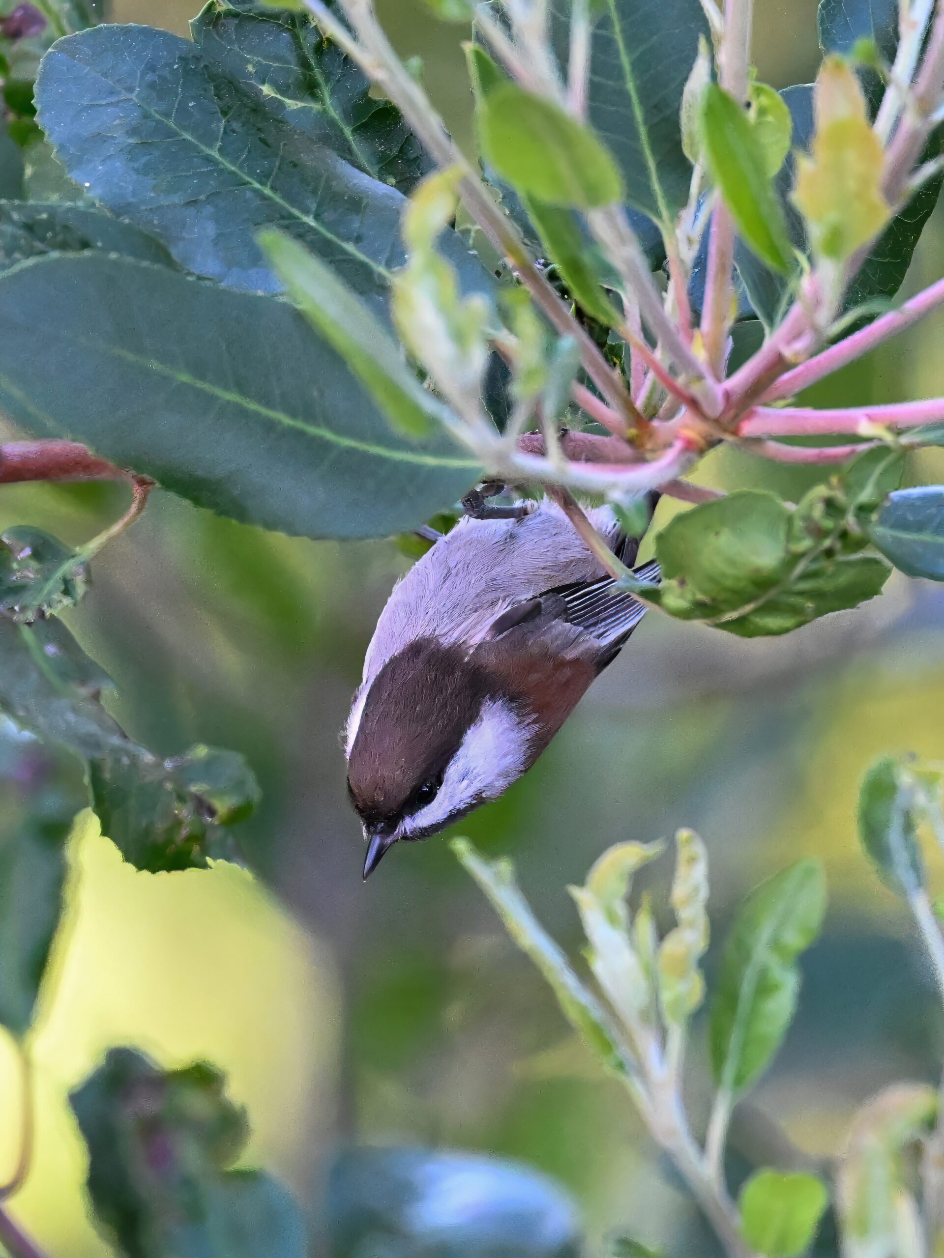 Back to March at the lovely campus of the College of San Mateo in San Mateo, California, featuring beautiful Chestnut-backed Chickadee x American Crow exhibiting “carrying nesting material” behaviour: