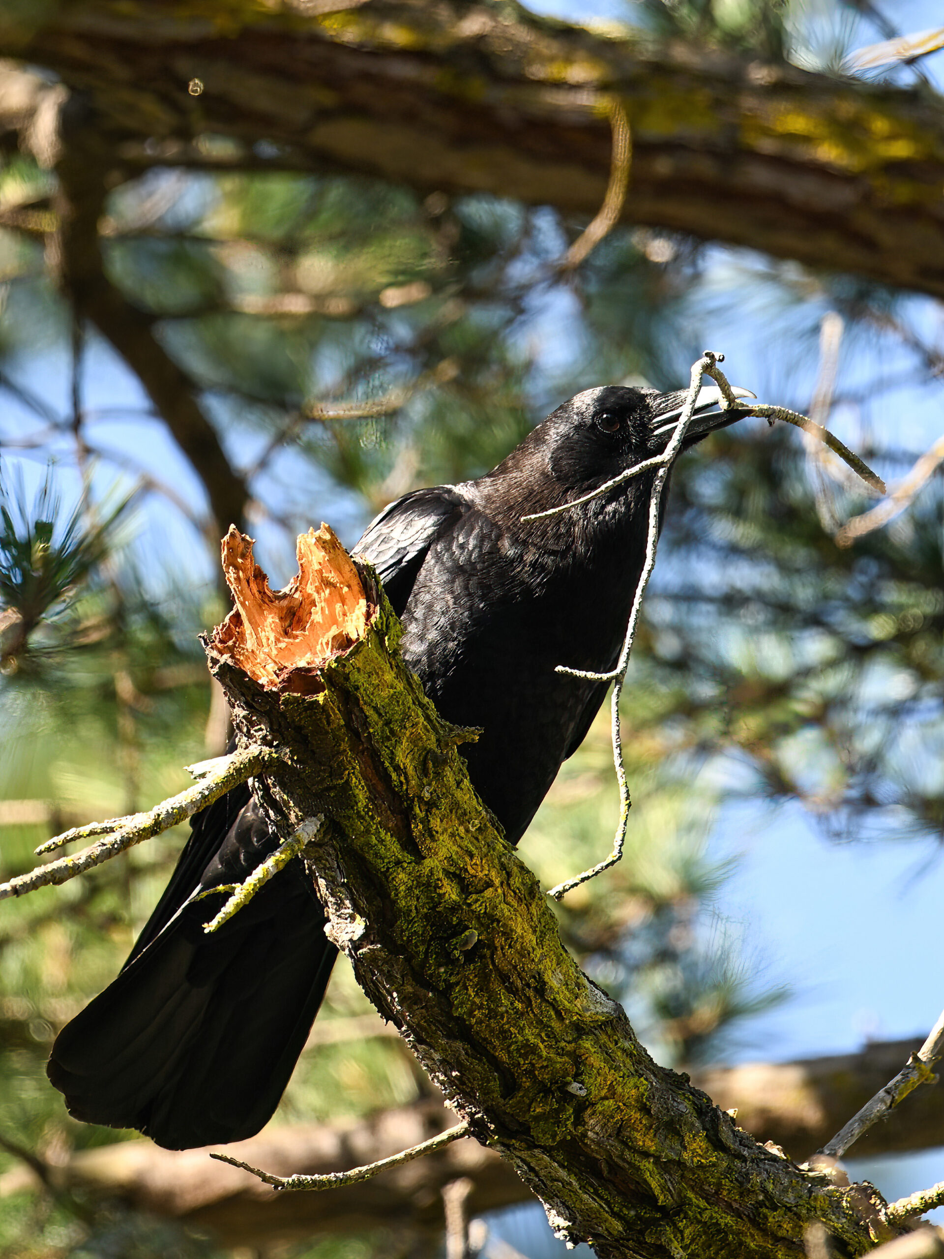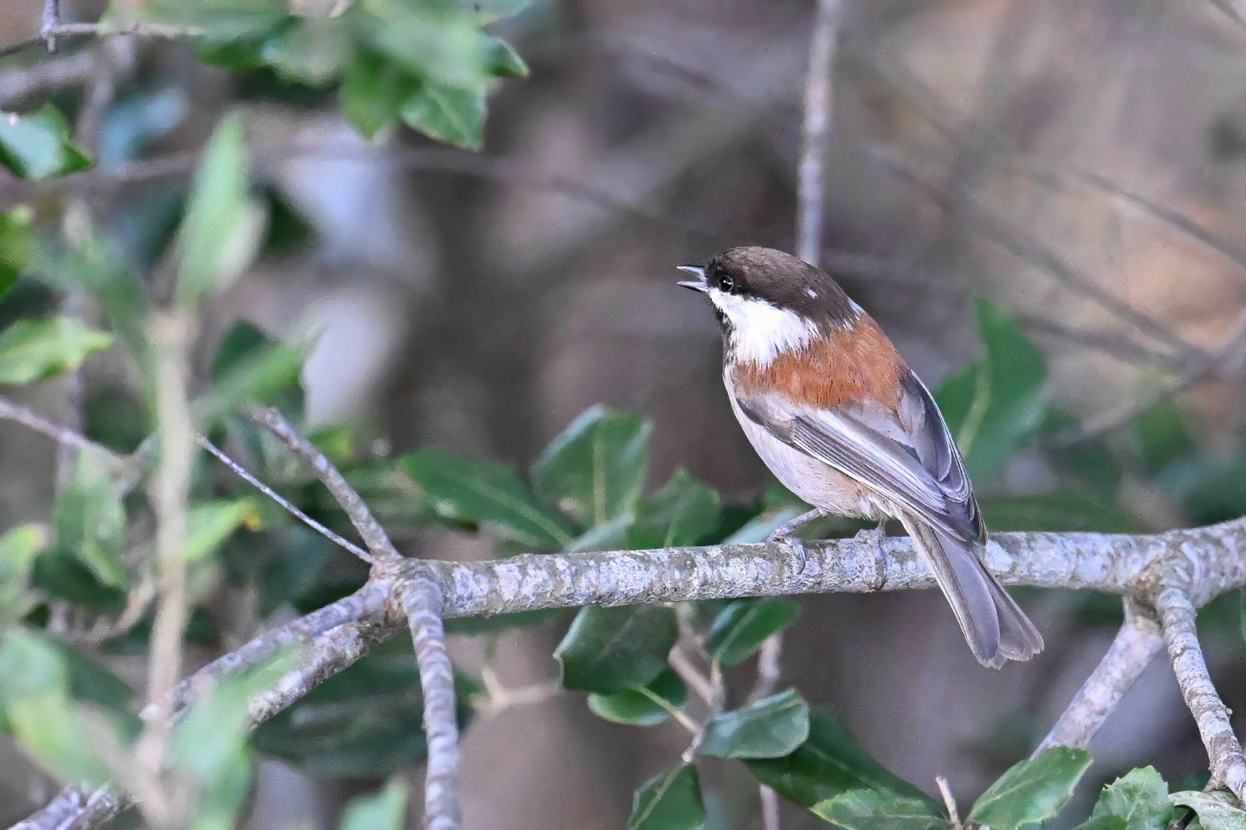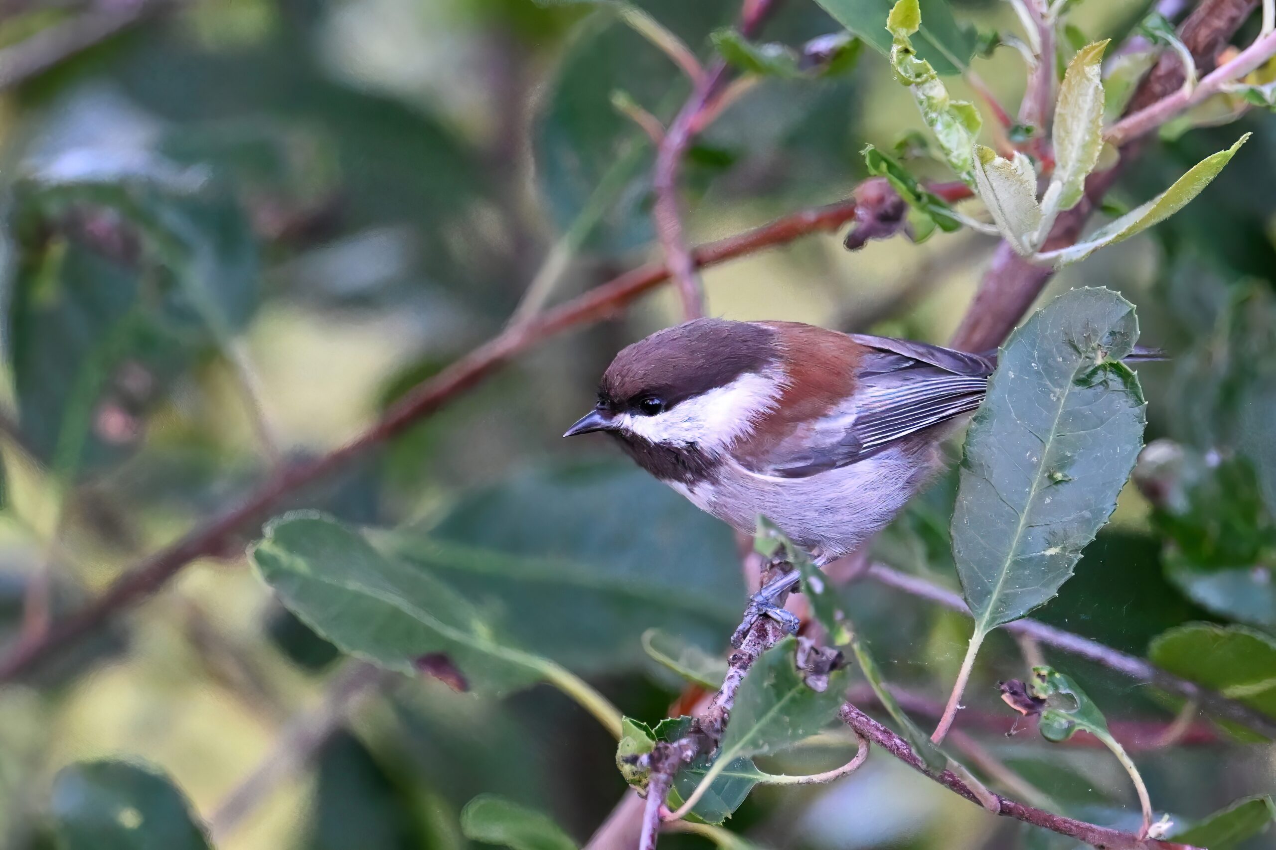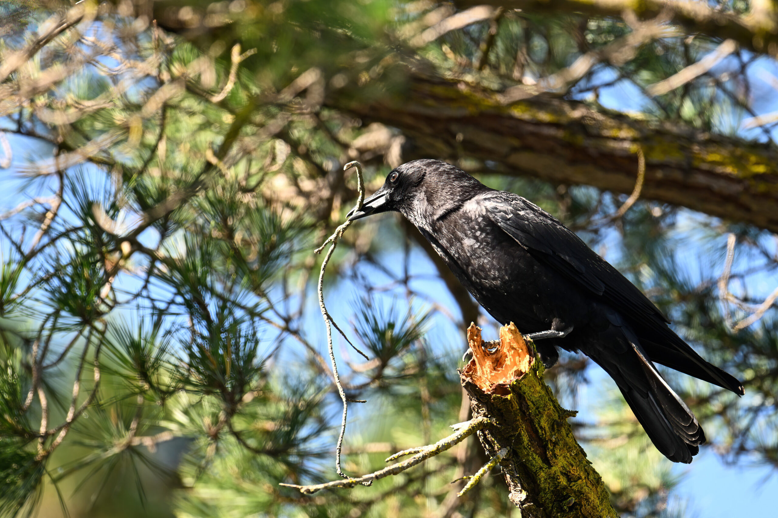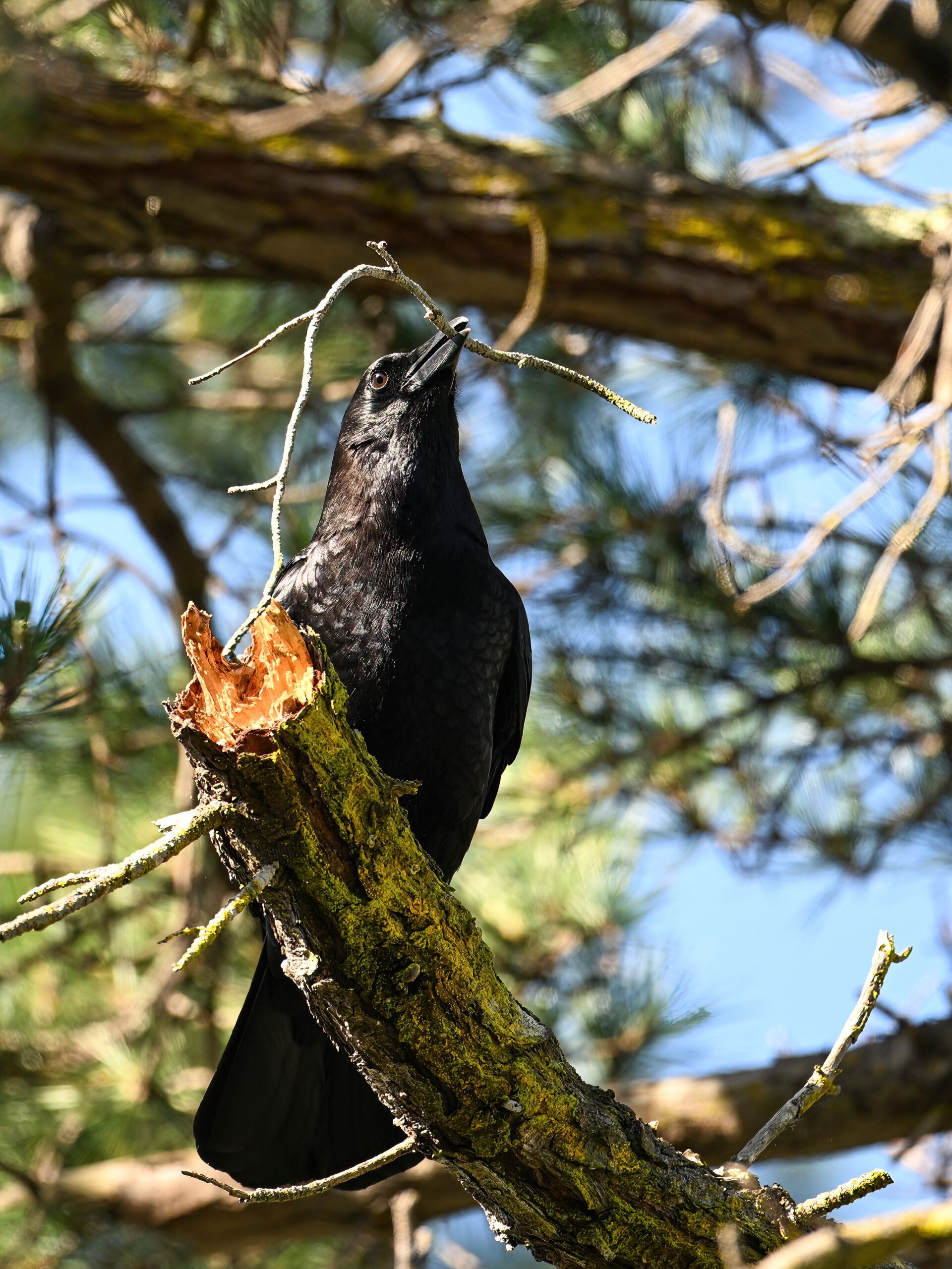 Back to March at the lovely campus of the College of San Mateo in San Mateo, California, featuring beautiful Chestnut-backed Chickadee x American Crow exhibiting “carrying nesting material” behaviour:
