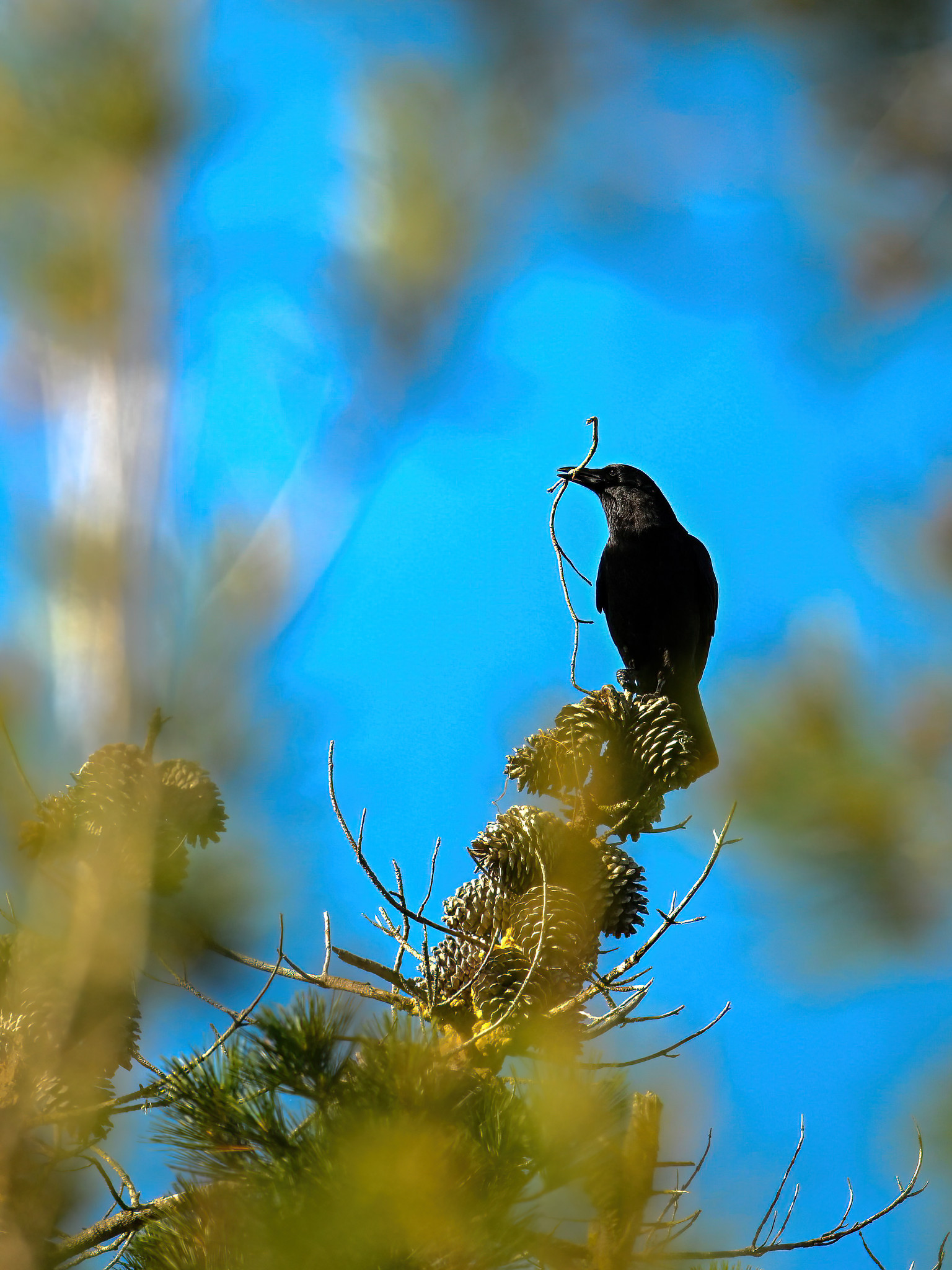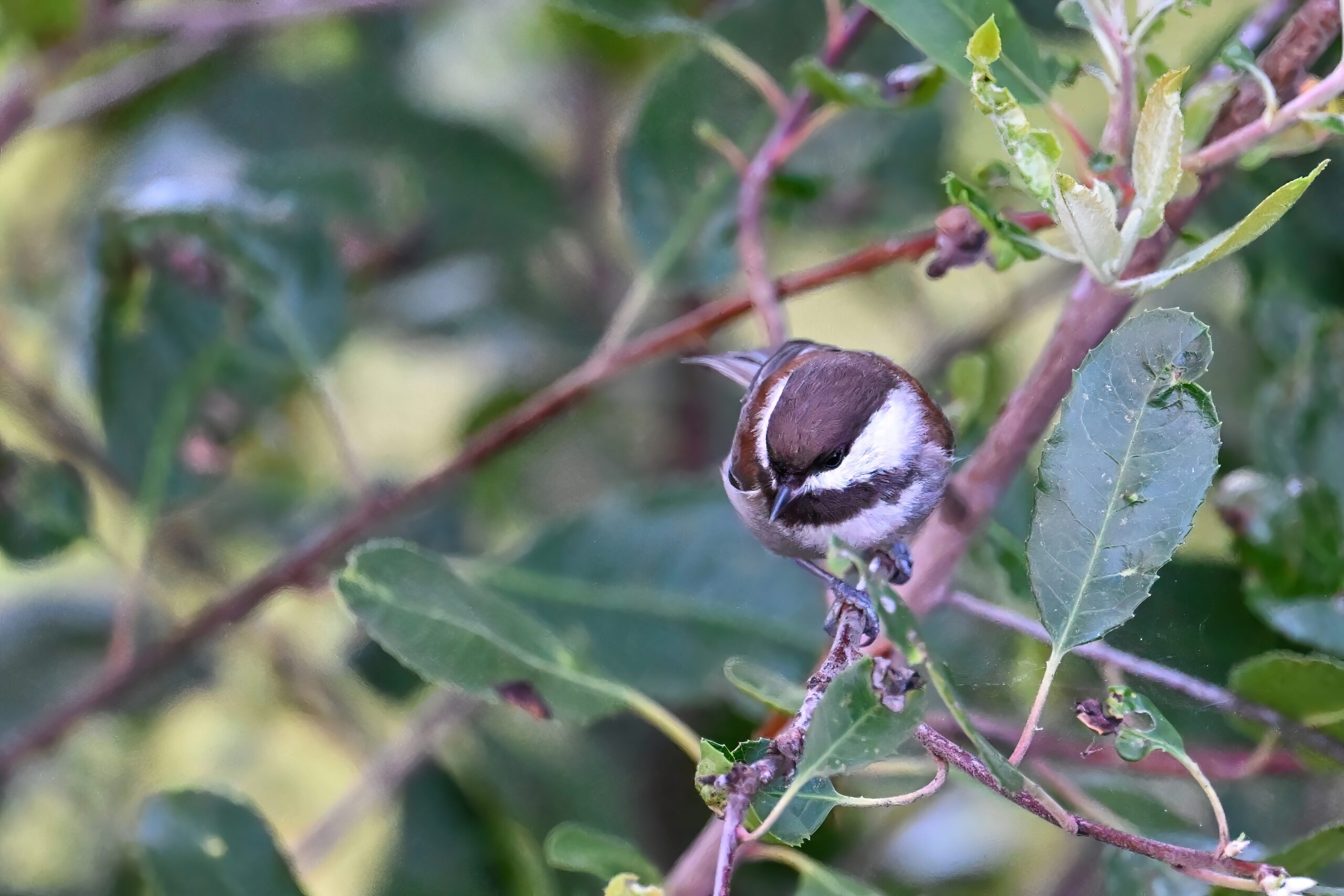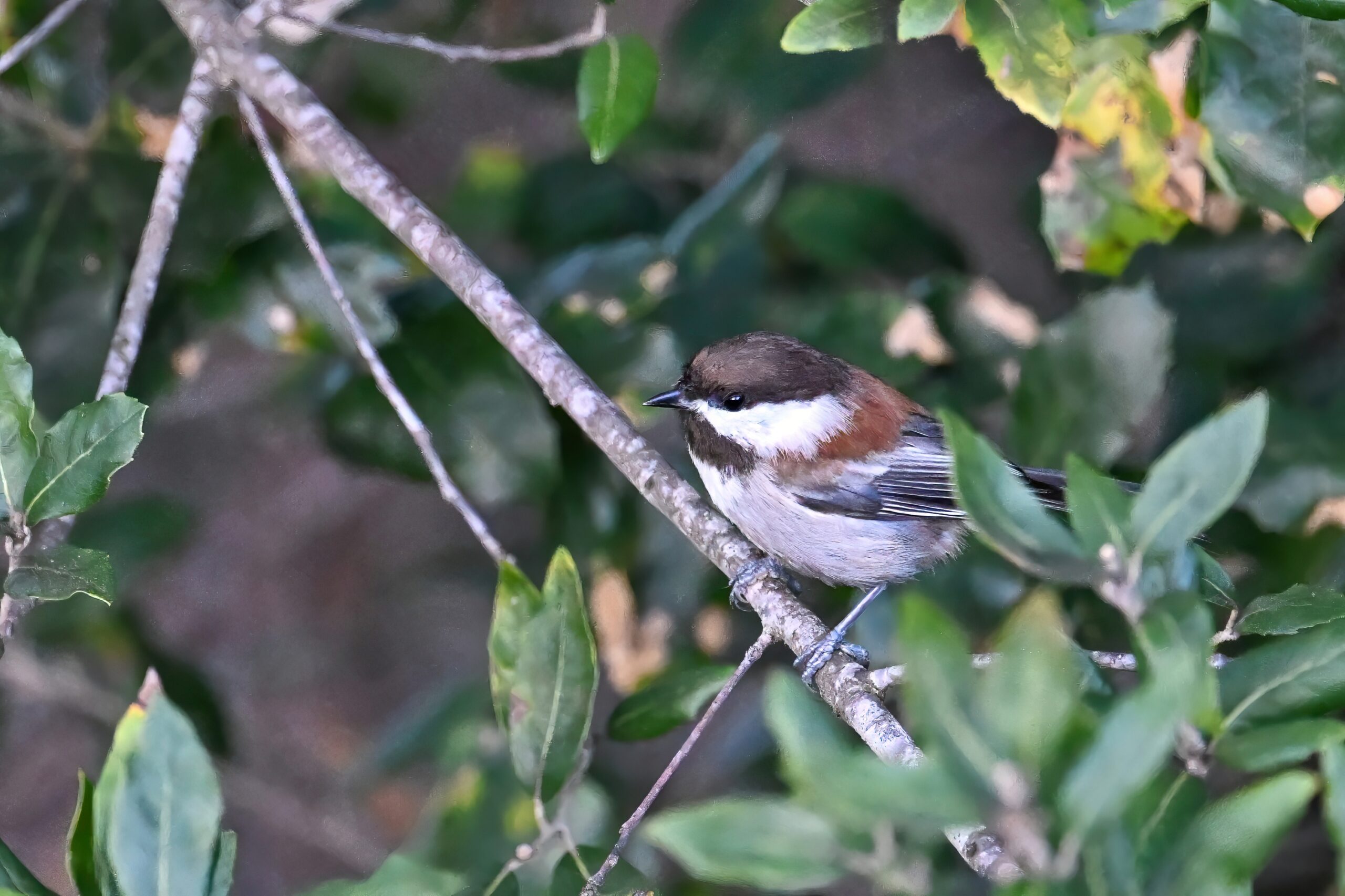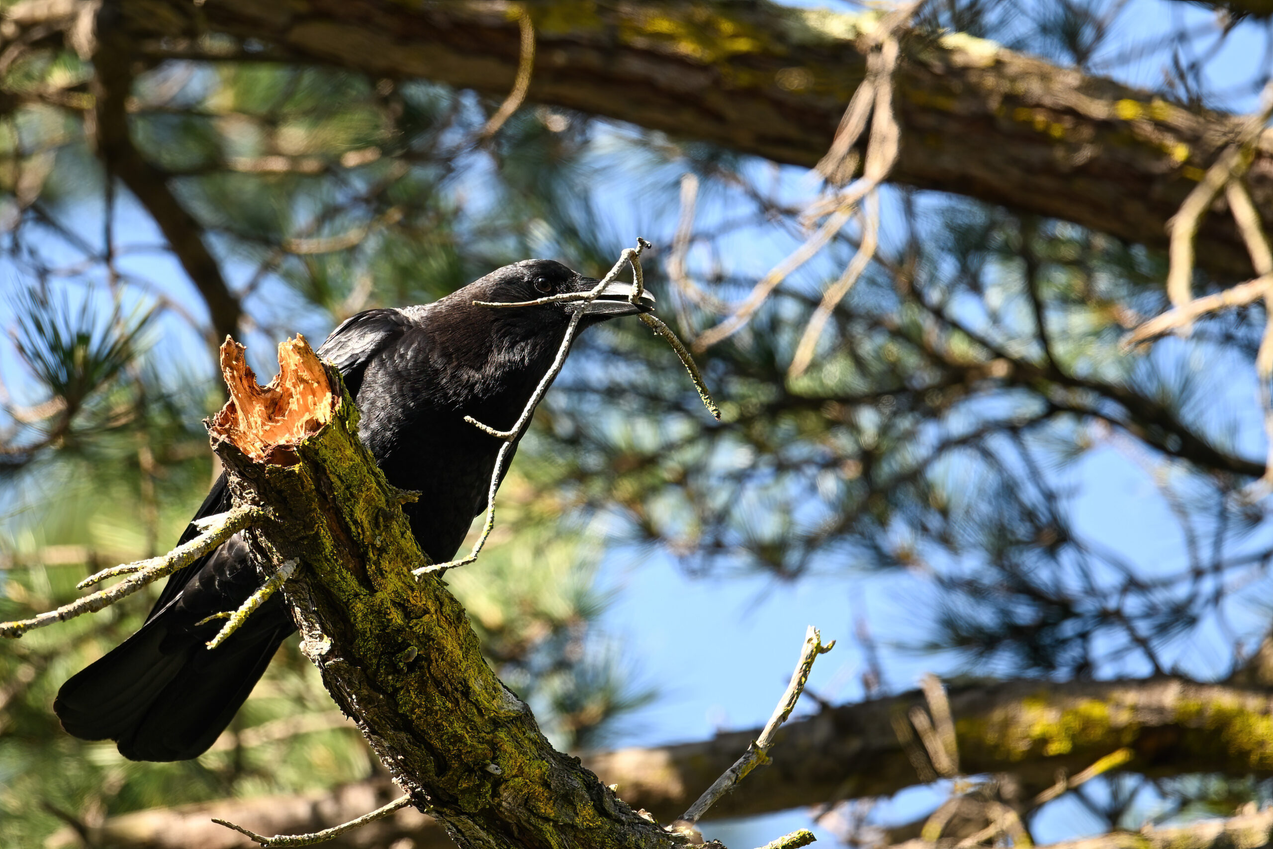 Back to March at the lovely campus of the College of San Mateo in San Mateo, California, featuring beautiful Chestnut-backed Chickadee x American Crow exhibiting “carrying nesting material” behaviour: