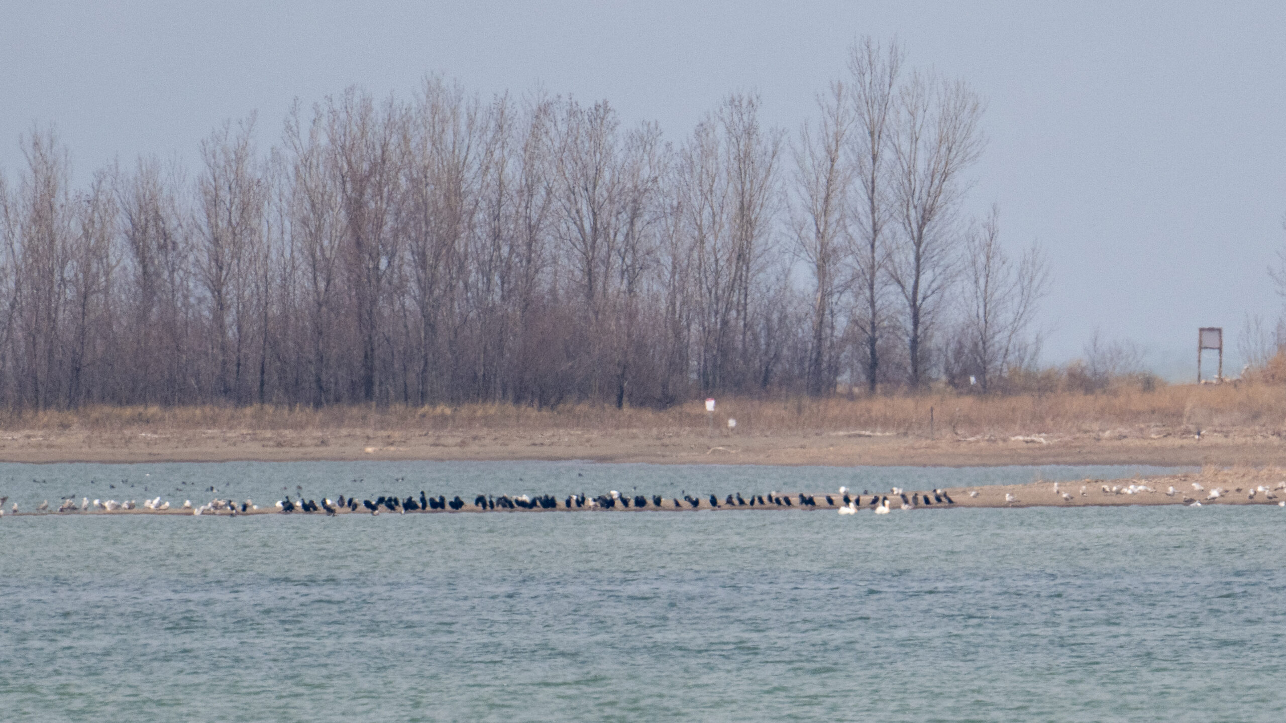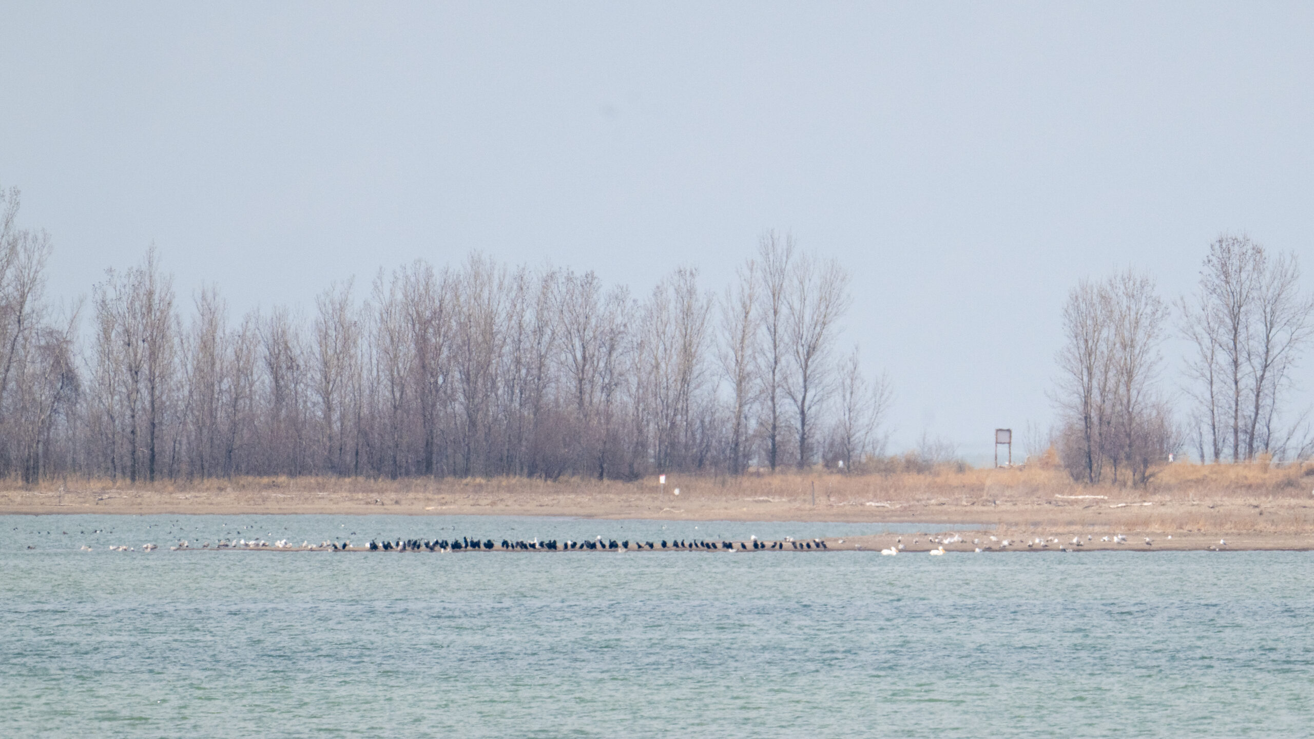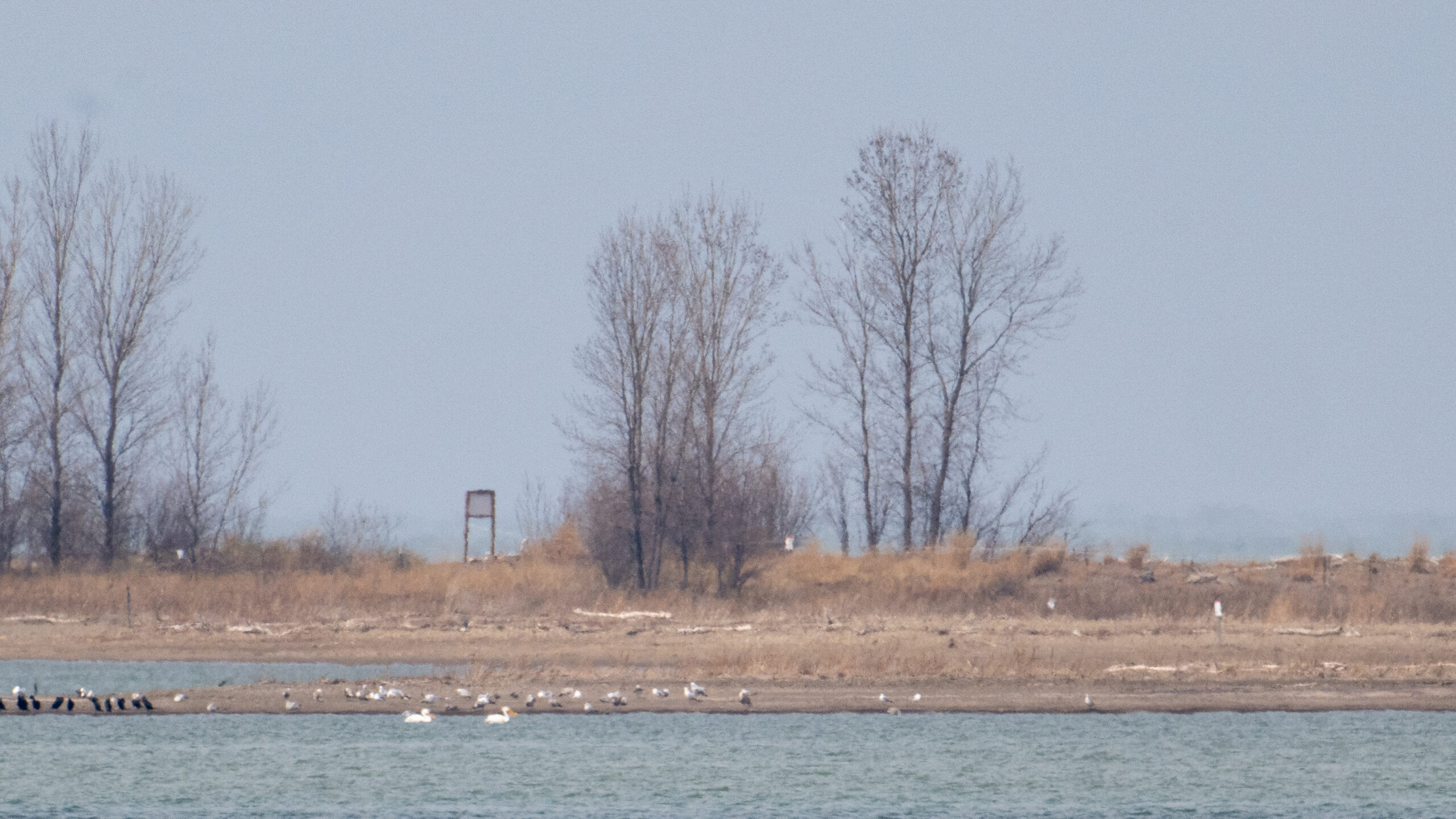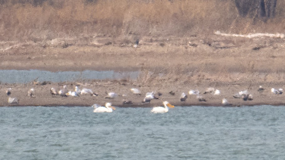 Gulls, cormorants, and 2x American White Pelican