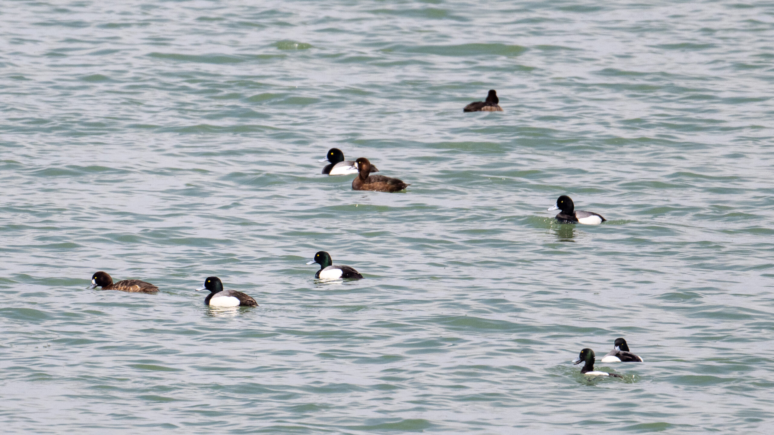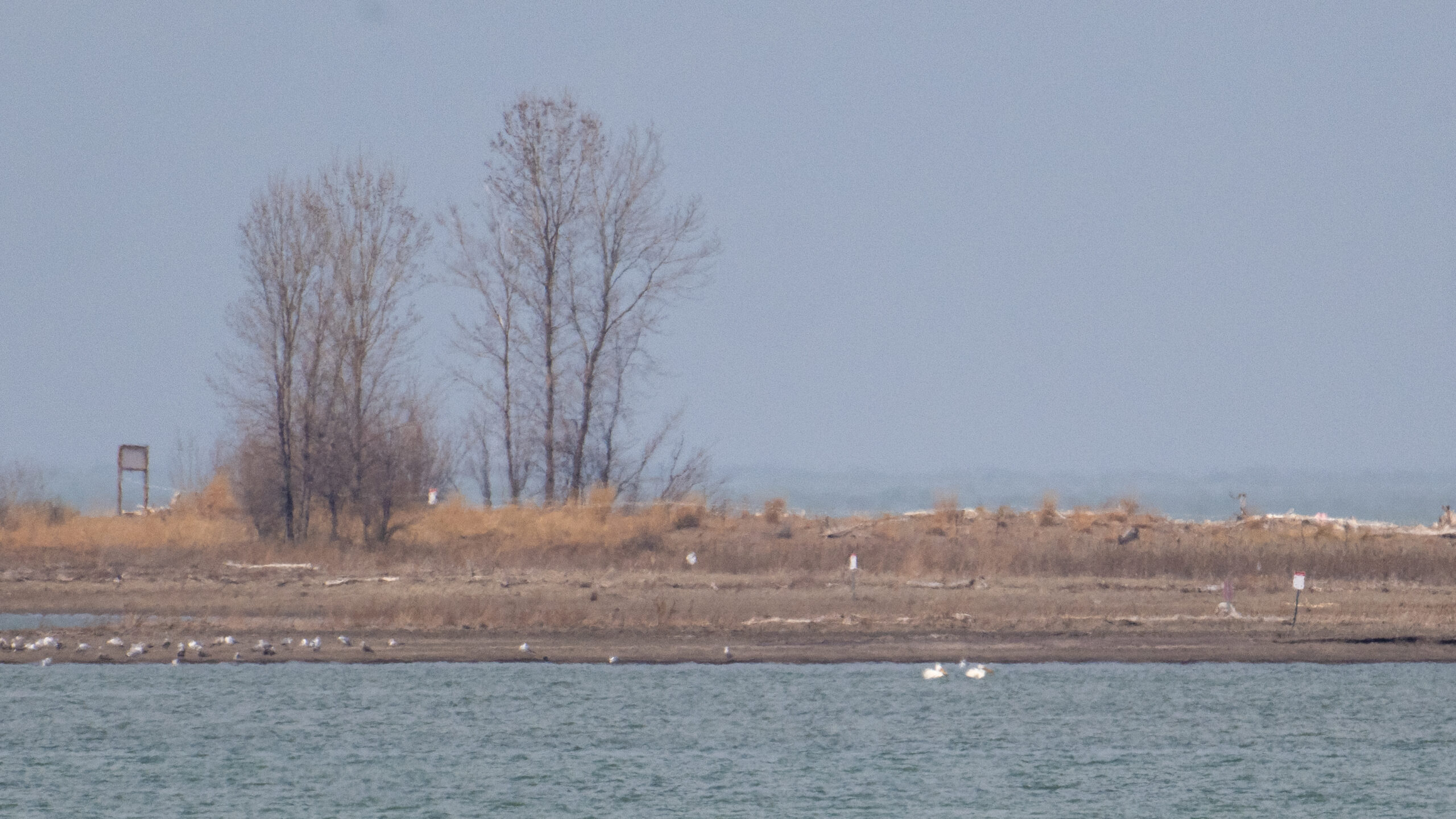 White Pelicans?White Pelicans @ center (the two white blobs)Enlarged view of White Pelicans at outer Gull PointCanada Geese landing at East Ave Boat LaunchGreater Scaup on outer Lake Erie