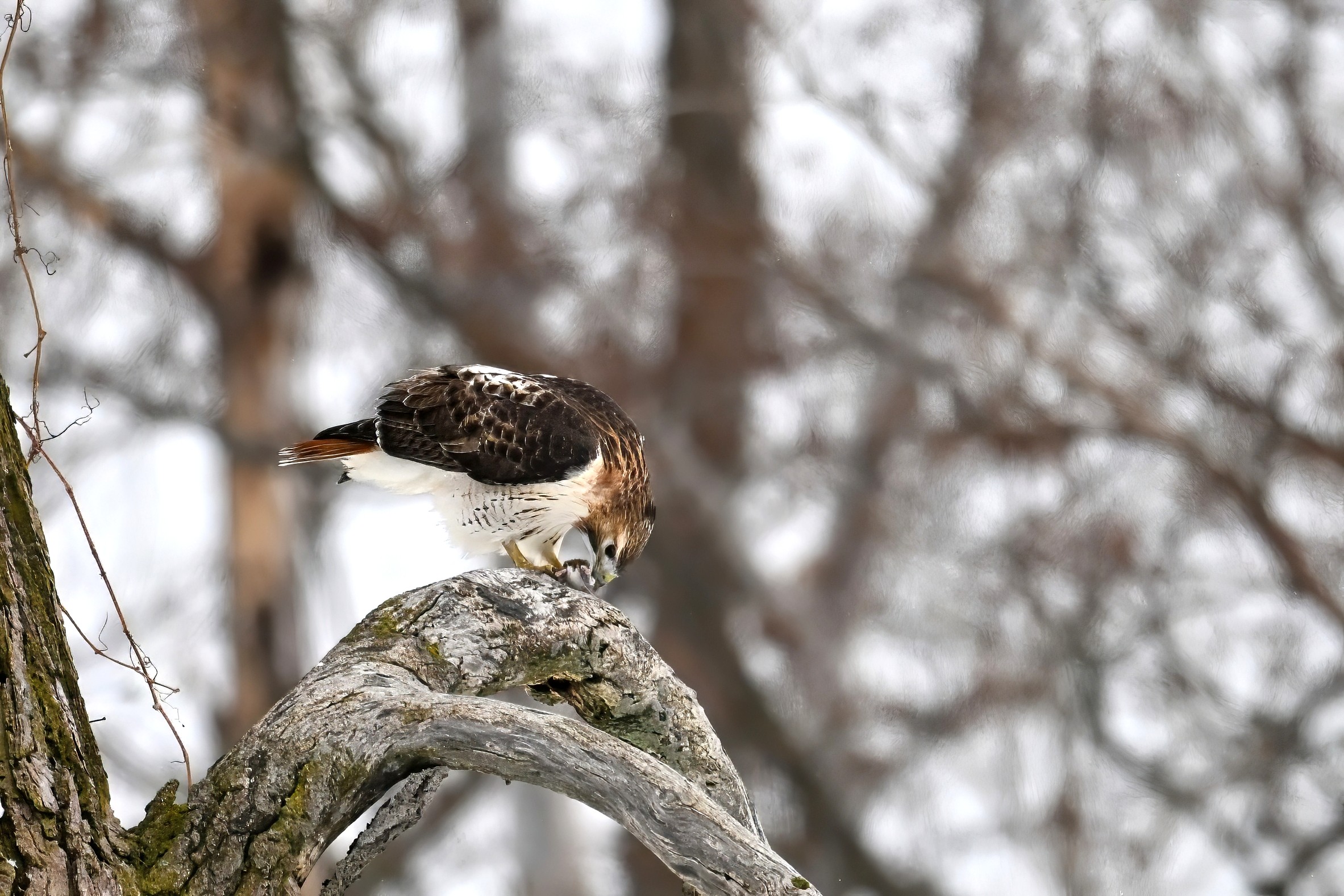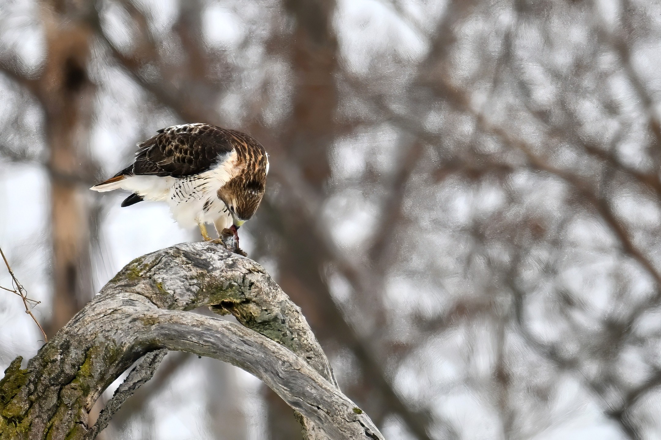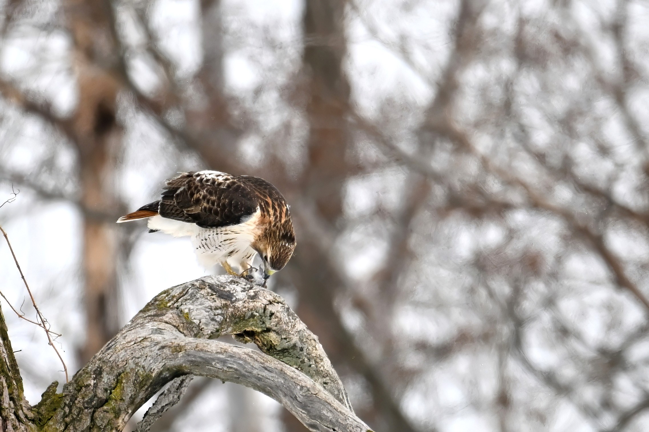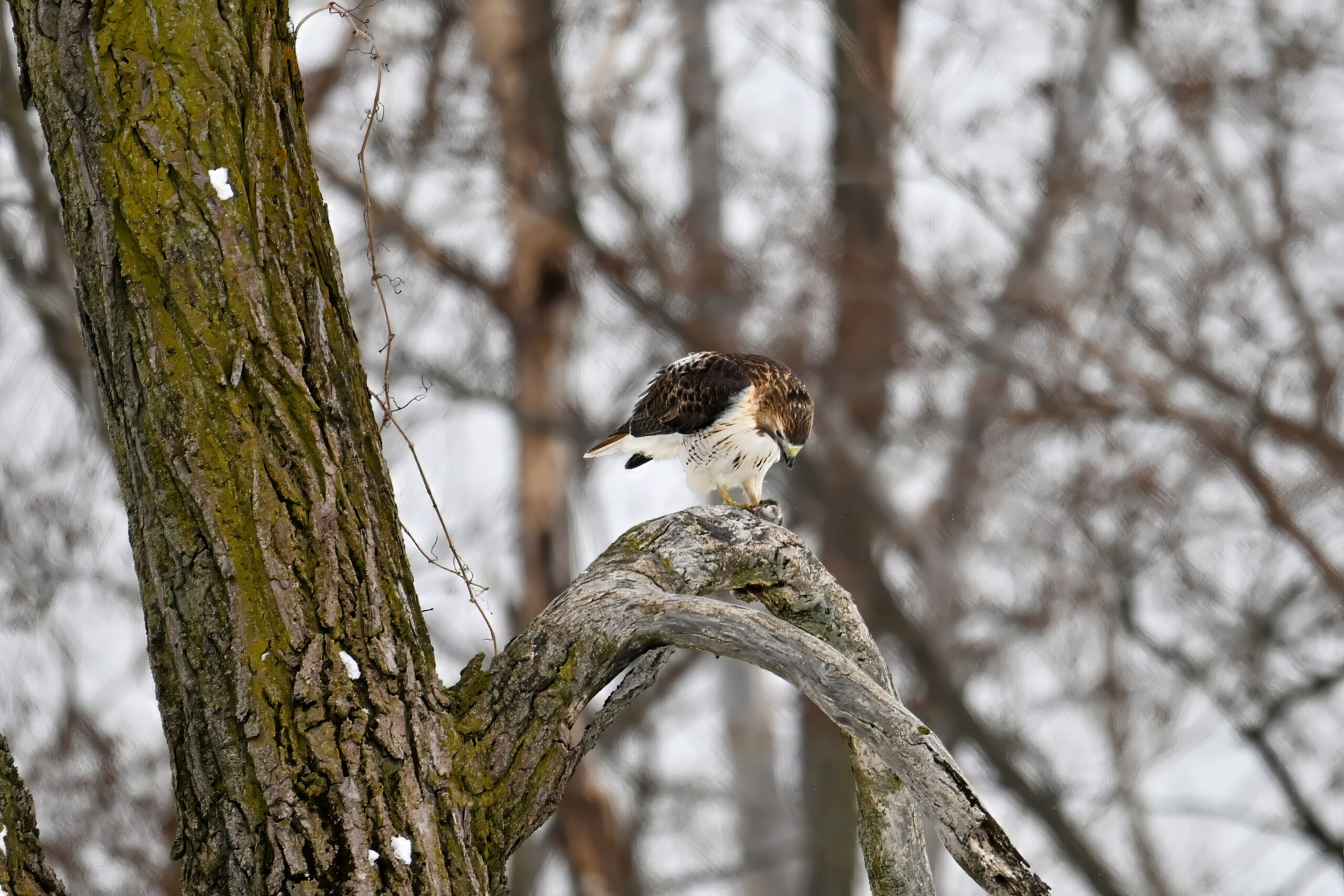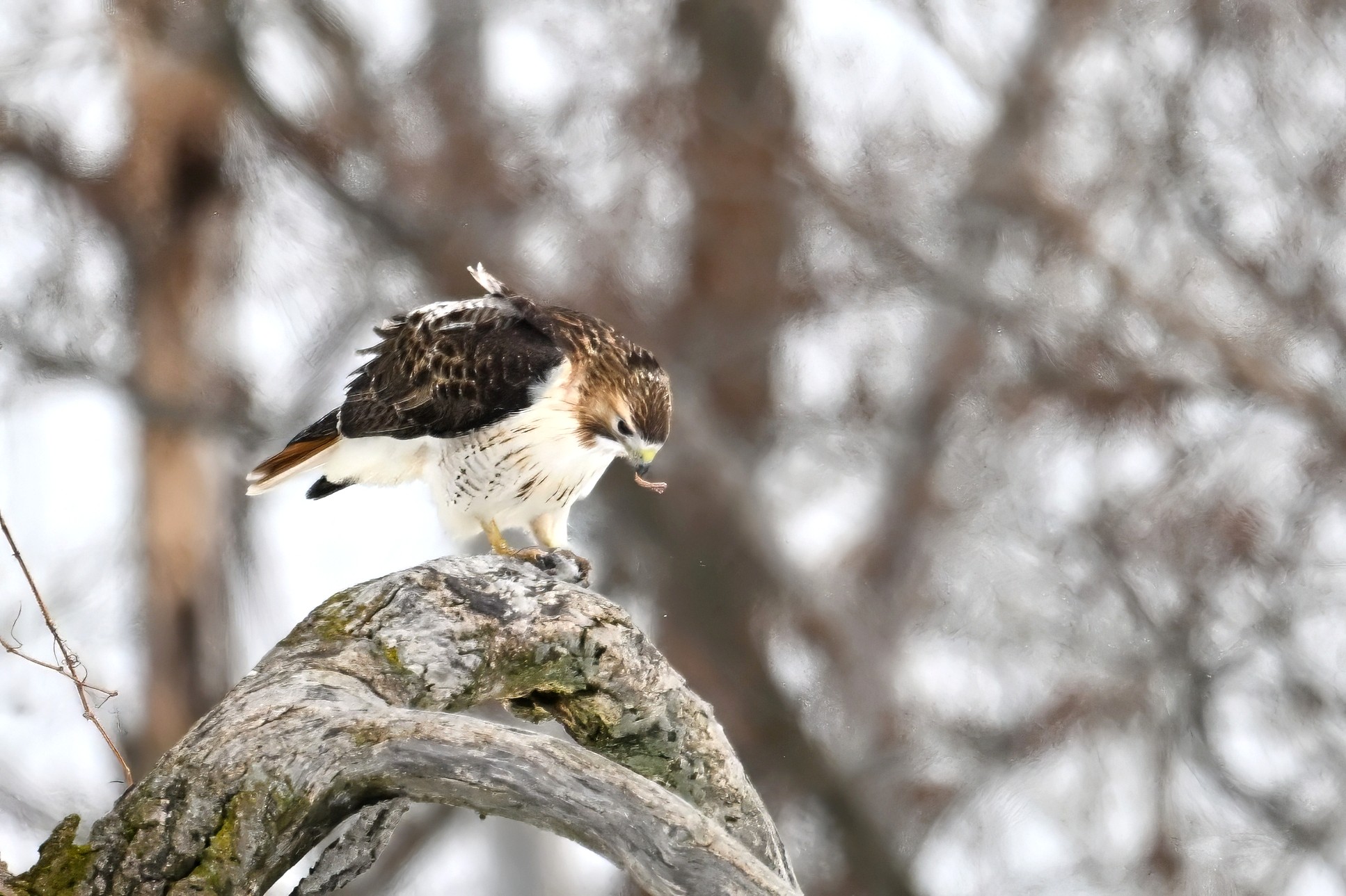 From yesterday at Presque Isle State Park, it’s a beautiful Red-tailed Hawk exhibiting predation/eating behaviours. These shots just after the hawk caught a small, unfortunate rodent. Weather at Presque Isle: mostly cloudy and very, very cold.