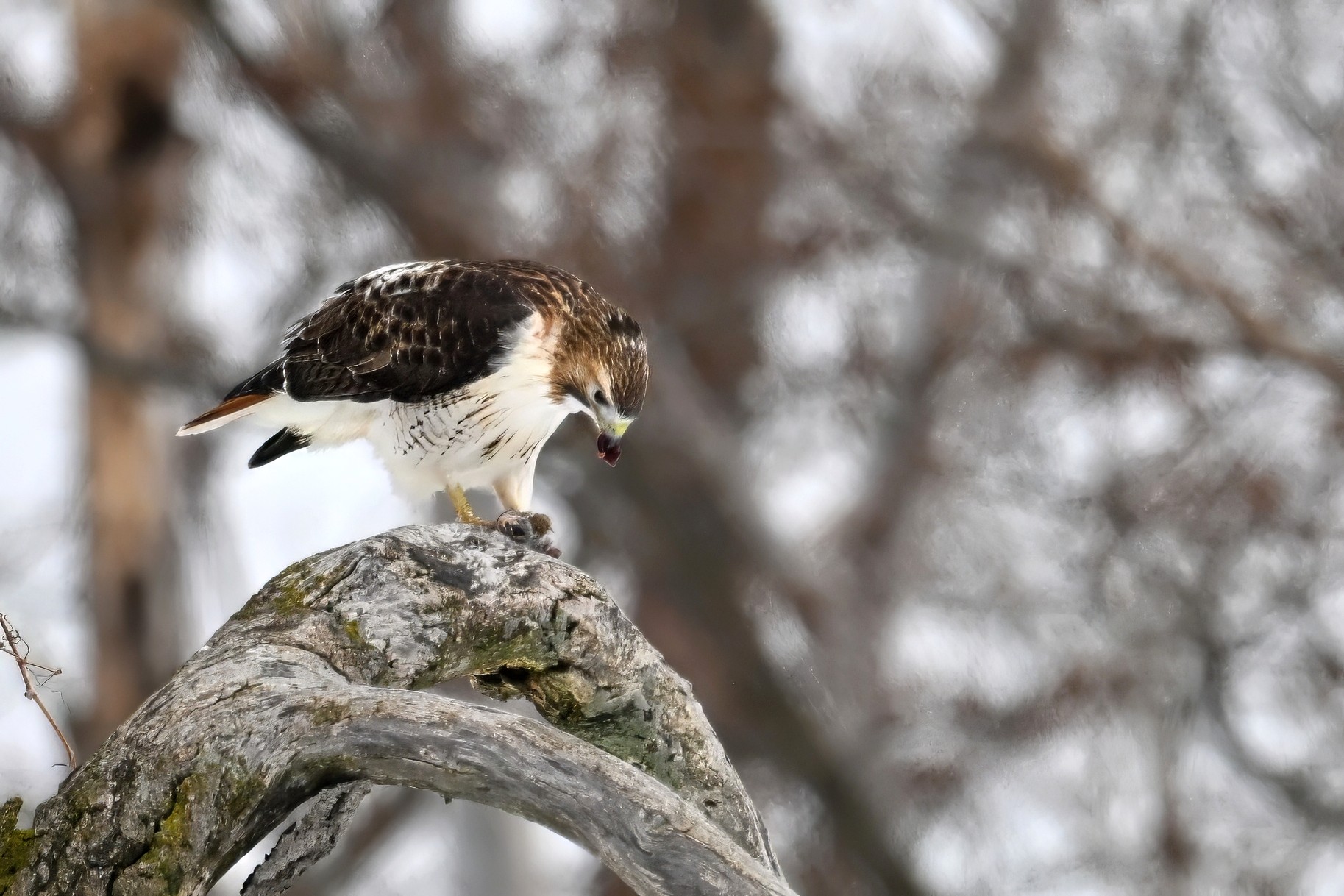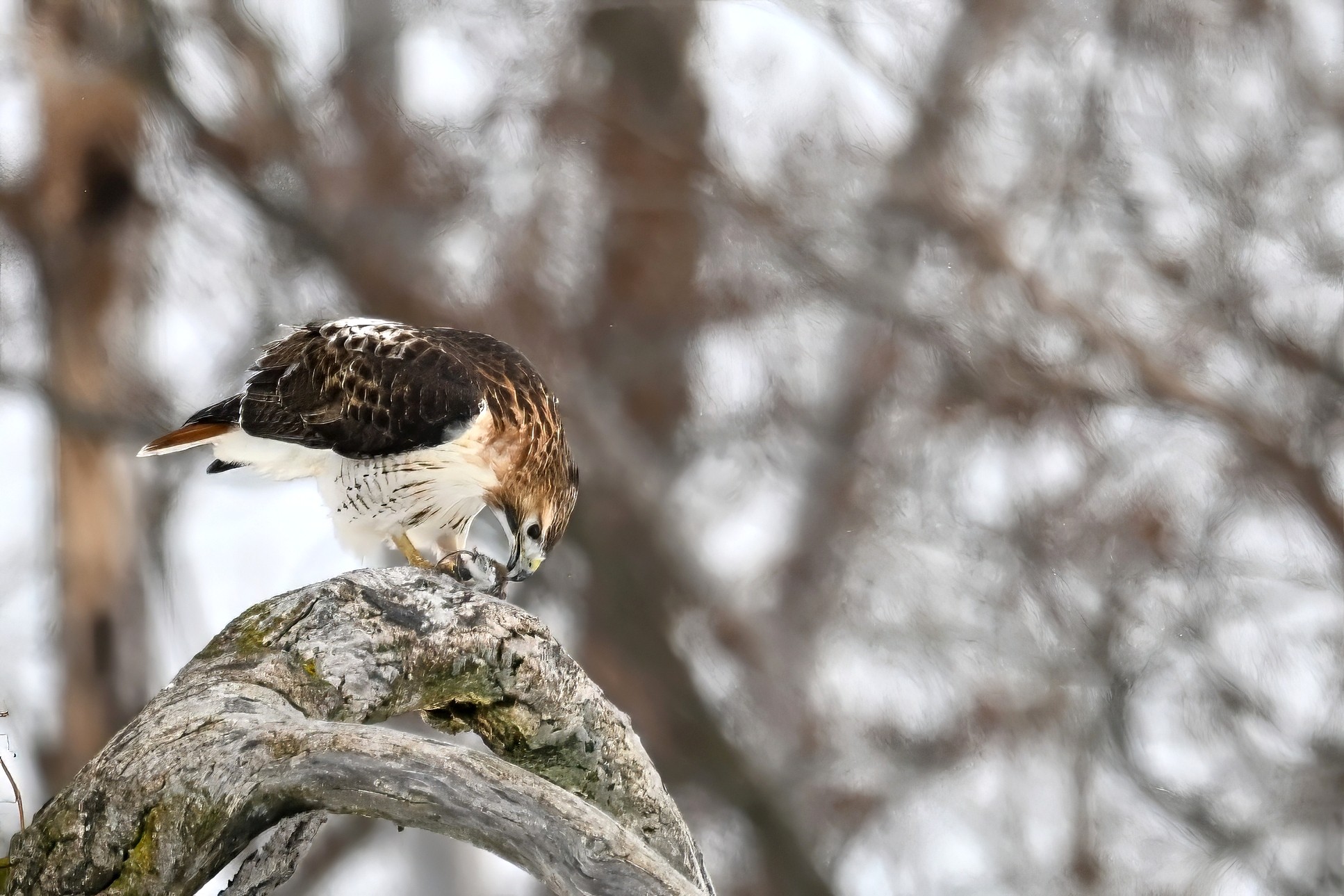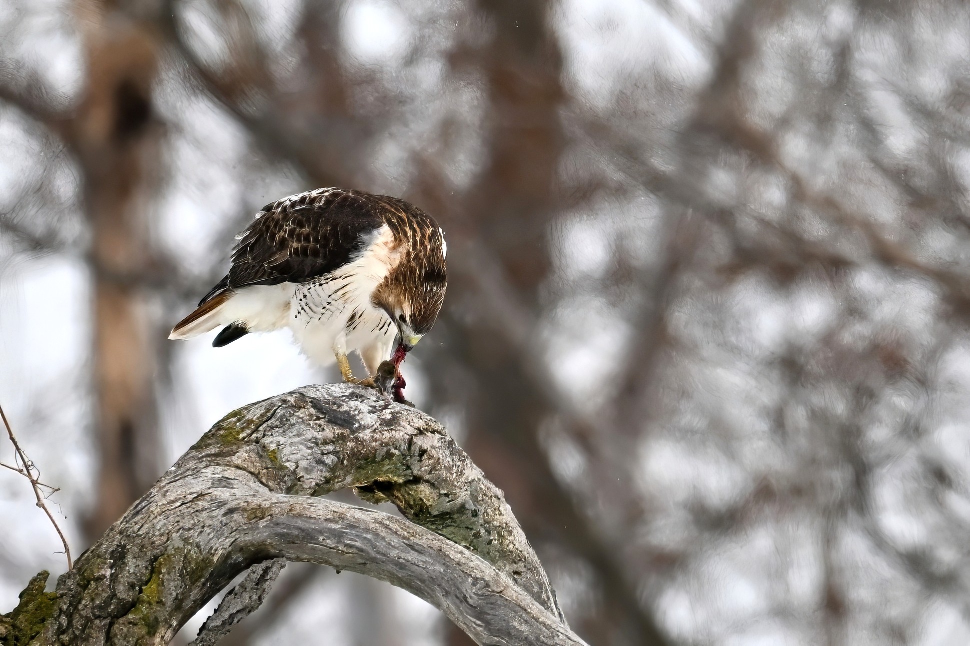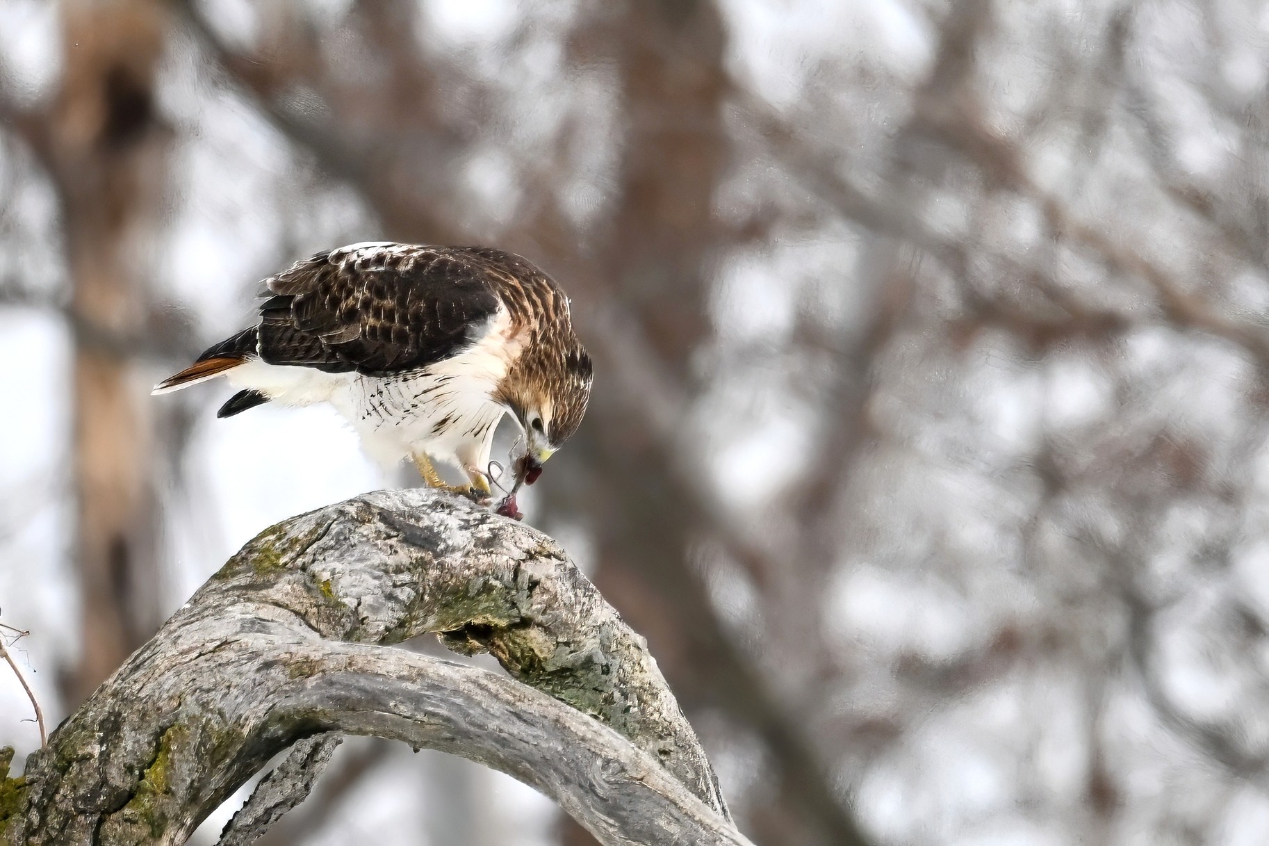From yesterday at Presque Isle State Park, it’s a beautiful Red-tailed Hawk exhibiting predation/eating behaviours. These shots just after the hawk caught a small, unfortunate rodent. Weather at Presque Isle: mostly cloudy and very, very cold.