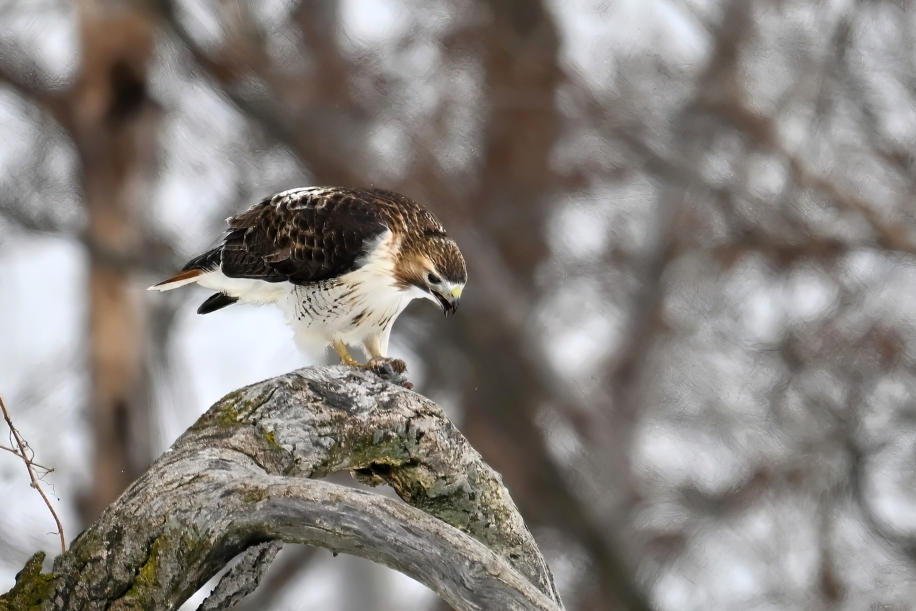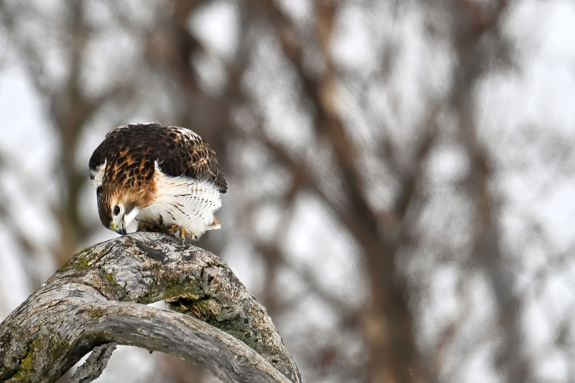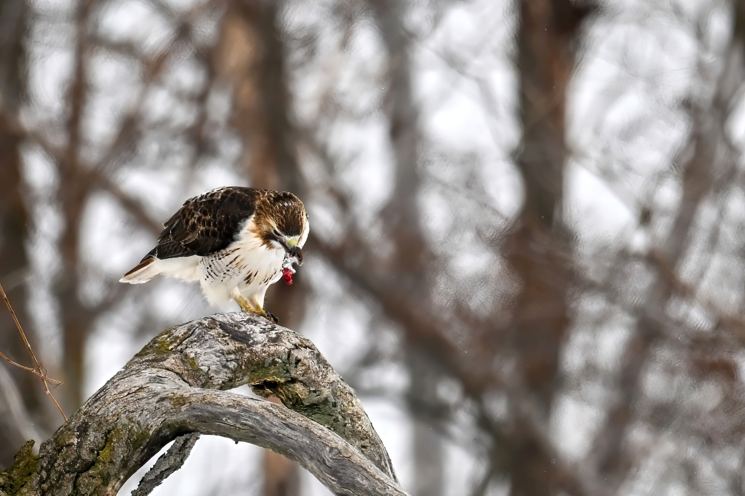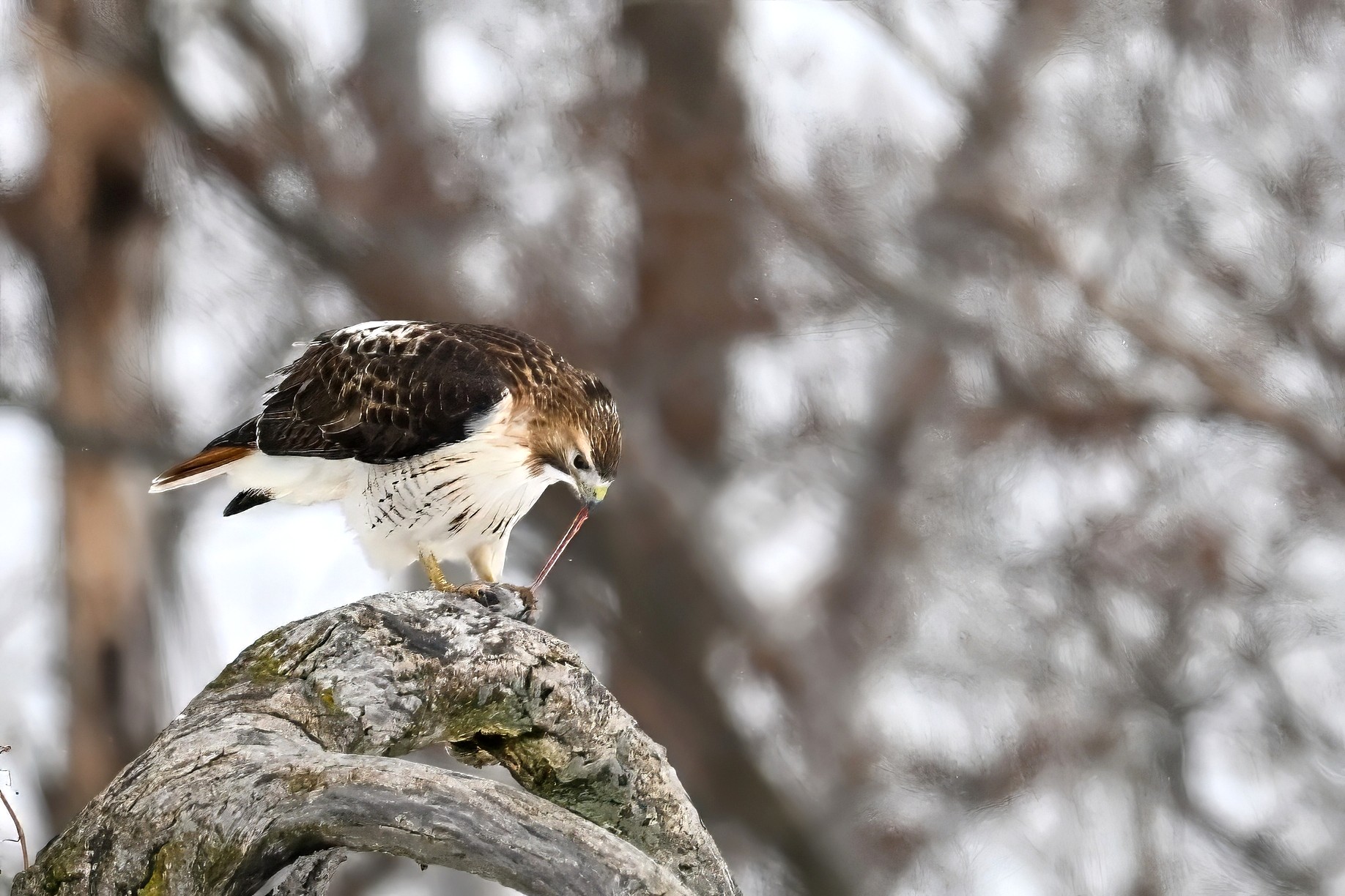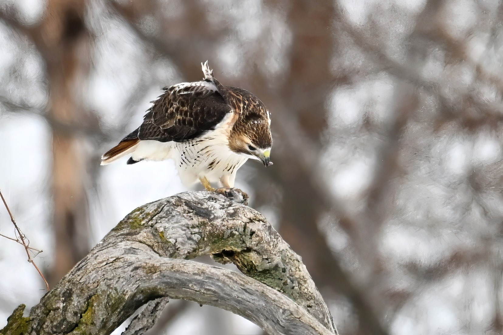 From yesterday at Presque Isle State Park, it’s a beautiful Red-tailed Hawk exhibiting predation/eating behaviours. These shots just after the hawk caught a small, unfortunate rodent. Weather at Presque Isle: mostly cloudy and very, very cold.
