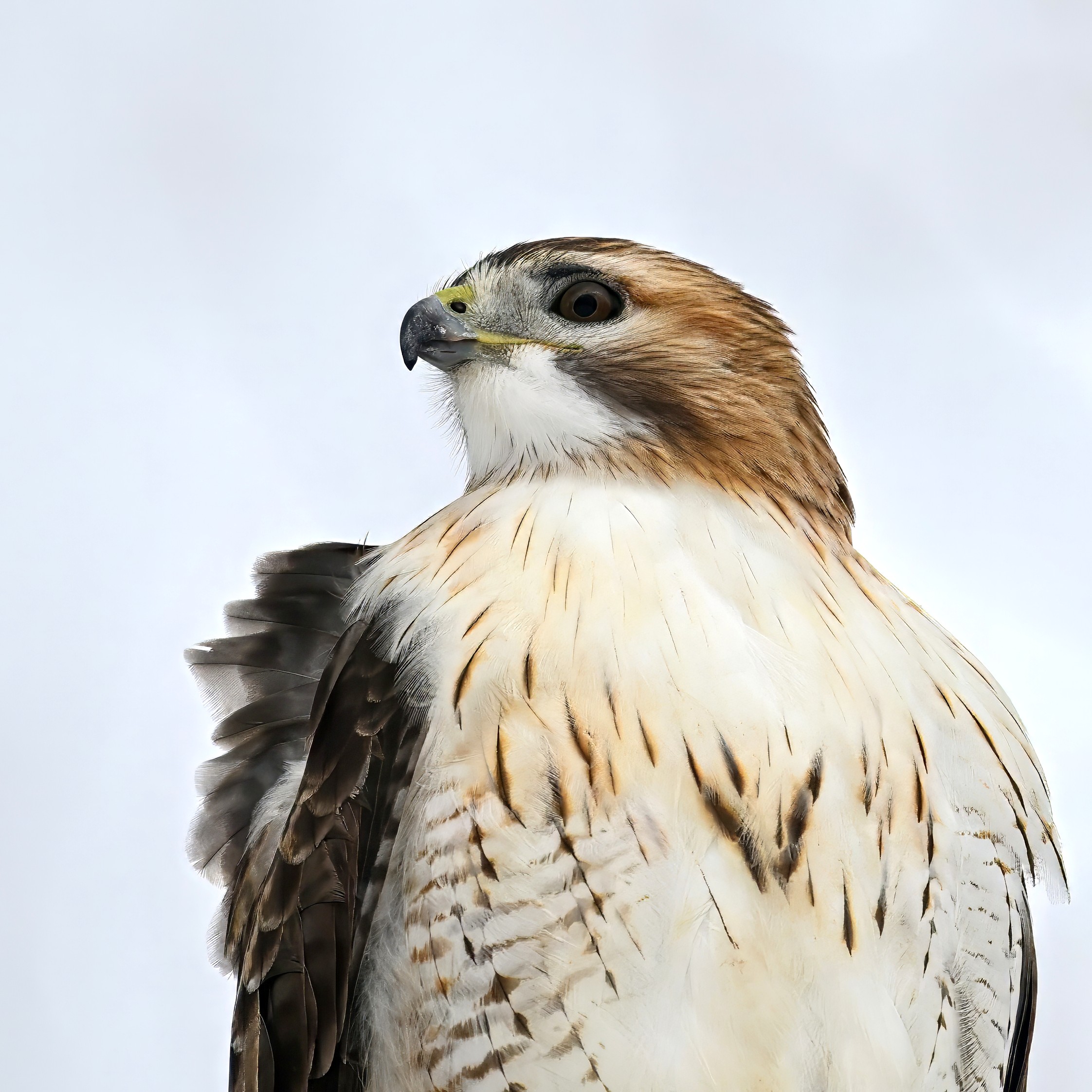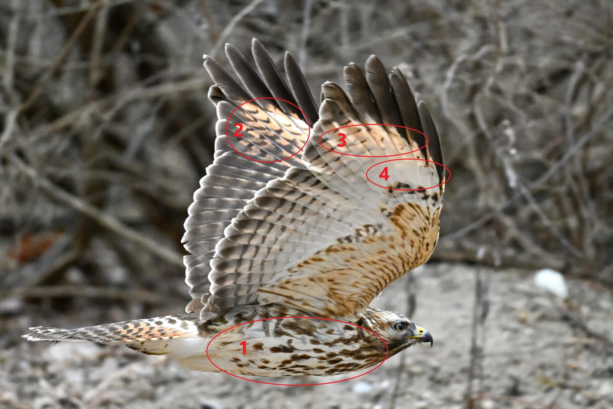 Red-shouldered Hawk is similar in size and appearance to Red-tailed Hawk, especially an immature (1st winter) bird as here. ID tips for immature Red-shouldered Hawk: (1) even, heavy streaking from throat to lower belly (Red-tailed Hawk has a narrow band of streaking mid-belly); (2) buffy patch towards end of outer wings; (3) translucent crescent as seen adjacent primaries from wing underside; (4) white crescent on wing underside; (5) another view of buffy patch; and (6) hint of red shoulder: