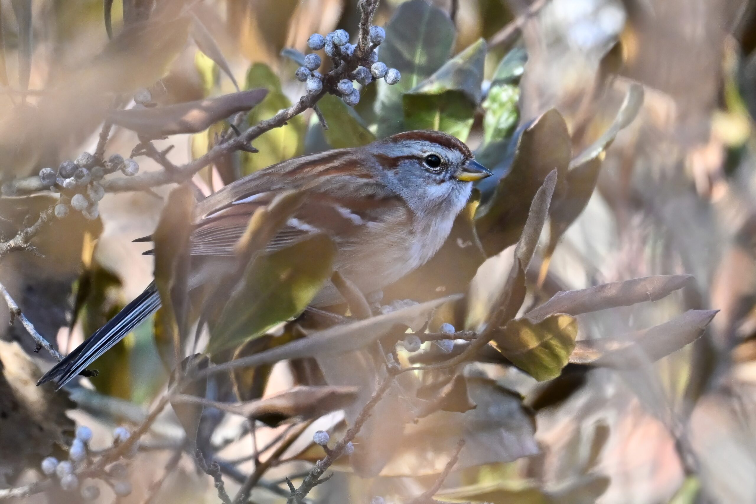 Here’s a view of American Tree Sparrow on a Bayberry, with Bayberry fruit top center: