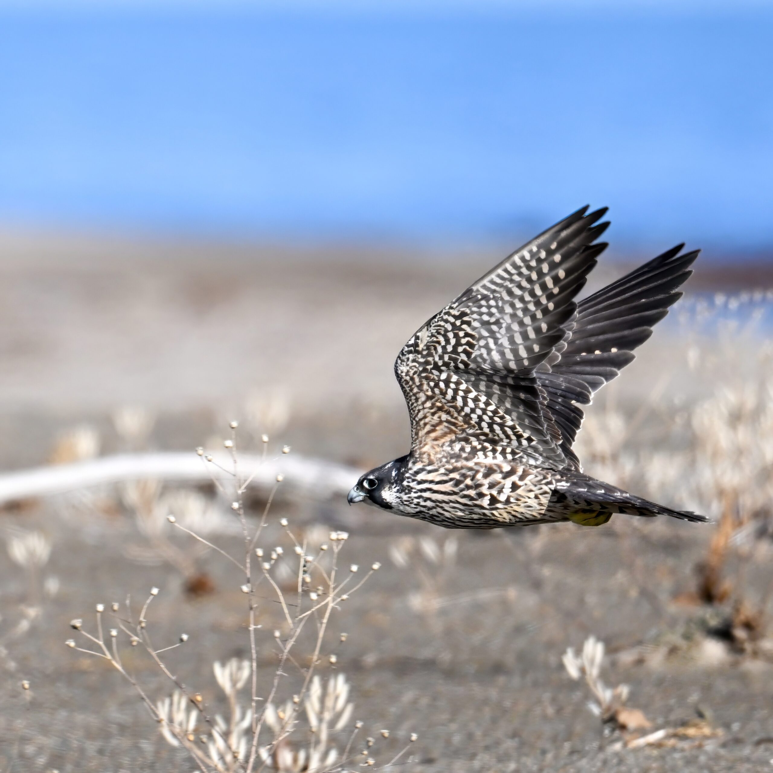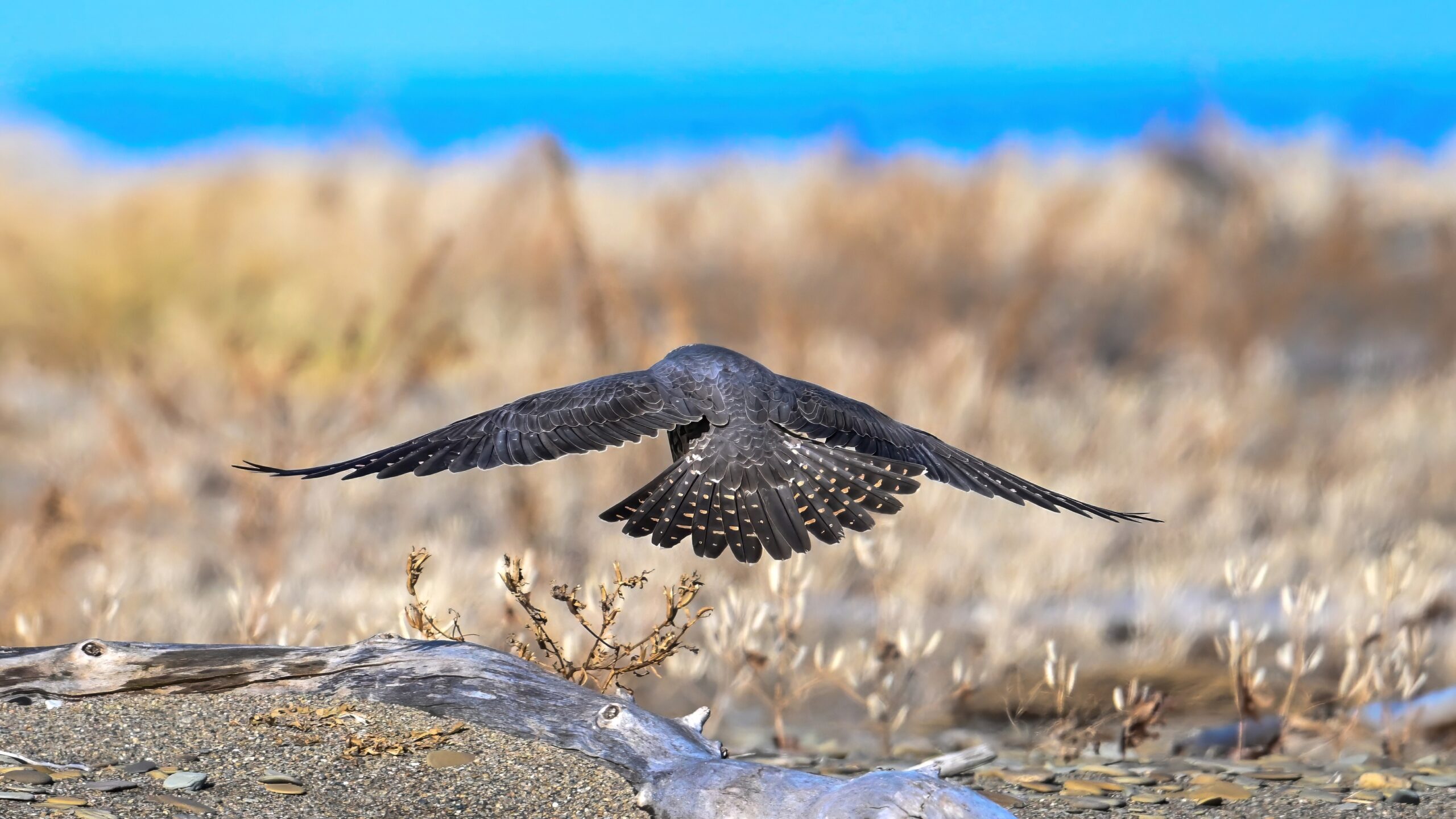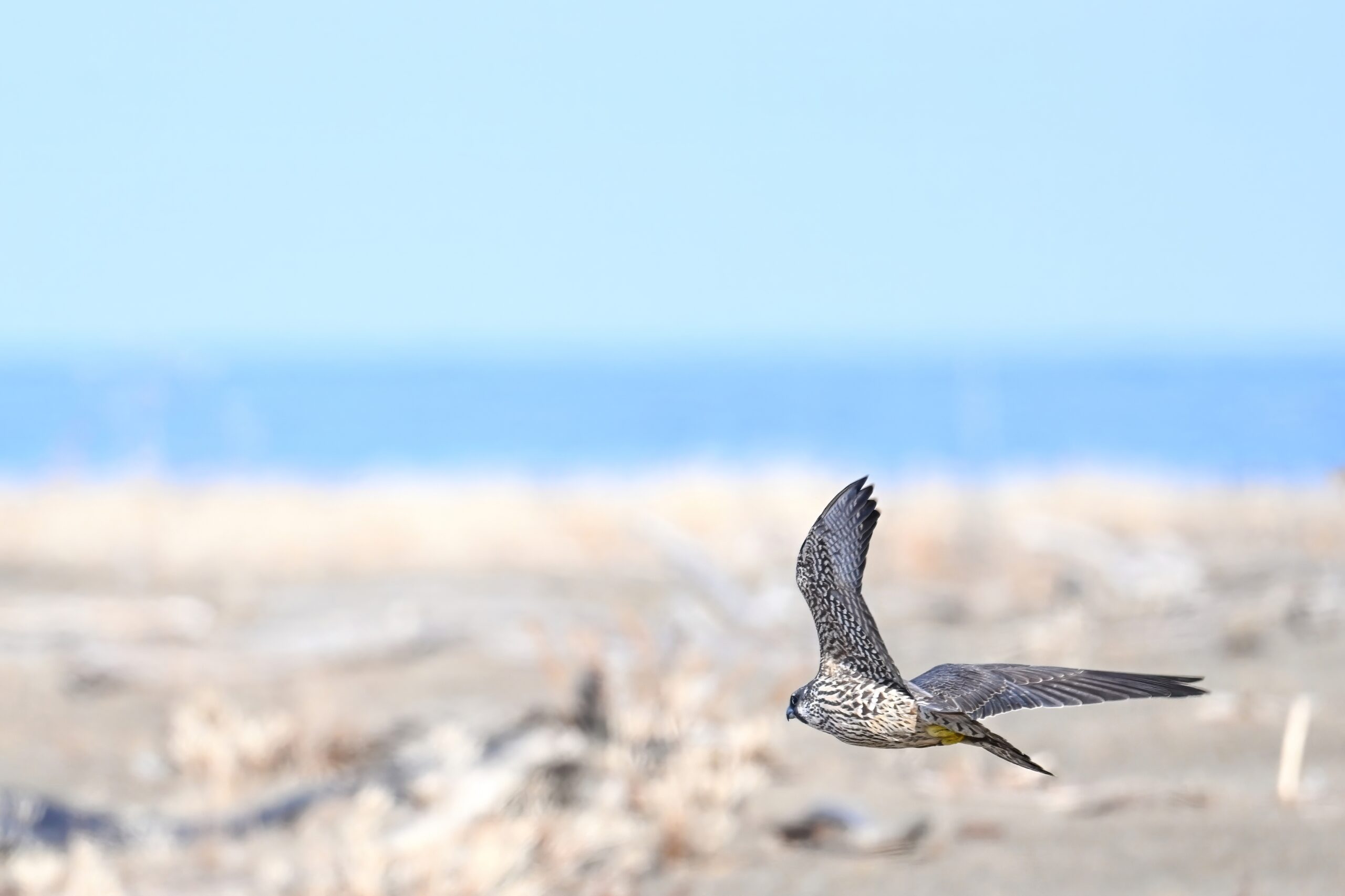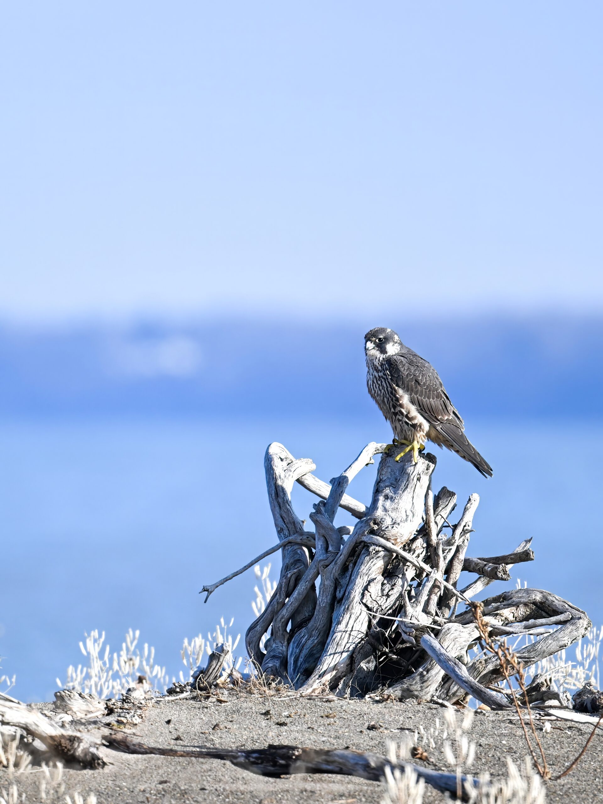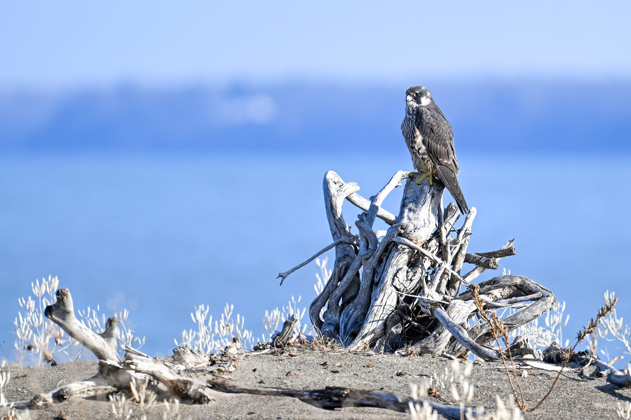 (As shown, after some shots perched on driftwood, the Peregrine Falcon was mostly seen in departure mode.)