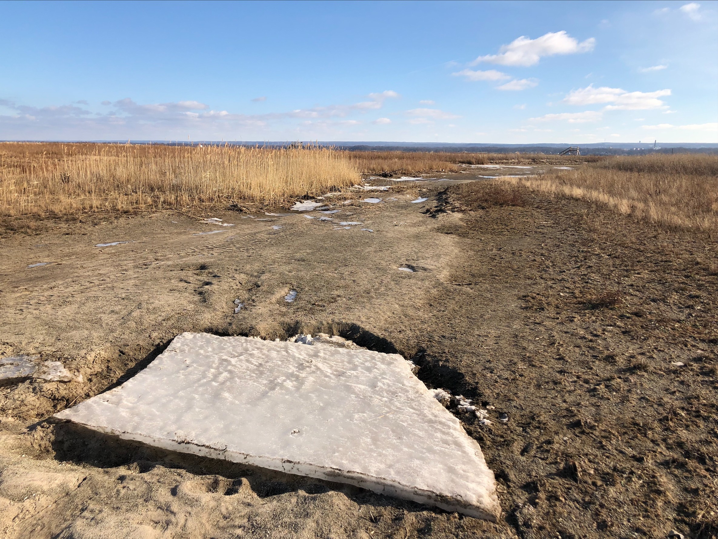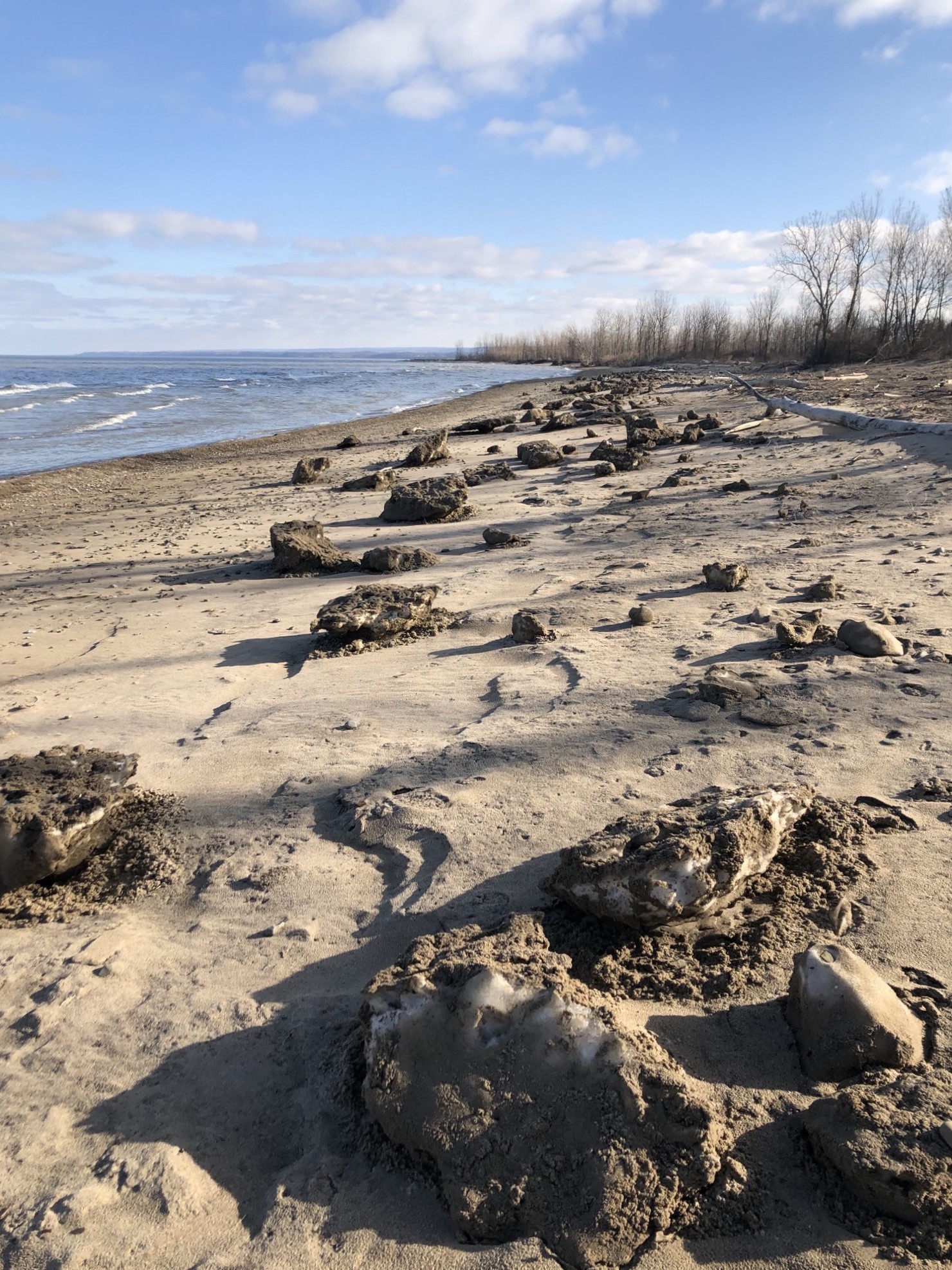 Melting ice/snow chunks on Budny Beach, view looking towards Gull Point