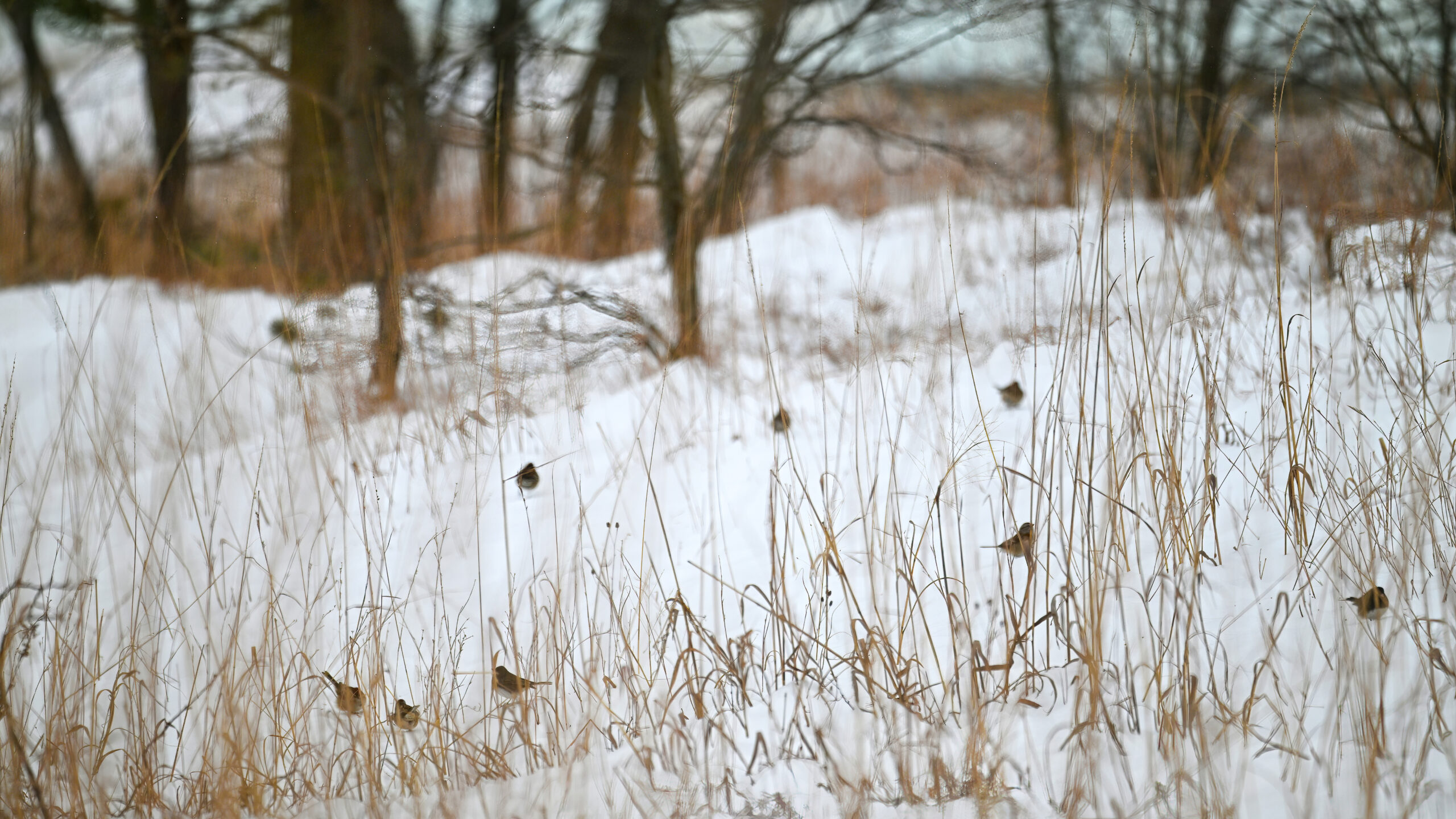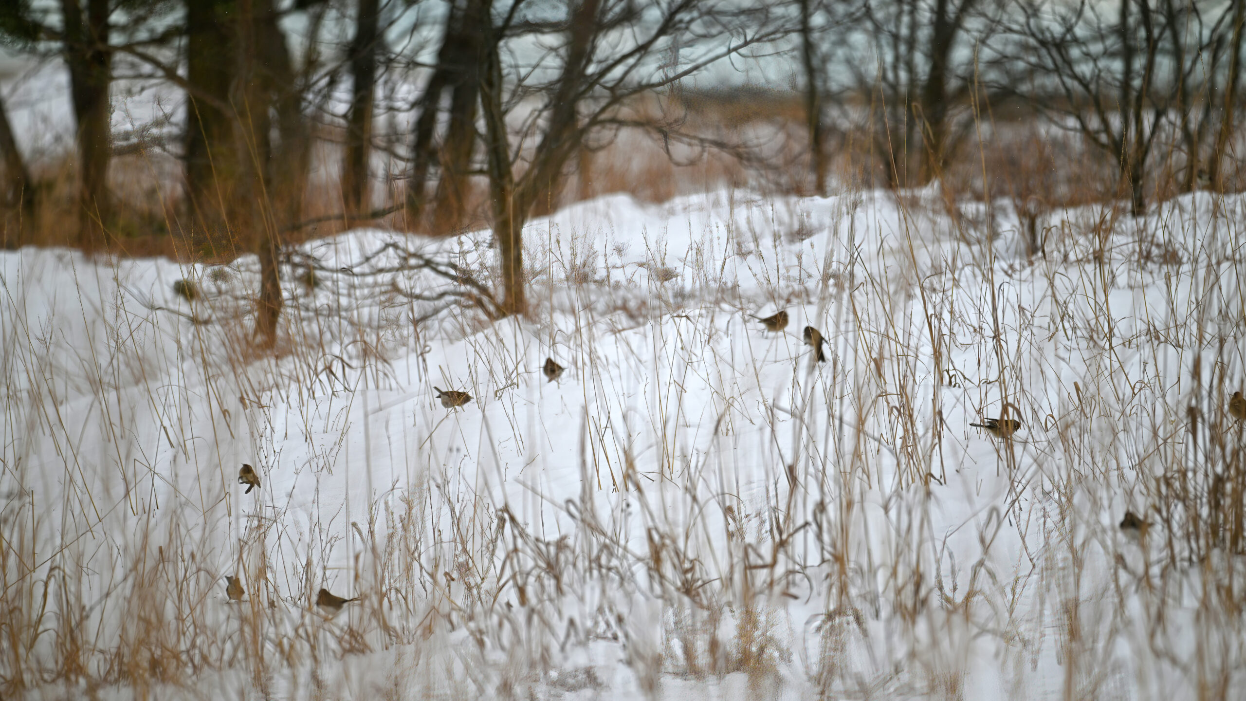More from New Year’s Day, under relatively gloomy and cold conditions, it’s content featuring a fairly sizeable flock (20+) of American Tree Sparrows foraging on dried grass along the dune line in the Sunset Point area at Presque Isle State Park: