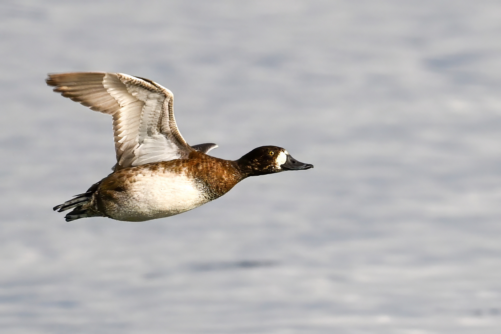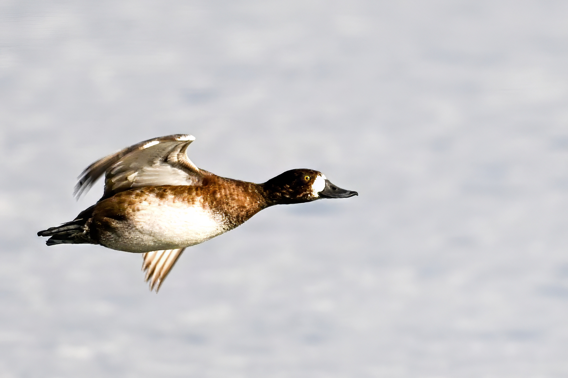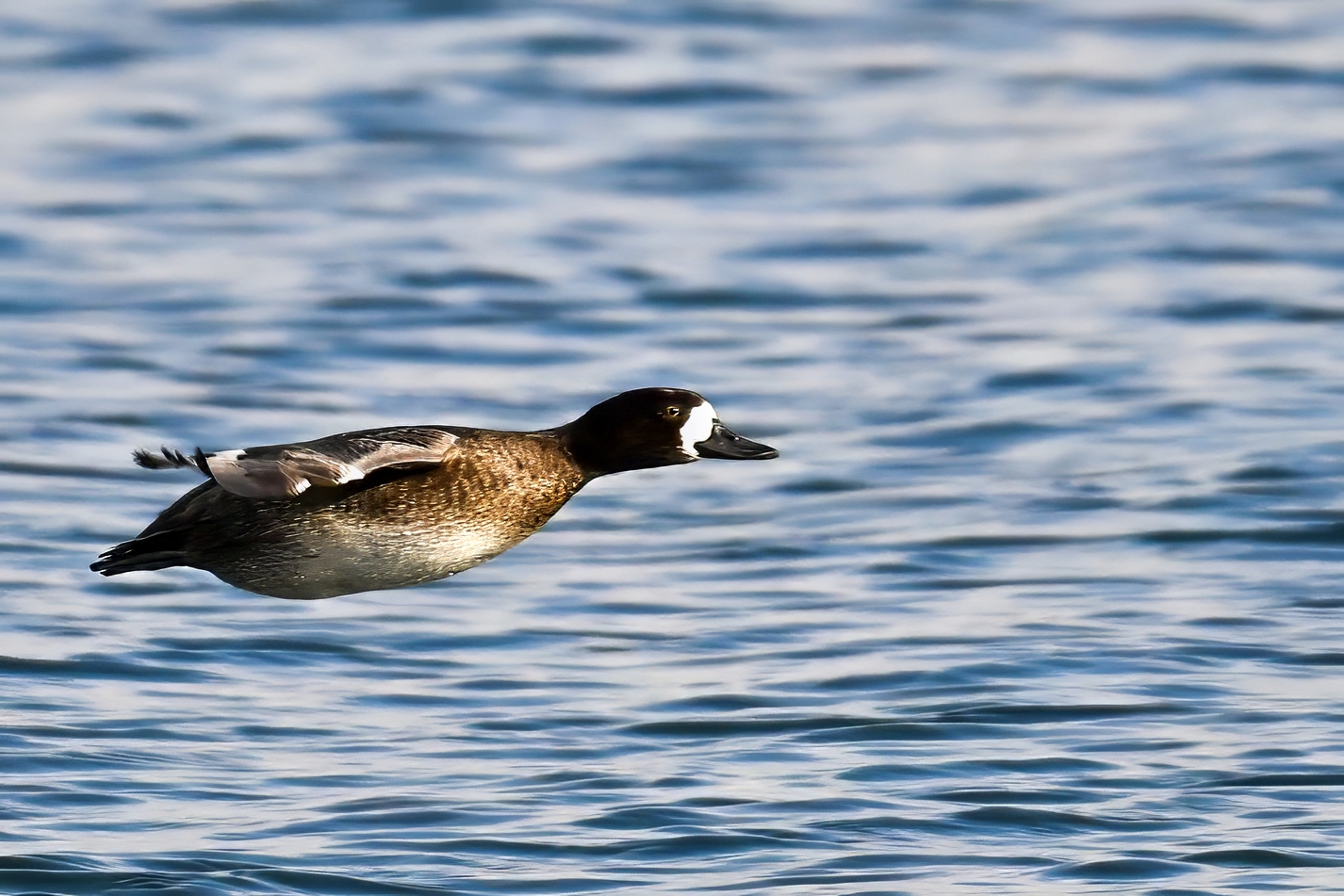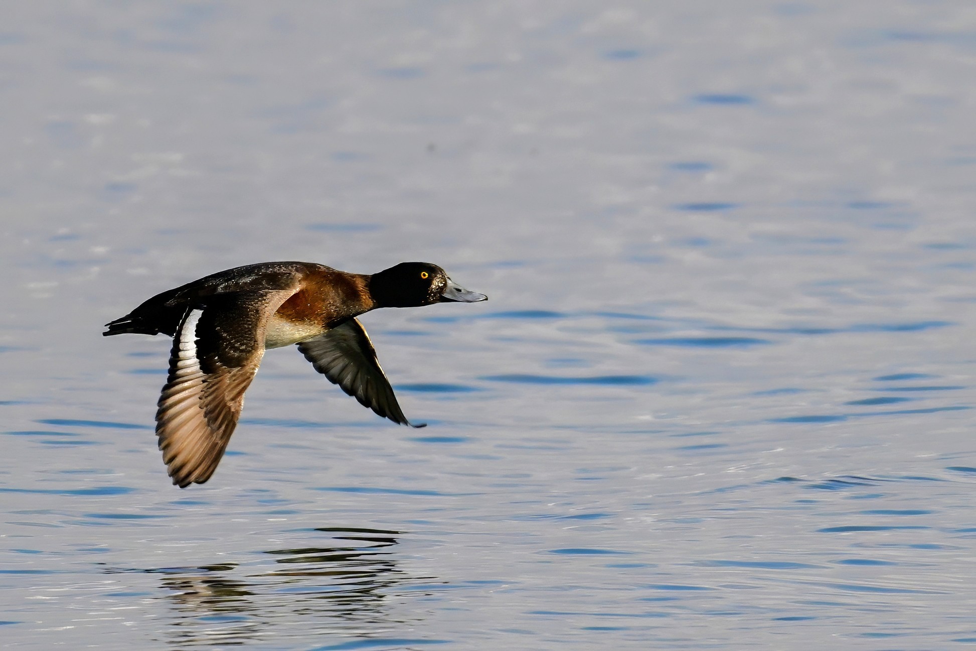Seems like usually ducks break in the wrong direction and/or against the light. (“Break” = startle and take flight.) Here, lucky that neither was the case, with a rather beautiful shot of Lesser Scaup: