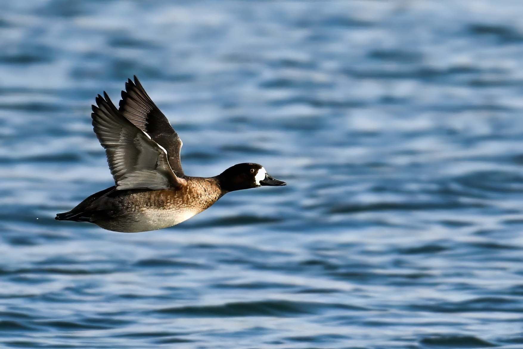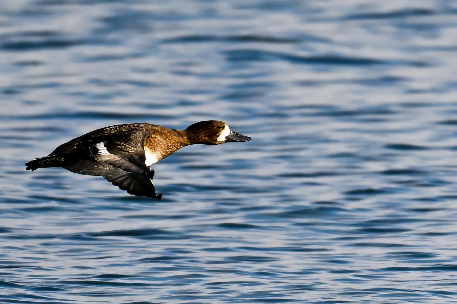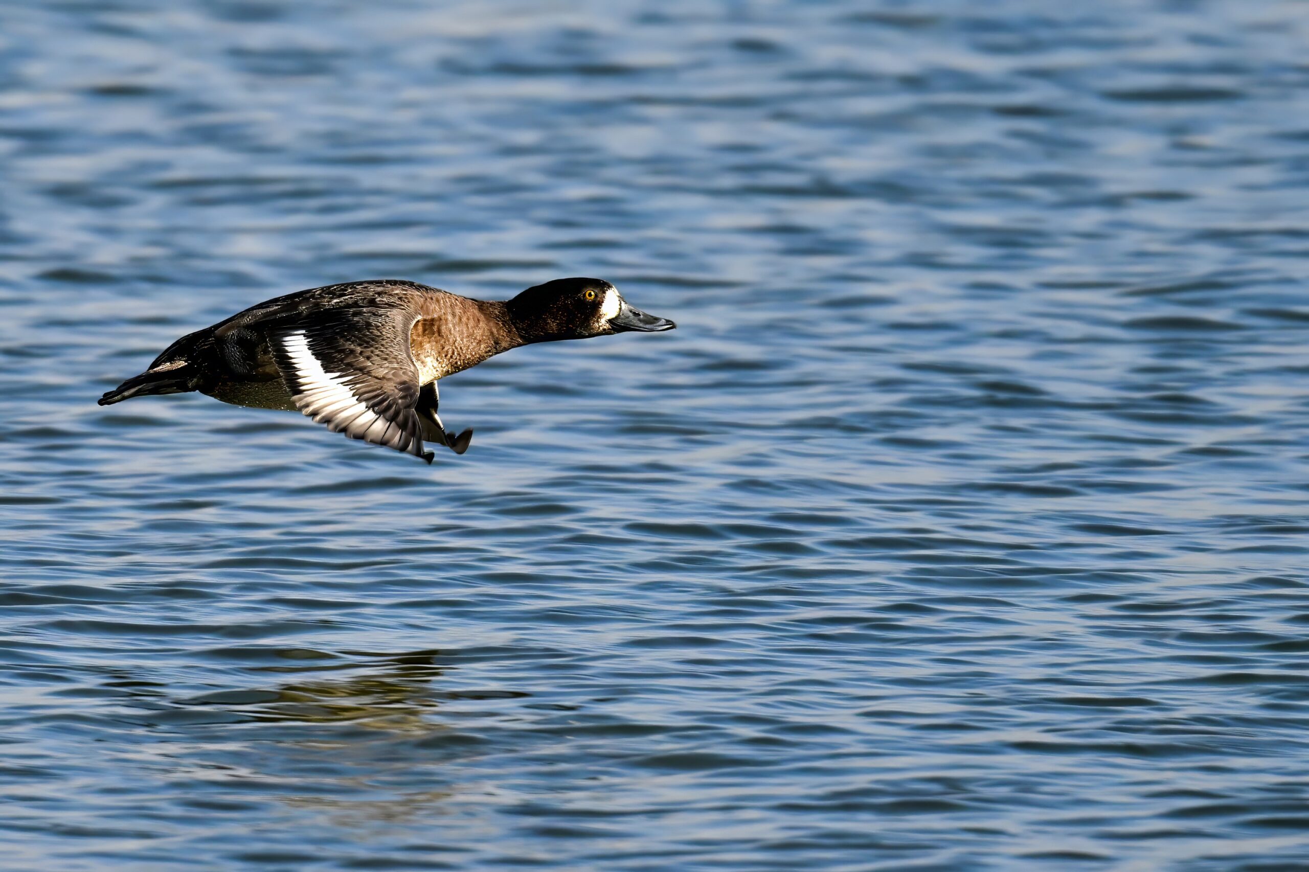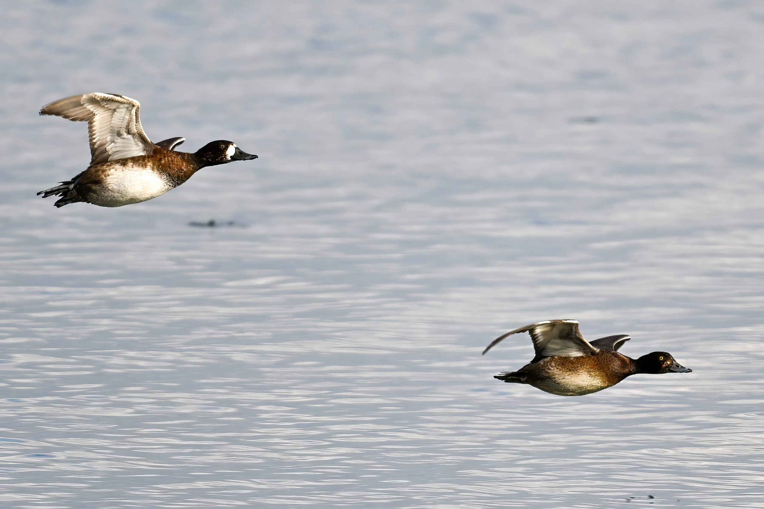 Seems like usually ducks break in the wrong direction and/or against the light. (“Break” = startle and take flight.) Here, lucky that neither was the case, with a rather beautiful shot of Lesser Scaup: