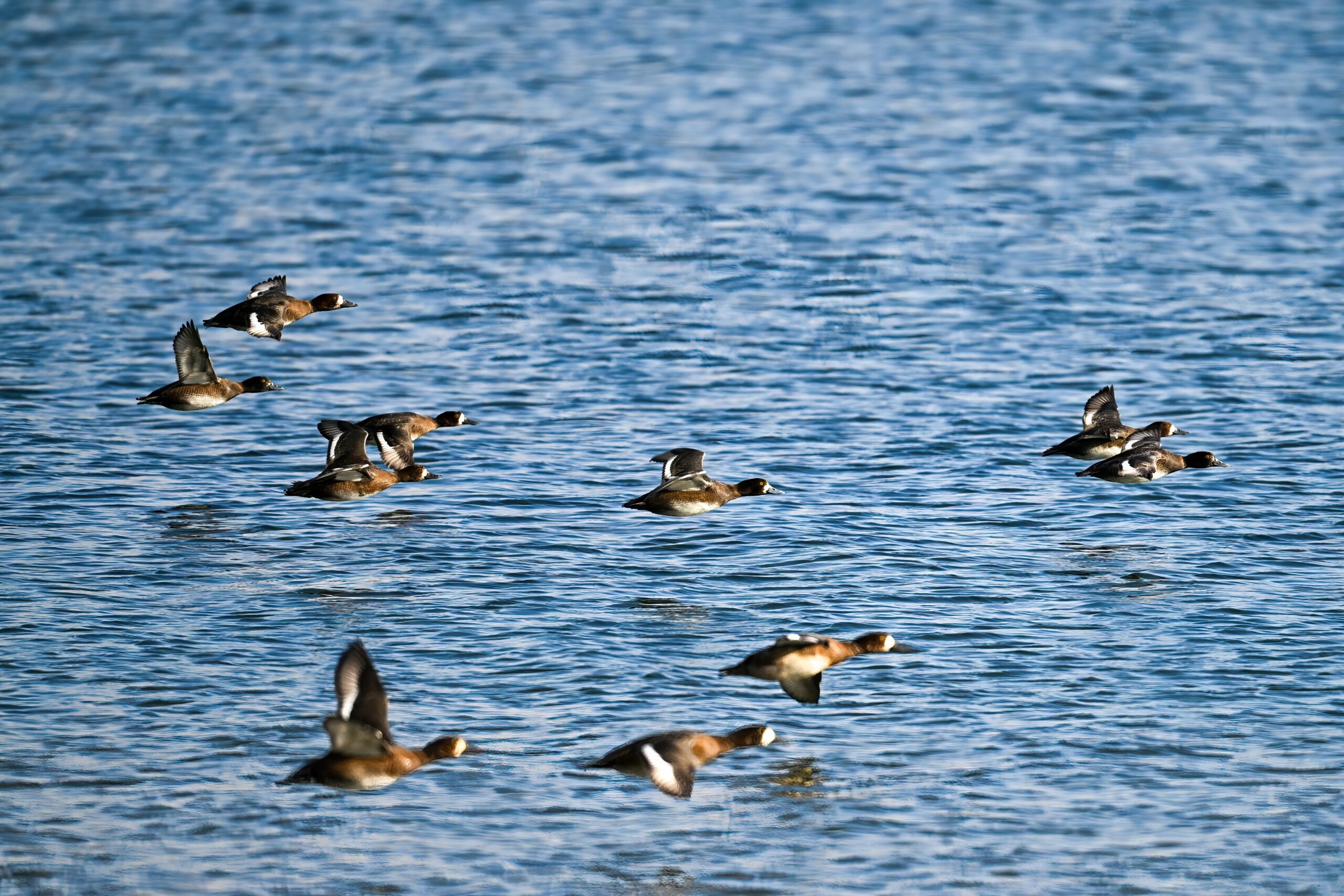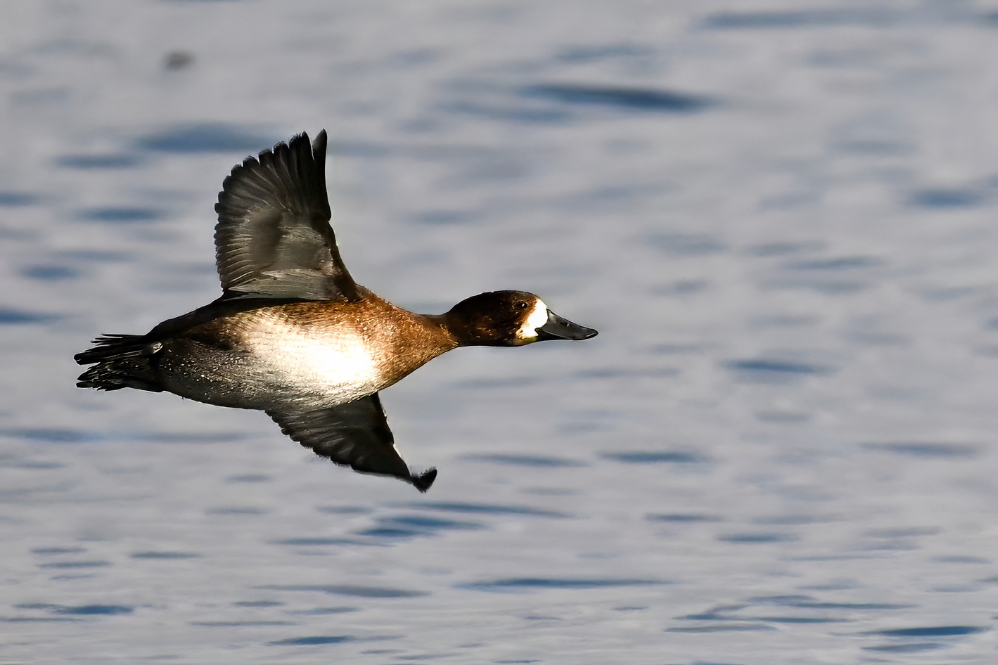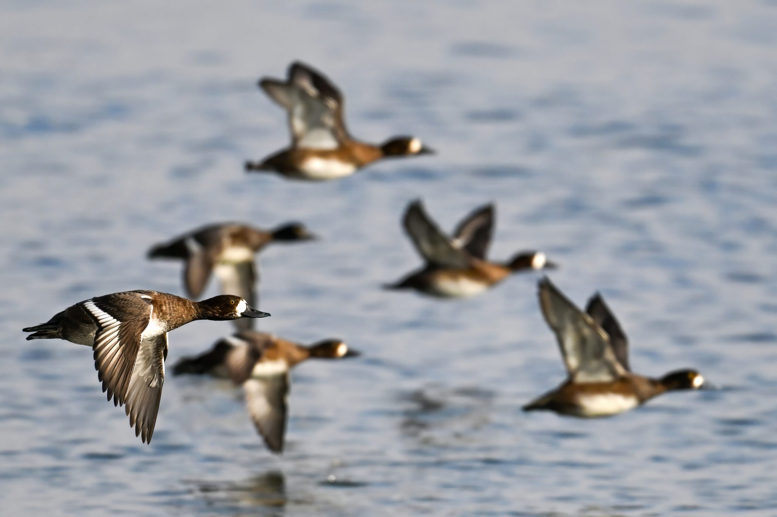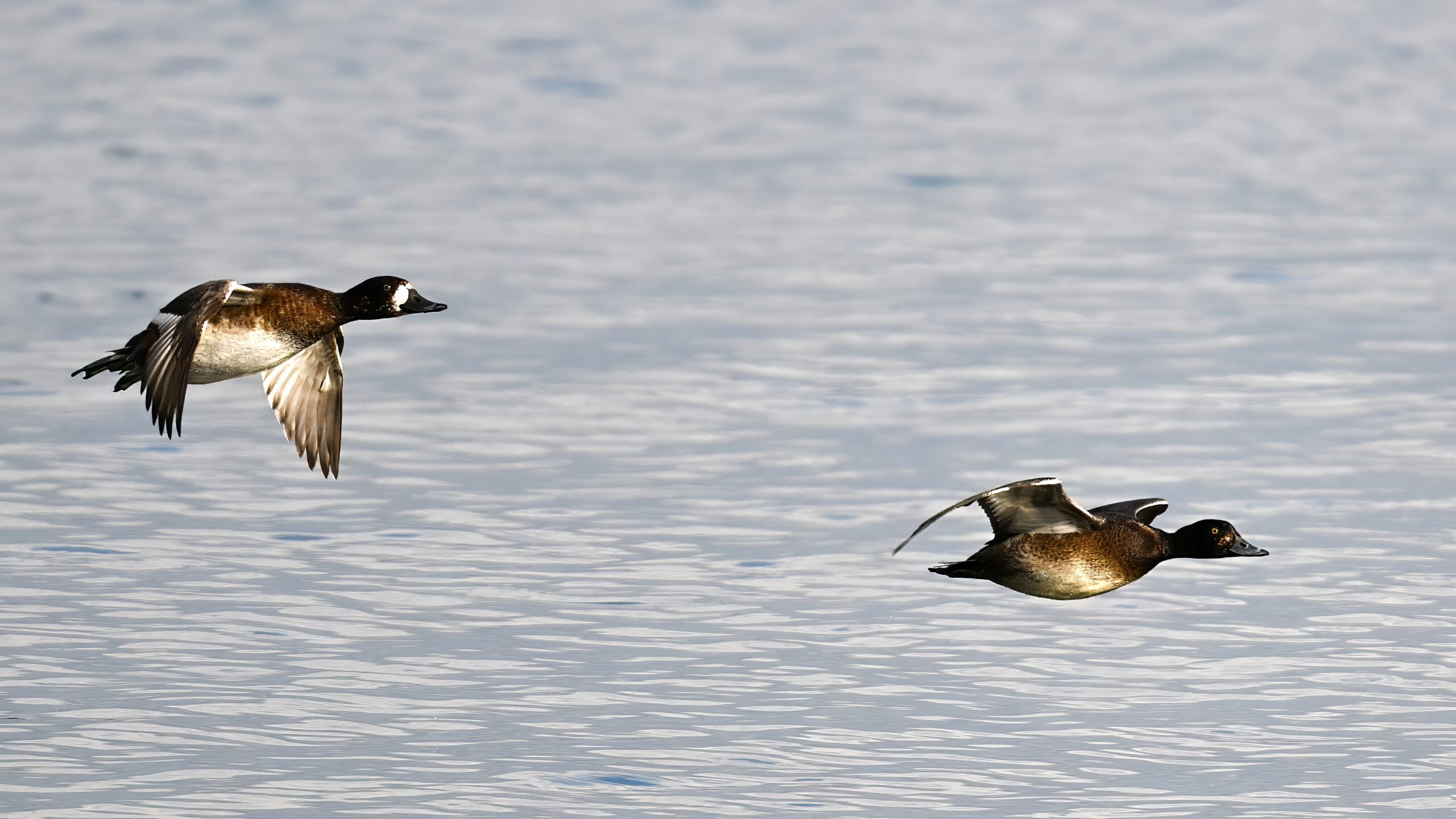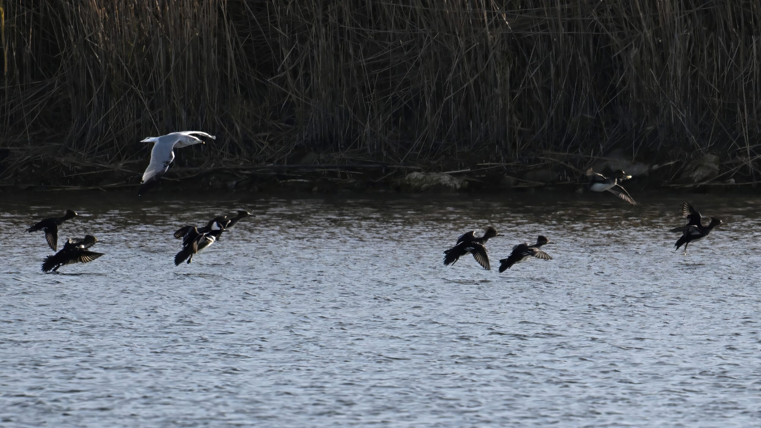 Seems like usually ducks break in the wrong direction and/or against the light. (“Break” = startle and take flight.) Here, lucky that neither was the case, with a rather beautiful shot of Lesser Scaup: