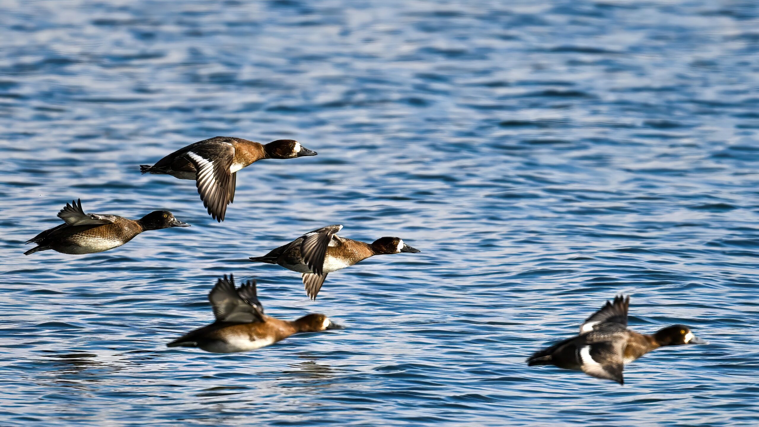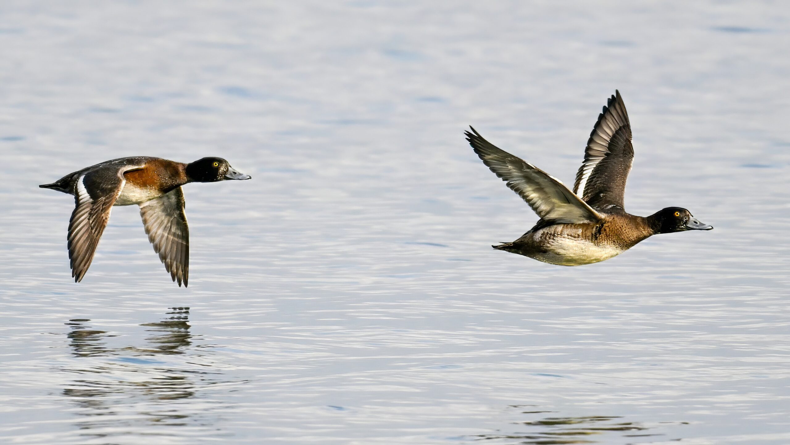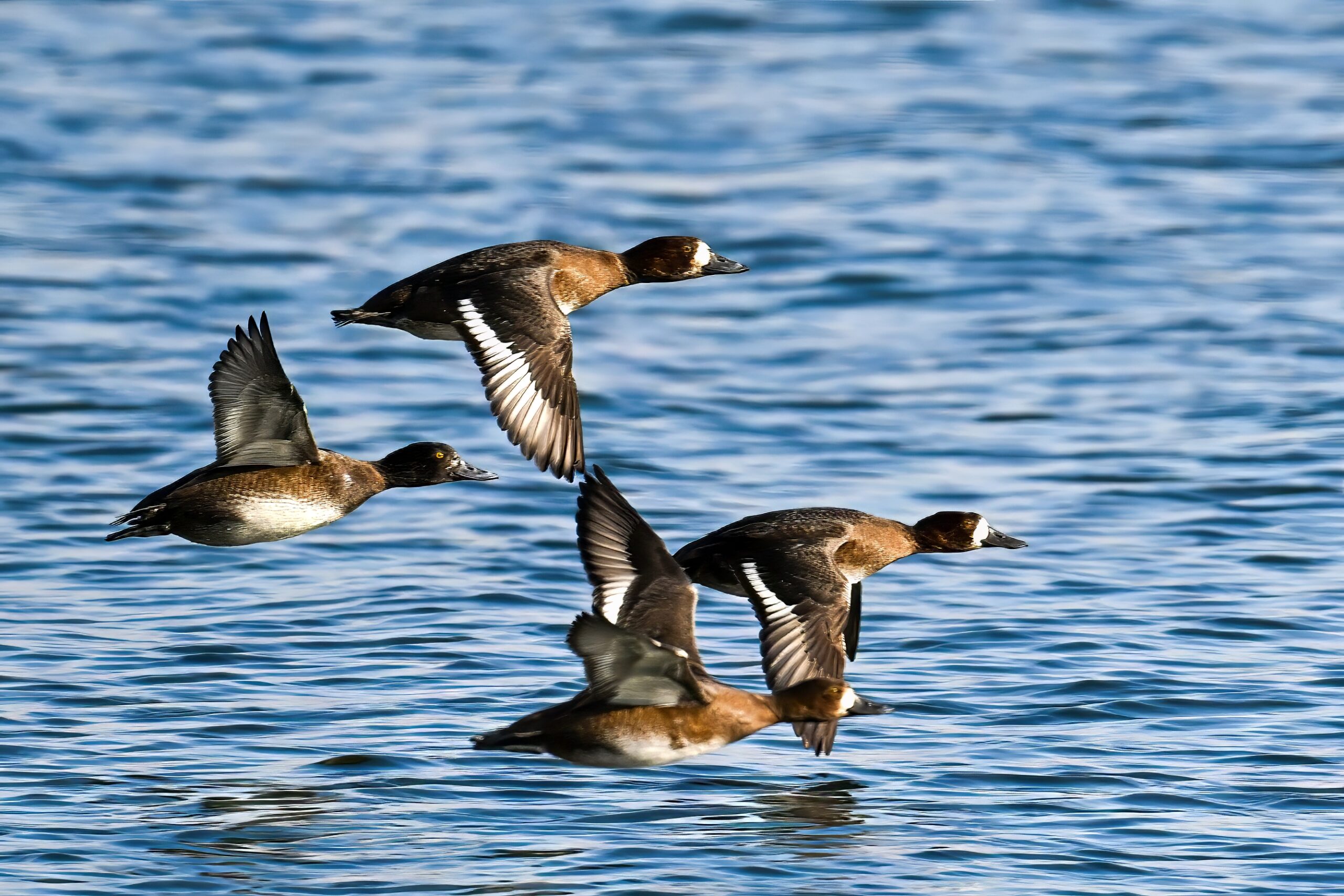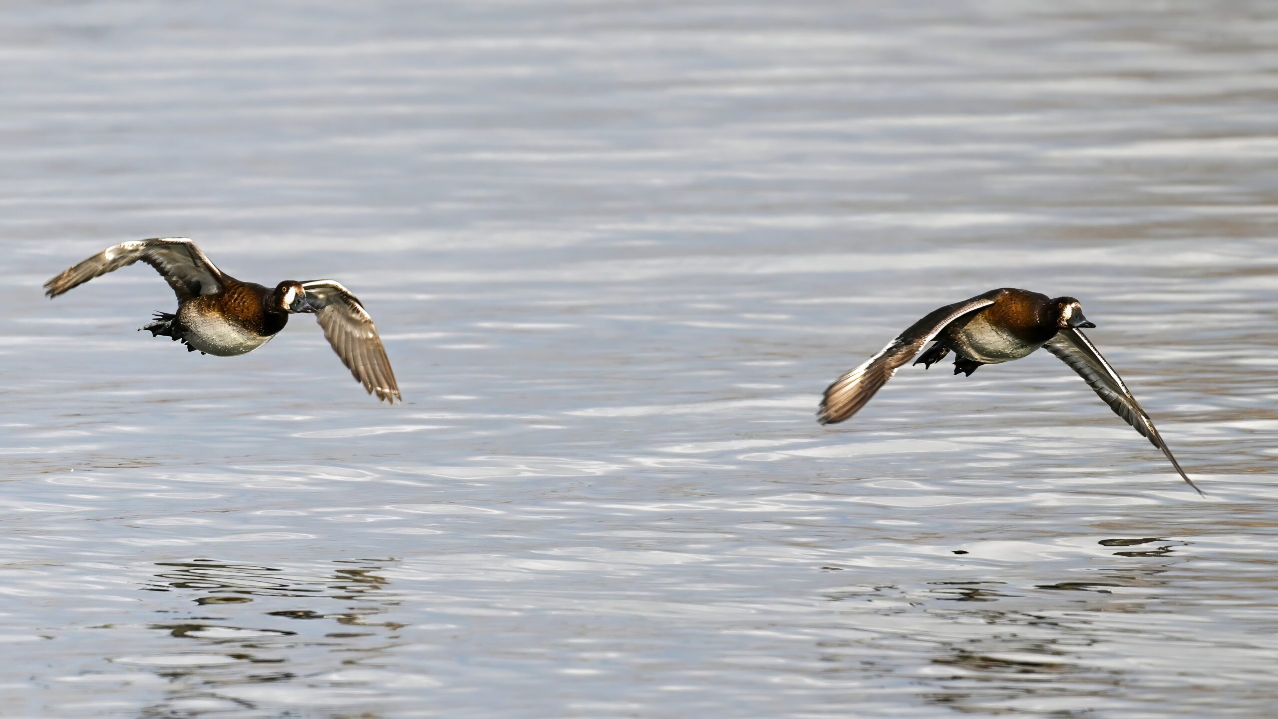 Seems like usually ducks break in the wrong direction and/or against the light. (“Break” = startle and take flight.) Here, lucky that neither was the case, with a rather beautiful shot of Lesser Scaup: