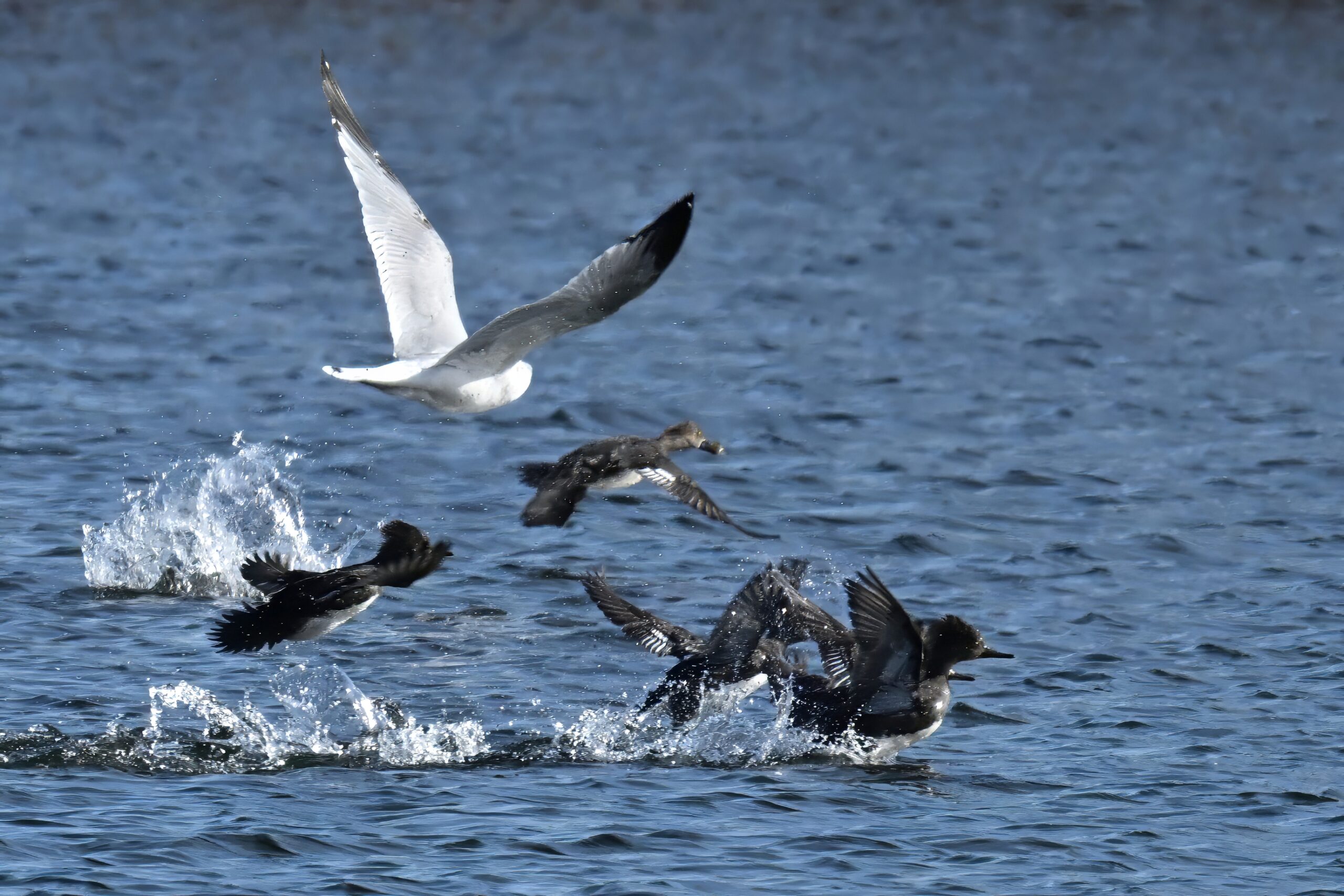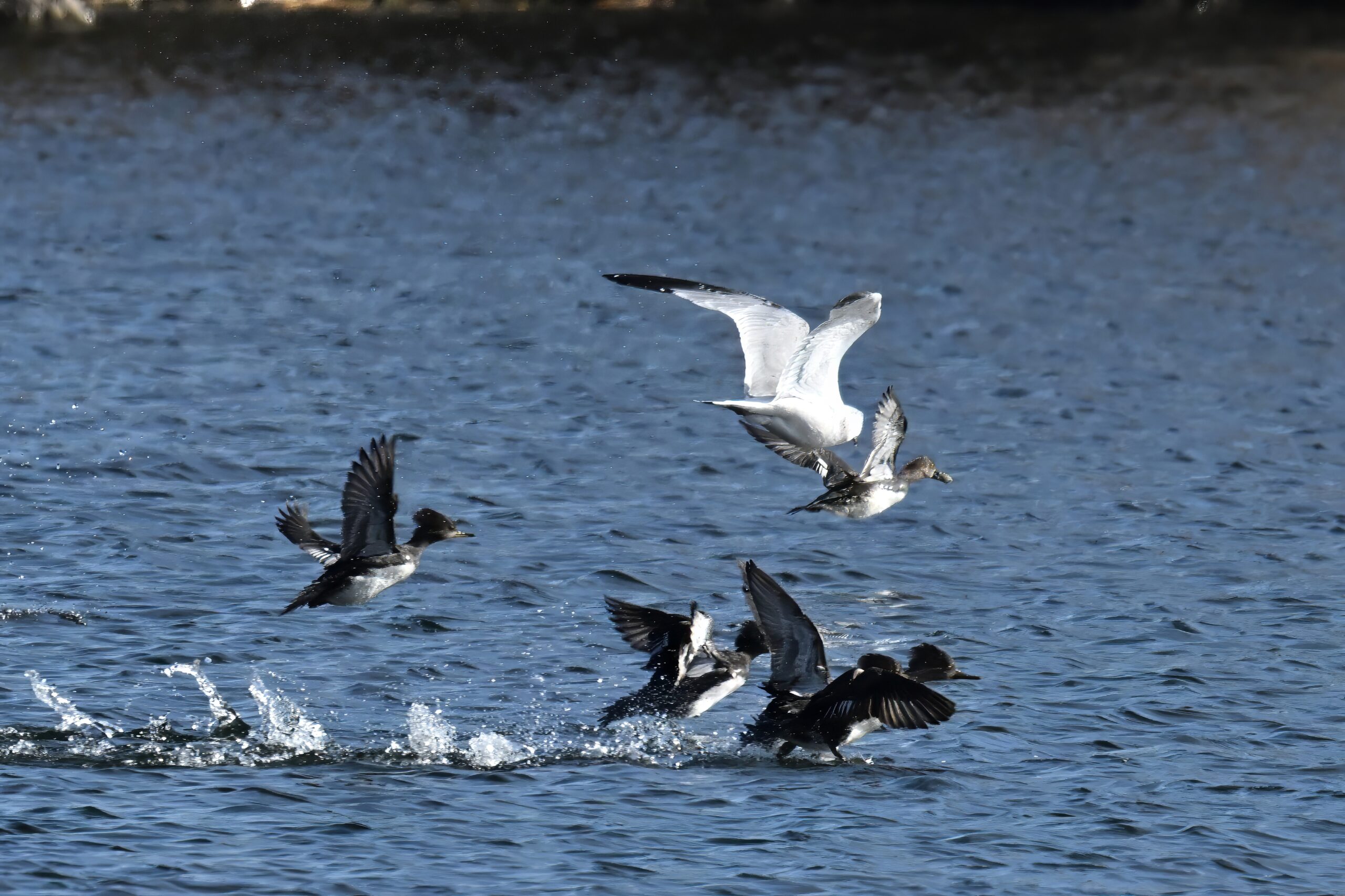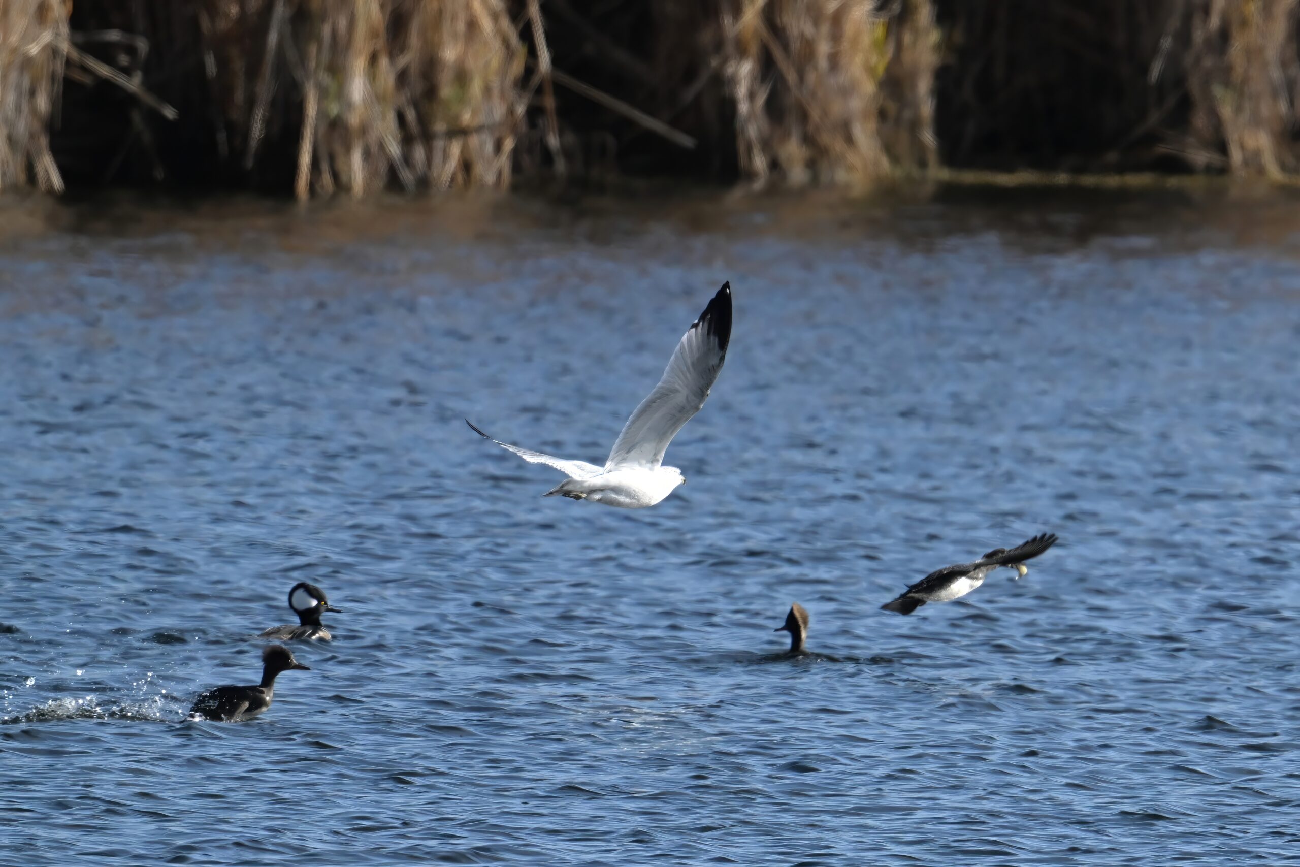 Recently at South Pier (Erie, Pennsylvania), Ring-billed Gulls harassing Hooded Merganser ducks for fish, on the enclosed pond. These shots at a very long distance, but still a fun interaction: