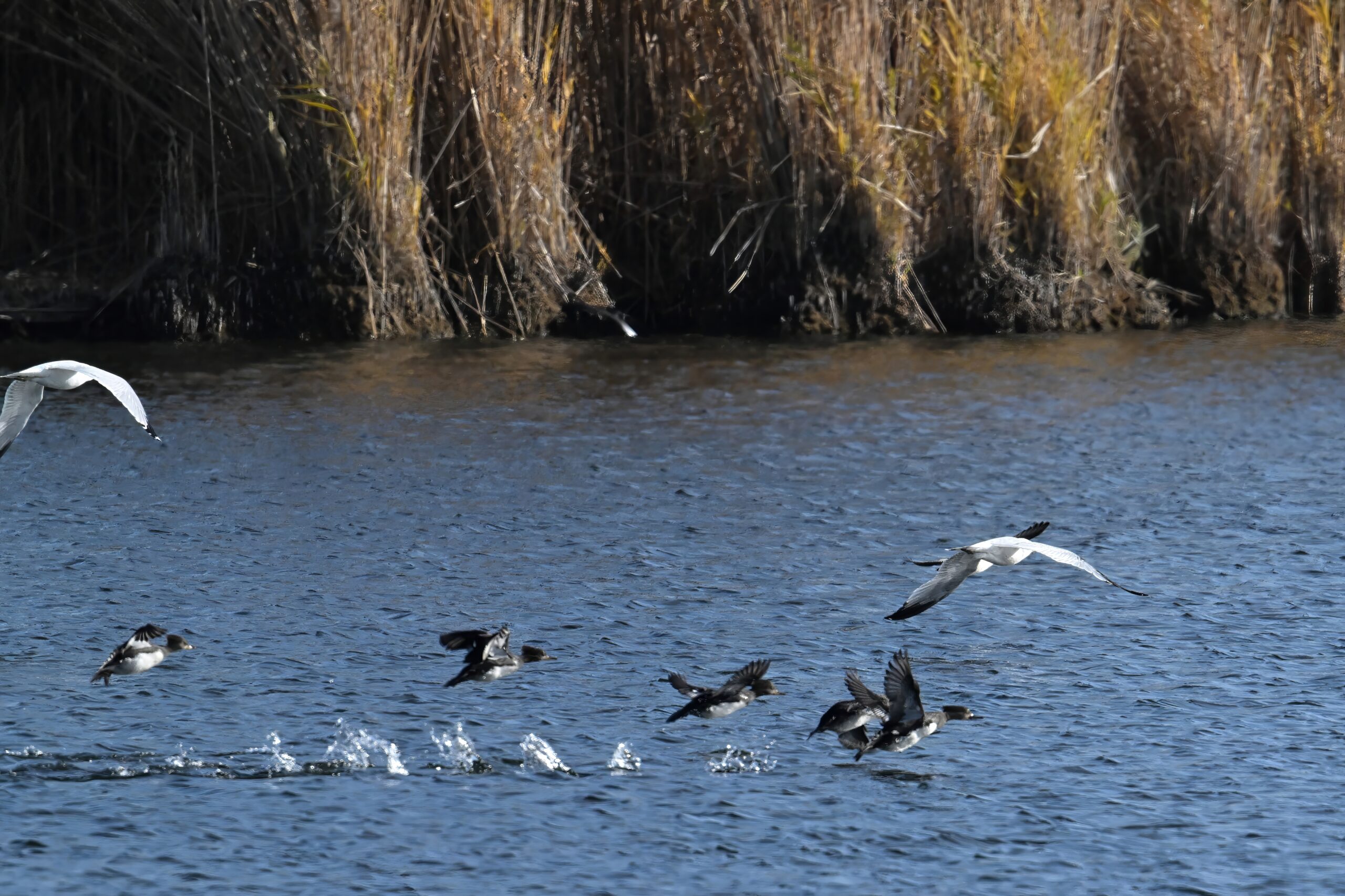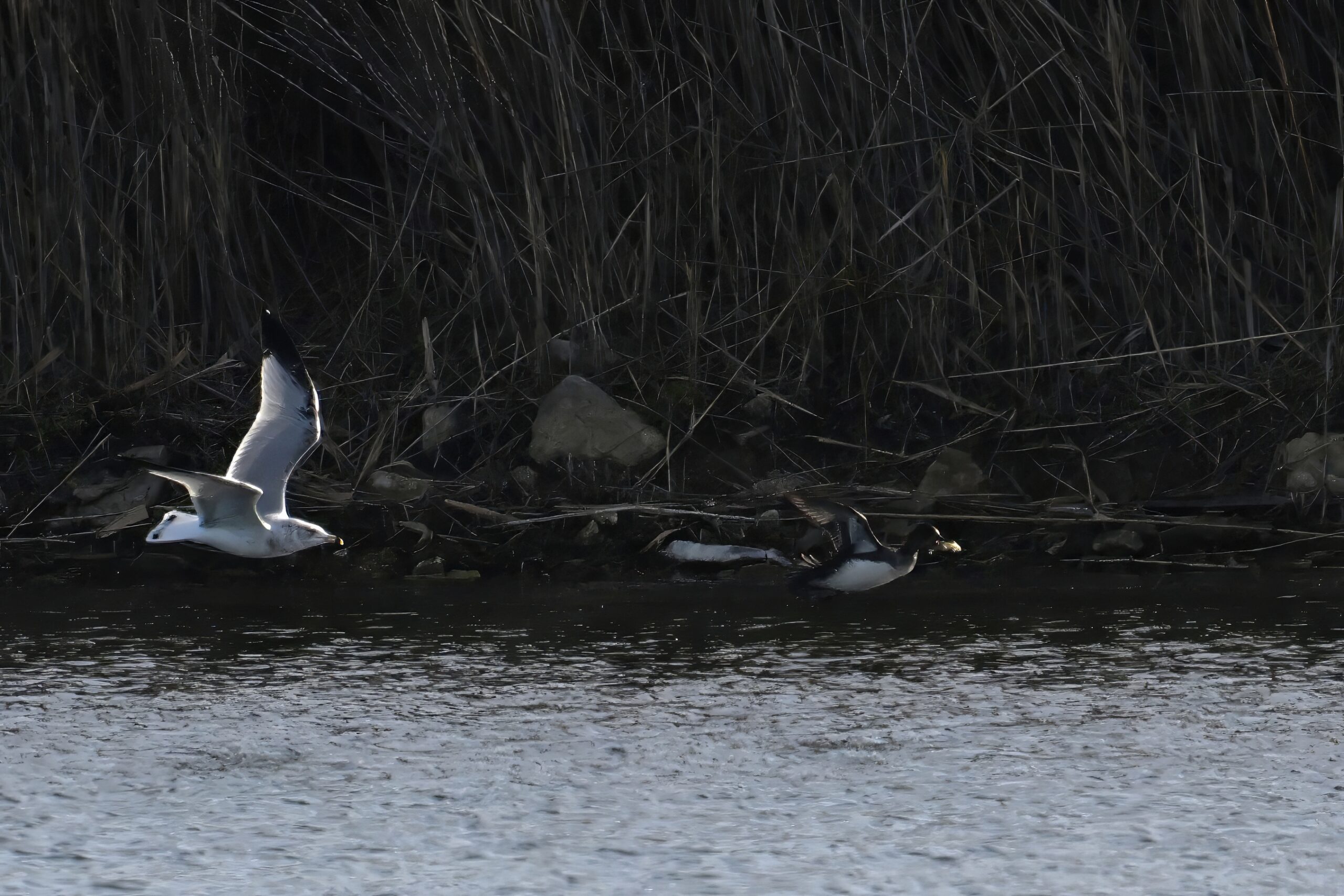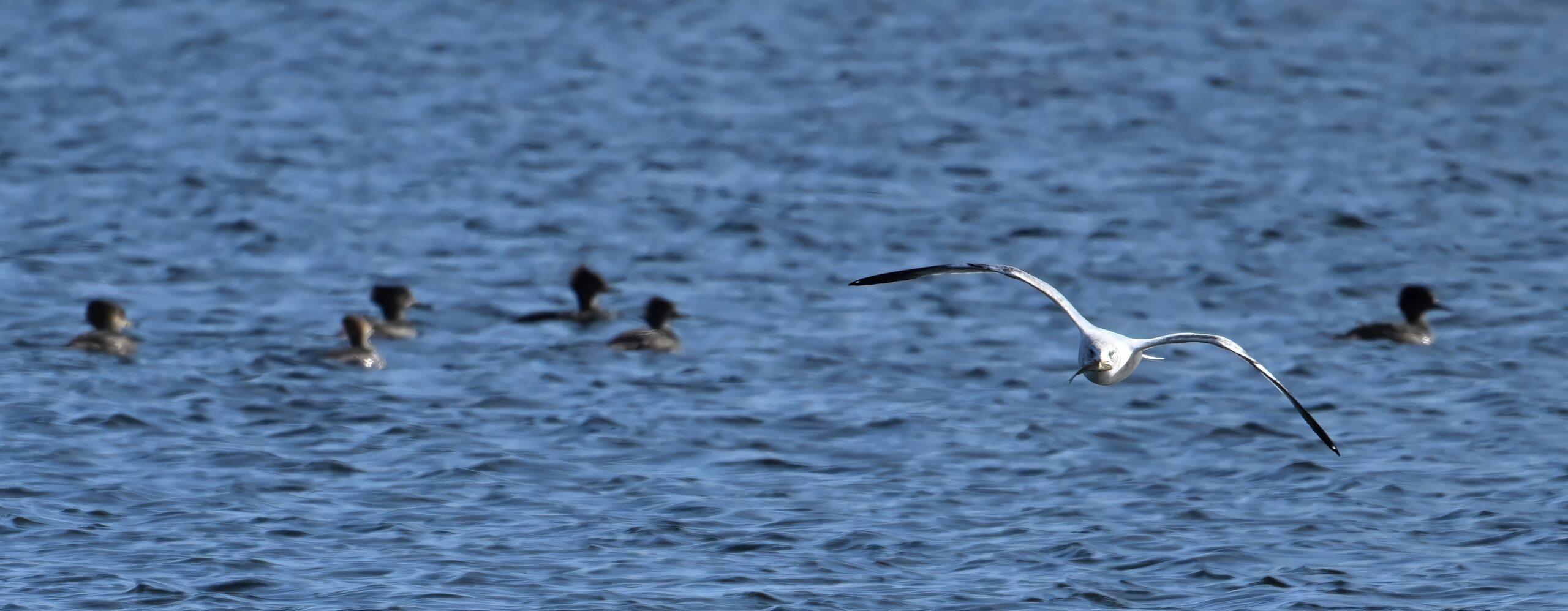 Recently at South Pier (Erie, Pennsylvania), Ring-billed Gulls harassing Hooded Merganser ducks for fish, on the enclosed pond. These shots at a very long distance, but still a fun interaction: