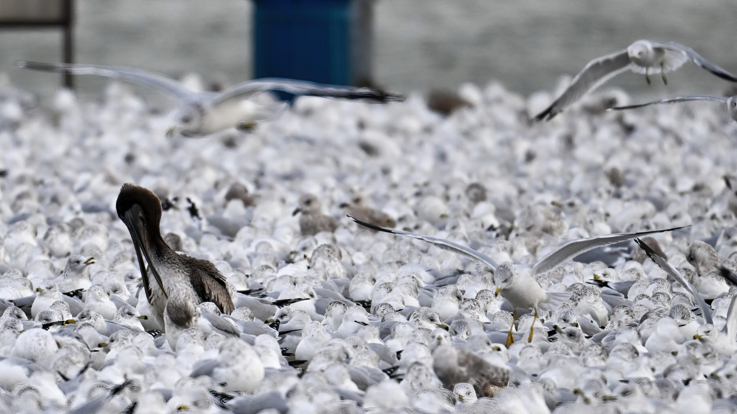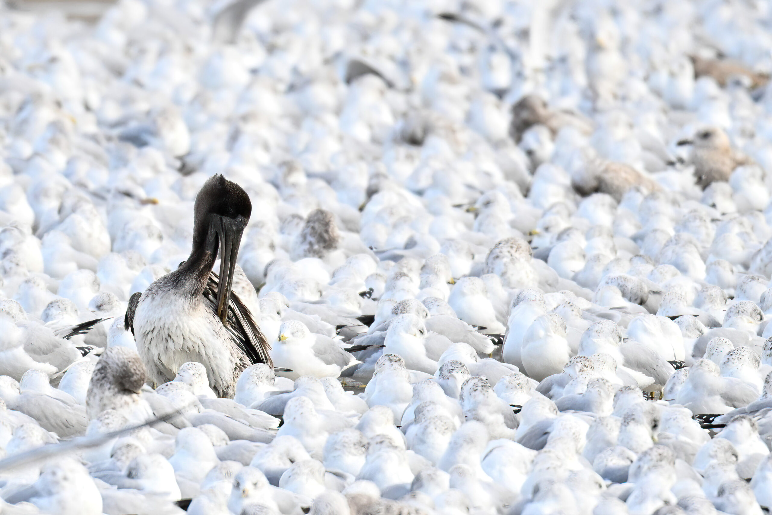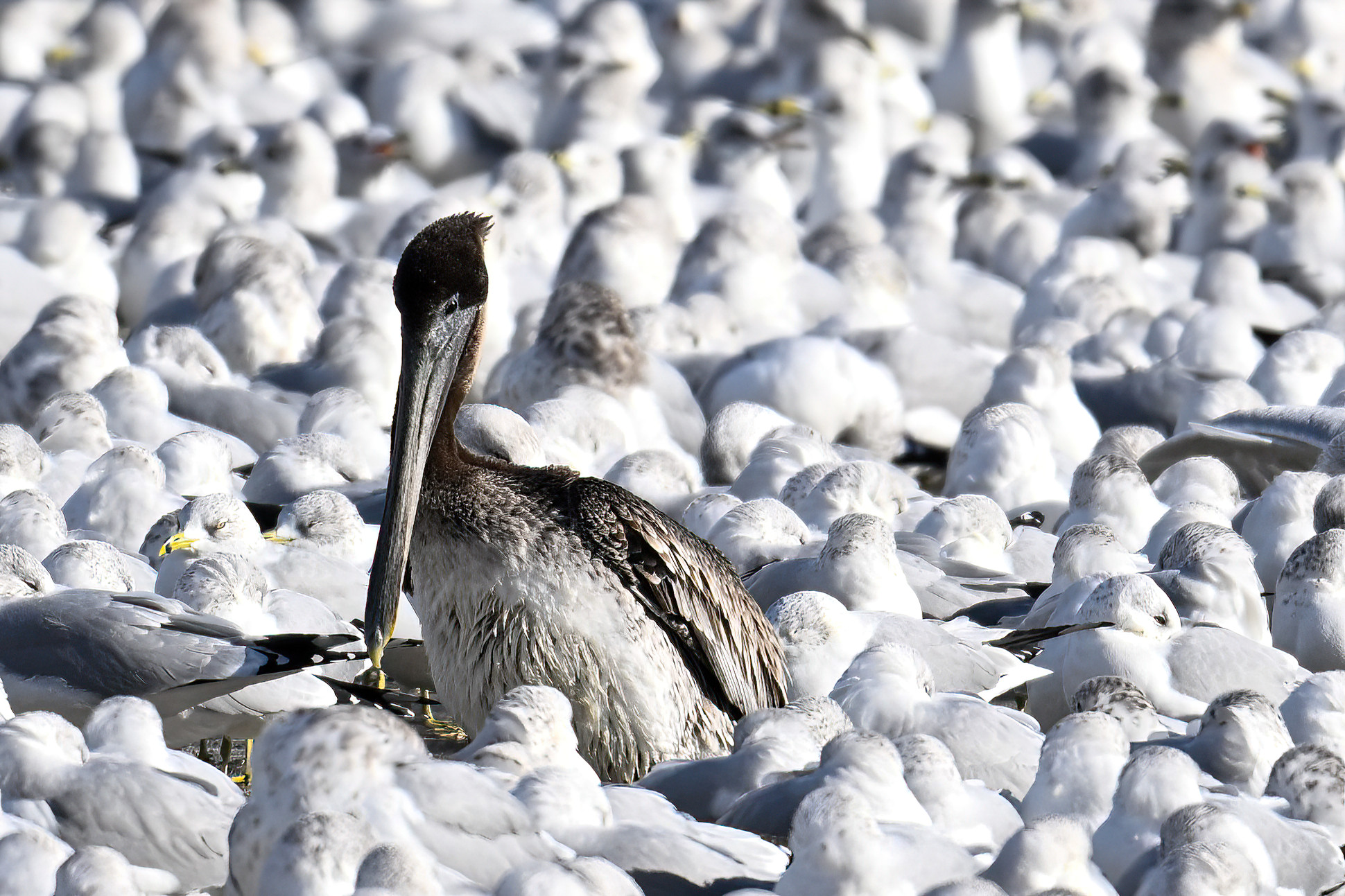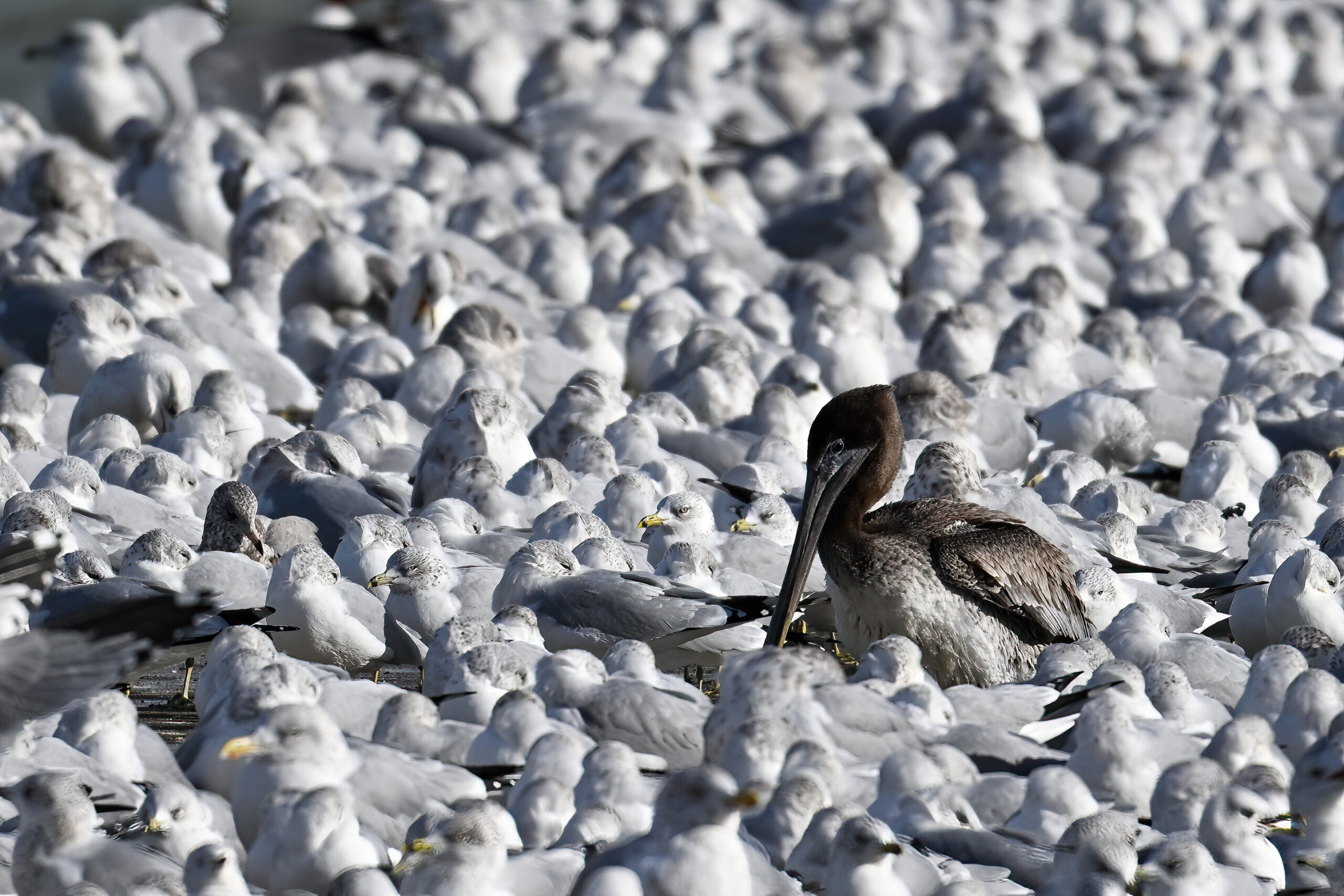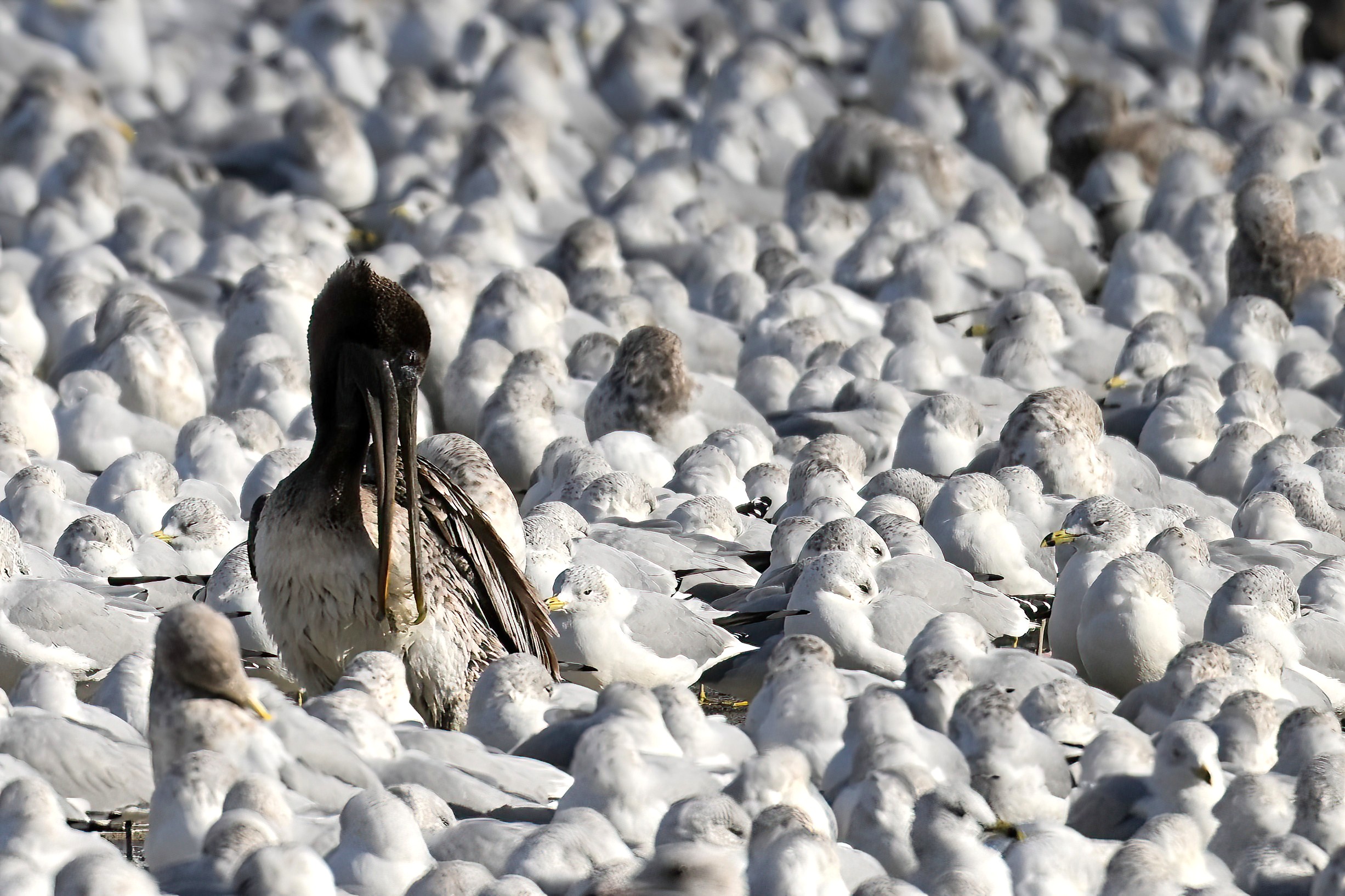 How could a large brown bird like a Brown Pelican, even if immature, hide so well in this giant flock of mostly white gulls?