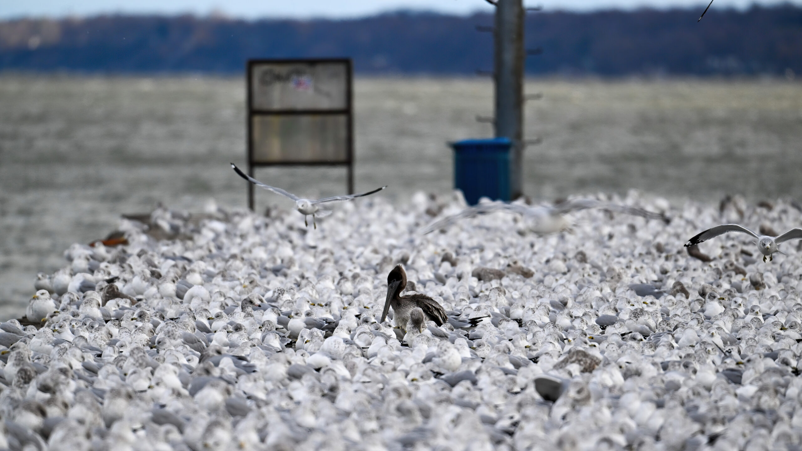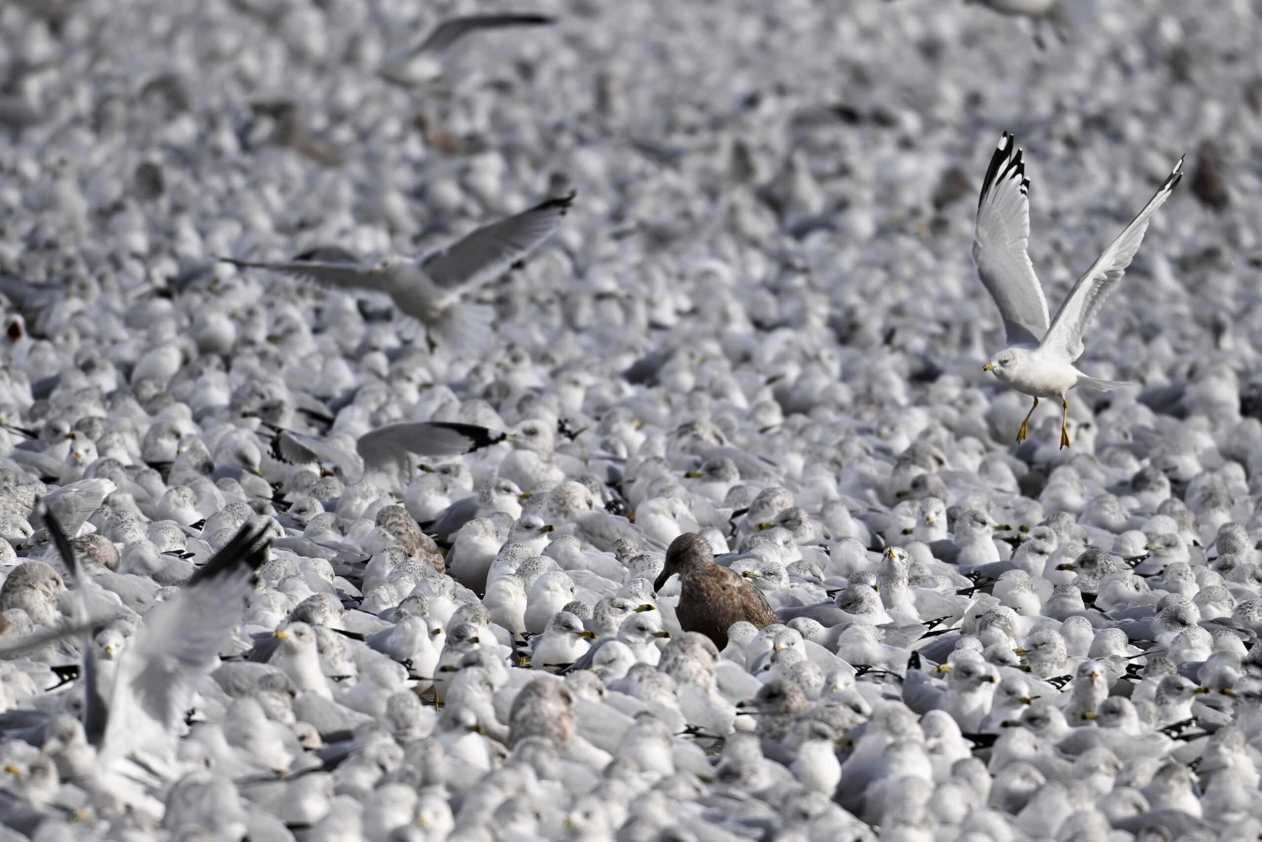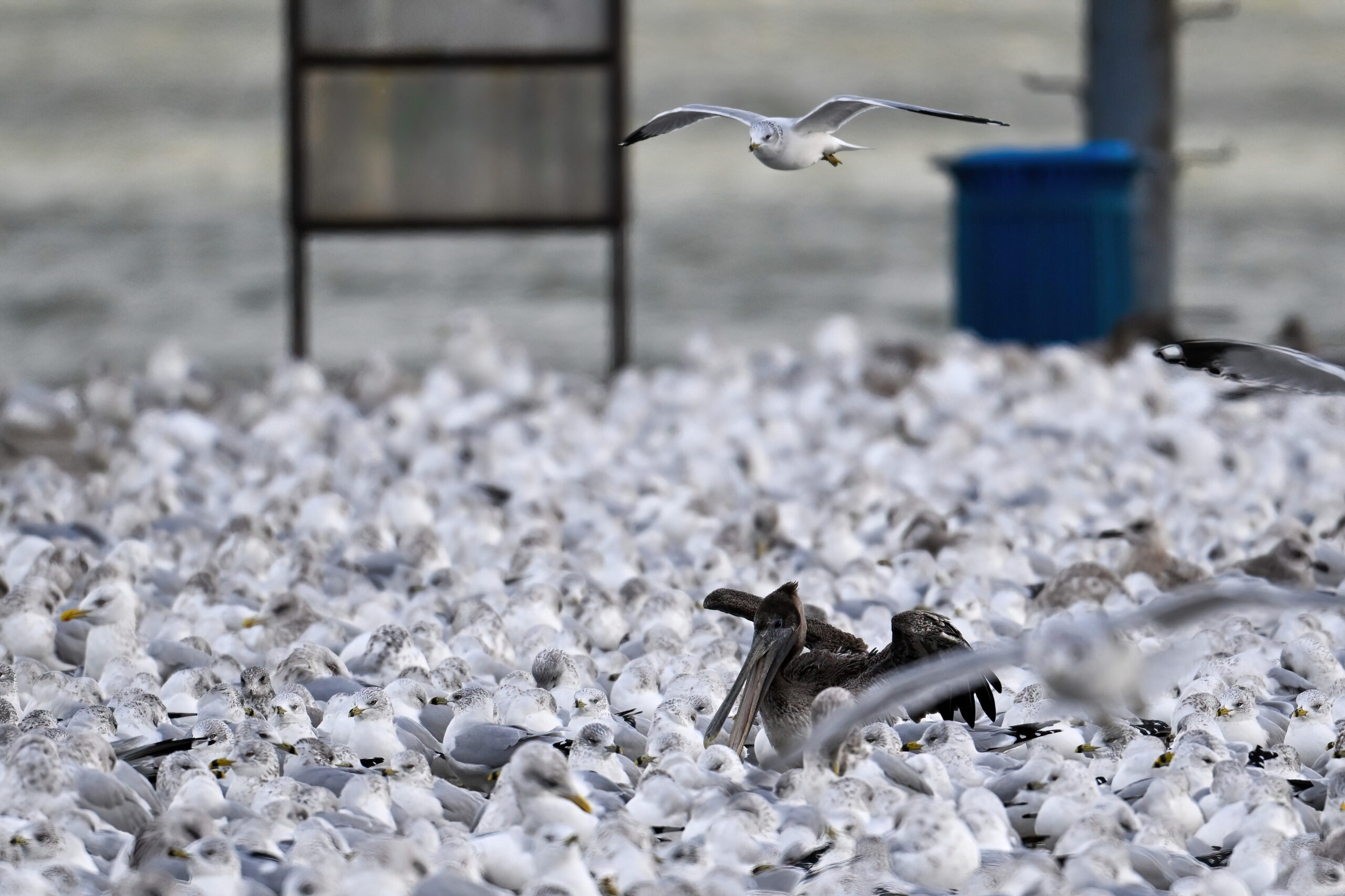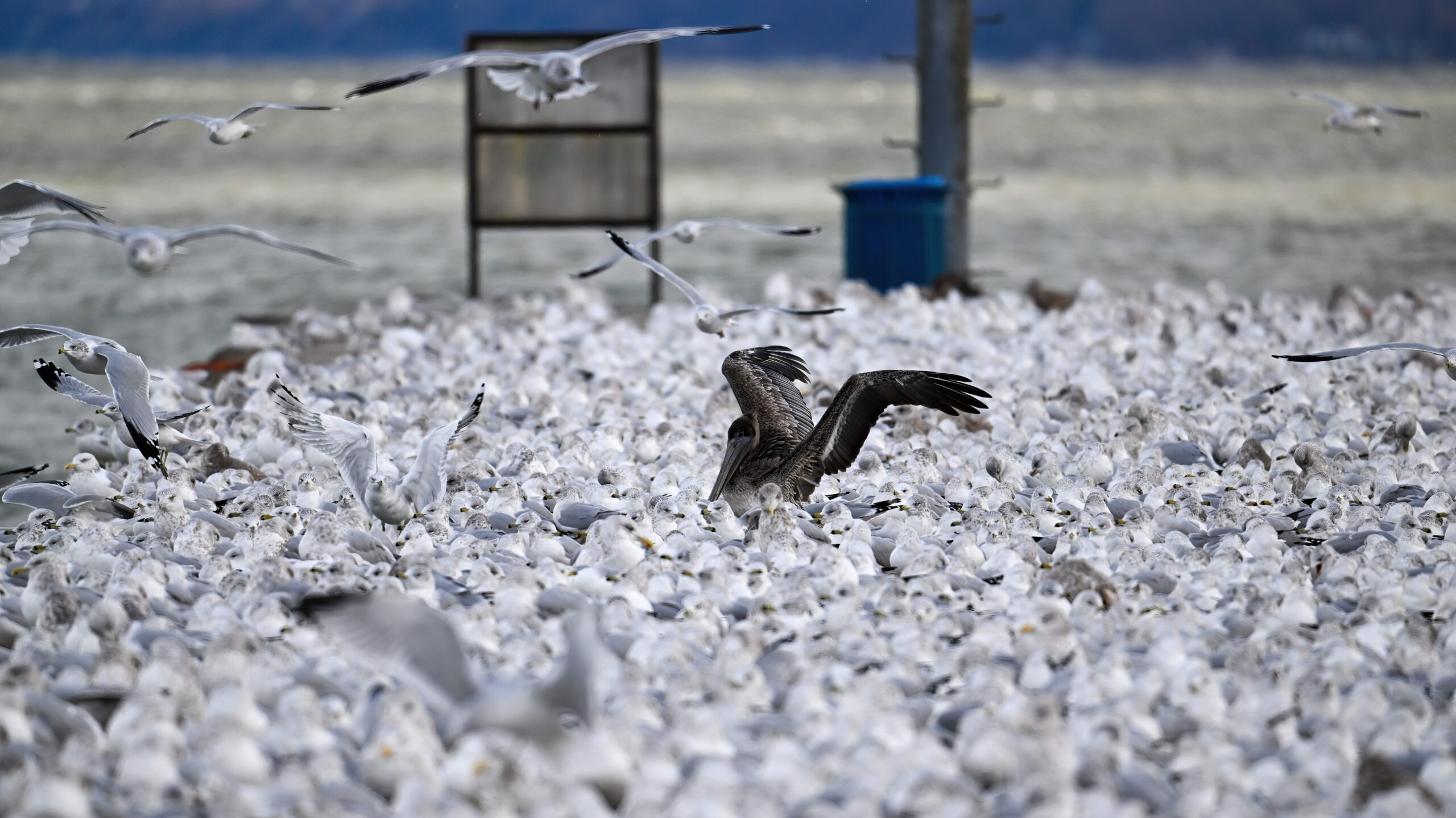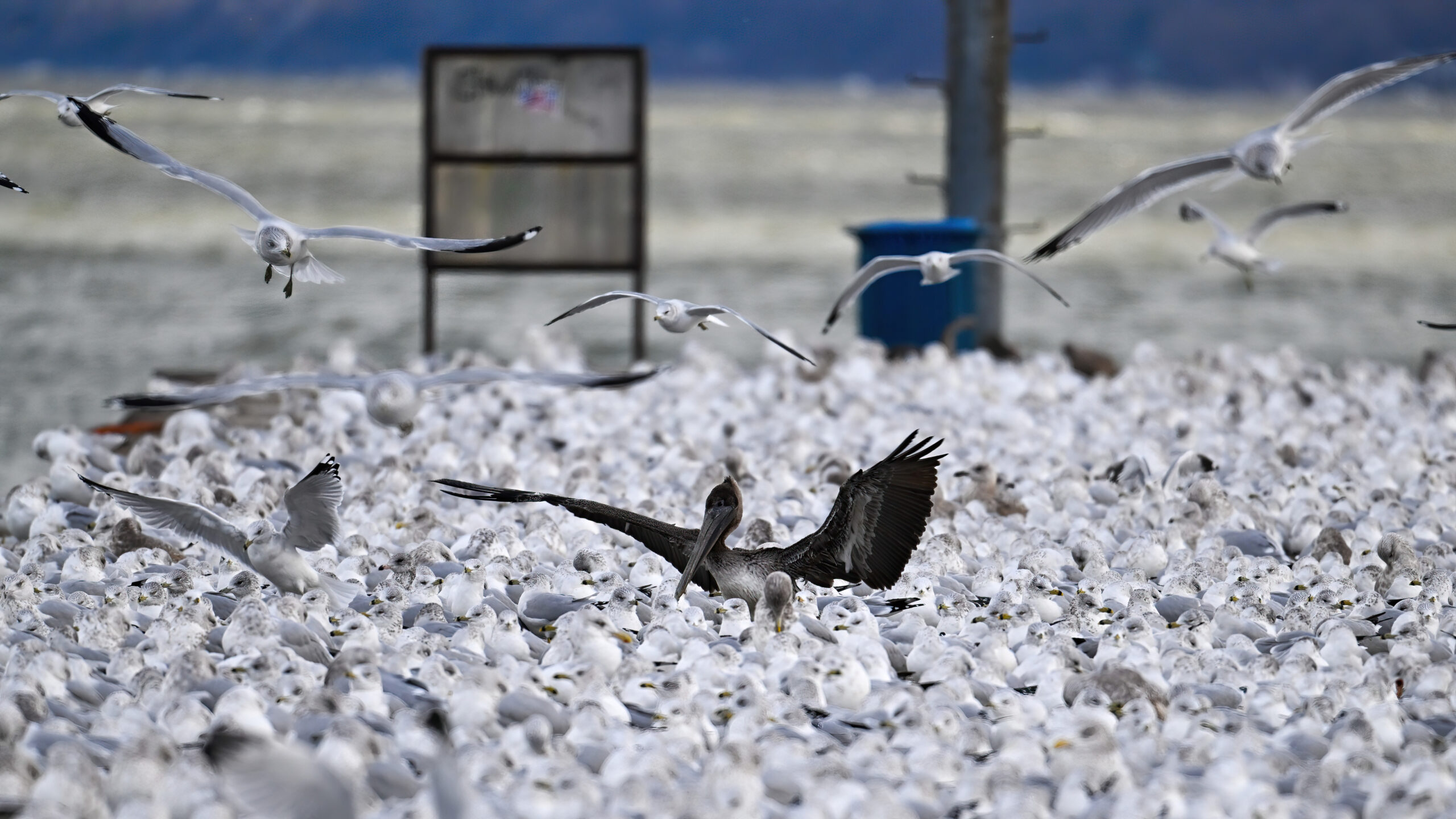 How could a large brown bird like a Brown Pelican, even if immature, hide so well in this giant flock of mostly white gulls?
