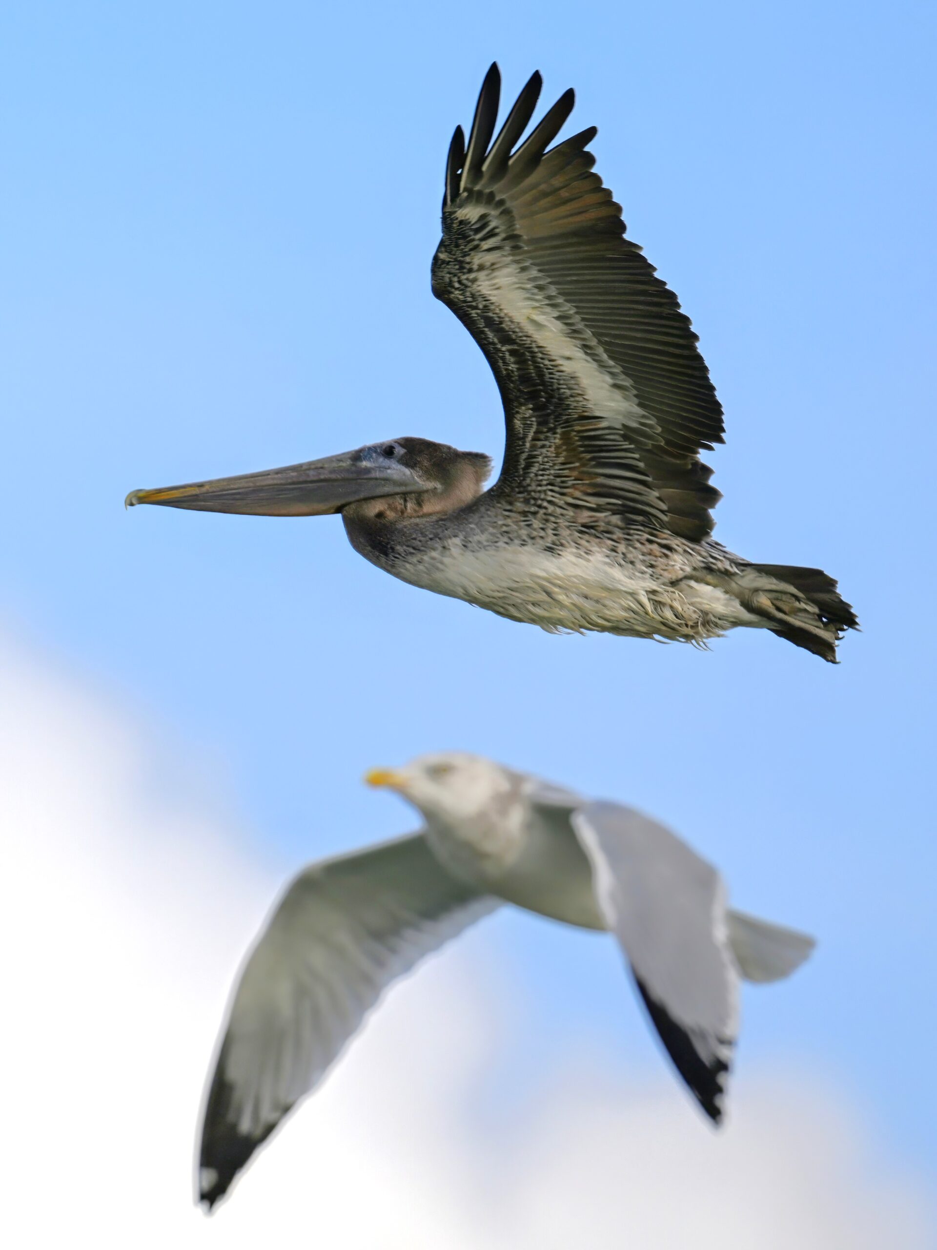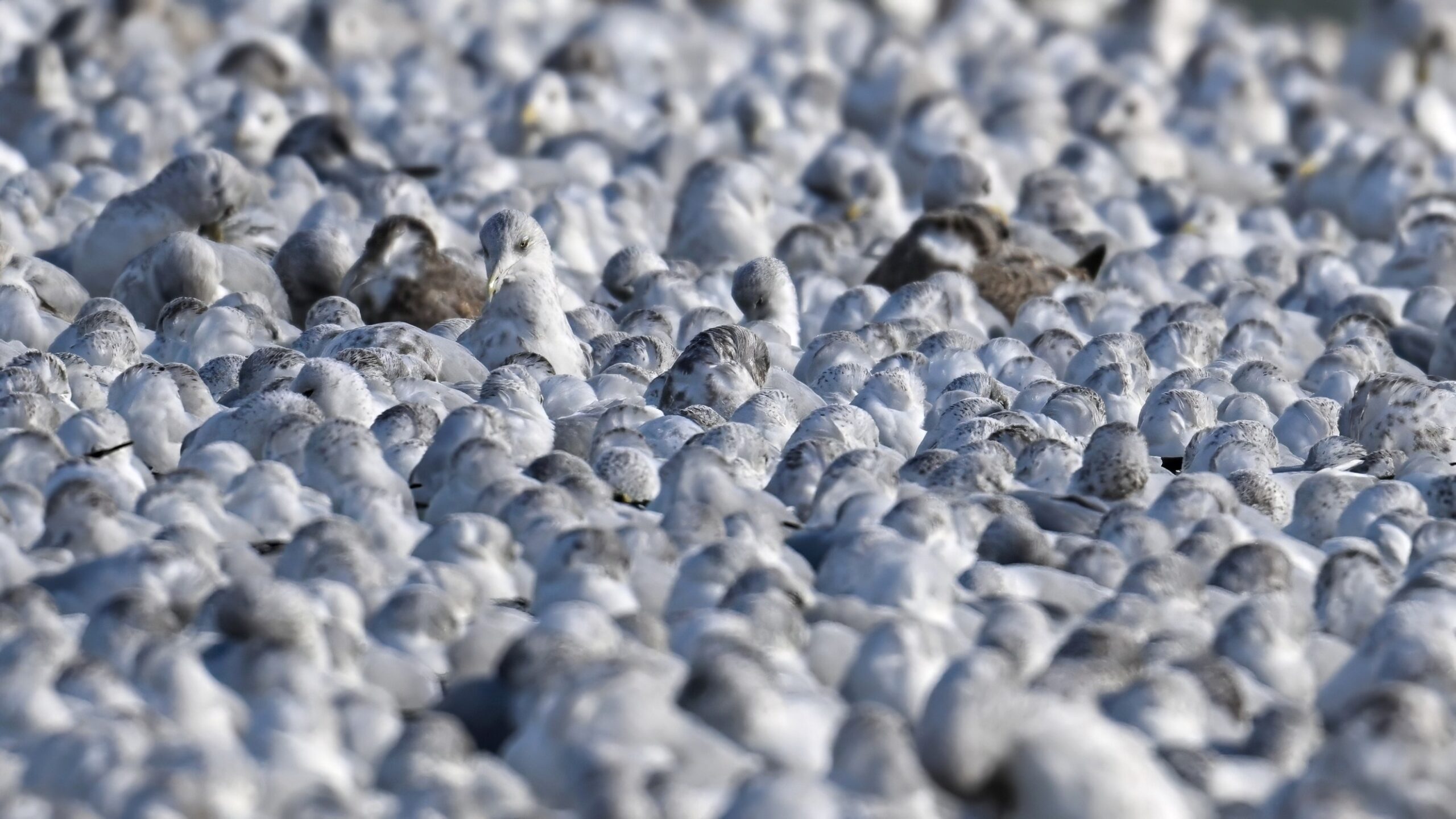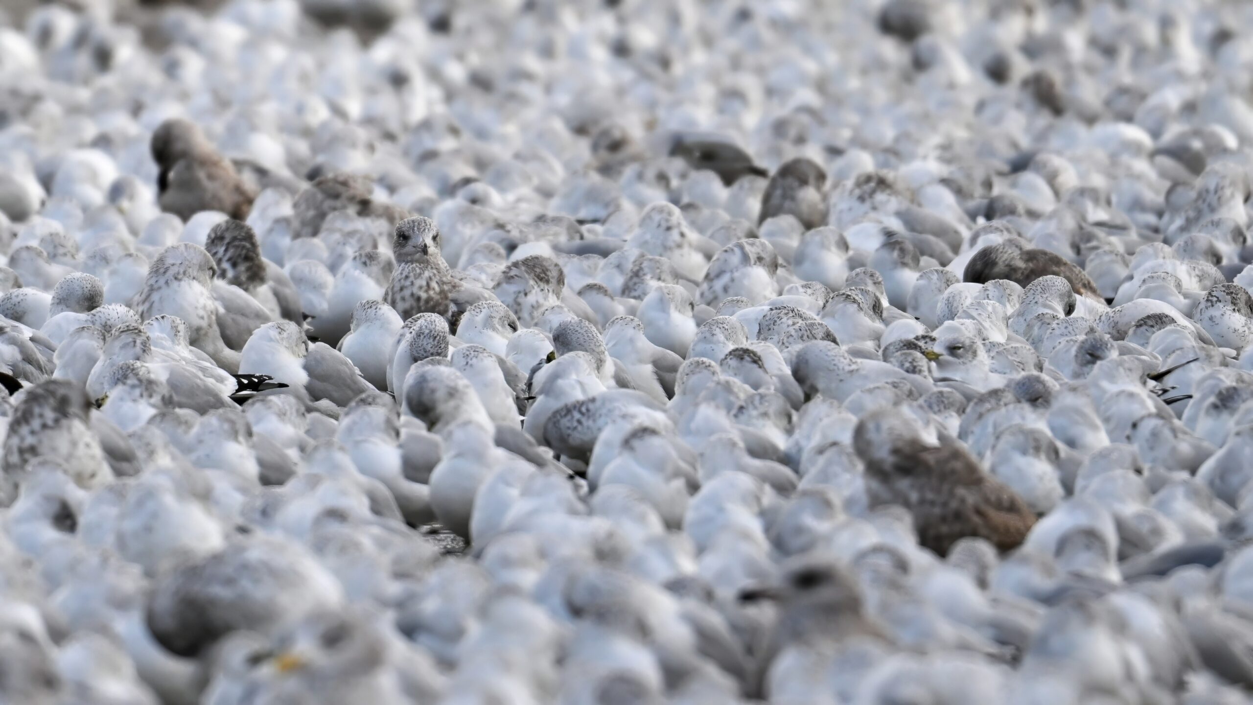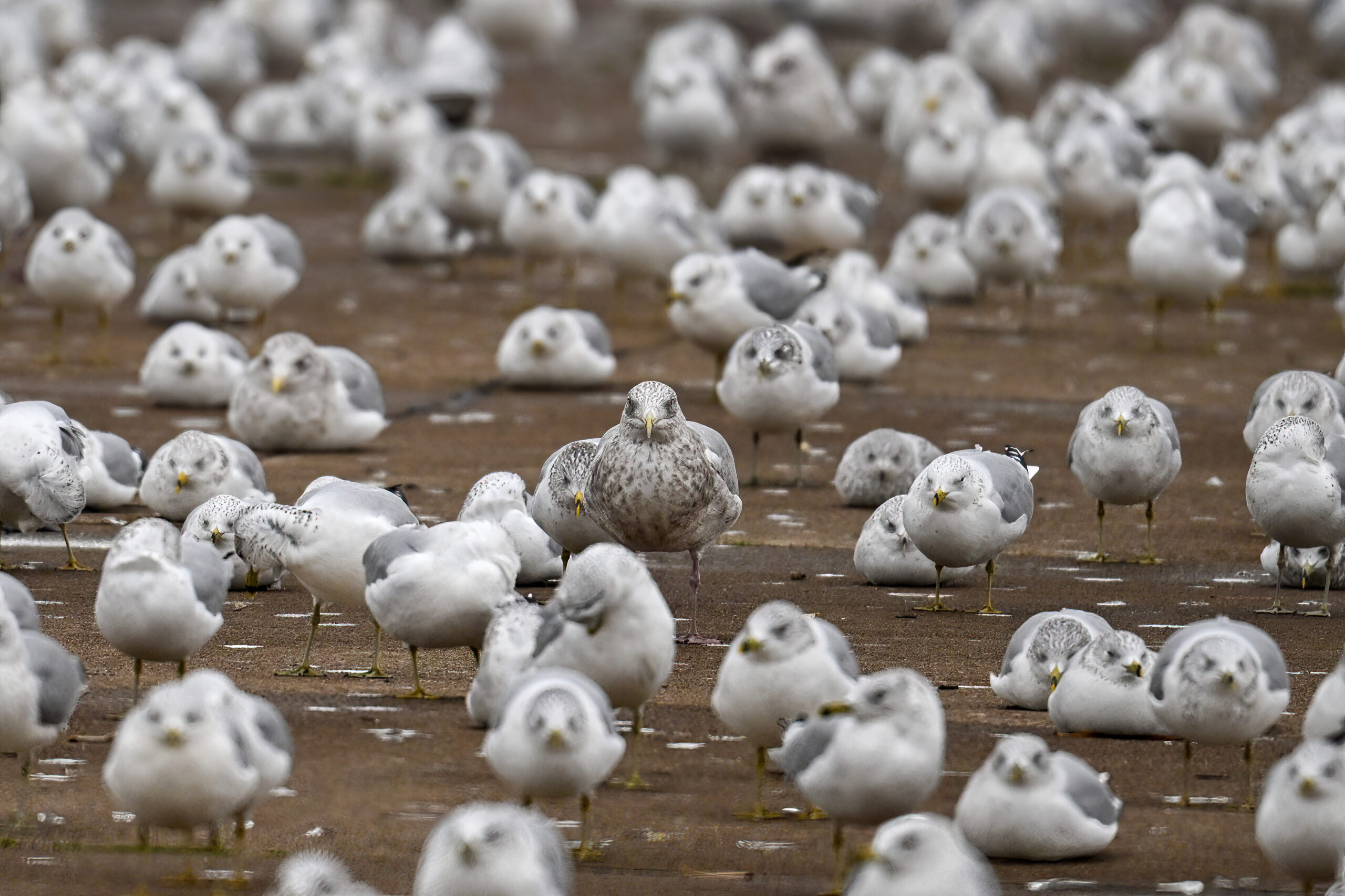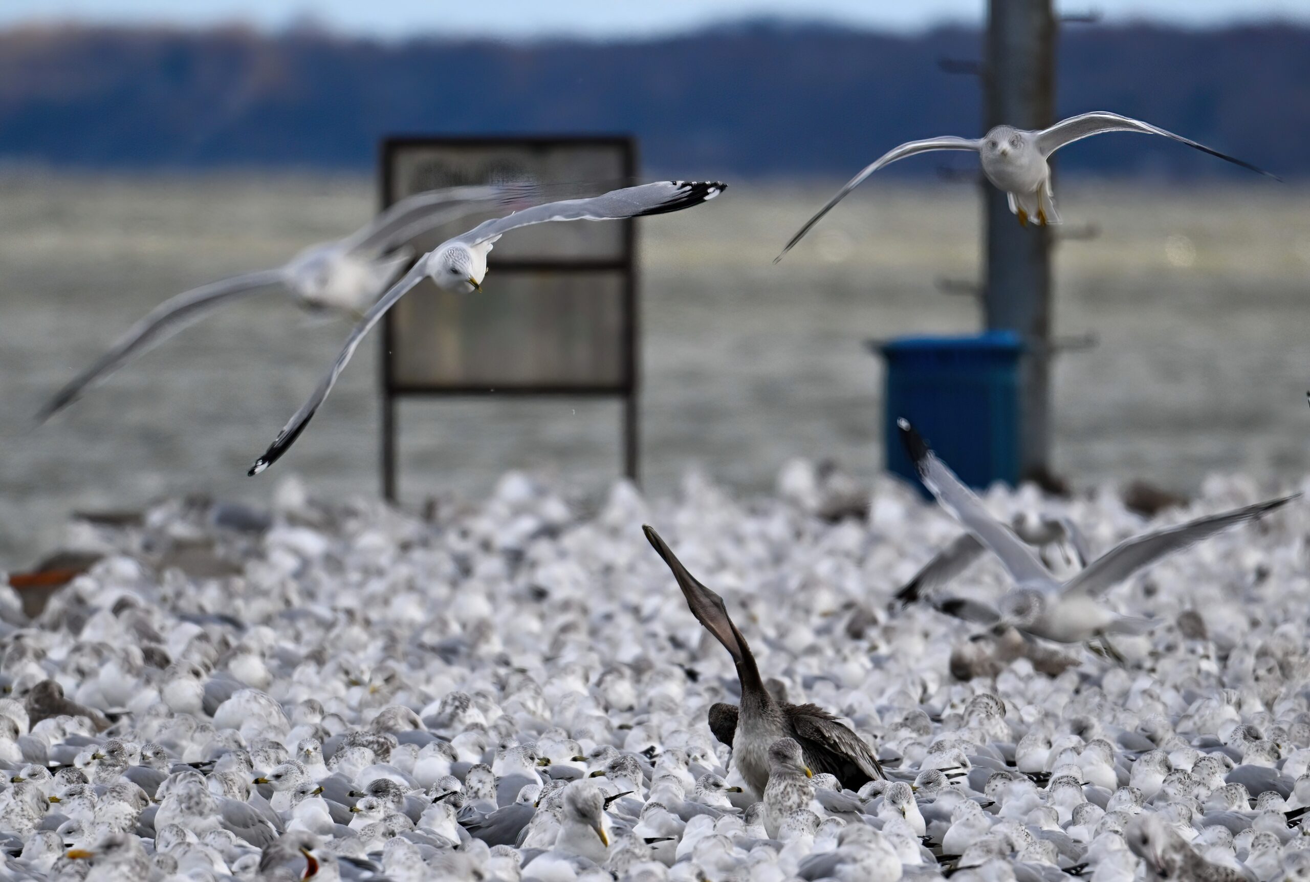 How could a large brown bird like a Brown Pelican, even if immature, hide so well in this giant flock of mostly white gulls?
