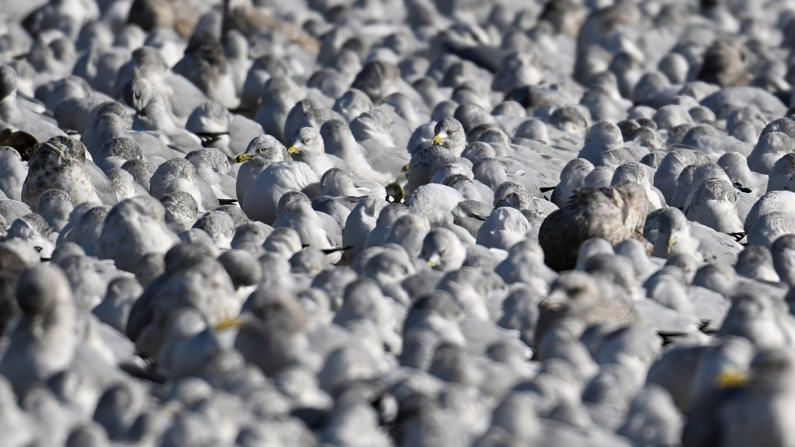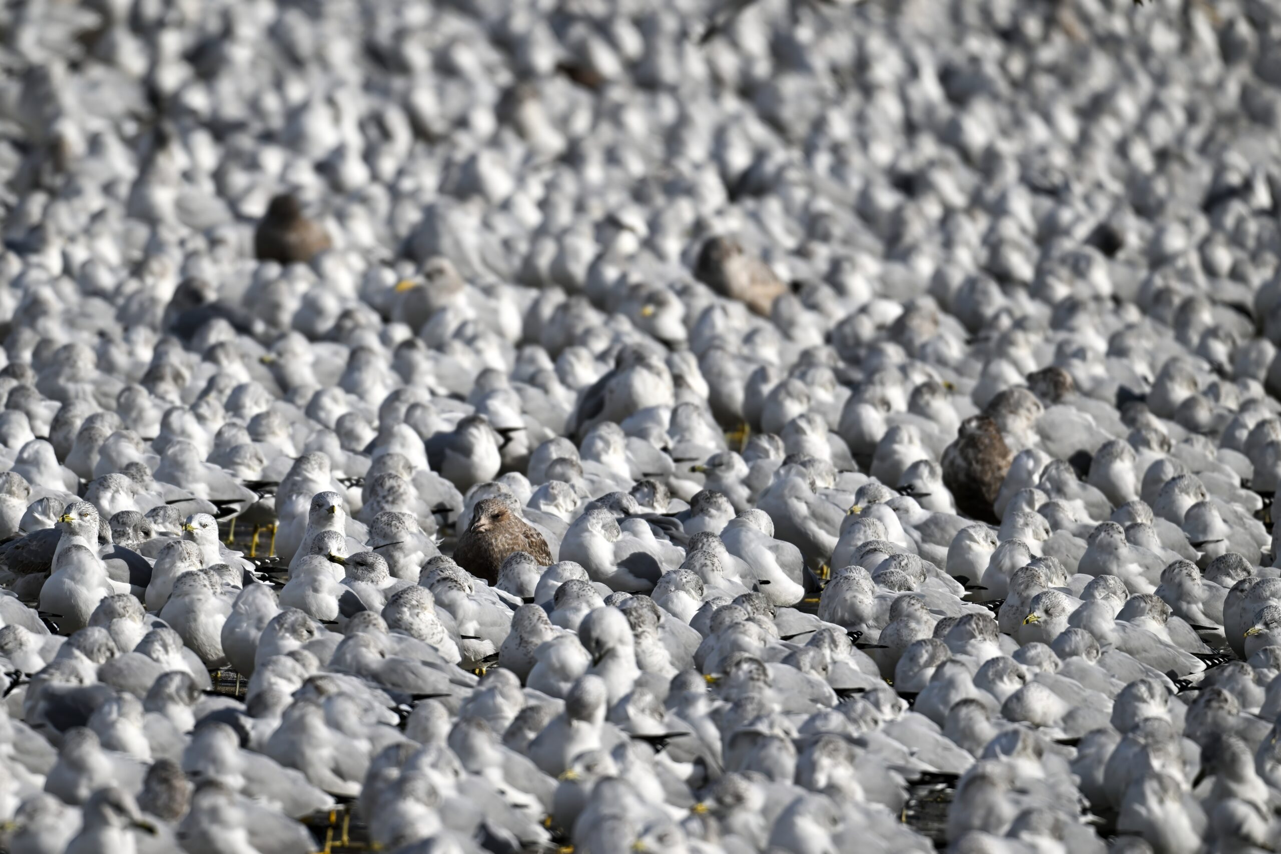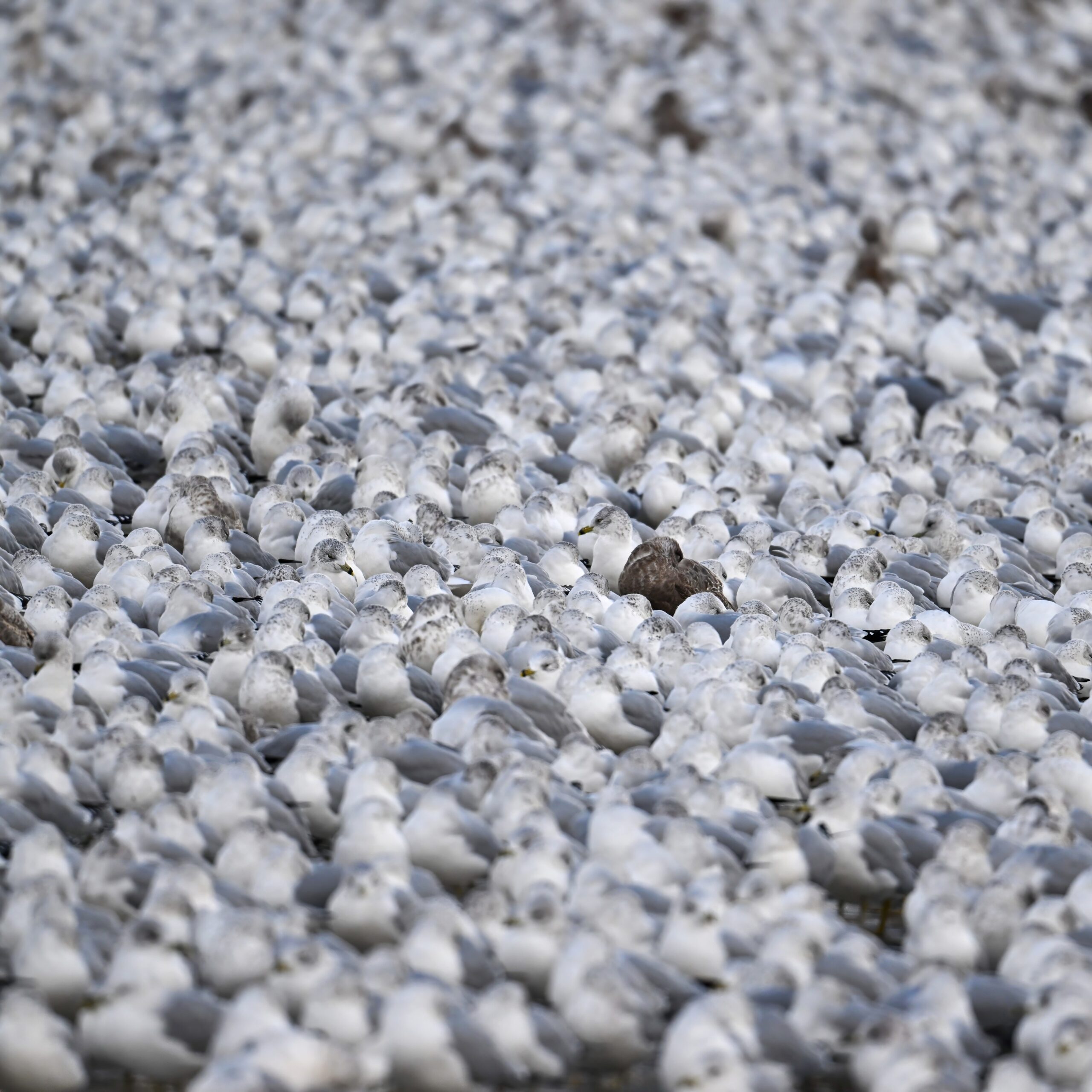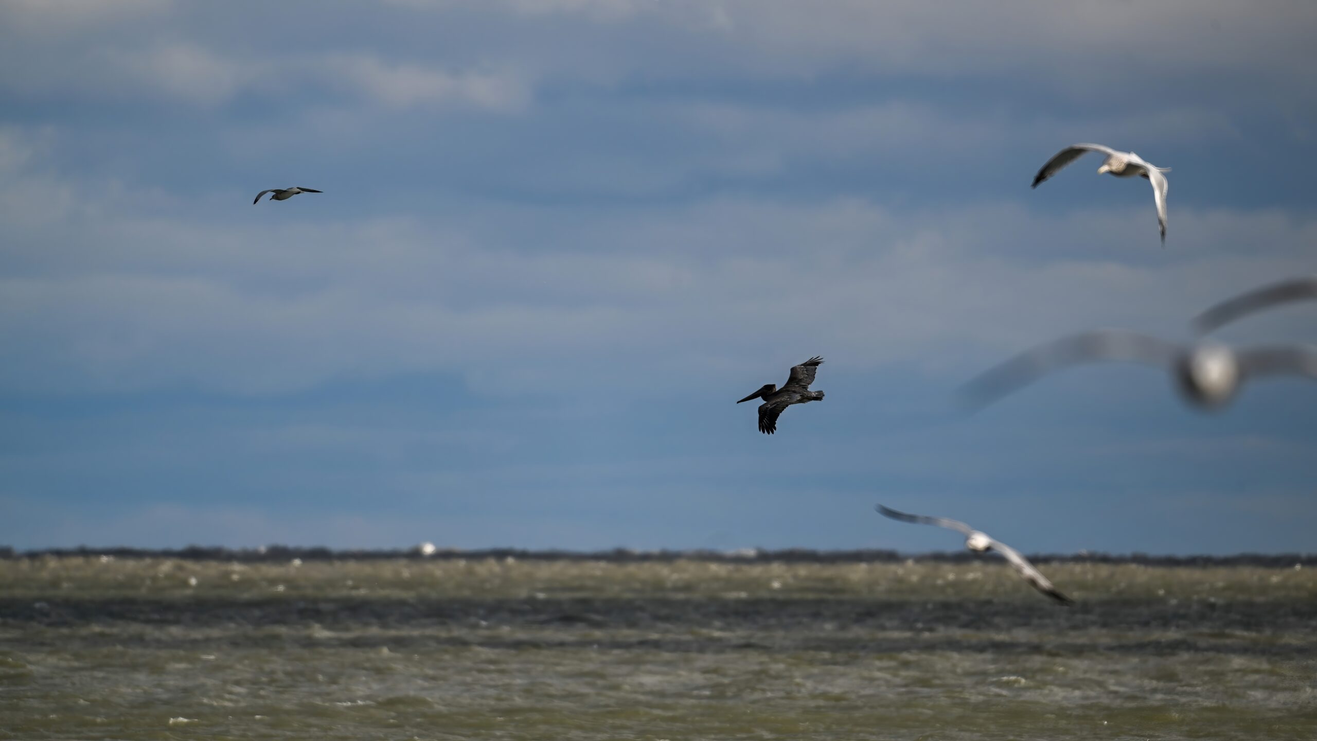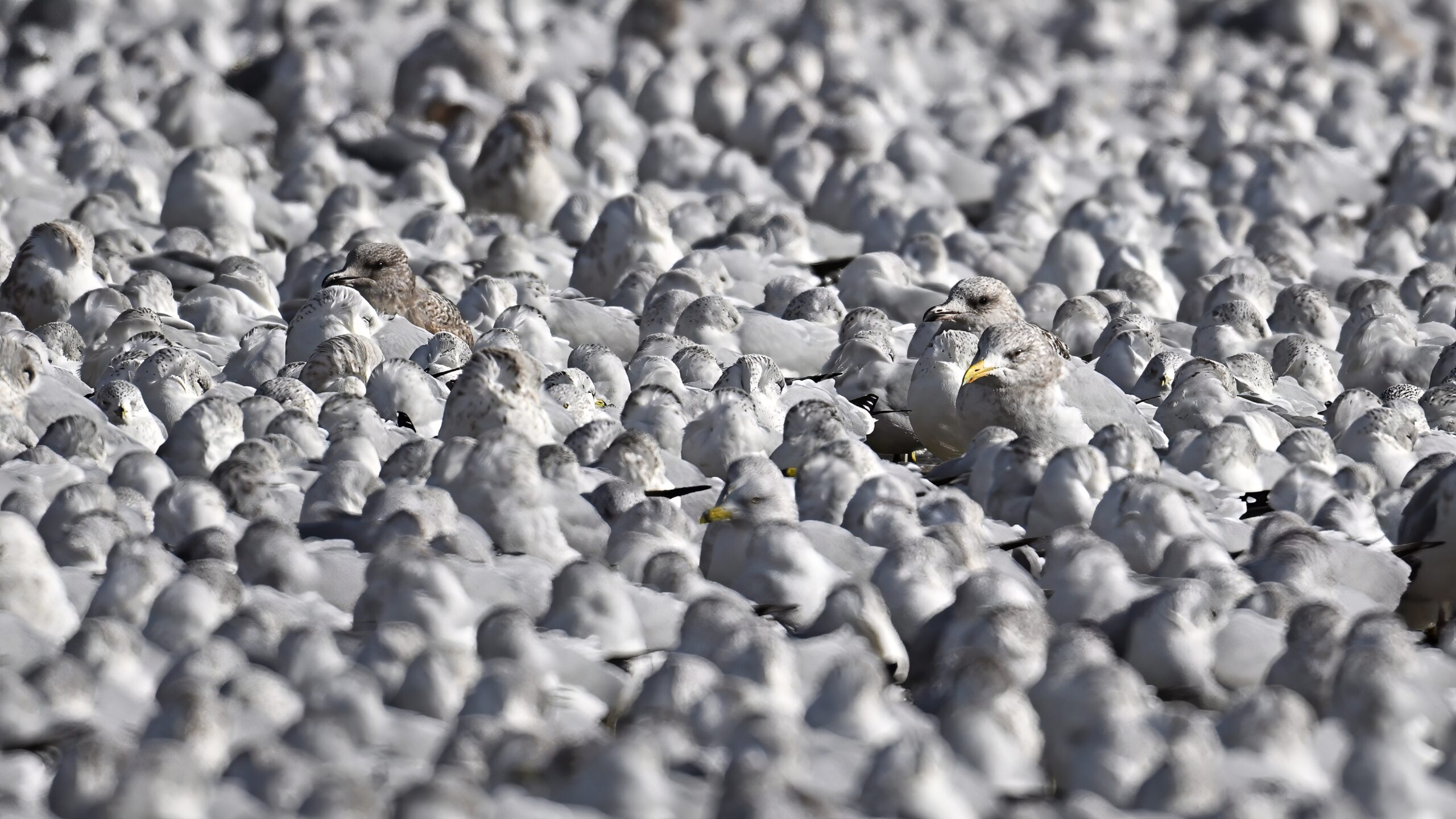 How could a large brown bird like a Brown Pelican, even if immature, hide so well in this giant flock of mostly white gulls?