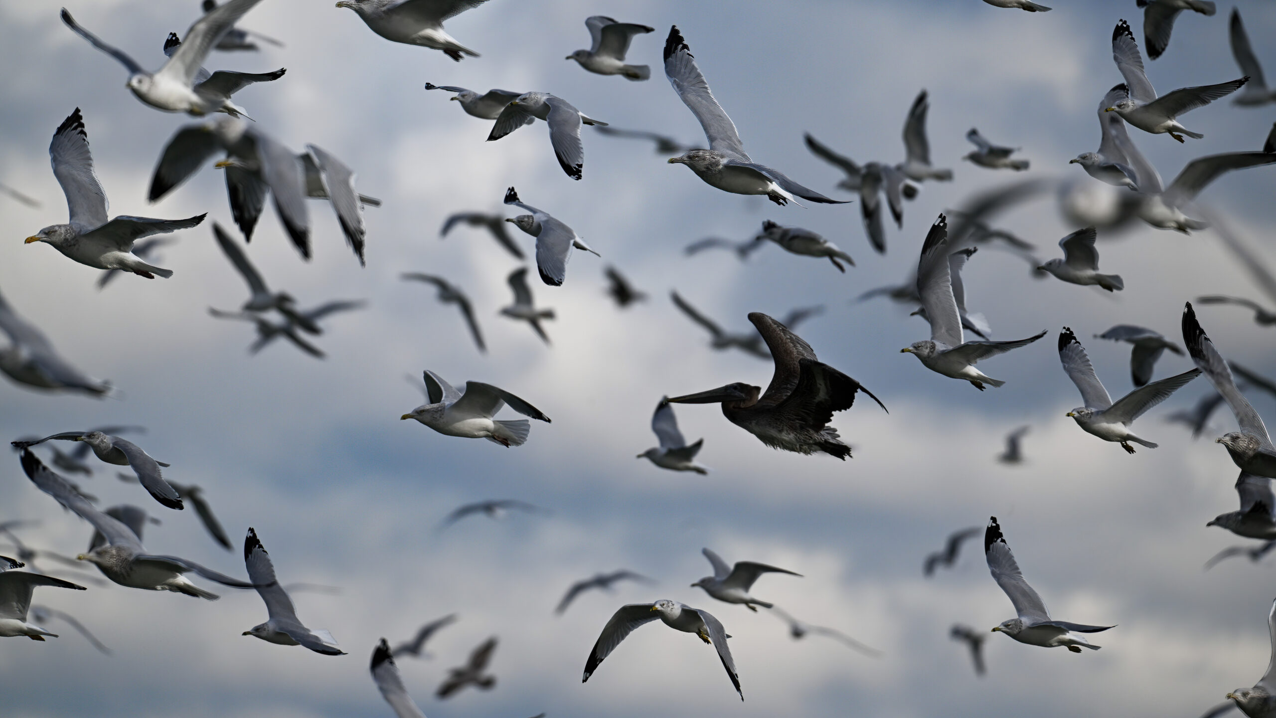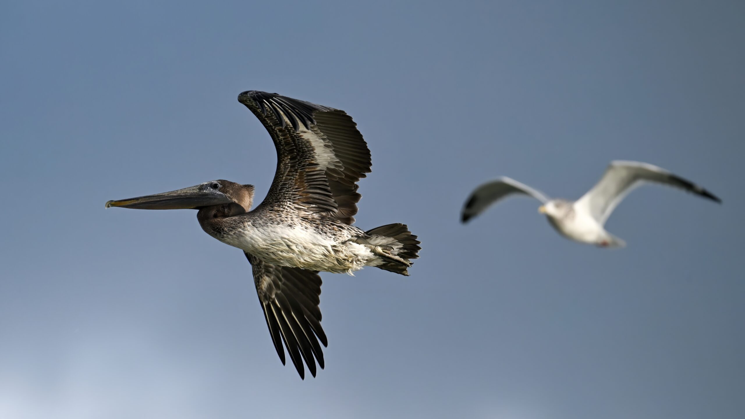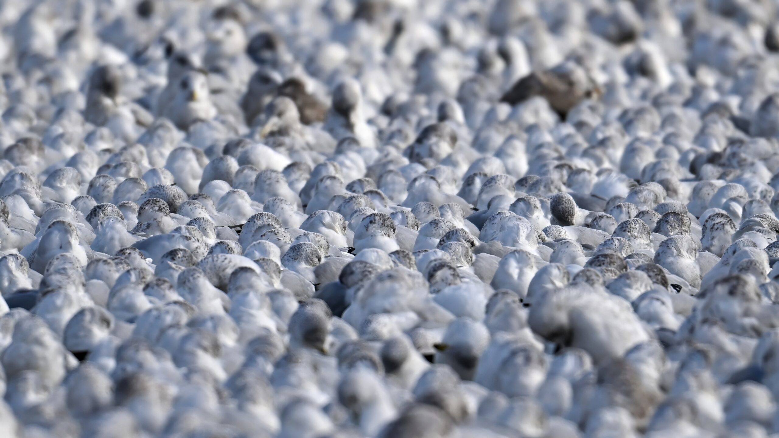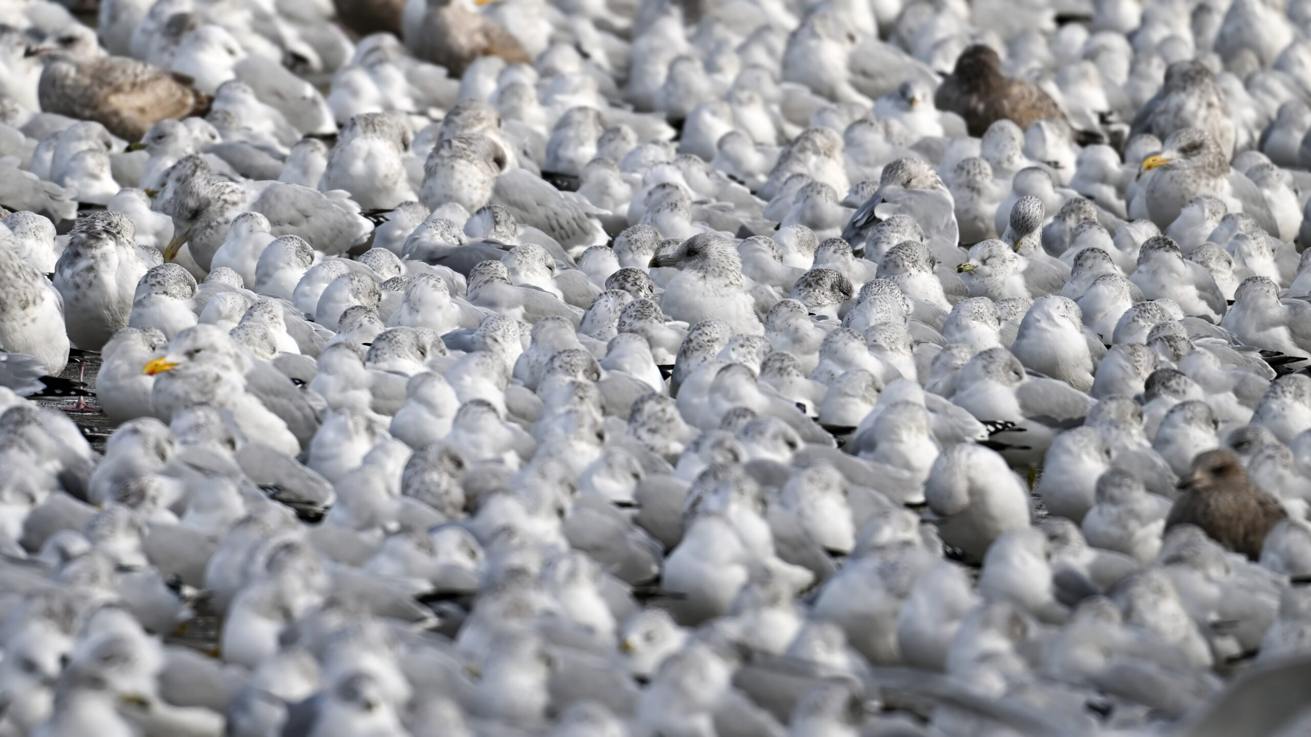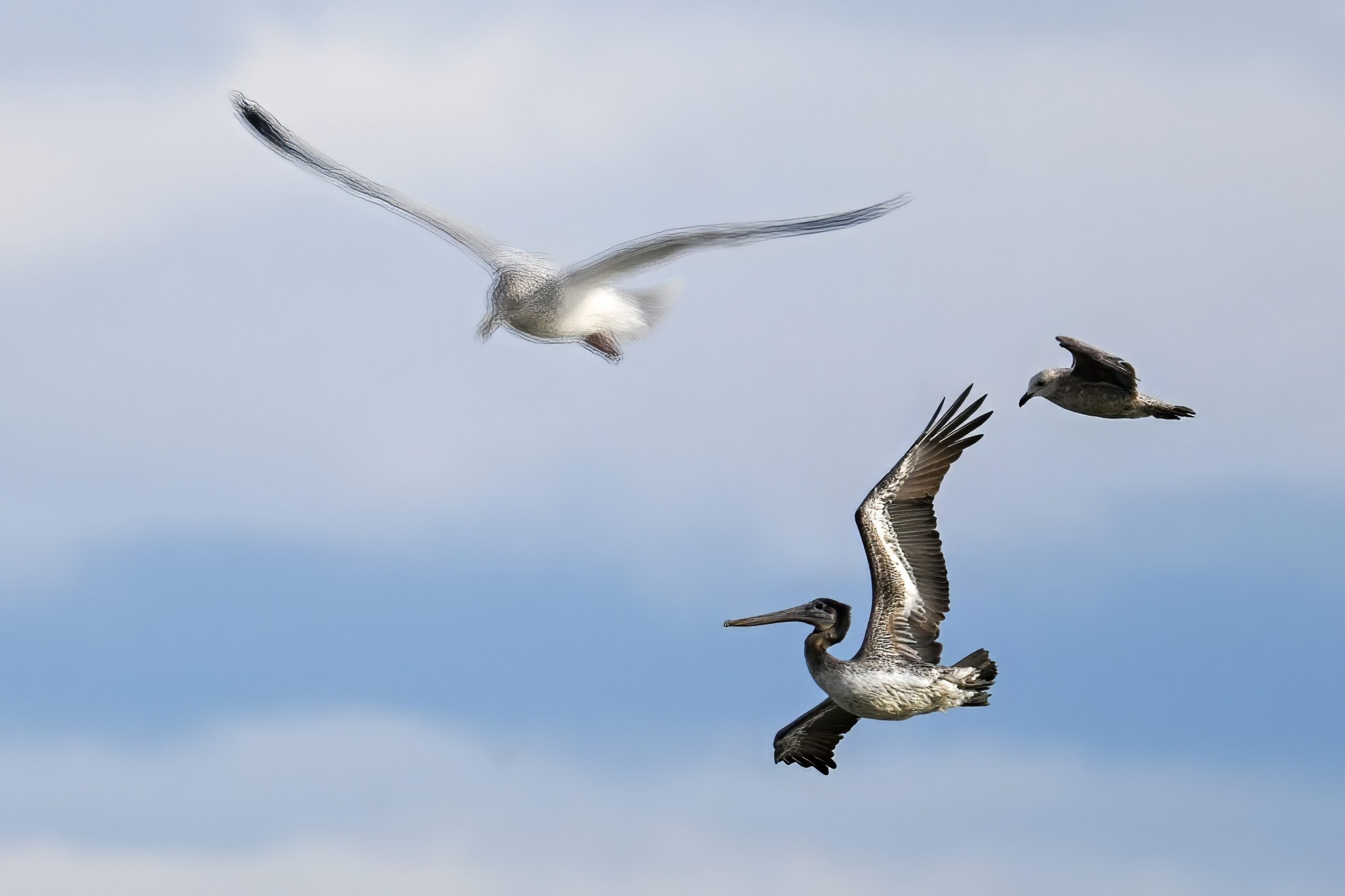 How could a large brown bird like a Brown Pelican, even if immature, hide so well in this giant flock of mostly white gulls?