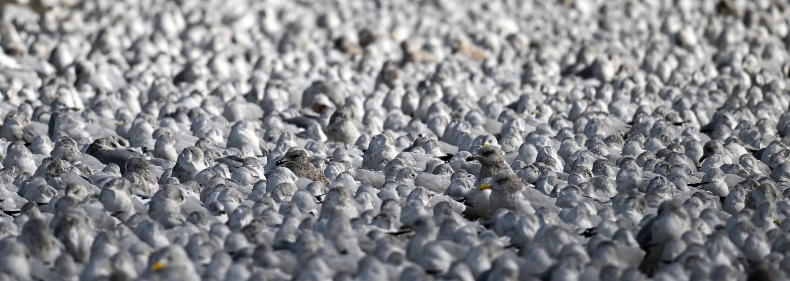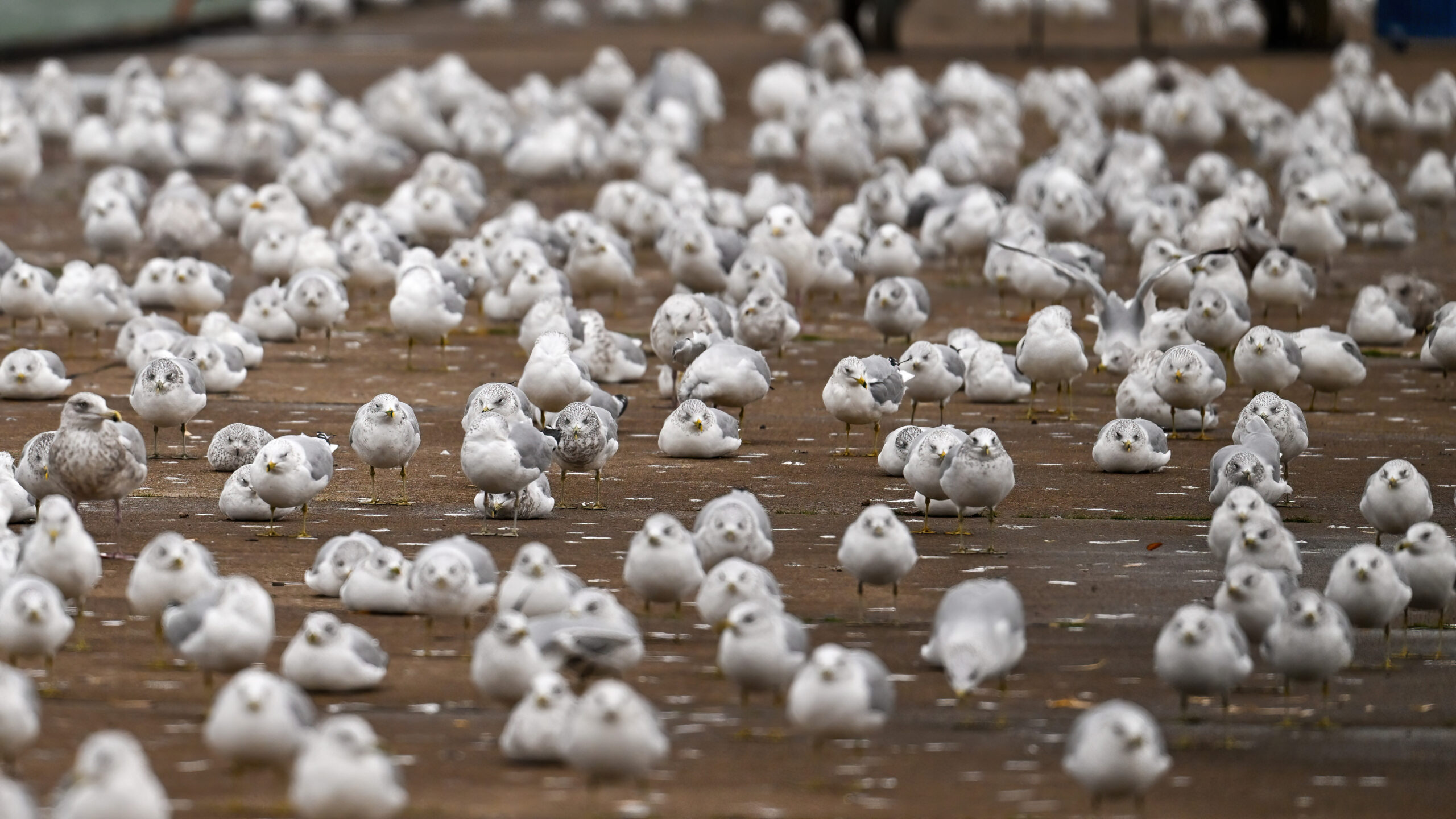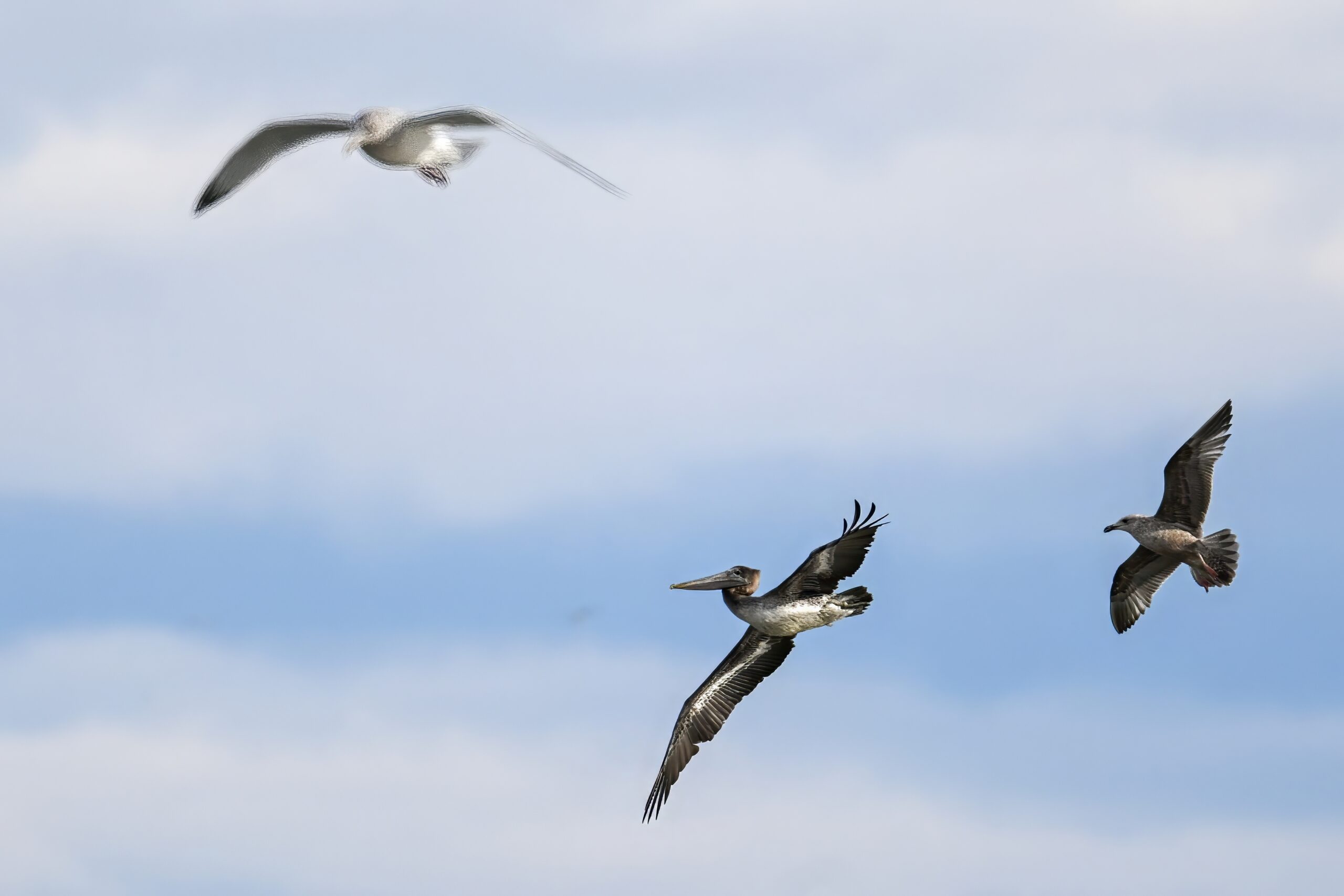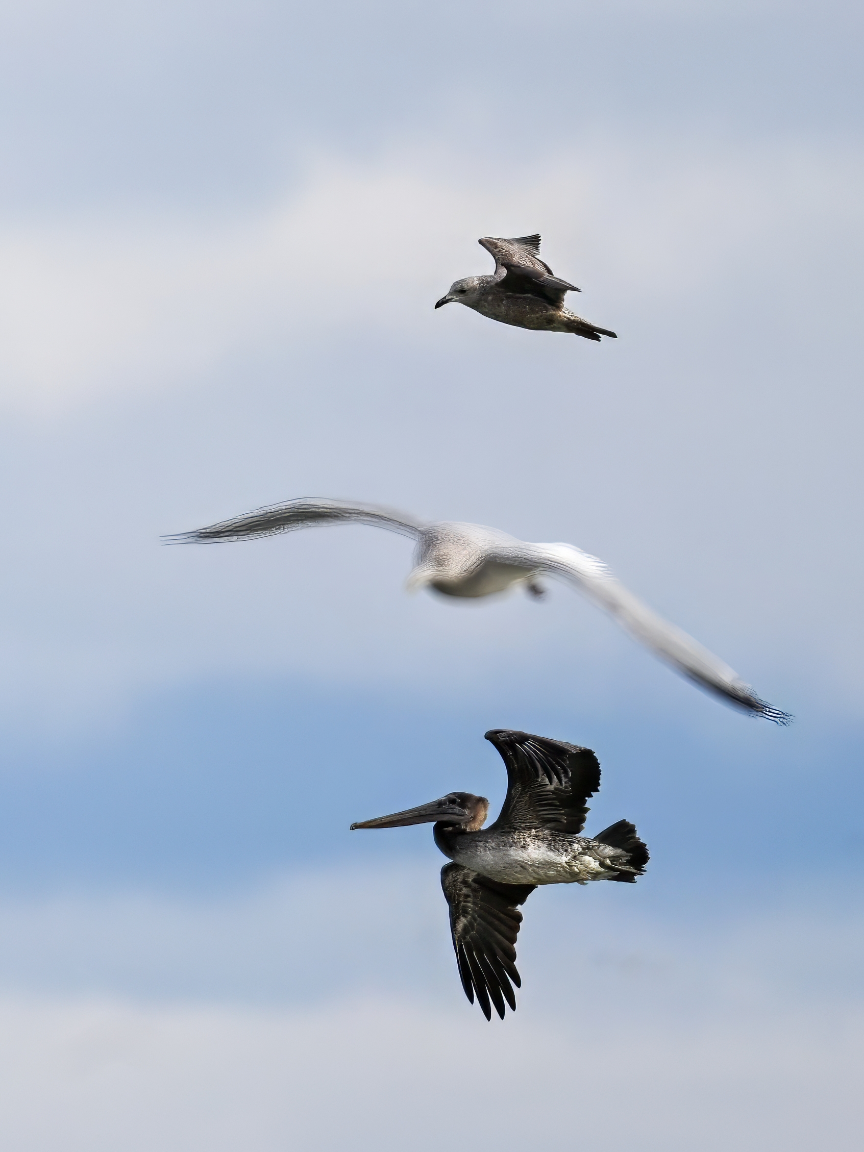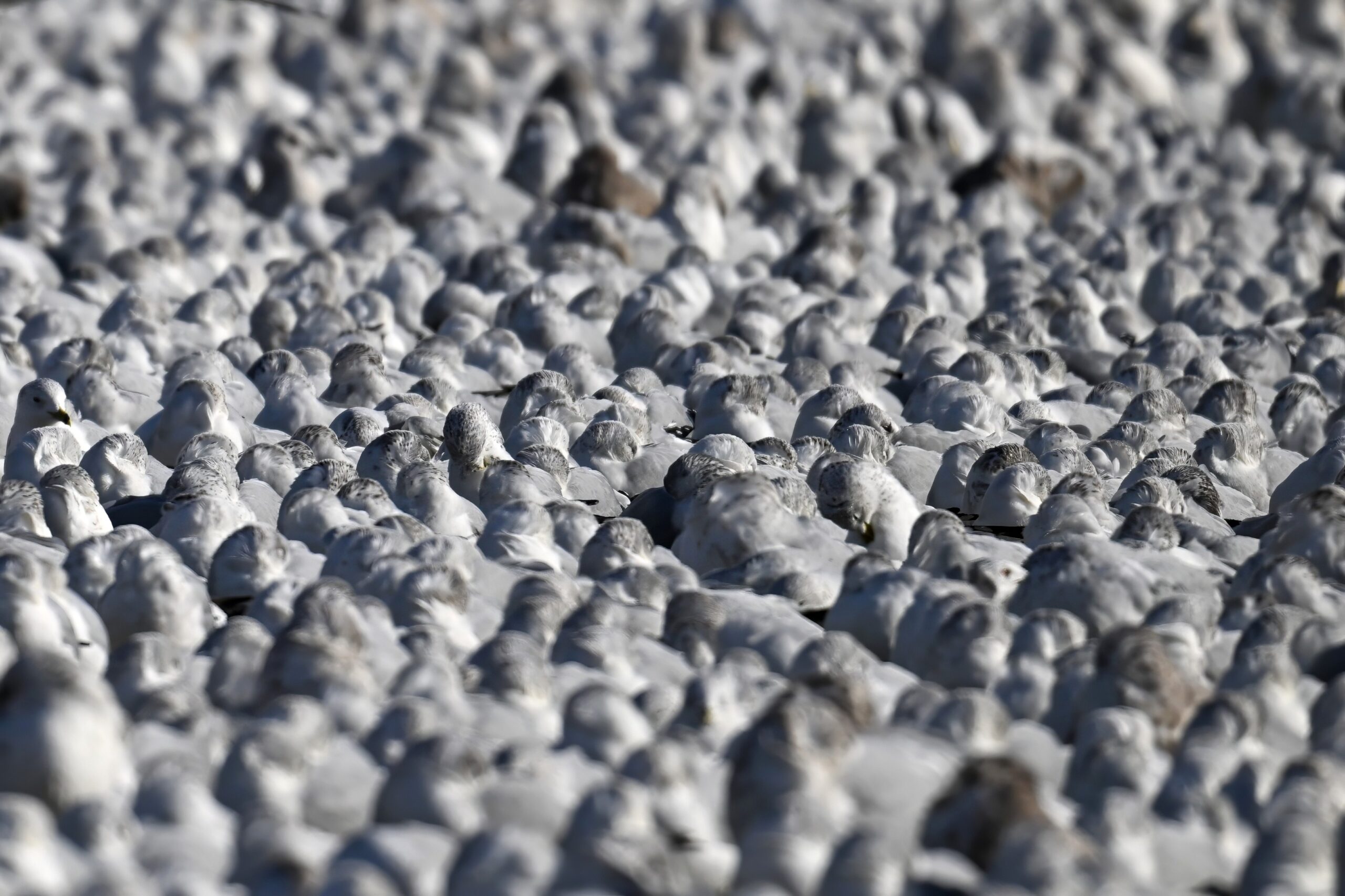 How could a large brown bird like a Brown Pelican, even if immature, hide so well in this giant flock of mostly white gulls?