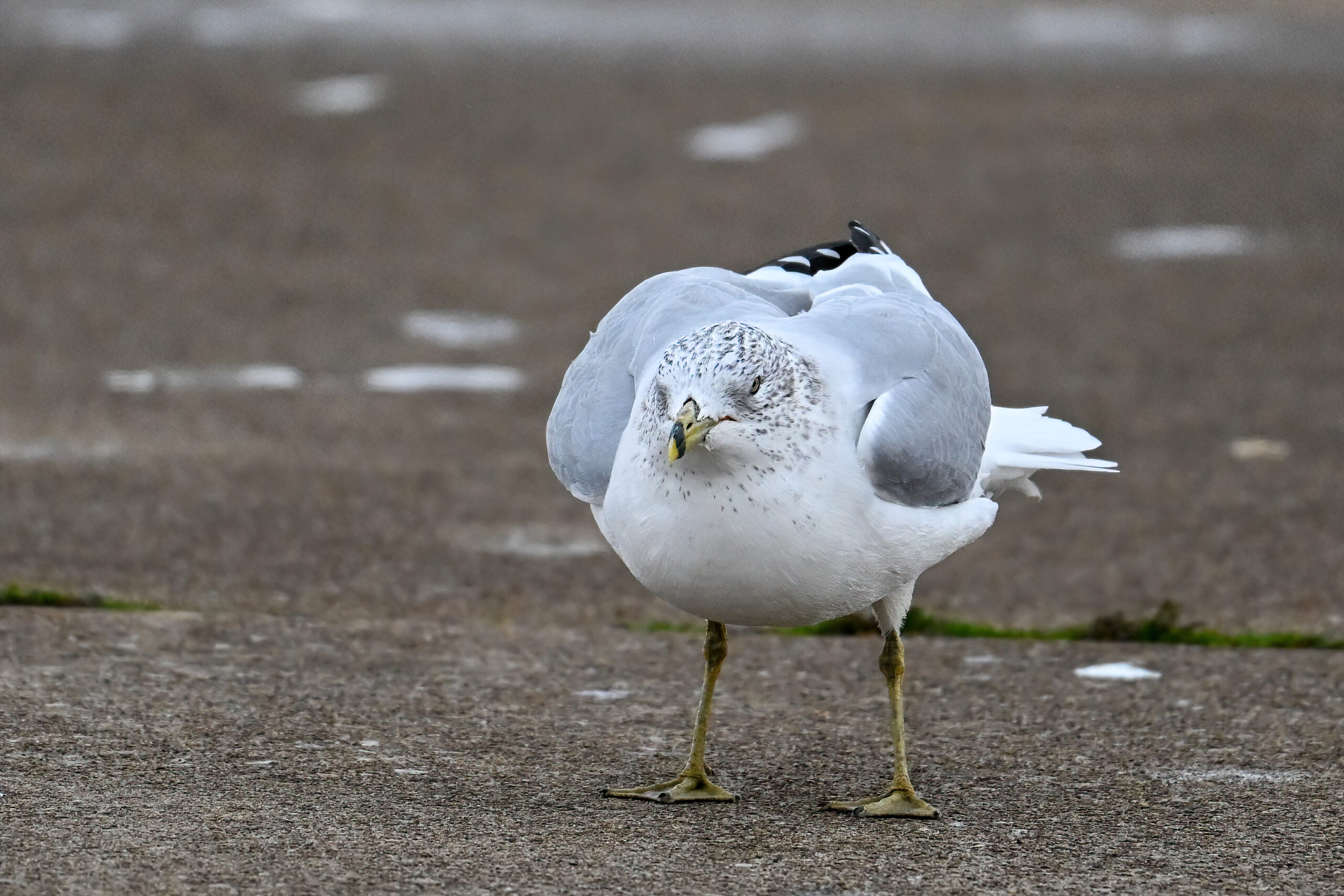 When we last left off, your intrepid and “underprepared for the wind chill” BirdingPI.com reporter was at the top of the South Pier ramp (above), waiting it out for a glimpse of the Brown Pelican seen at this location. [Editor’s note: the ramp transitions from the main section of South Pier to the lower, east end of South Pier, frequently used by human fisherfolk when conditions are better.] Just about to call it a day when it arose from the sea of gulls, the immature Pelican, shaking its wings and engaging in preening behaviour: