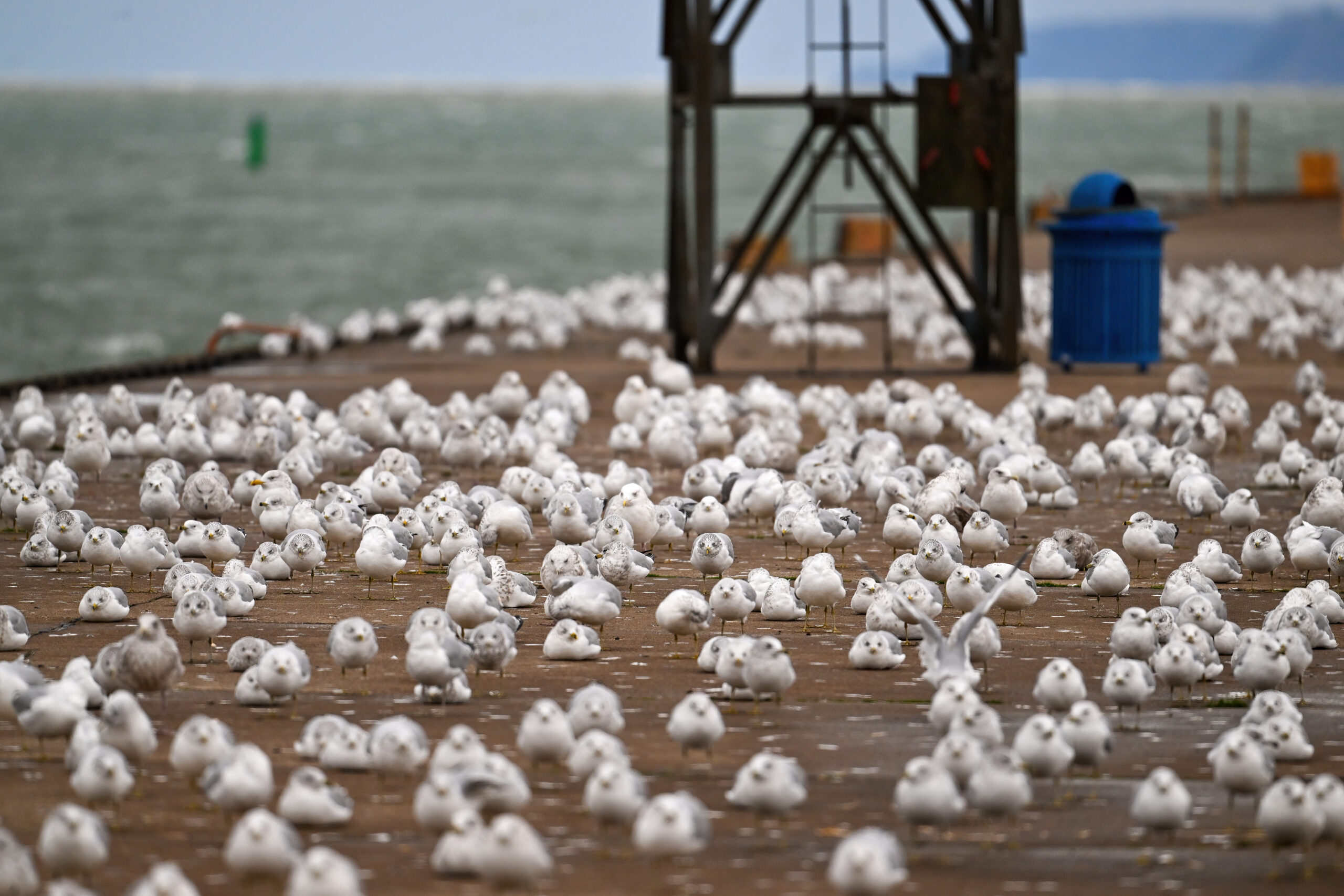 Air temperature approximately 1.6 degrees C (35 def F) + heavy/gusty winds = wind chill factor well below freezing. With confirmation that the pelican had been seen that day in the huge groups of gulls at the end of the pier, the only options were to wait it out or go back to HQ in defeat.