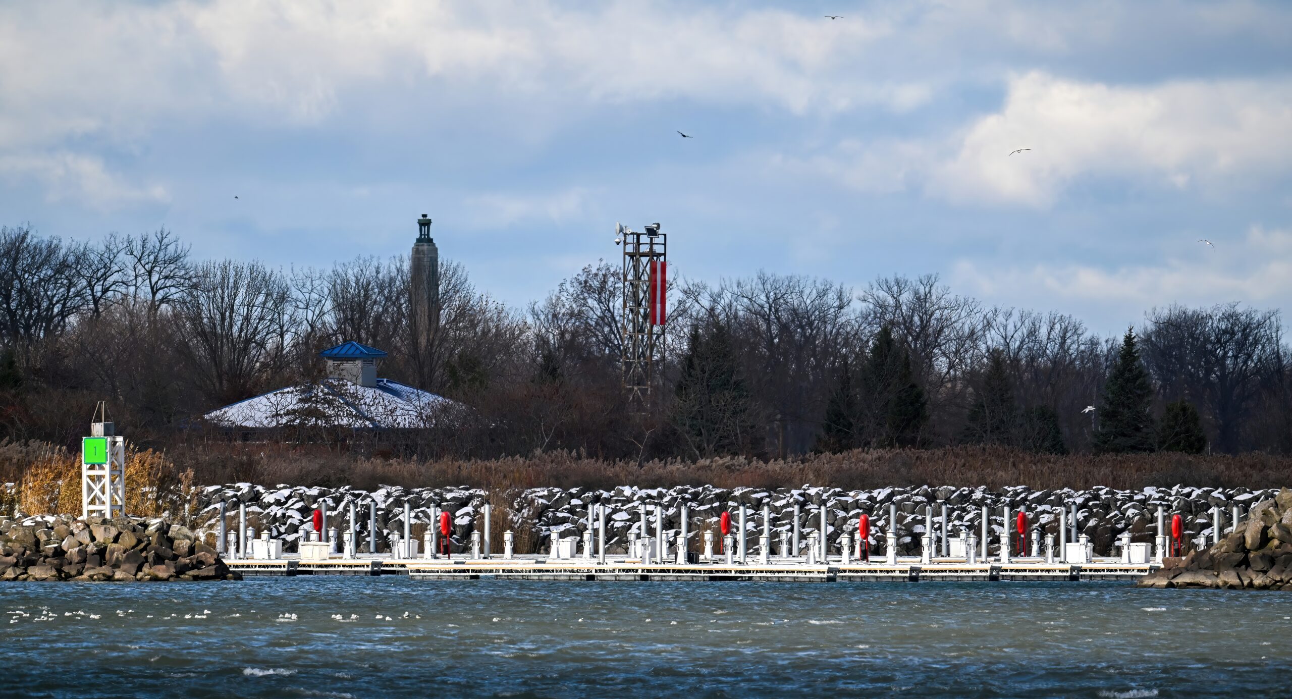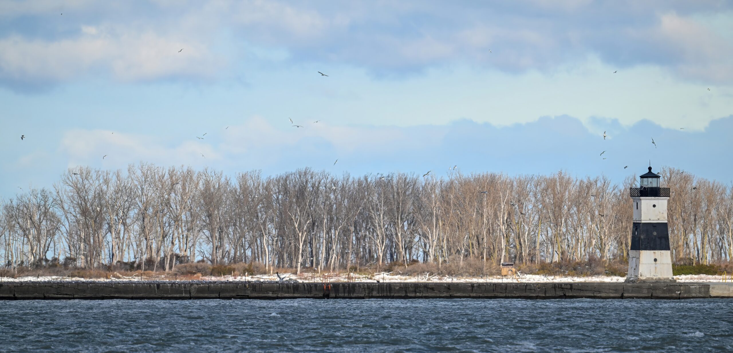 Pelican call: “Here, birdy, birdy”Has anyone seen a pelican?Thin white line of mostly gullsNorth PierNorth Pier light w/ inner Gull Point in backgroundLampe Marina w/ Perry Monument back left – no birdsGull Point