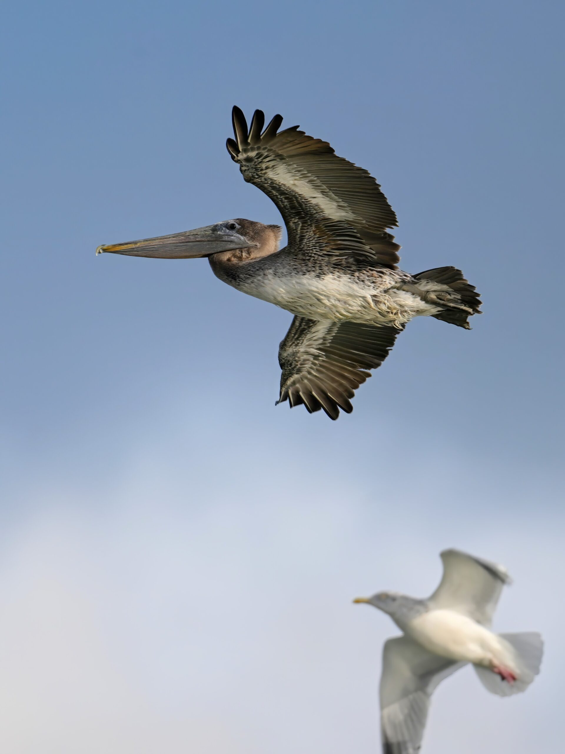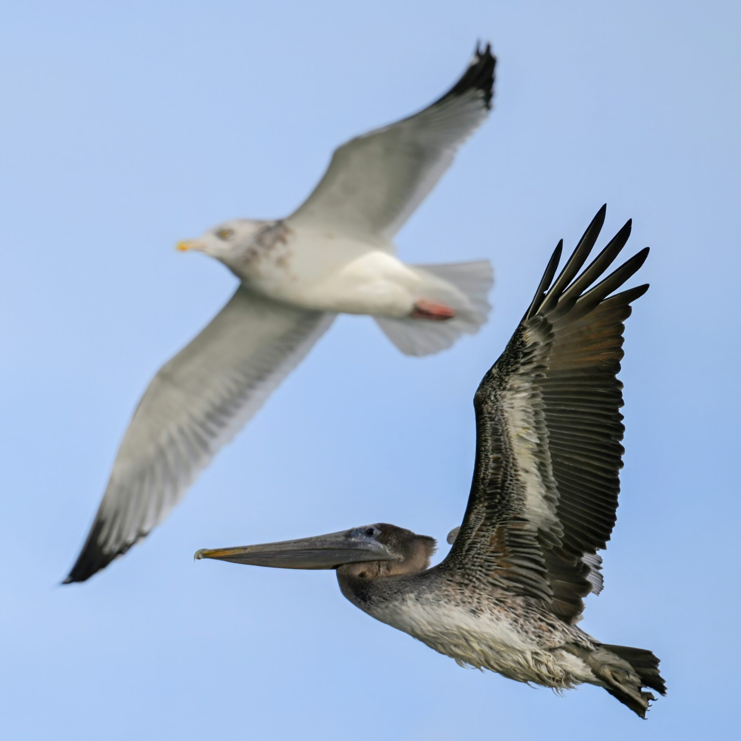 Visual ID plus preening would have been “great enough,” but the gulls soon startled, taking flight, the pelican among them. A lucky occurrence for sure.