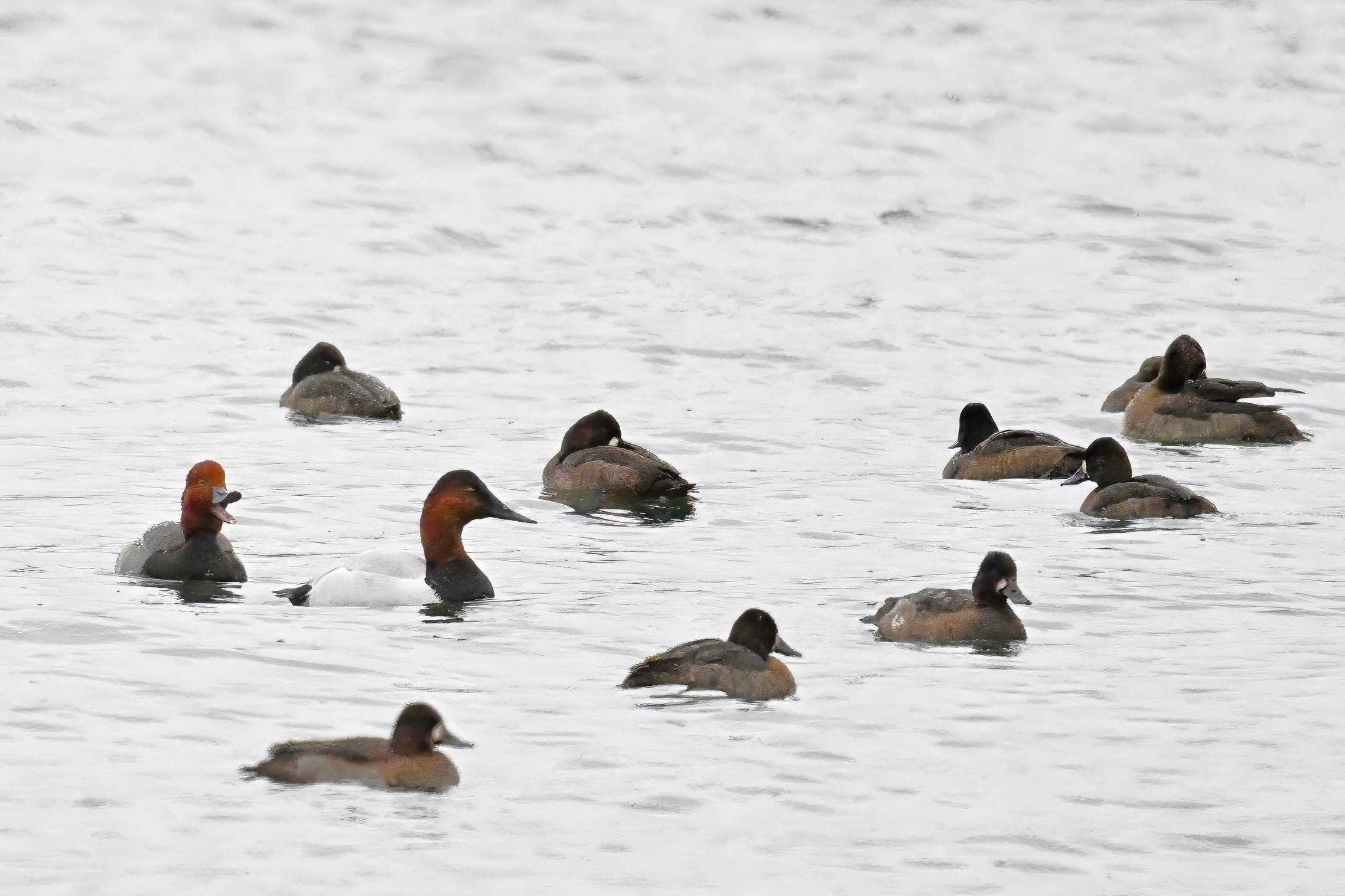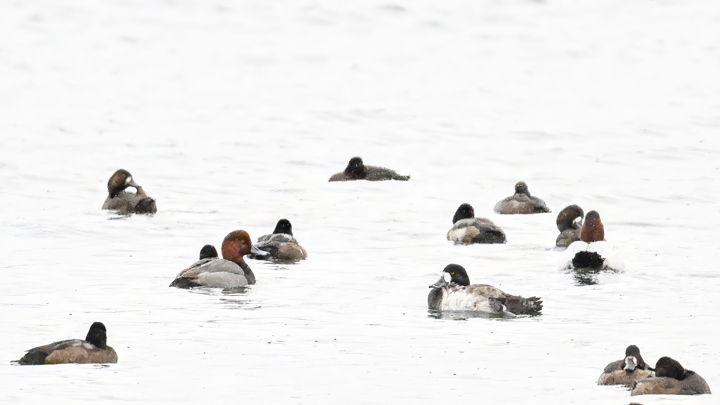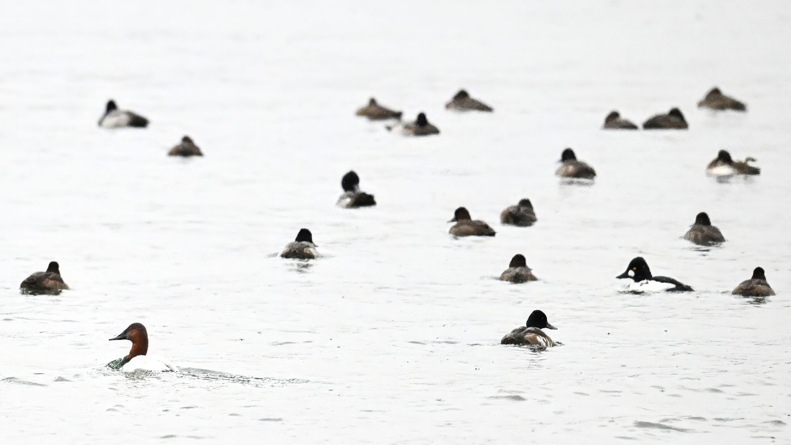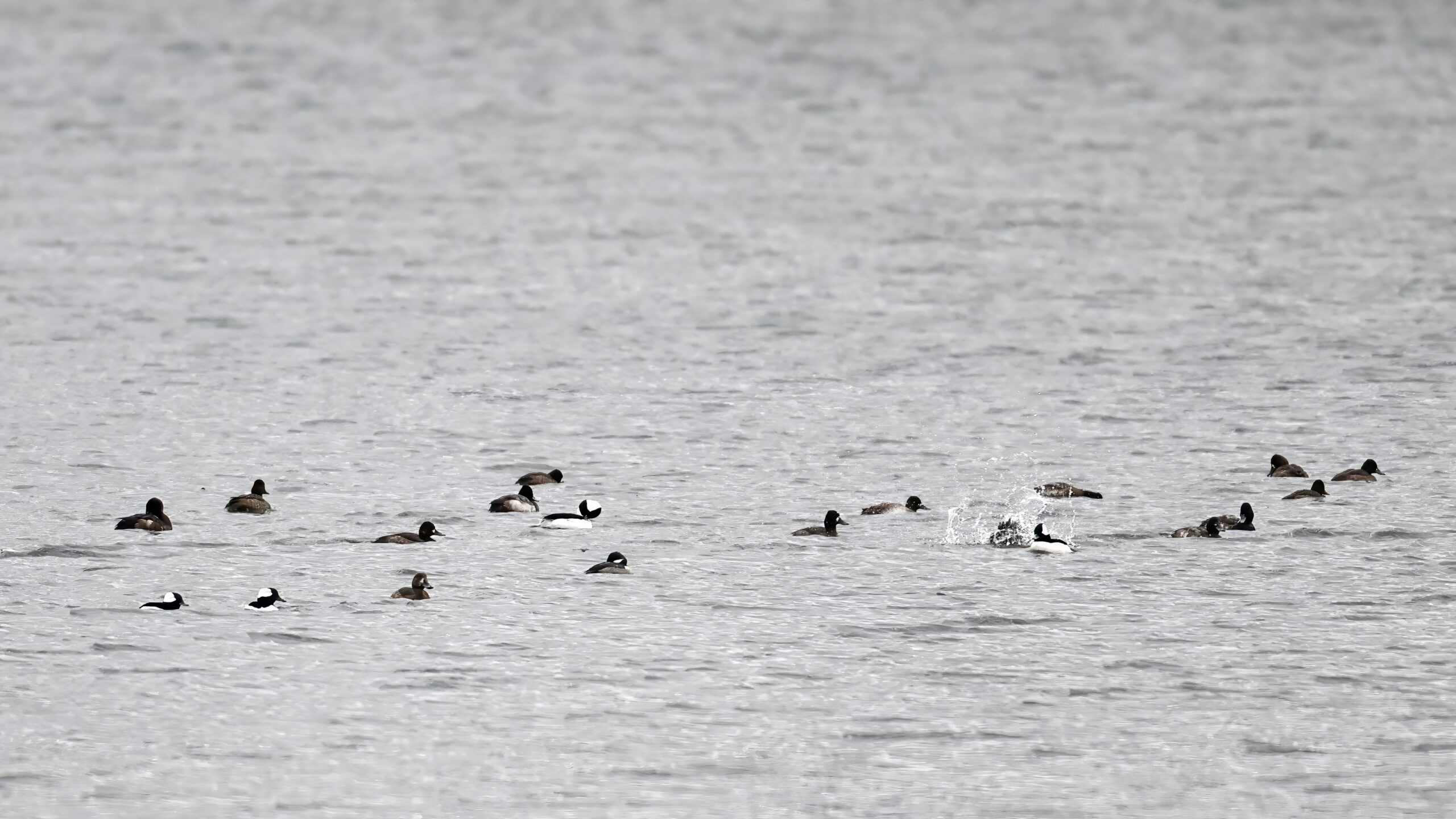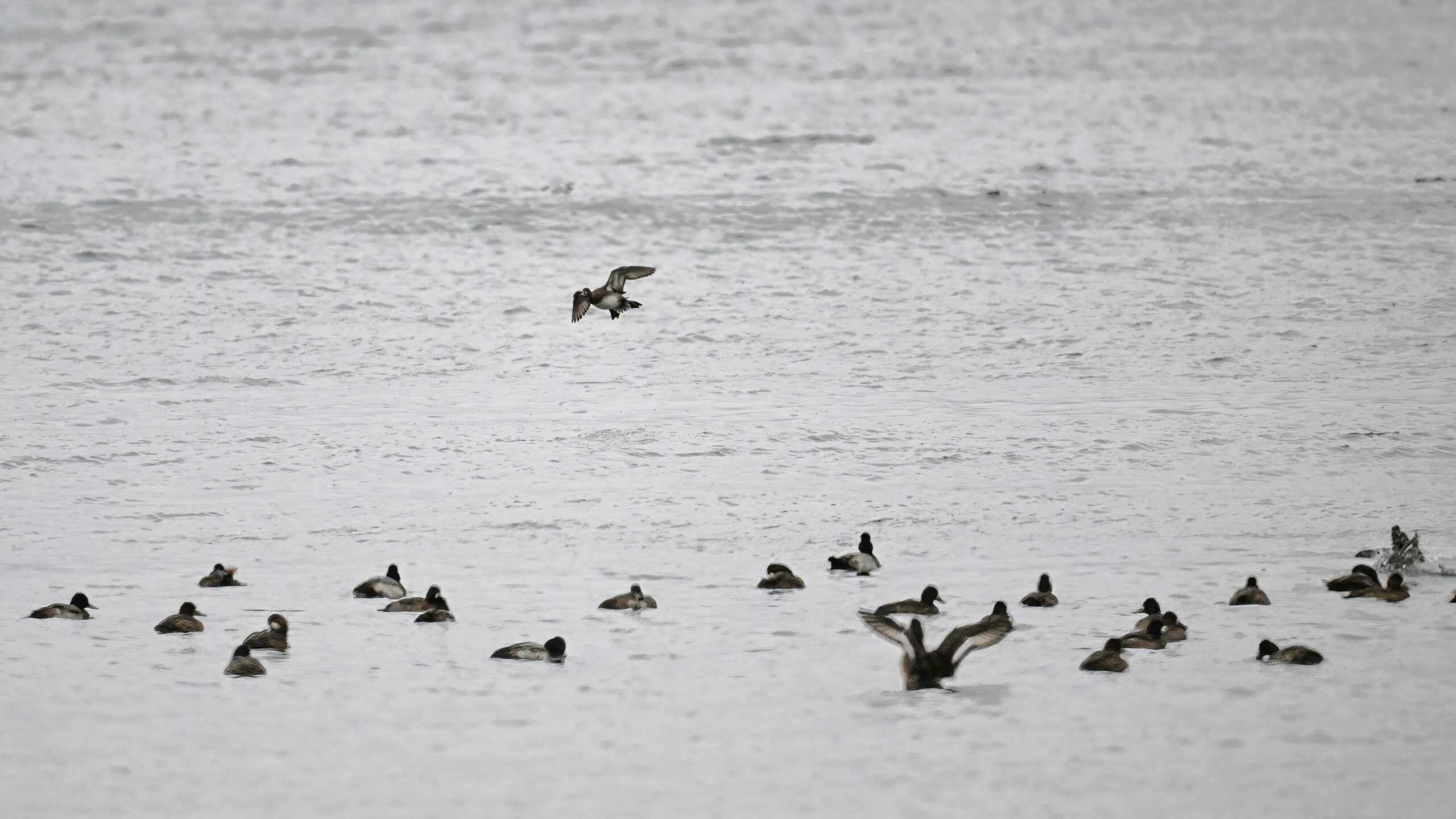Male Bufflehead in flight @ outer Lake ErieTundra Swans on Presque Isle BayCanvasback (m) @ lower left, Common Goldeneye (m) right middle (w/ white spot), rest are Greater/Lesser ScaupFemale/immature Scaup landingScaup landing IIScaup Landing IIIScaup landing IVTundra Swans IIMale Redhead (far left center) + male Canvasback (left center)Redhead (left center) + ScaupTundra Swans IIIHorned Grebe (center)Bufflehead, etc.Scaup on outer Lake Erie