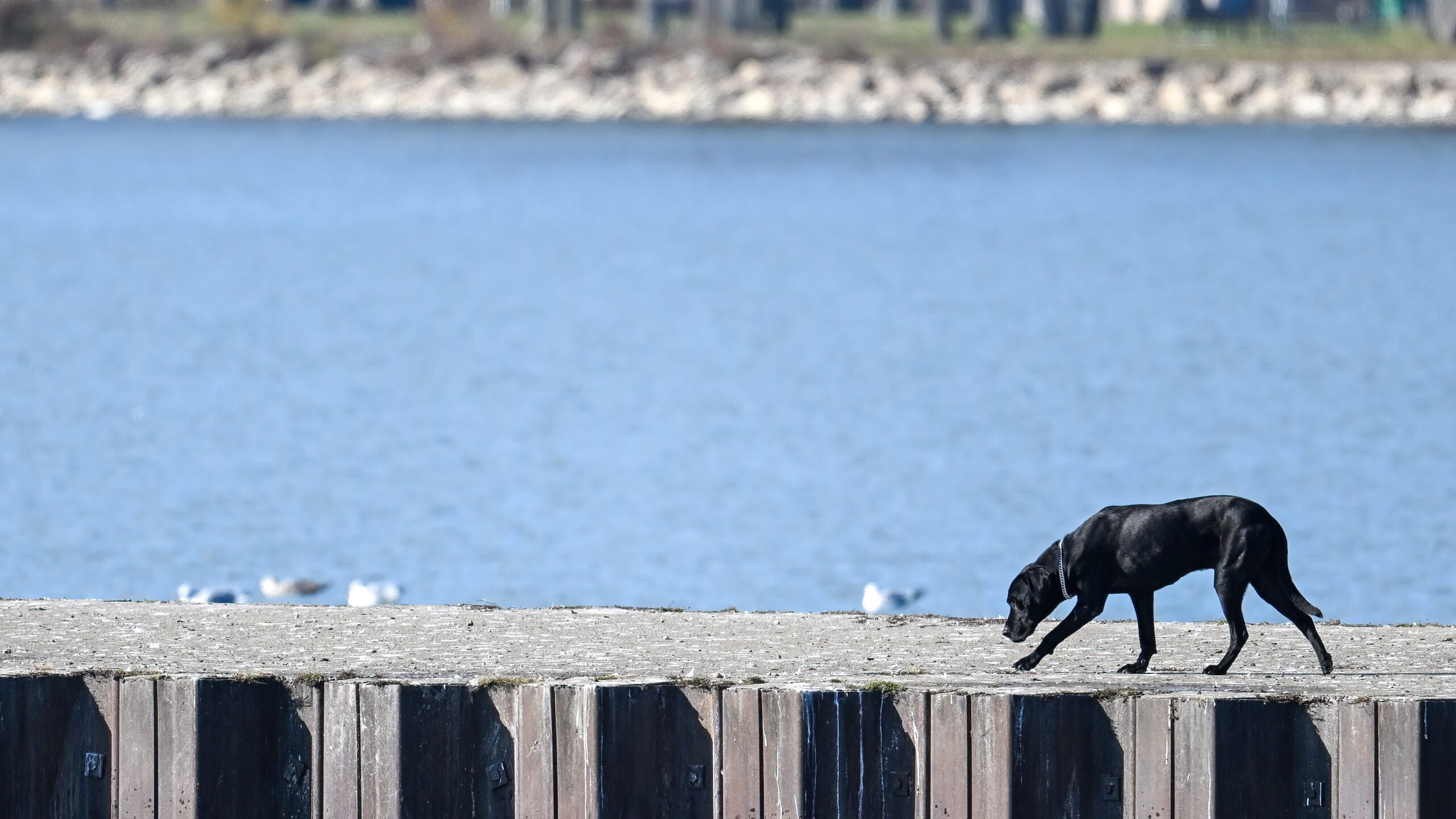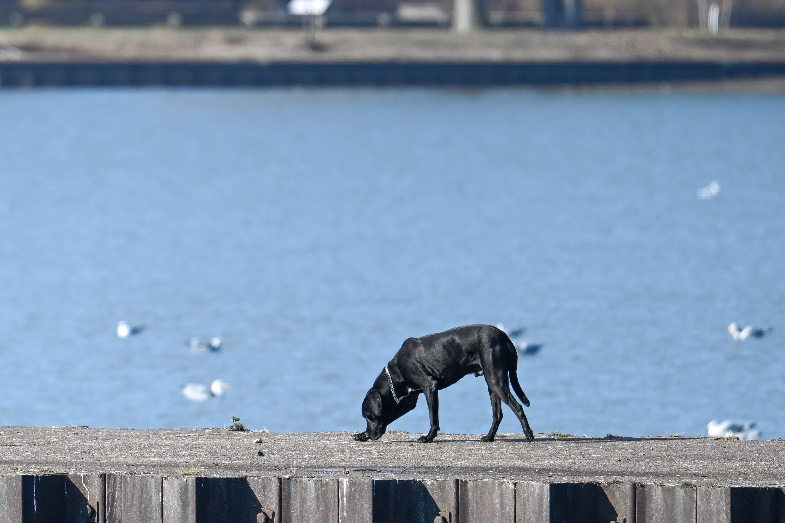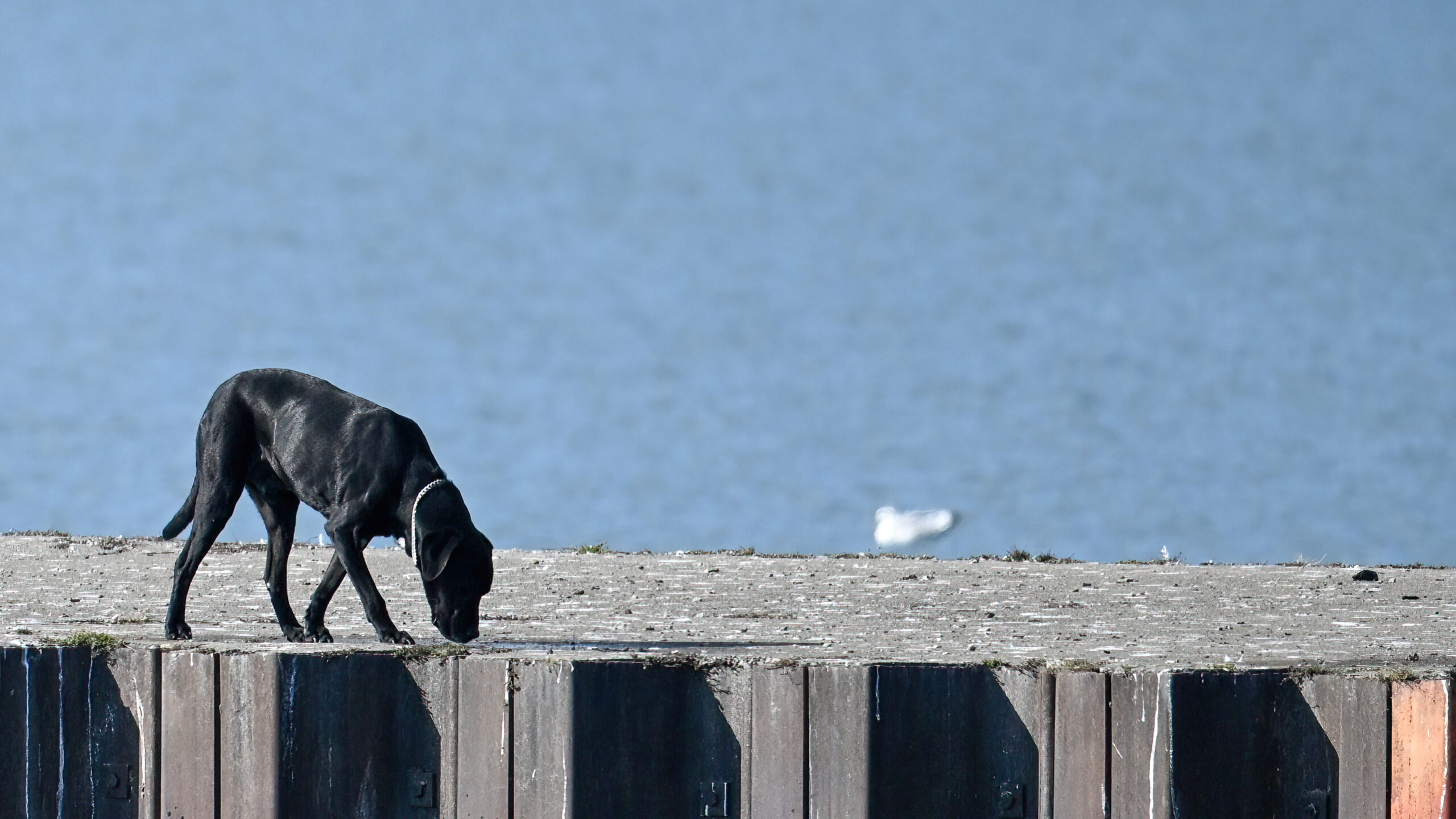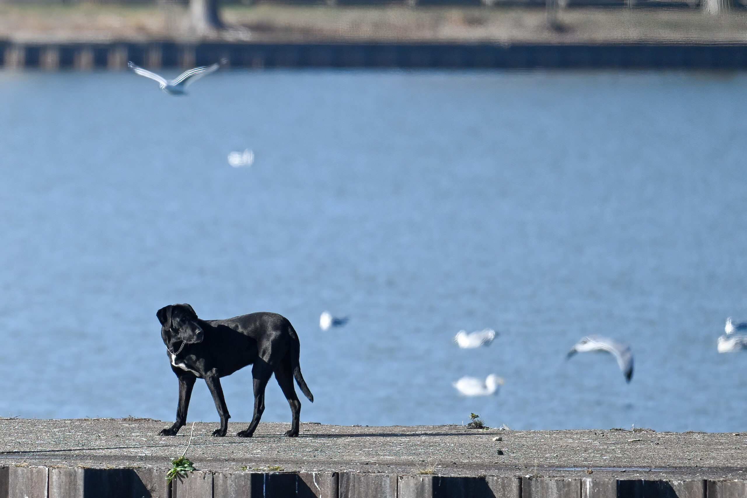 This is “Bruce.” [Real name redacted for privacy.] Bruce is a domesticated dog (Canis lupus familiaris), specifically a black Labrador Retriever. Bruce’s human is associated with the Coast Guard station at North Pier at Presque Isle State Park. Bruce likes to spend his time ‘patrolling’ the compound. He also likes to walk the pier to scare off gulls and find gull poop to eat. Yum.