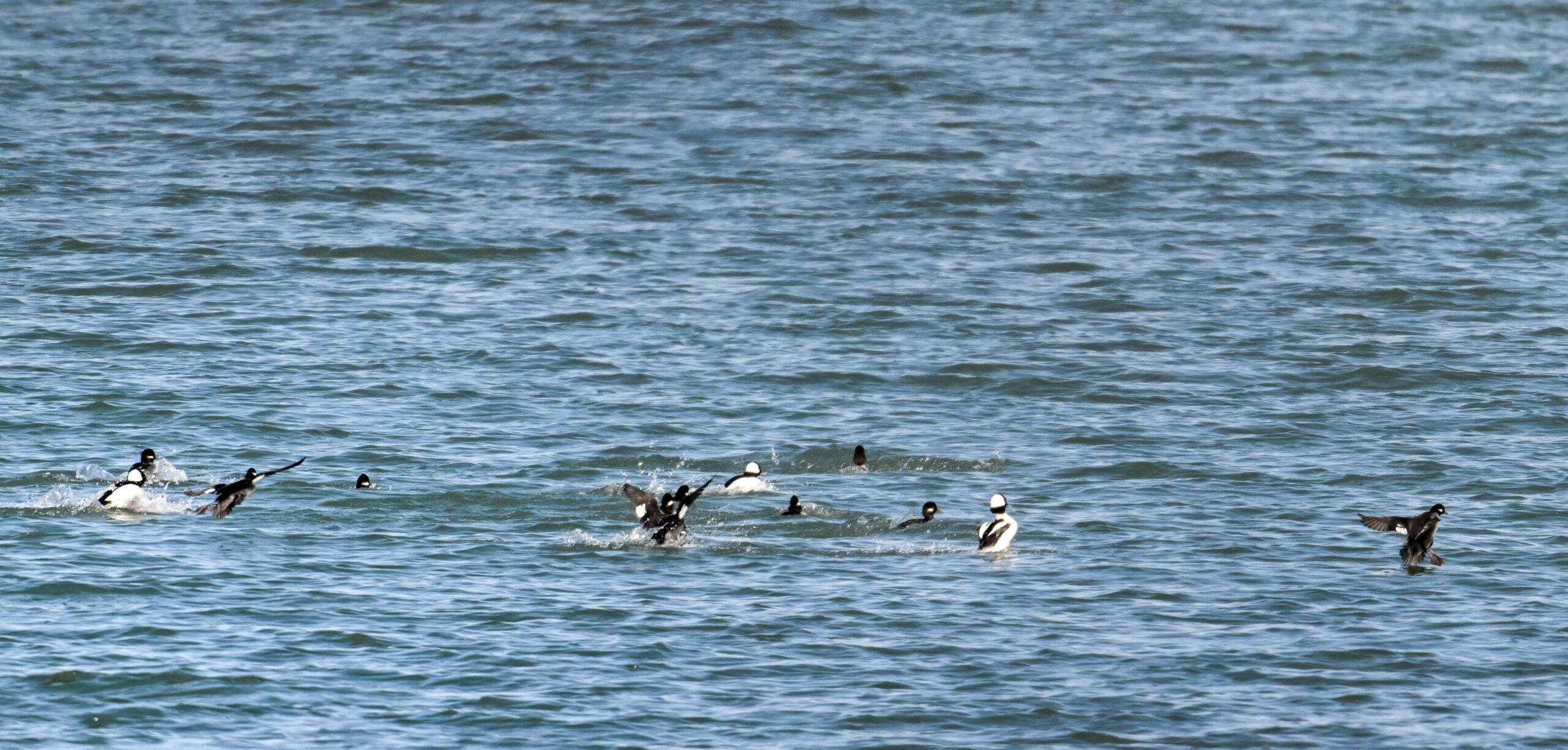 Distant specksGull Point tree line and new observation platform; outer Lake Erie @ horizonDuck in center = Bufflehead, rest are Common GoldeneyeBuffleheads take flightBIF IIBIF IIIBIF IVFemale or immature male Bufflehead on rightMore Buffleheads join inRepositioning on Lake Eriew/ Common Goldeneye @ upper leftGull Point, old observation platformLanding ILanding IILanding IIIDistant ducks on Lake Erie