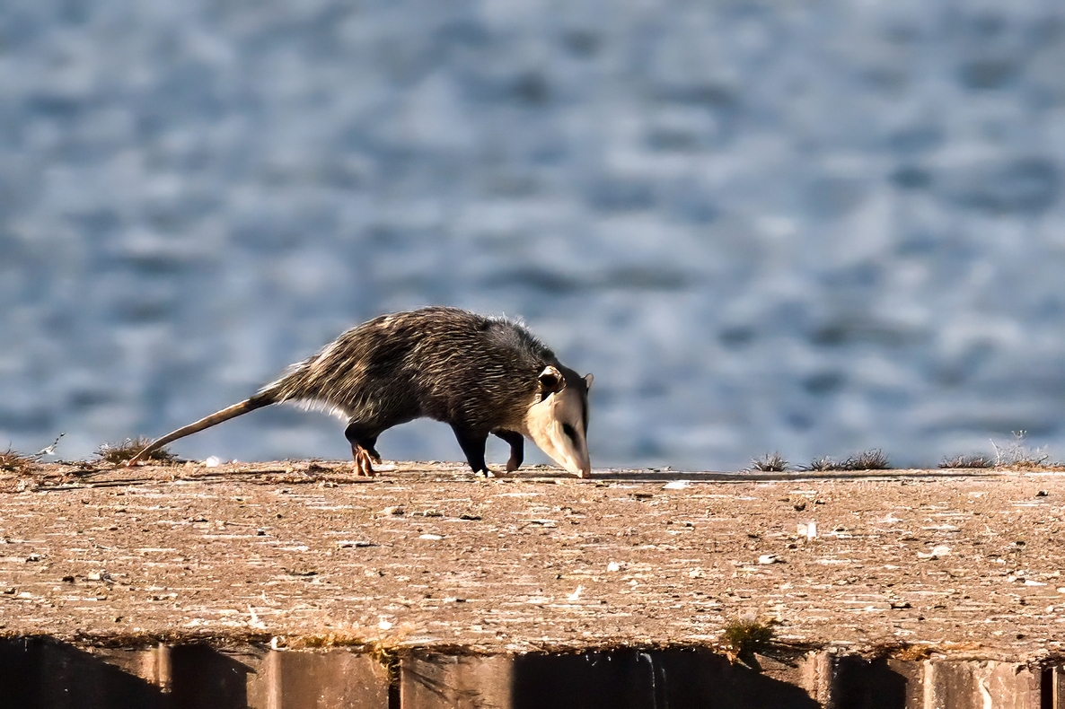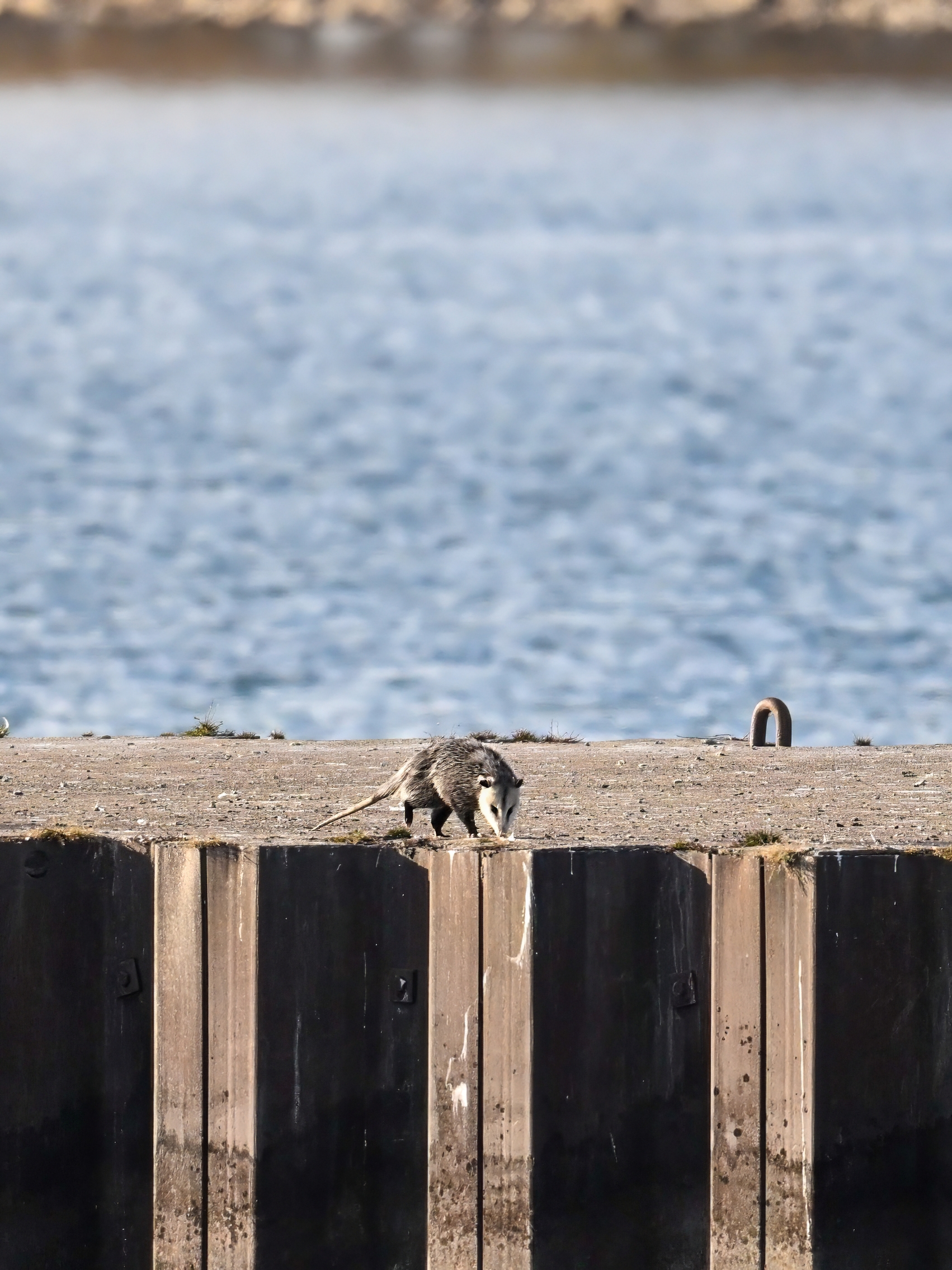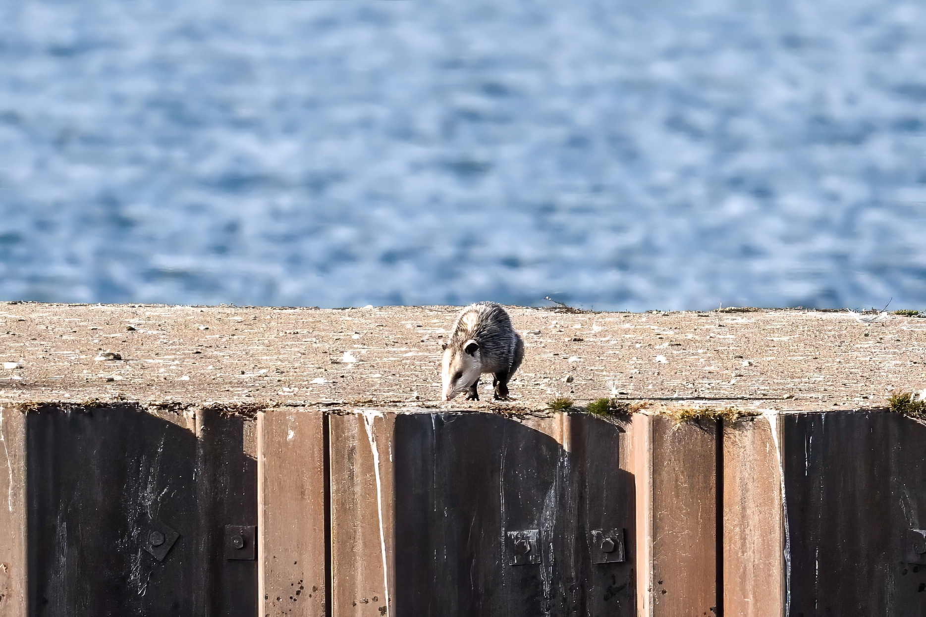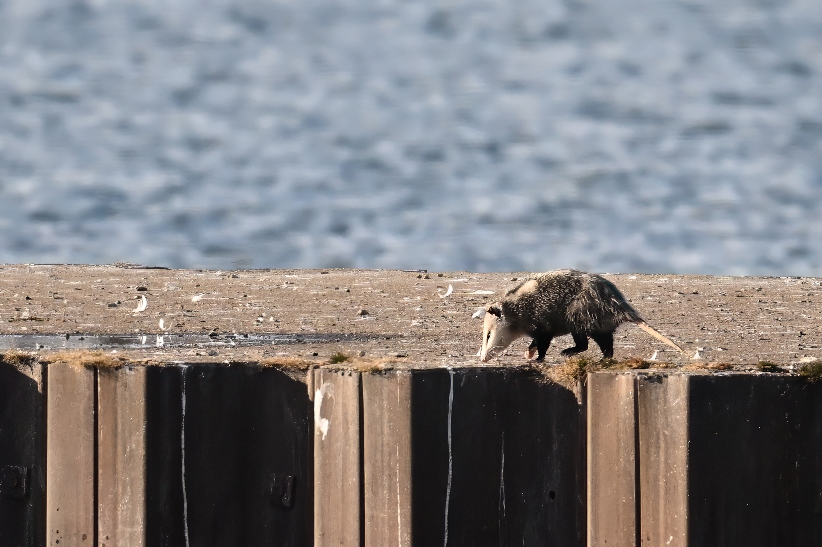 This is Herbert. Herbert is a Virginia Opossum (Didelphis virginiana), North America’s only native marsupial species. He lives in the woods at North Pier, by the Coast Guard station, at Presque Isle State Park. Normally nocturnal, Herbert couldn’t help but venture out in the daytime Saturday looking for yummy gull detritus.