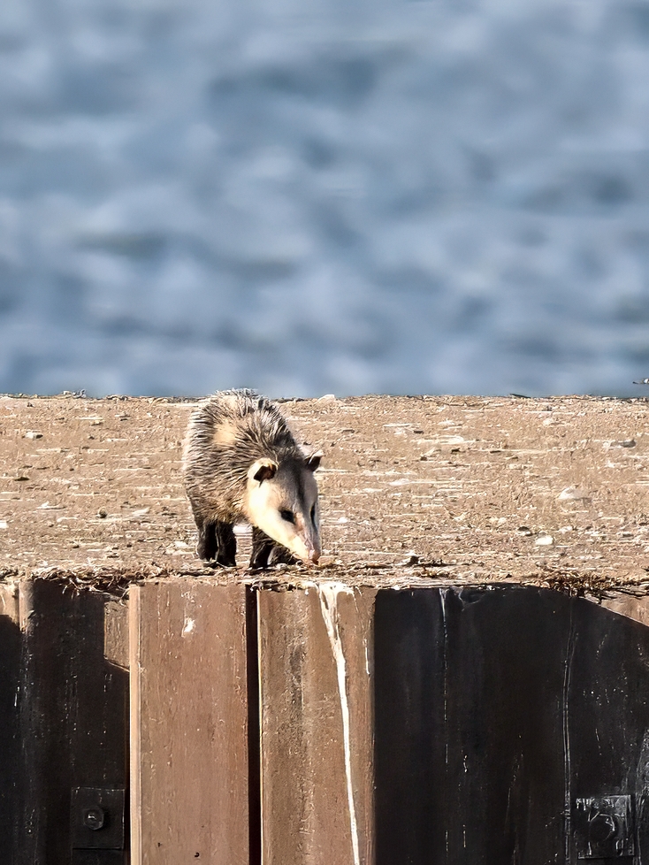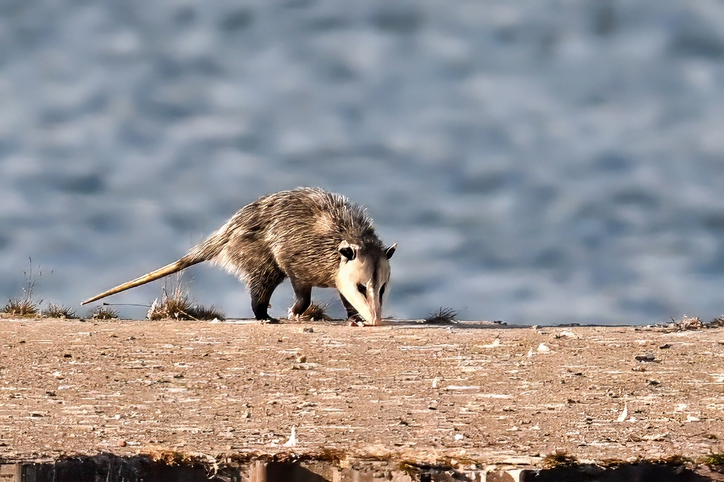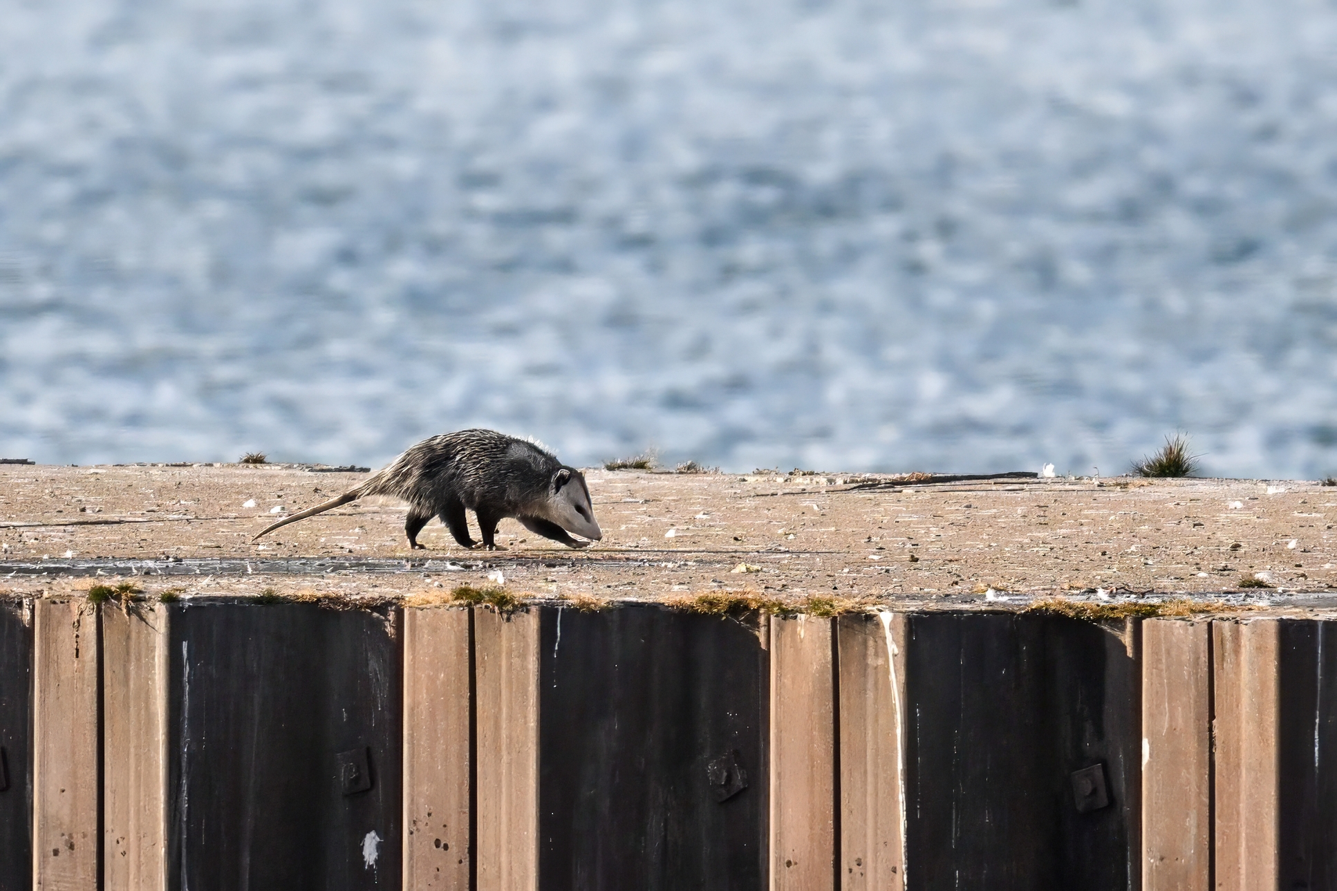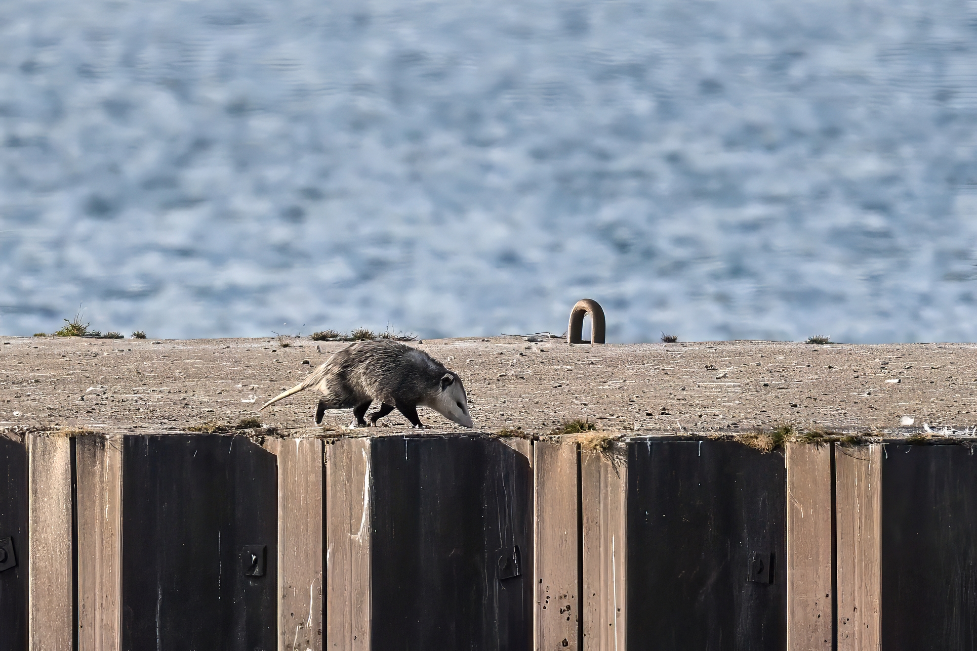 This is Herbert. Herbert is a Virginia Opossum (Didelphis virginiana), North America’s only native marsupial species. He lives in the woods at North Pier, by the Coast Guard station, at Presque Isle State Park. Normally nocturnal, Herbert couldn’t help but venture out in the daytime Saturday looking for yummy gull detritus.