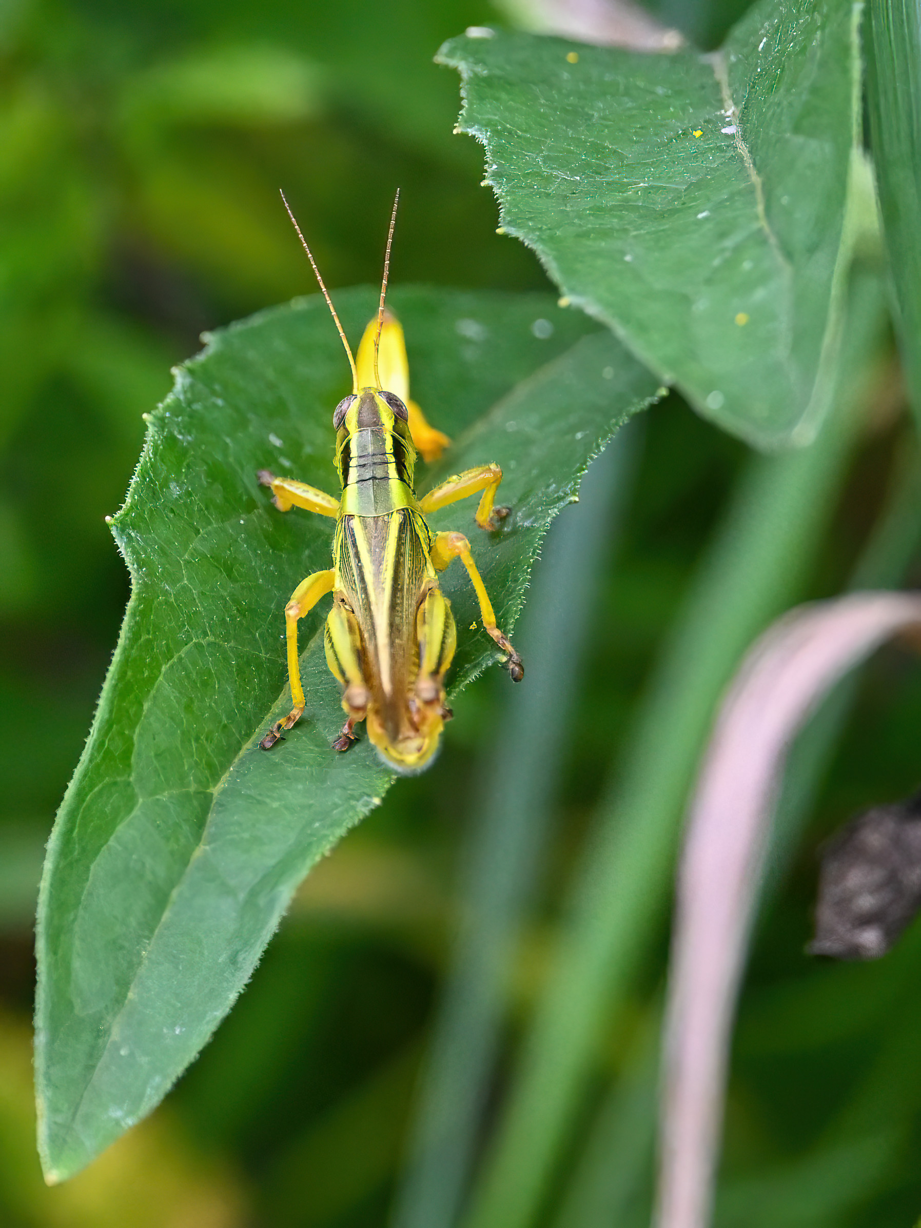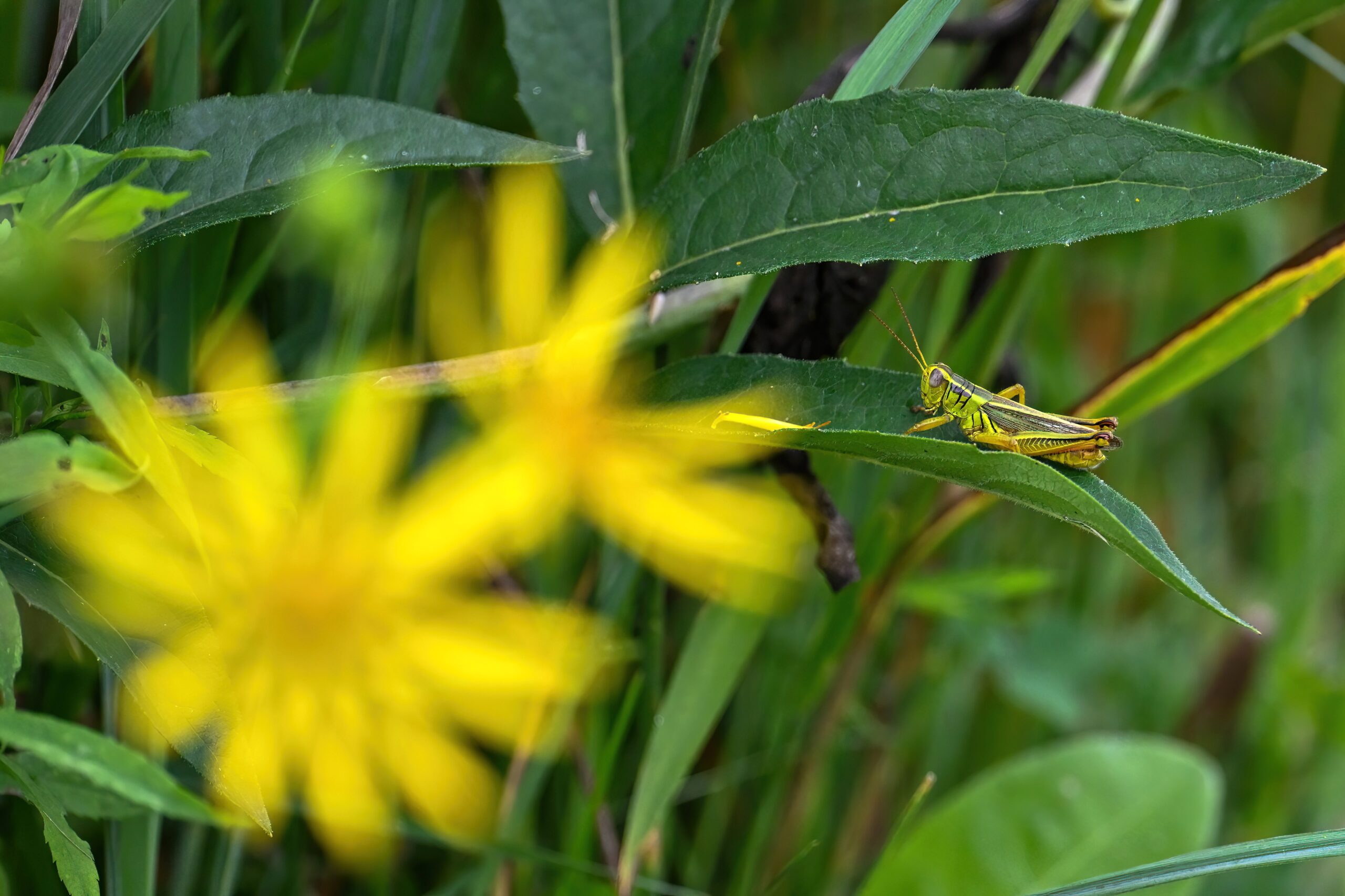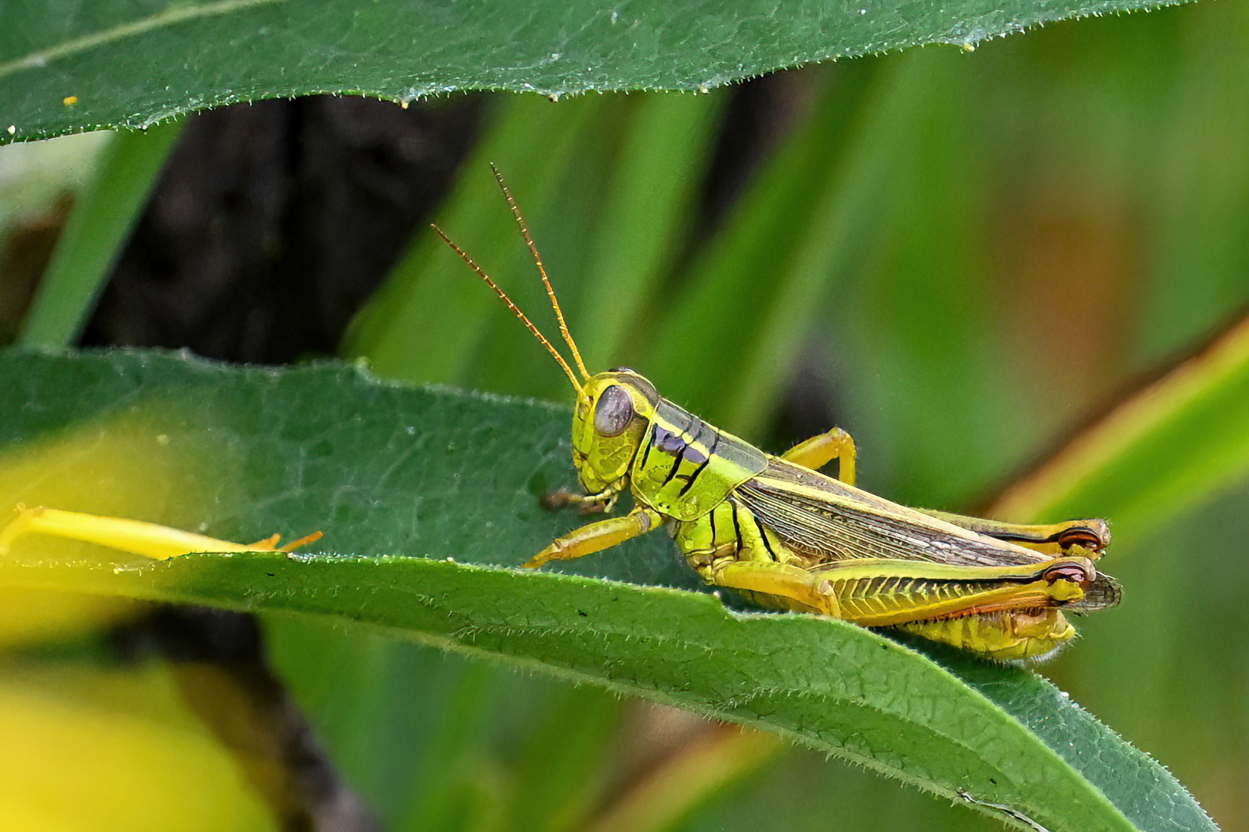 Rather nice shots of “very difficult to ever capture on ‘film'” Two-striped Grasshopper (Melanoplus bivittatus):