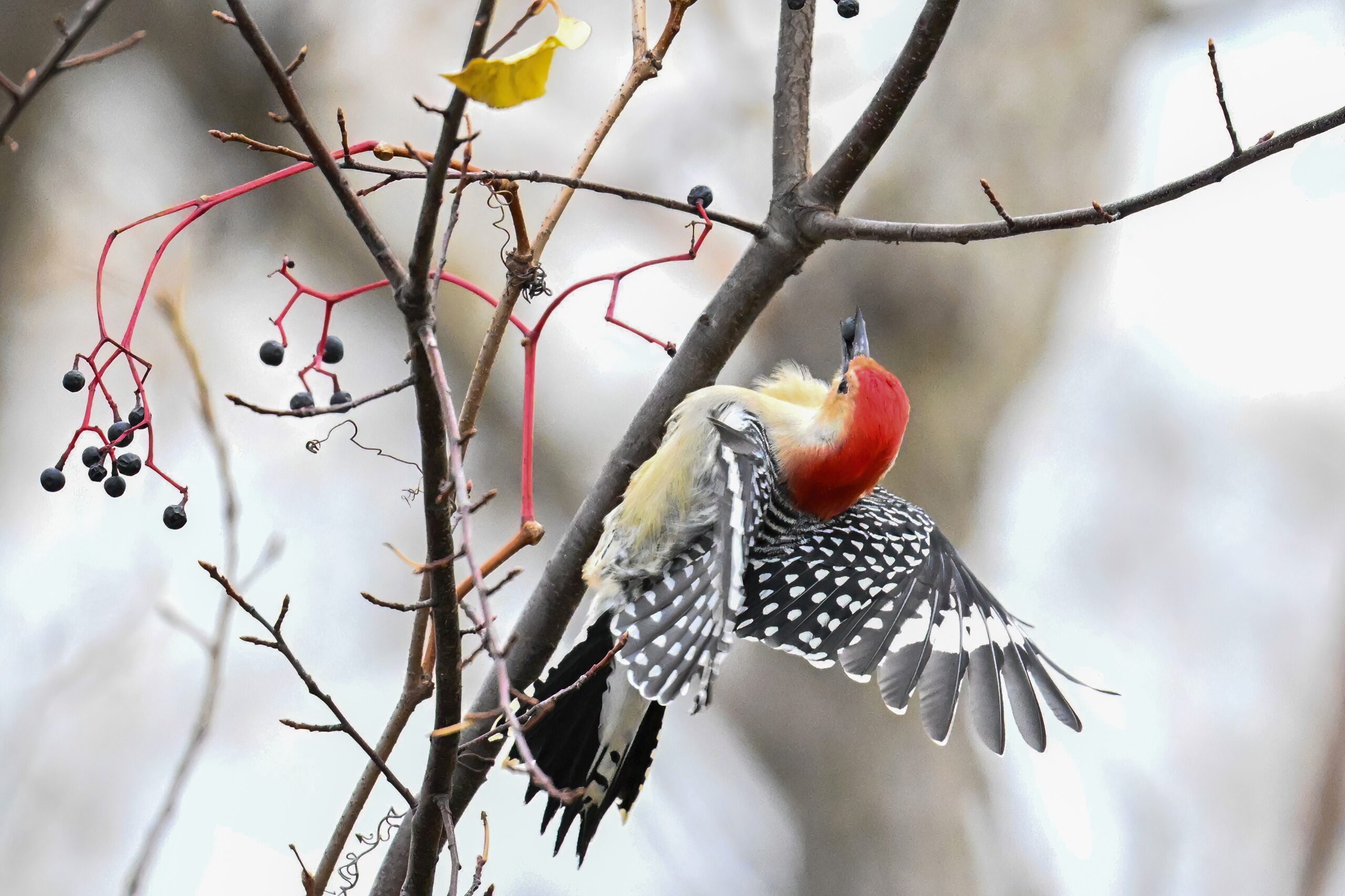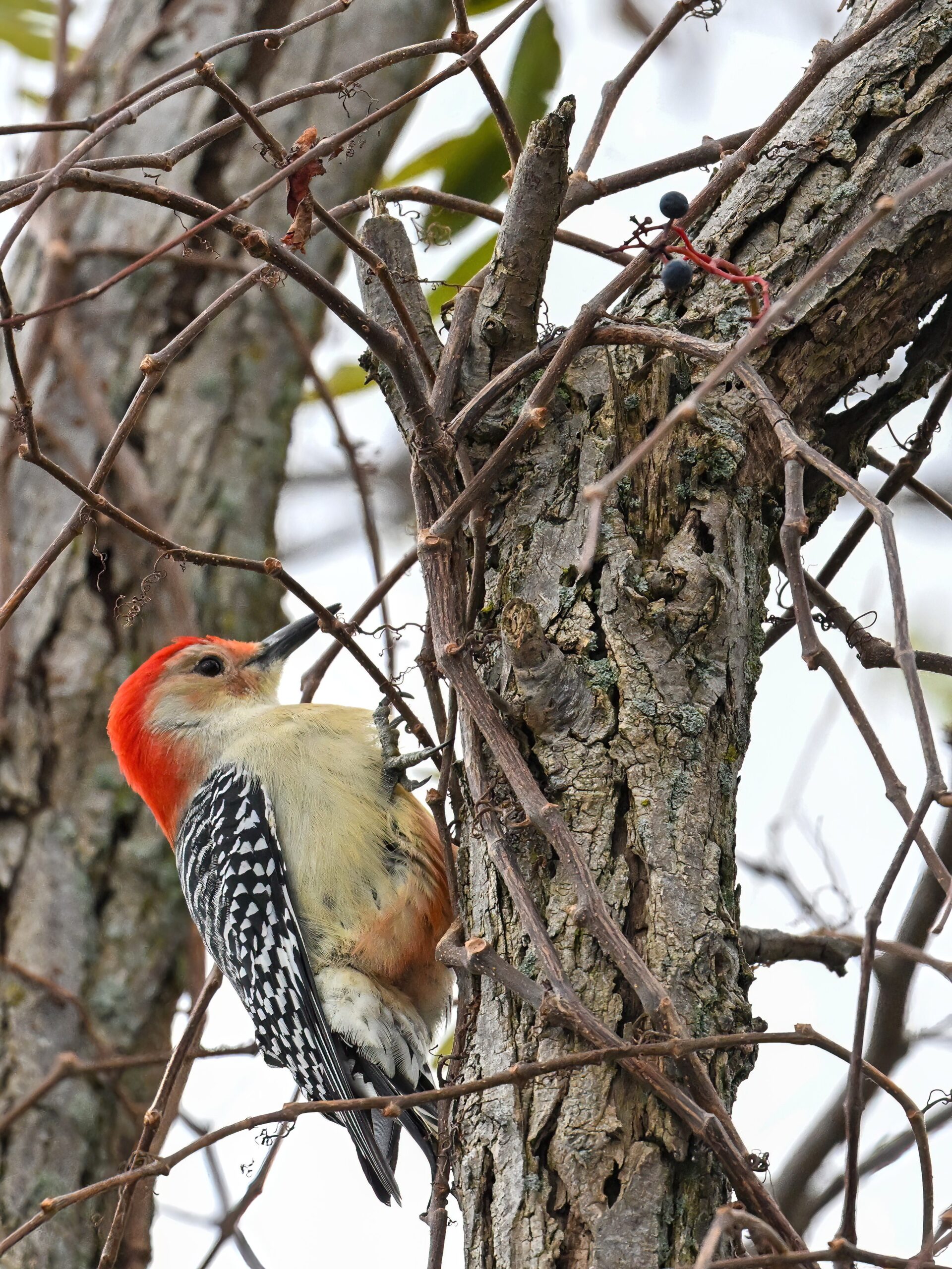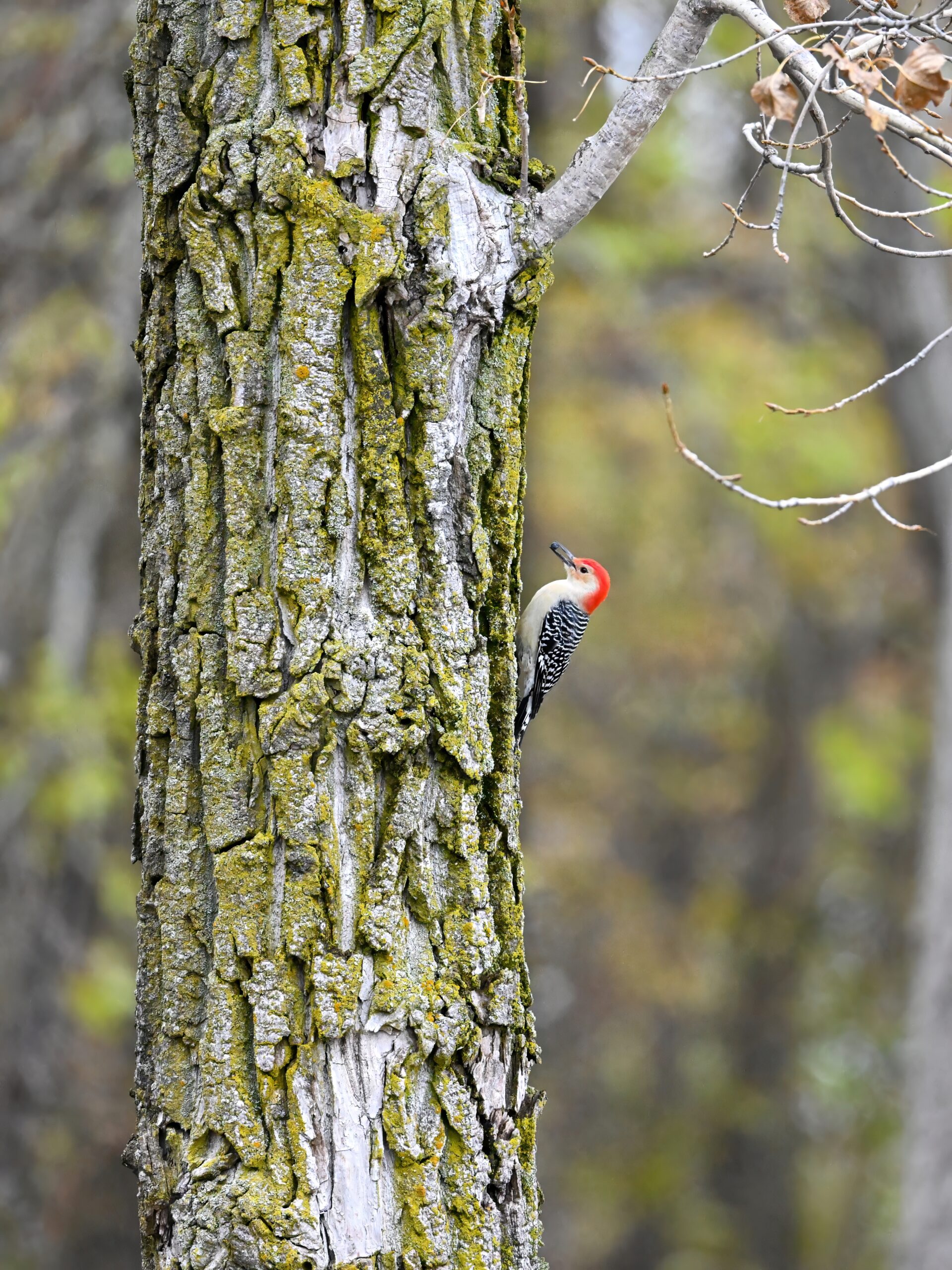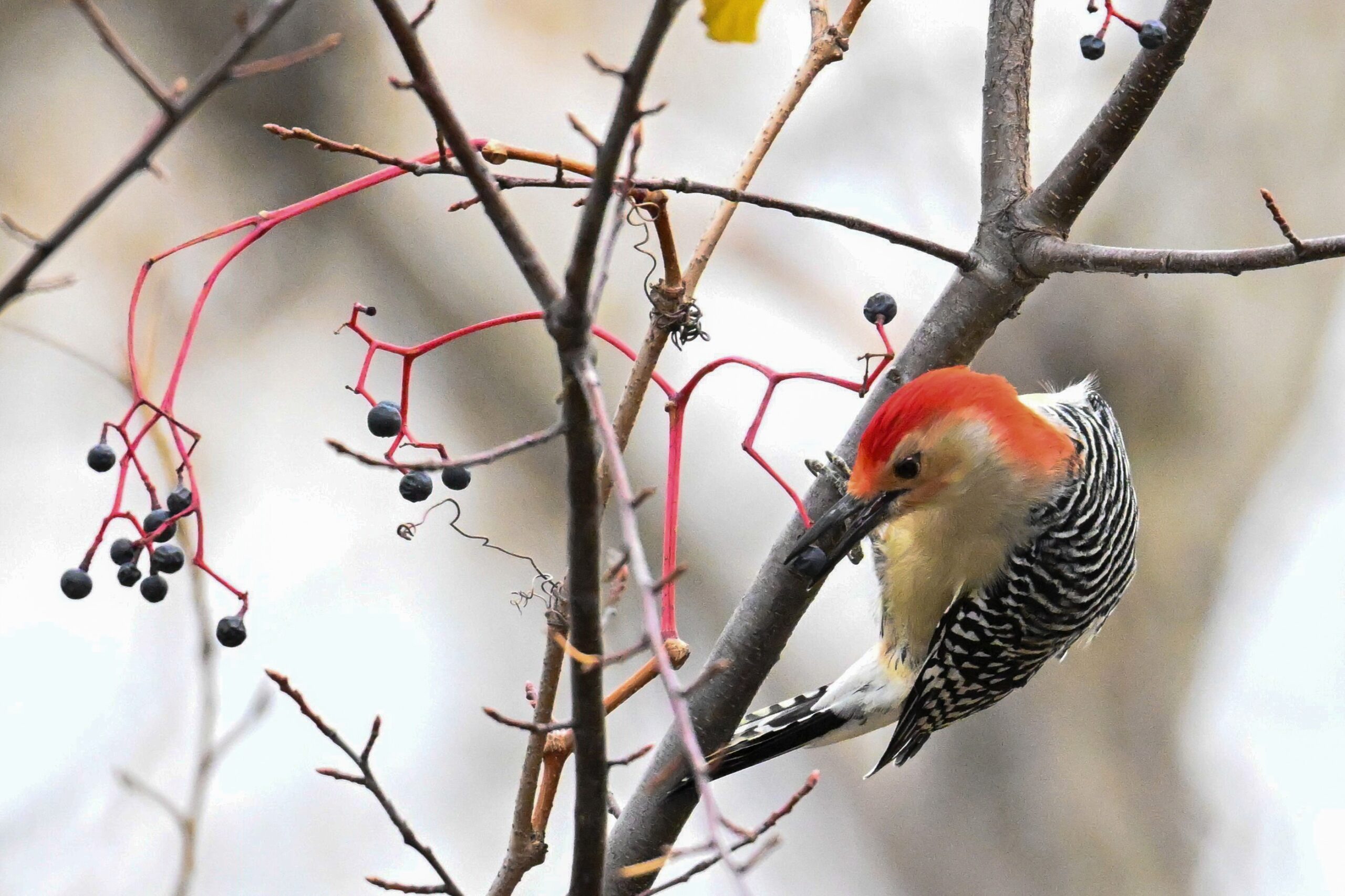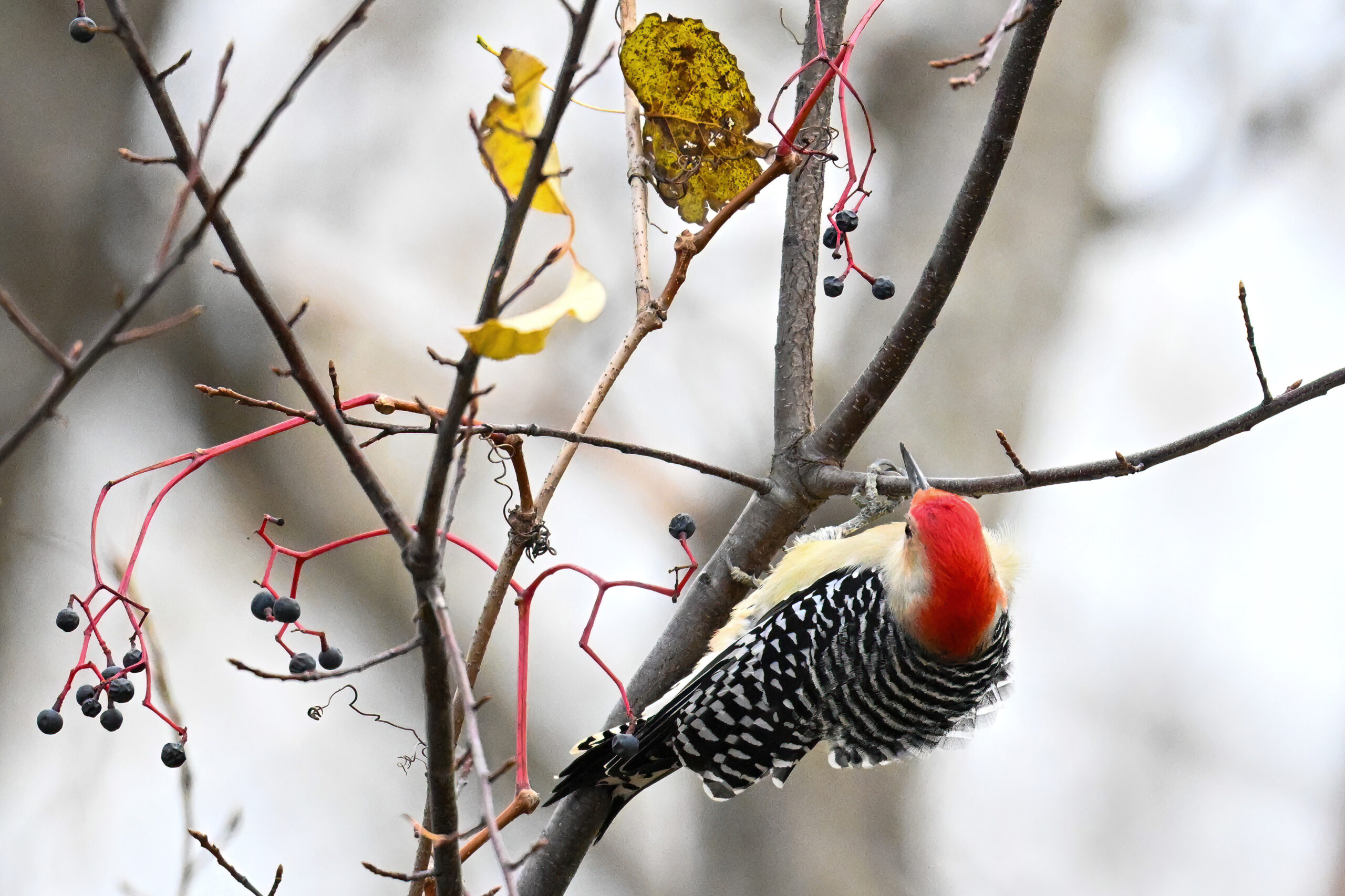 Rather awful weather in Erie County, Pennsylvania for yesterday’s Veterans’ Day holiday in the U.S. – overcast and cold with wind and snow. Nevertheless, plenty of nice bird activity for brief field operations, including this beautiful Red-bellied Woodpecker along the main entrance road at Presque Isle State Park: