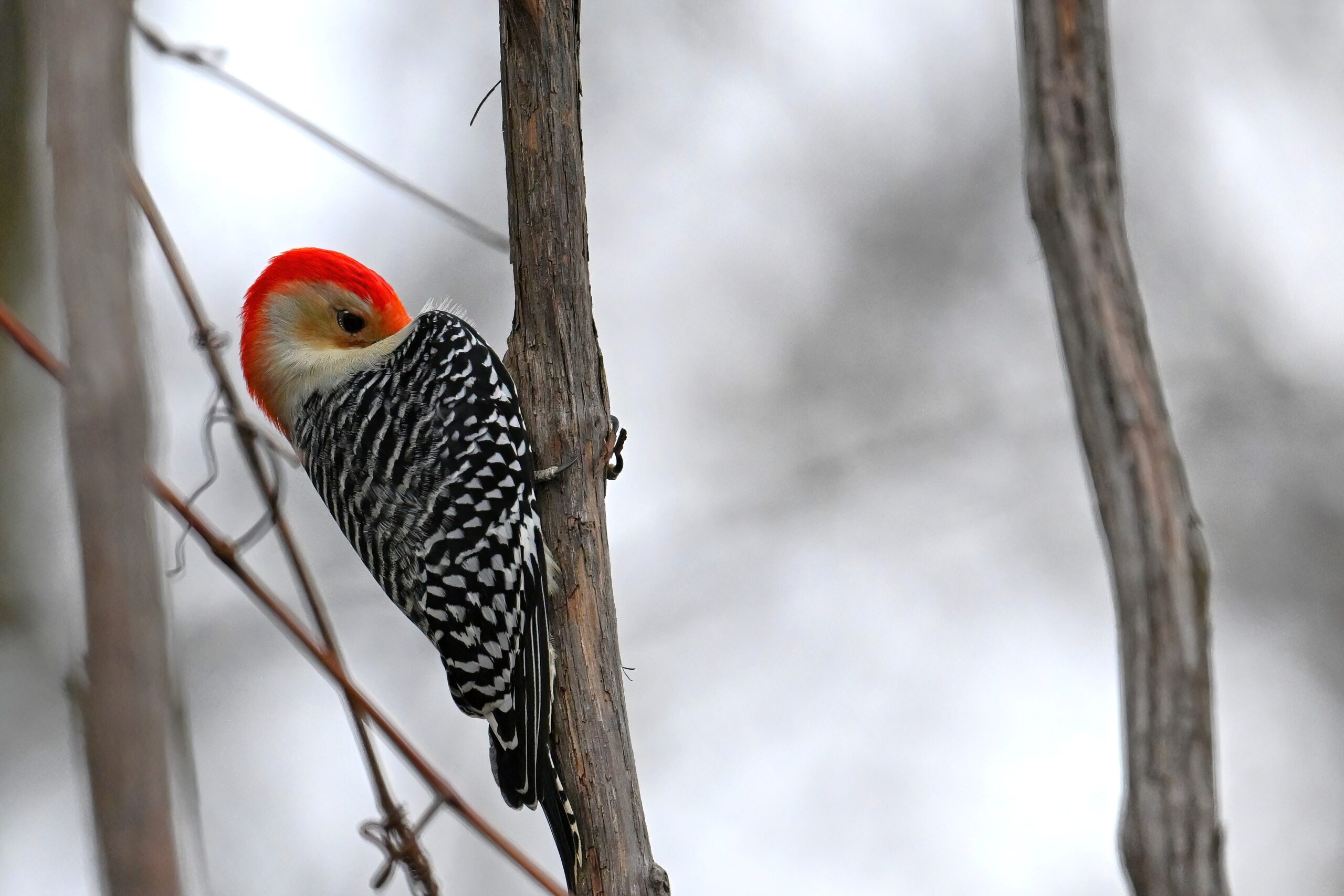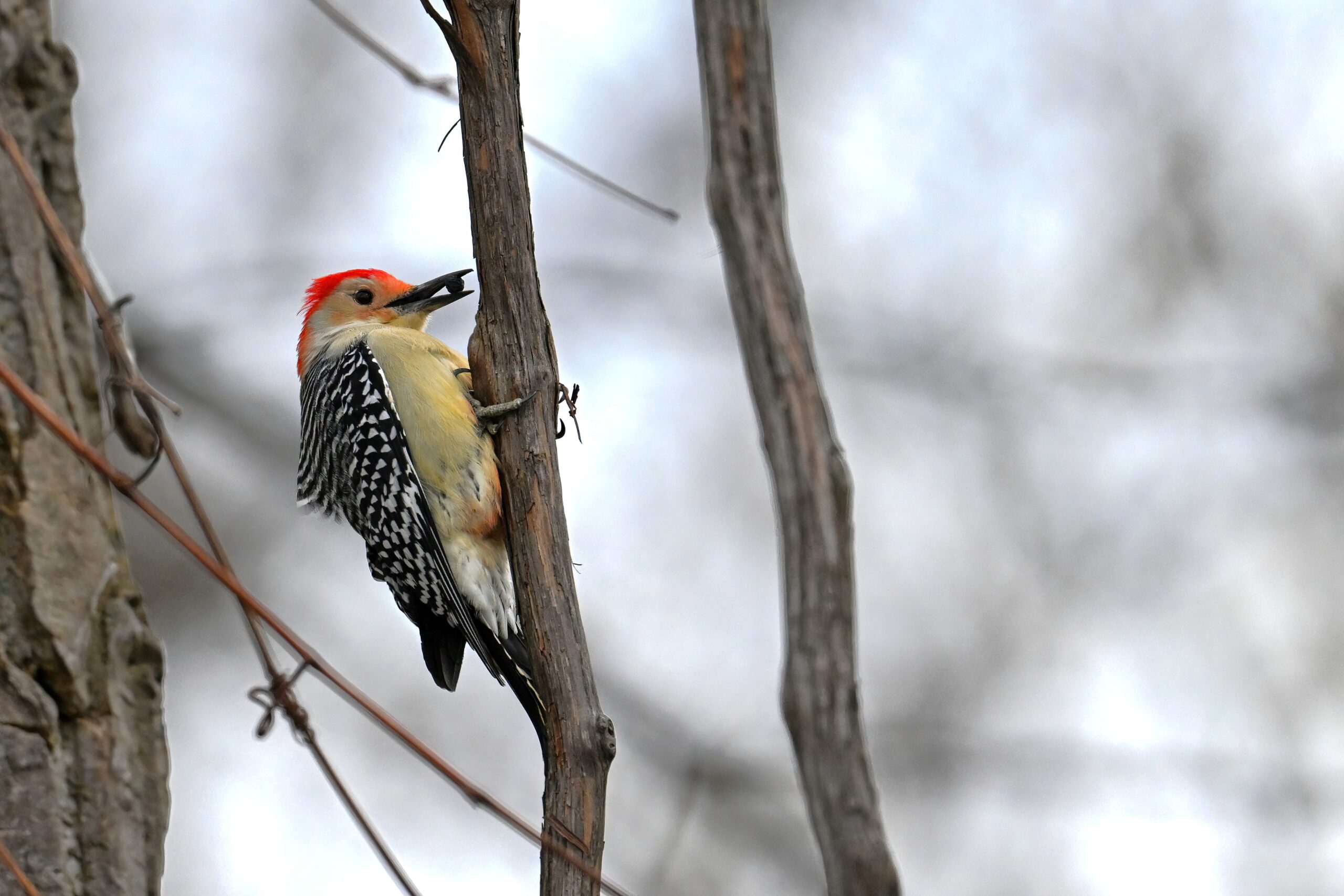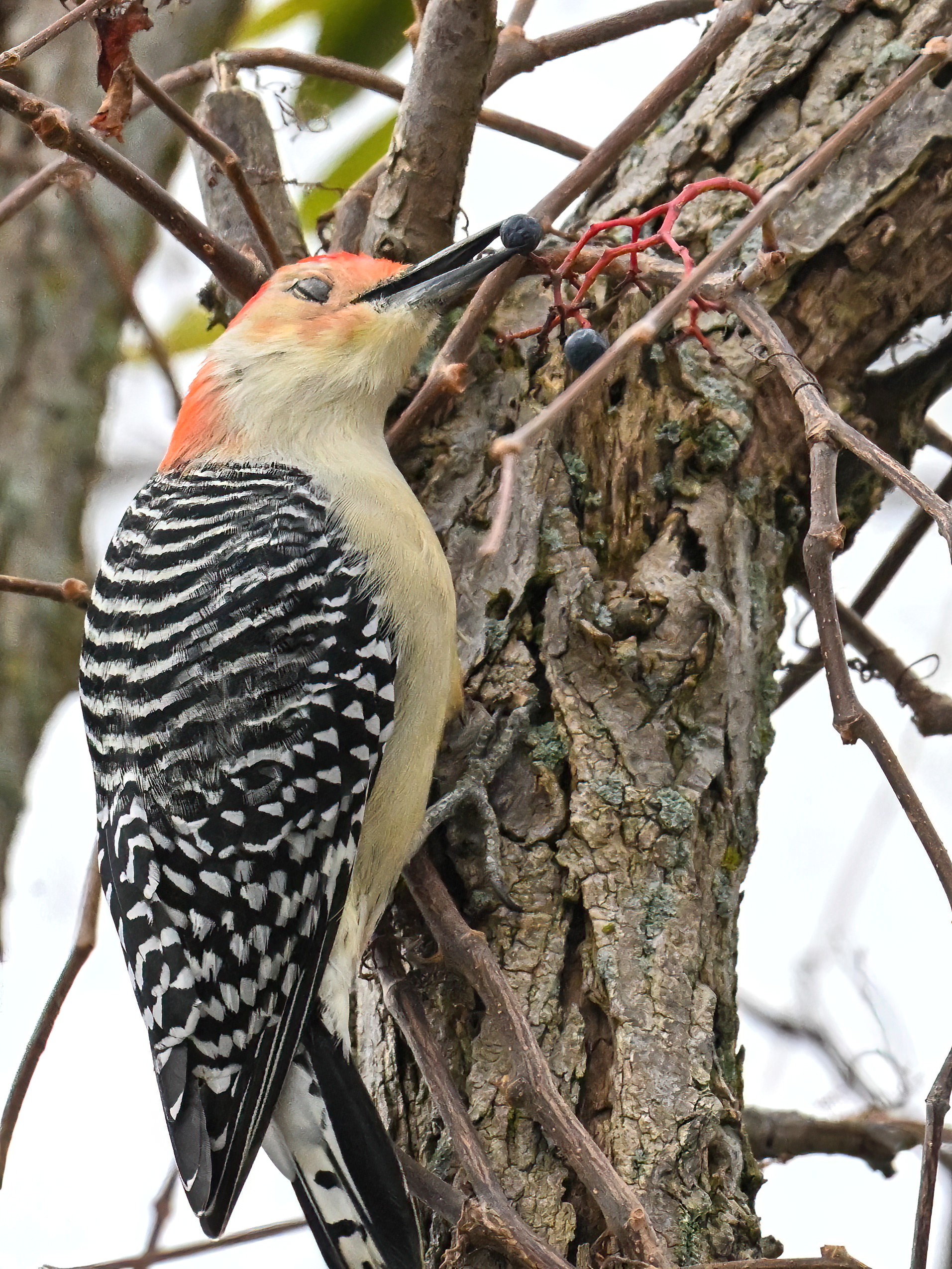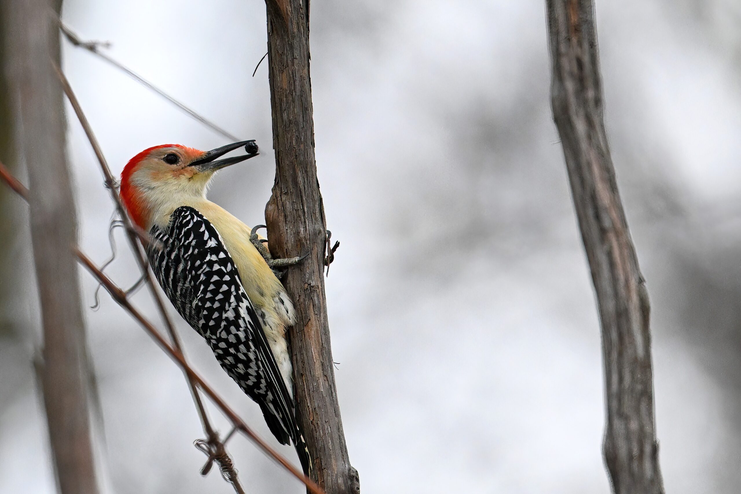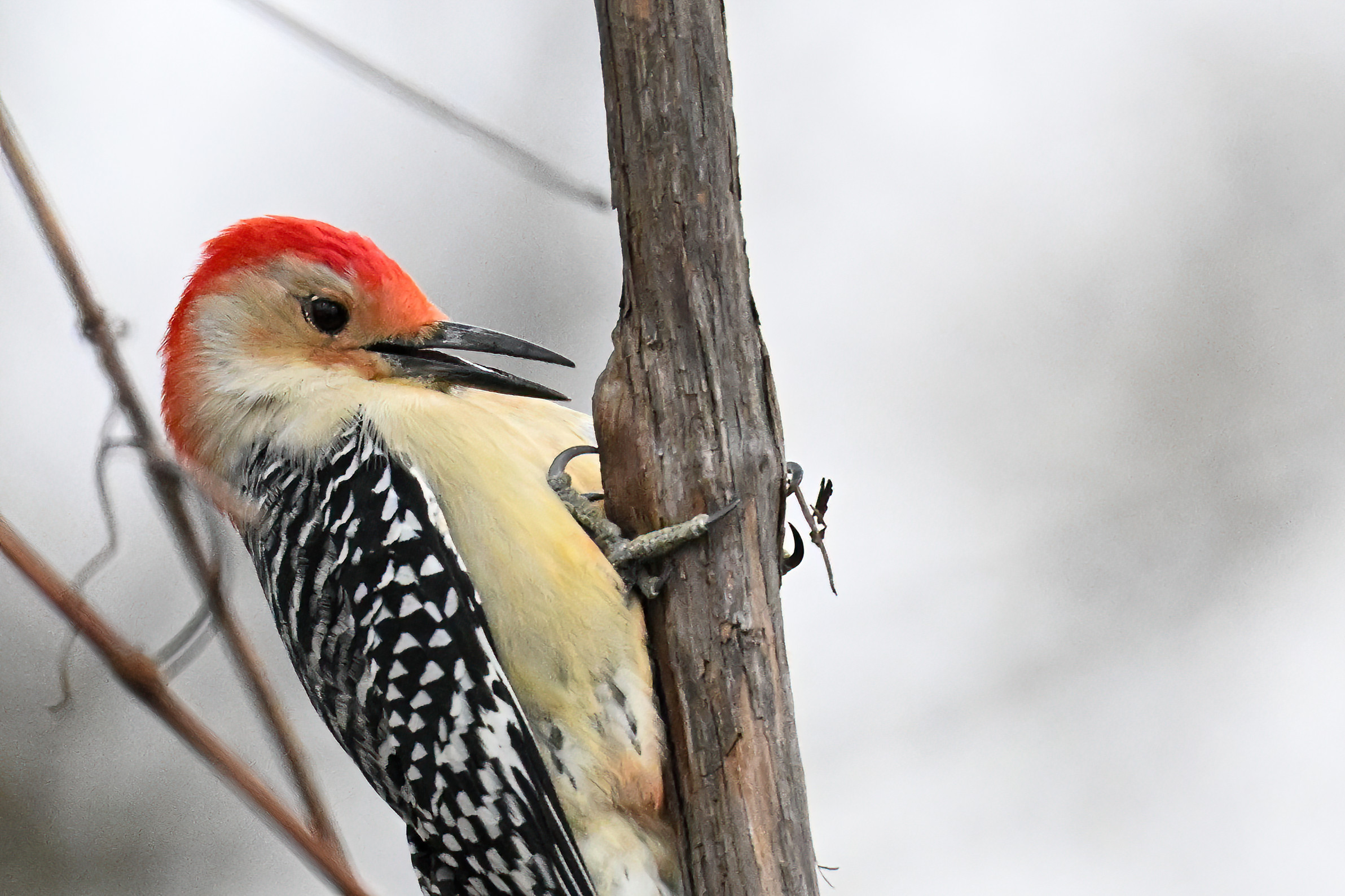 Rather awful weather in Erie County, Pennsylvania for yesterday’s Veterans’ Day holiday in the U.S. – overcast and cold with wind and snow. Nevertheless, plenty of nice bird activity for brief field operations, including this beautiful Red-bellied Woodpecker along the main entrance road at Presque Isle State Park: