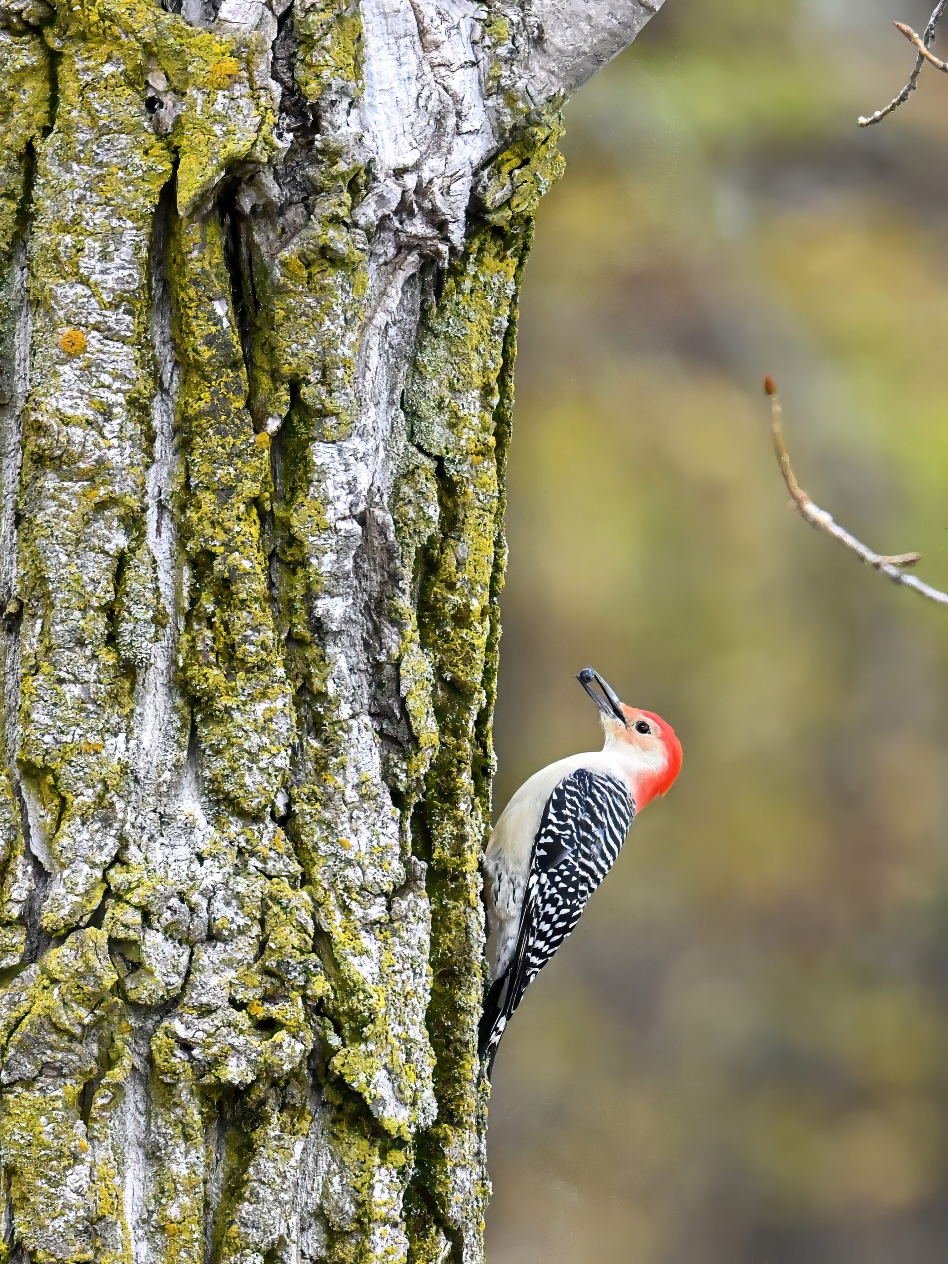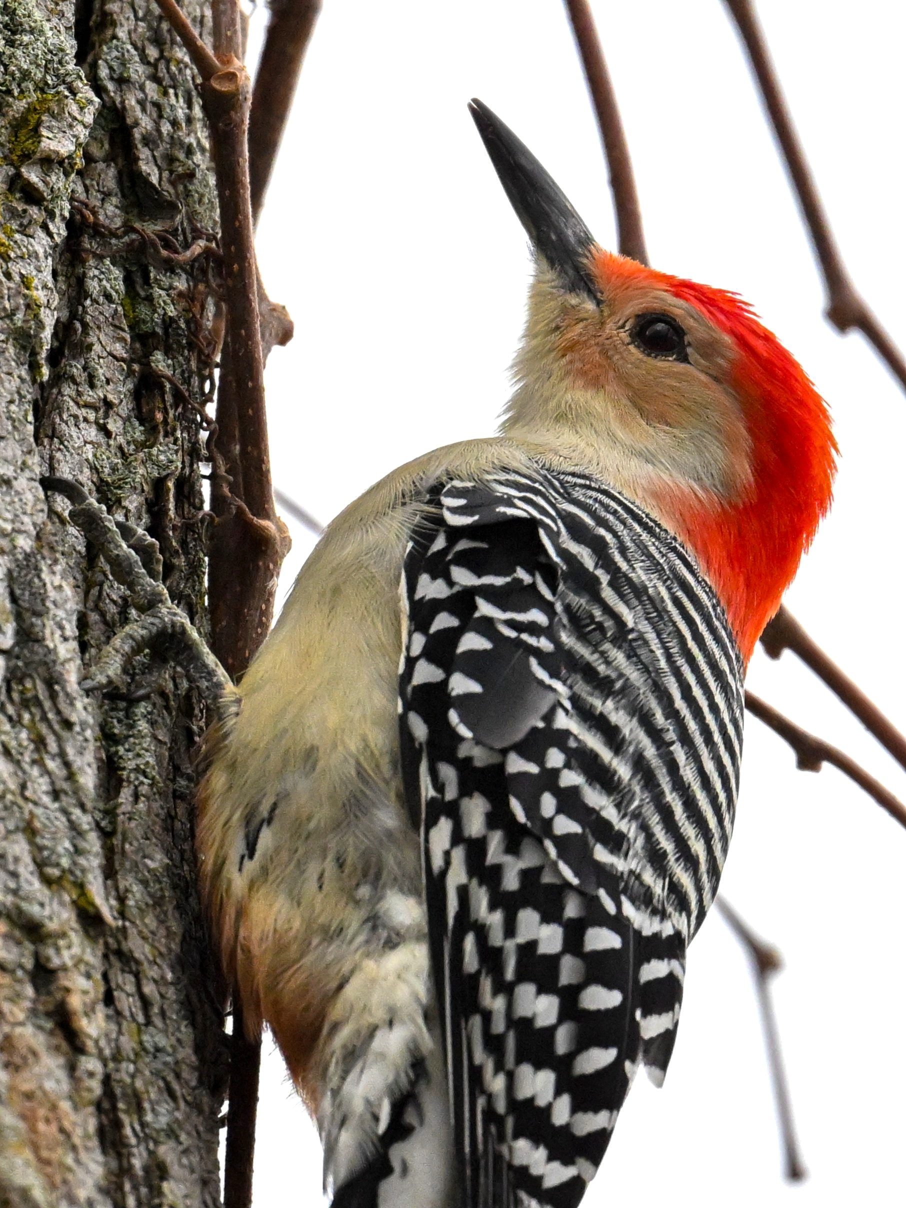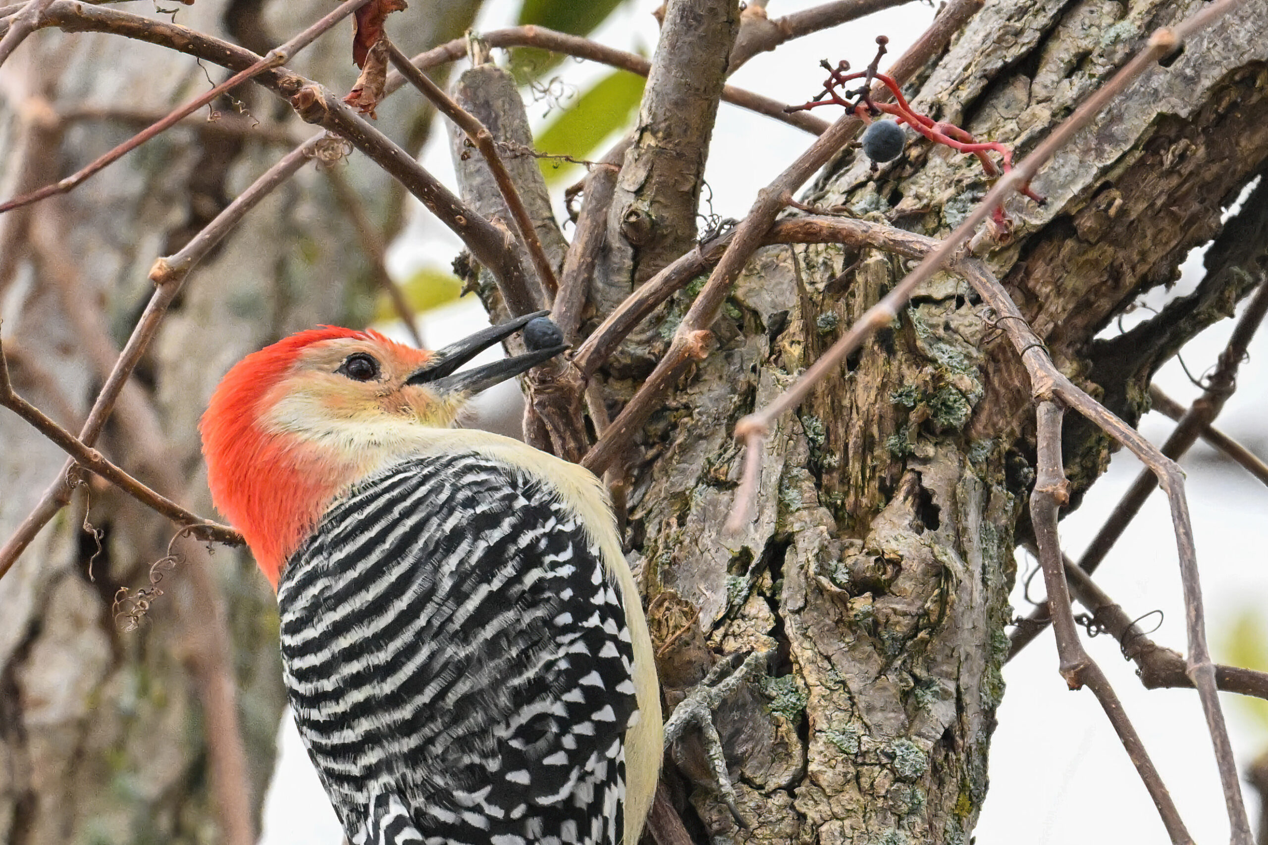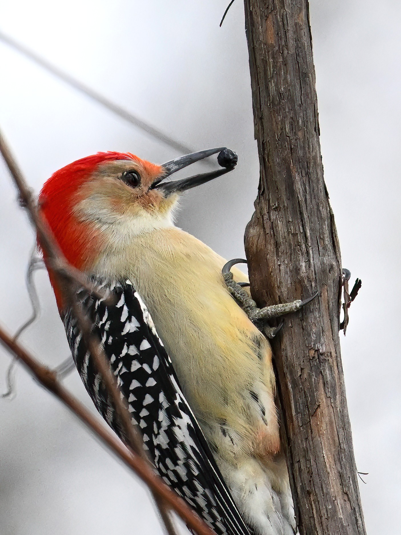 Rather awful weather in Erie County, Pennsylvania for yesterday’s Veterans’ Day holiday in the U.S. – overcast and cold with wind and snow. Nevertheless, plenty of nice bird activity for brief field operations, including this beautiful Red-bellied Woodpecker along the main entrance road at Presque Isle State Park: