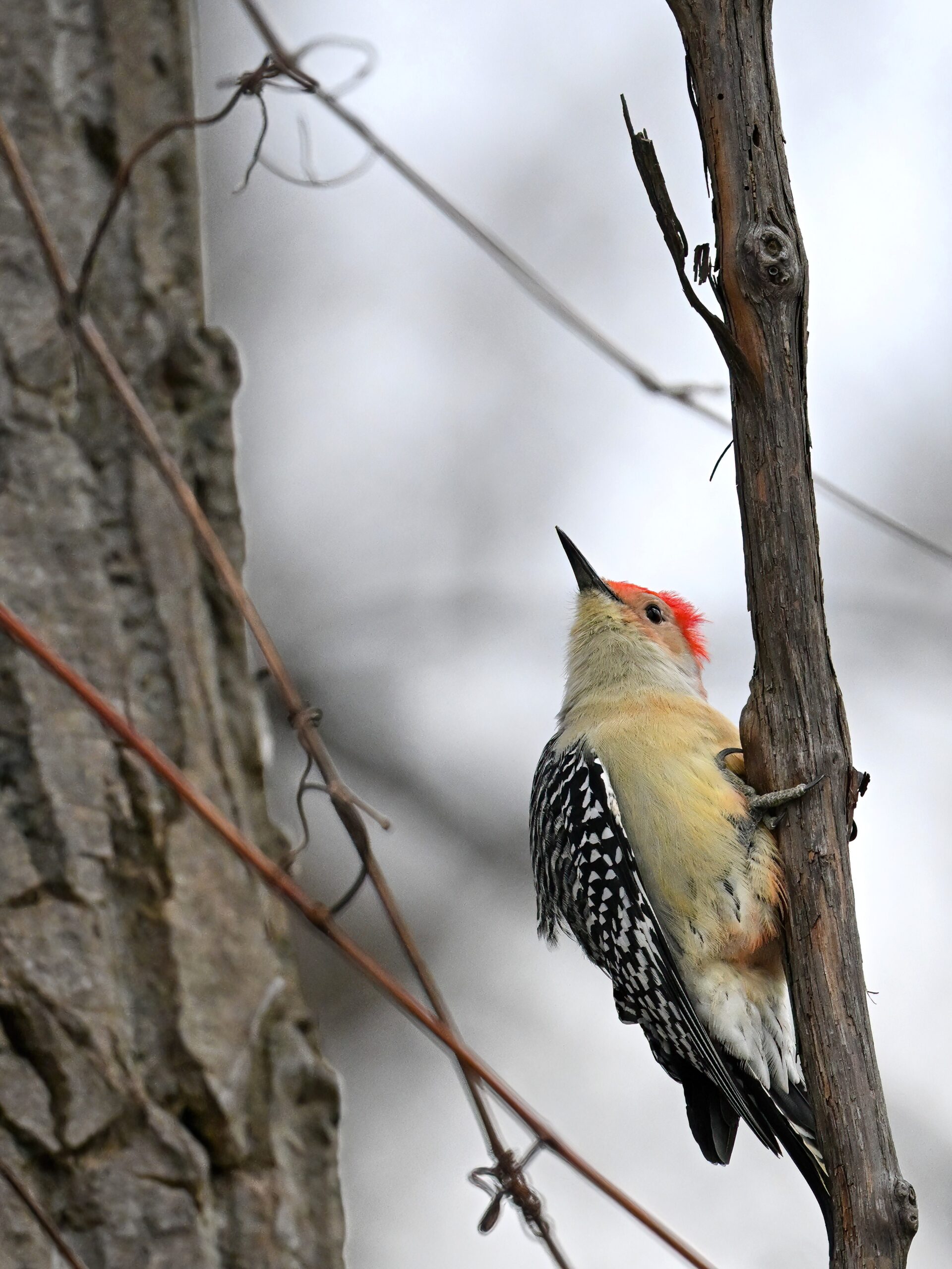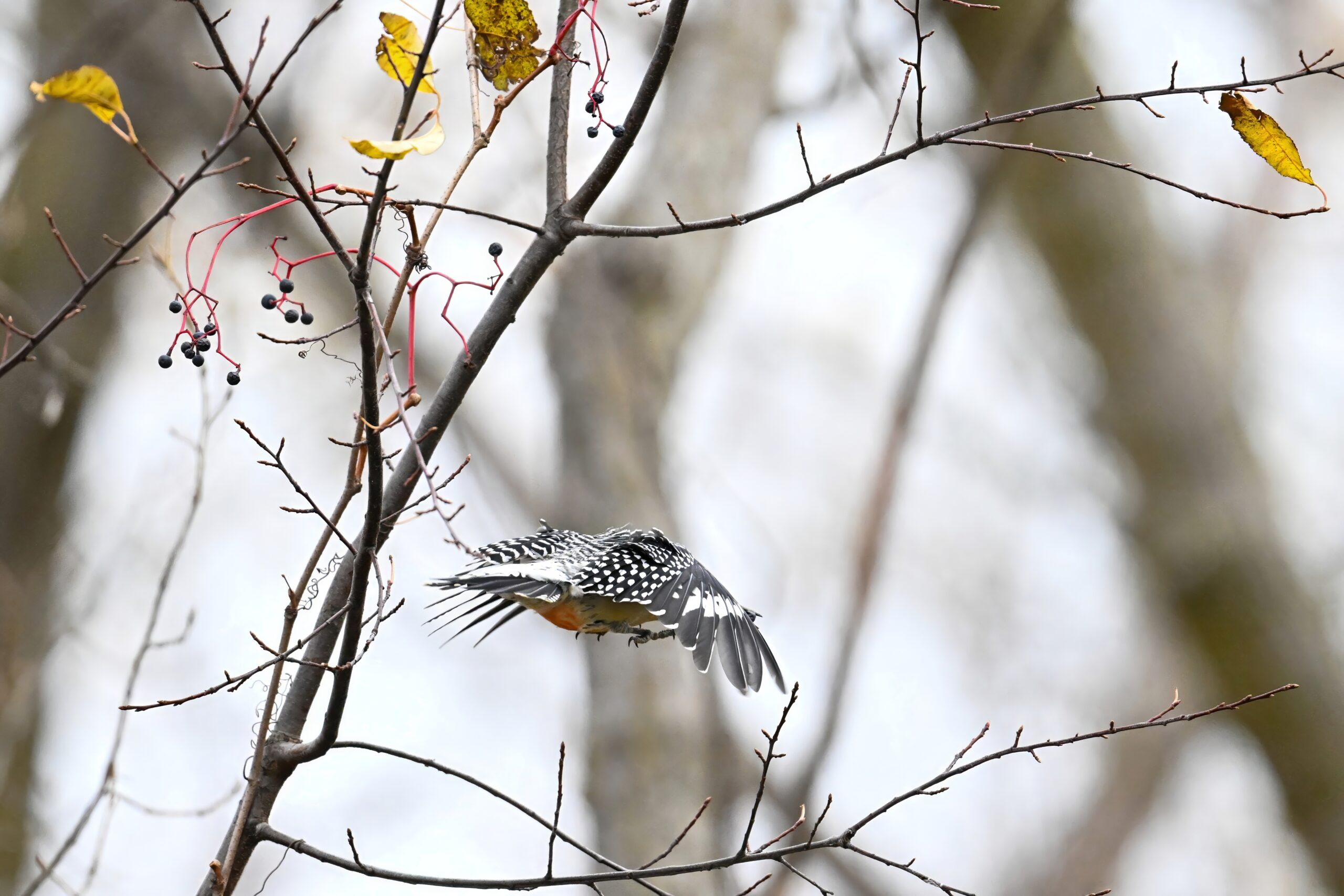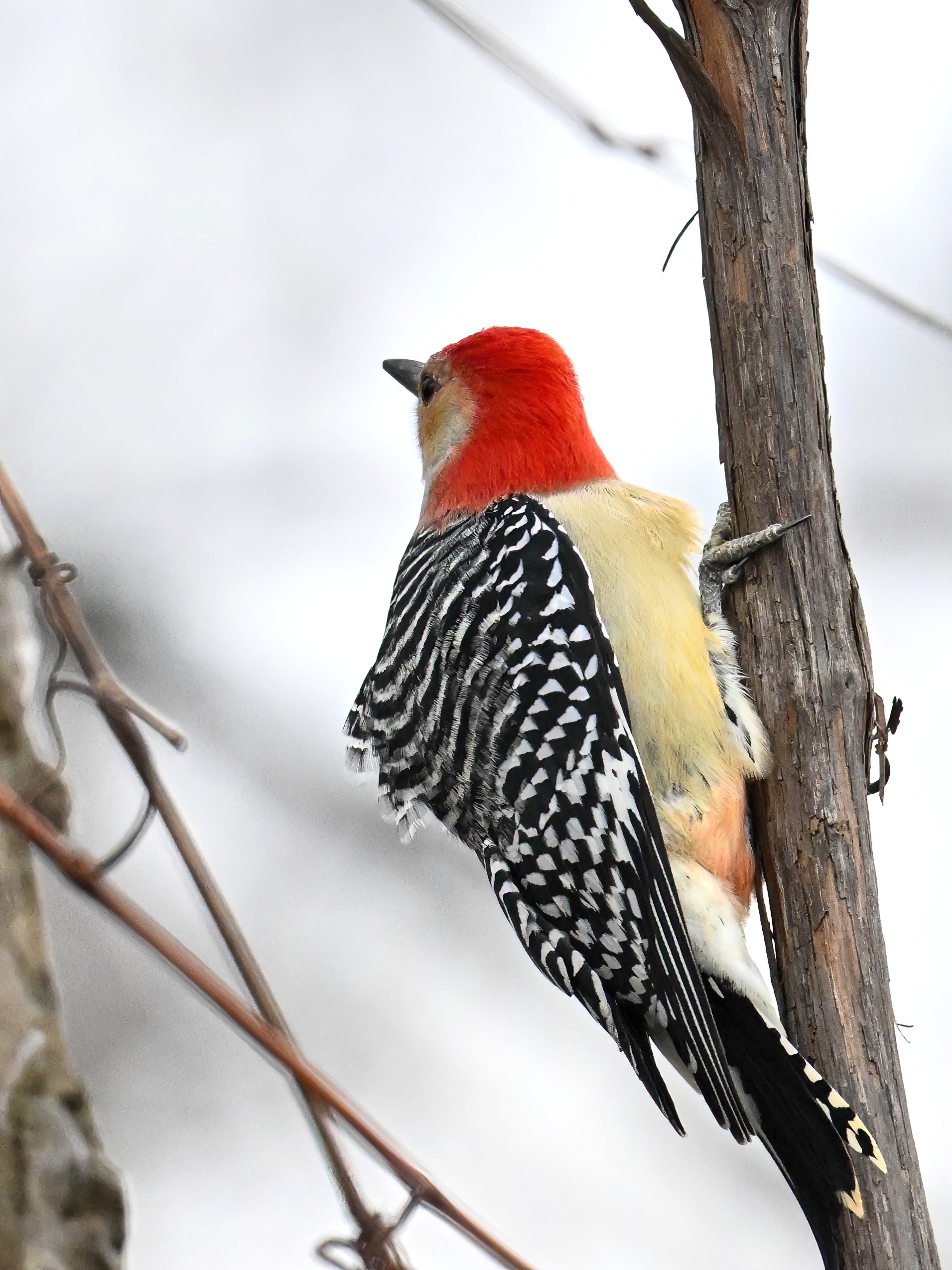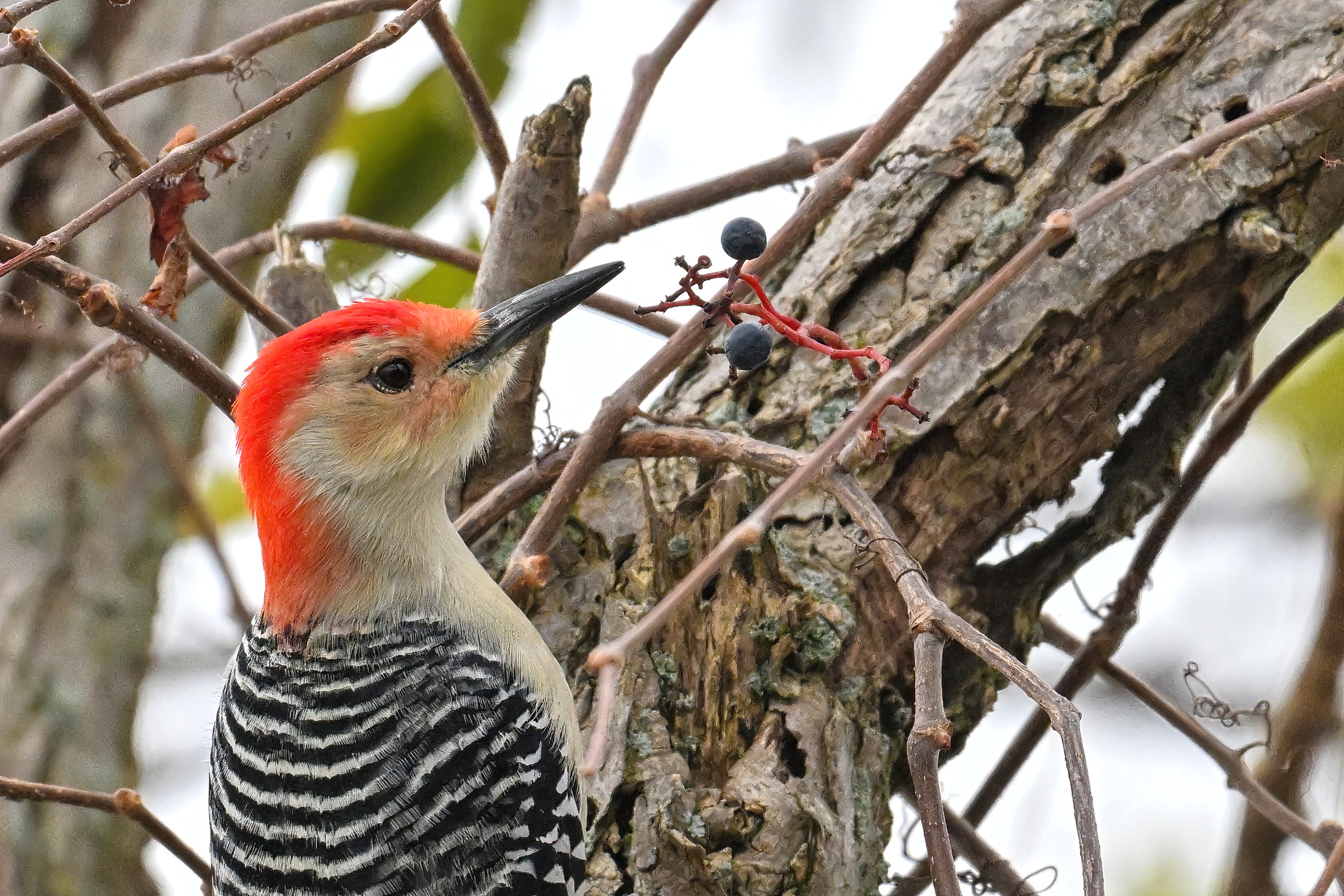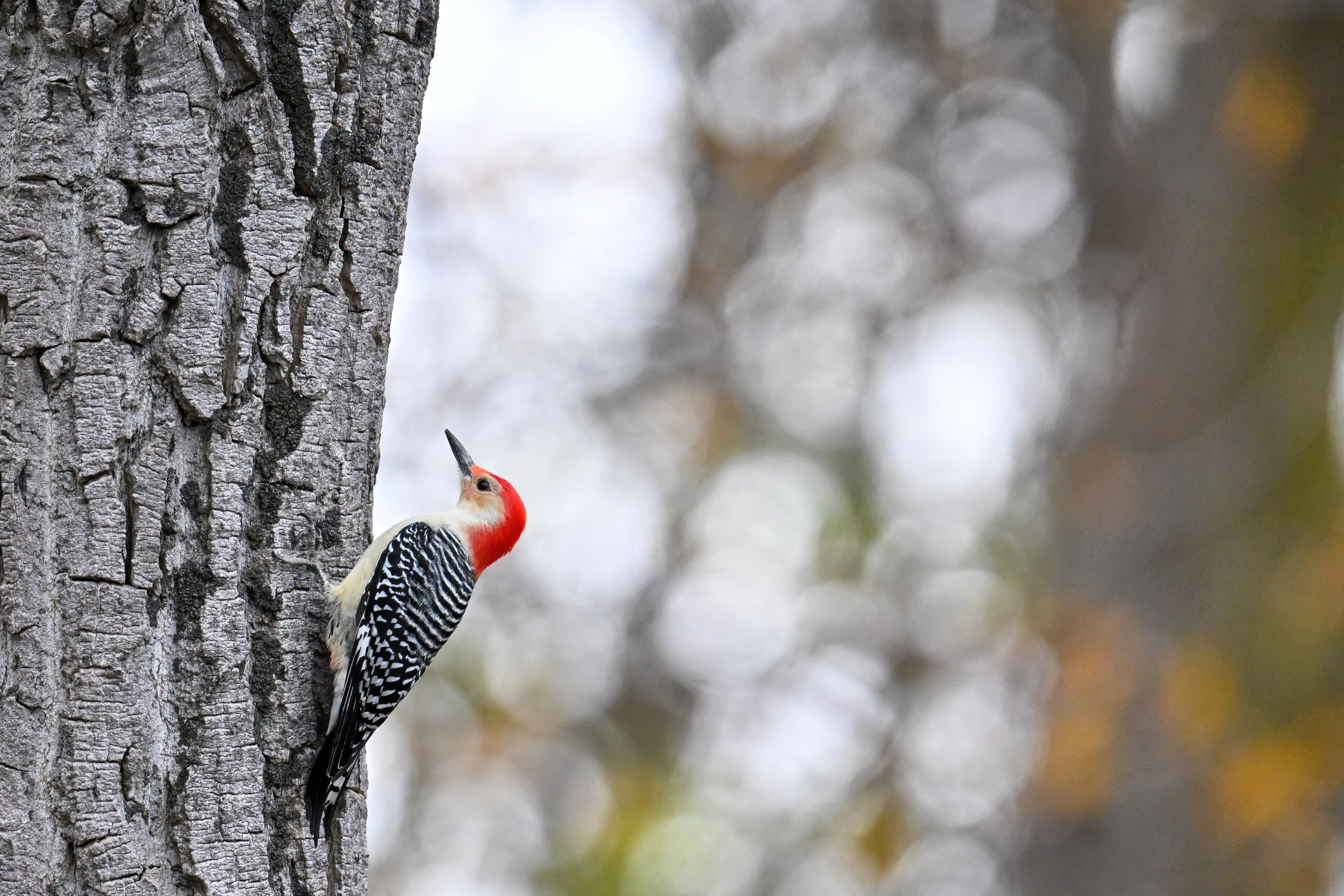 Rather awful weather in Erie County, Pennsylvania for yesterday’s Veterans’ Day holiday in the U.S. – overcast and cold with wind and snow. Nevertheless, plenty of nice bird activity for brief field operations, including this beautiful Red-bellied Woodpecker along the main entrance road at Presque Isle State Park: