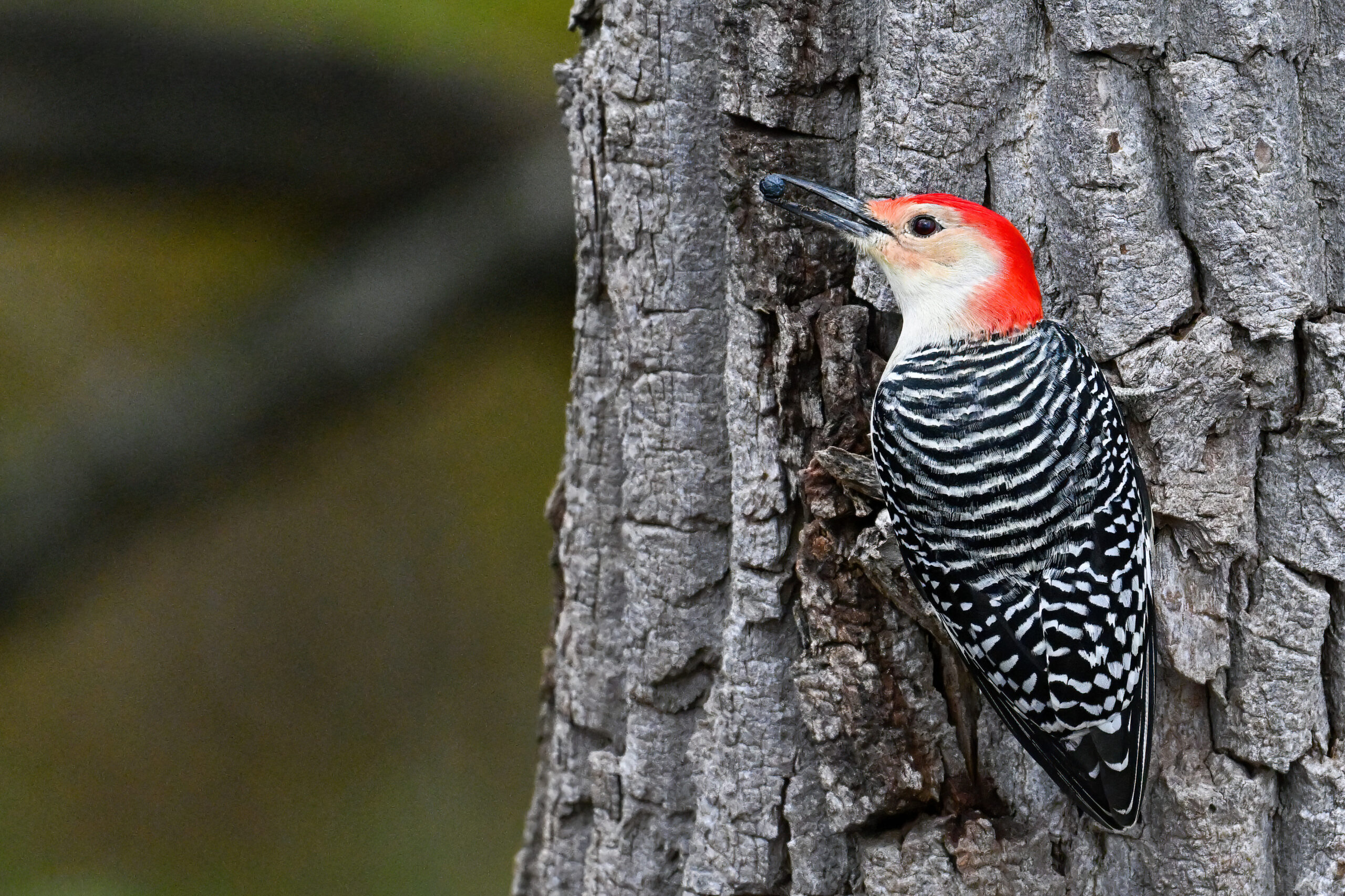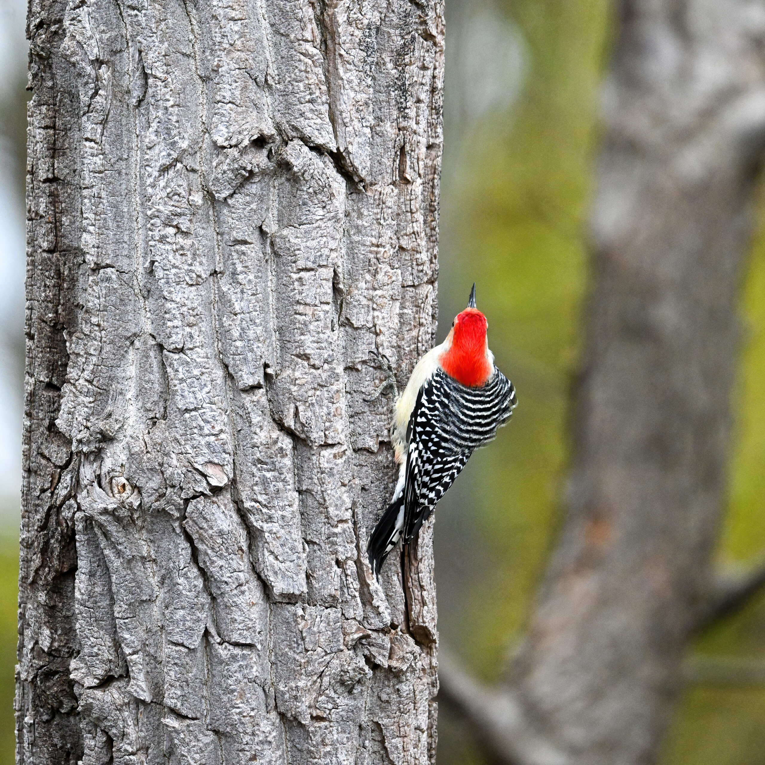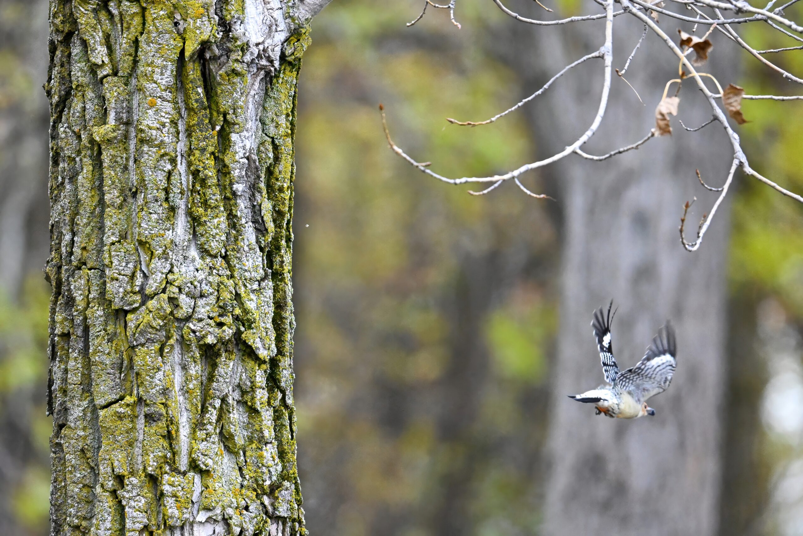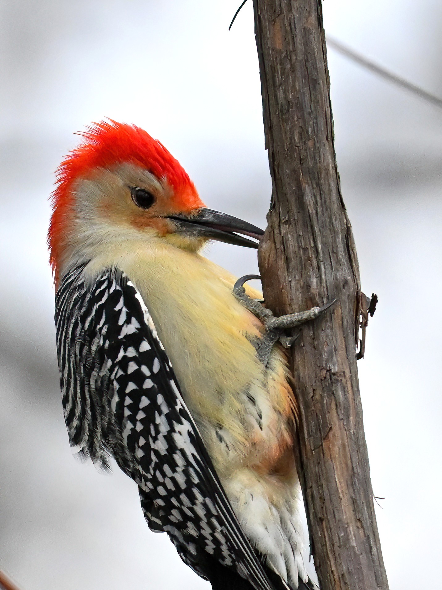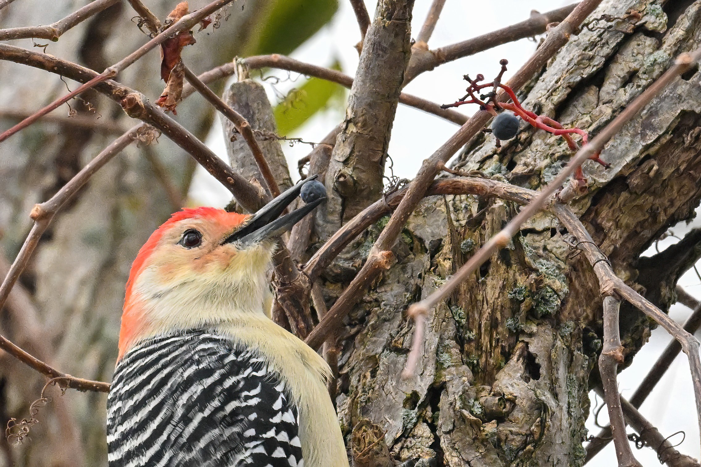 Rather awful weather in Erie County, Pennsylvania for yesterday’s Veterans’ Day holiday in the U.S. – overcast and cold with wind and snow. Nevertheless, plenty of nice bird activity for brief field operations, including this beautiful Red-bellied Woodpecker along the main entrance road at Presque Isle State Park: