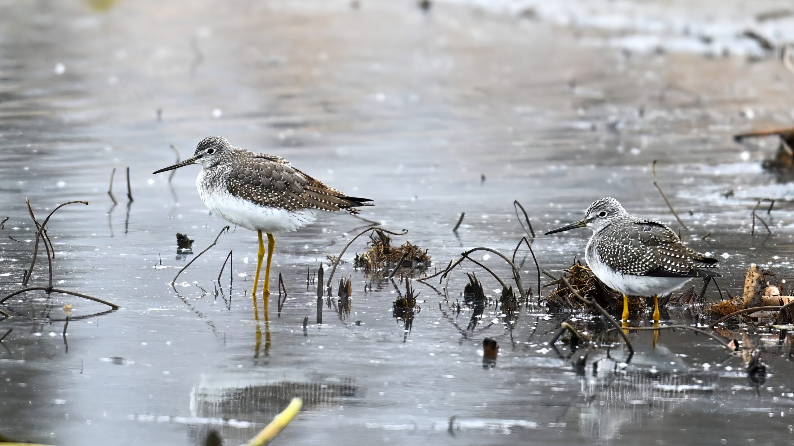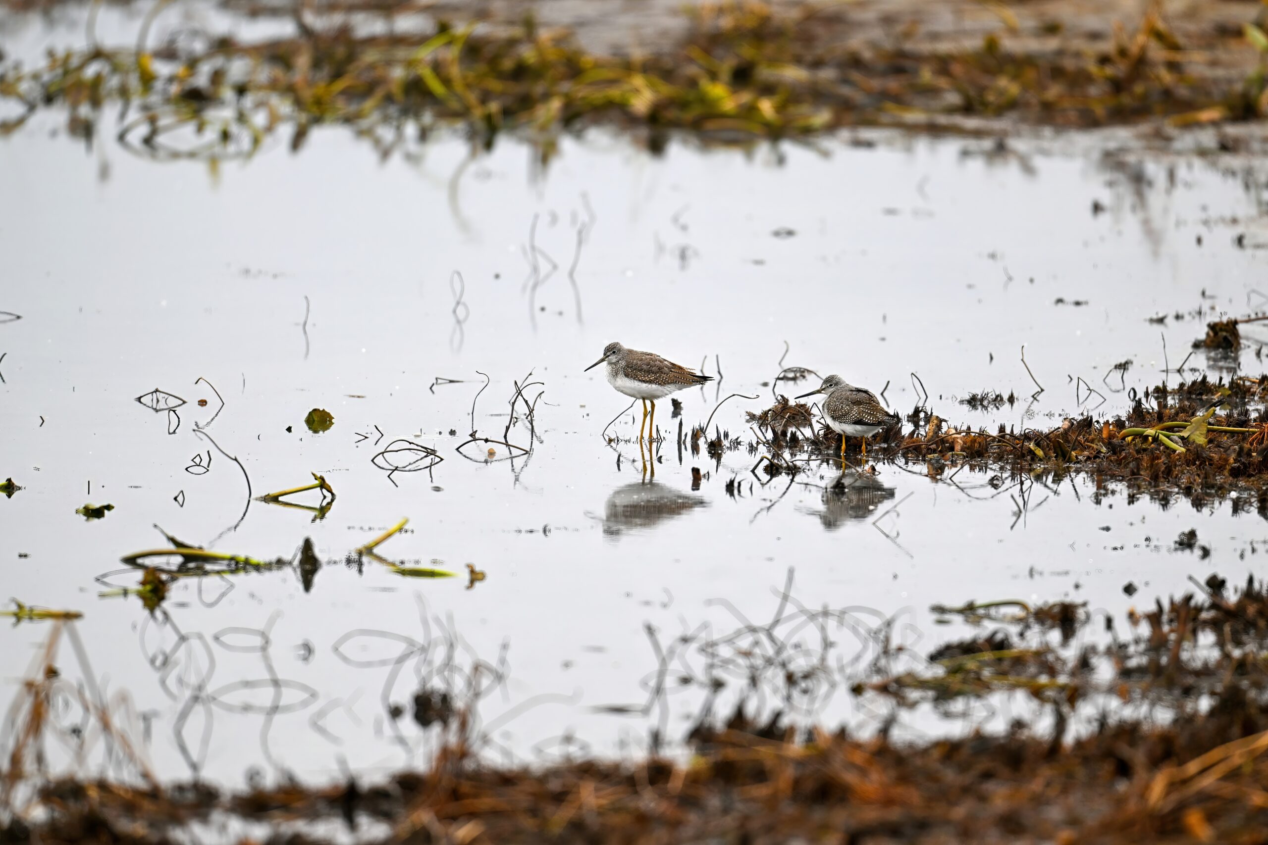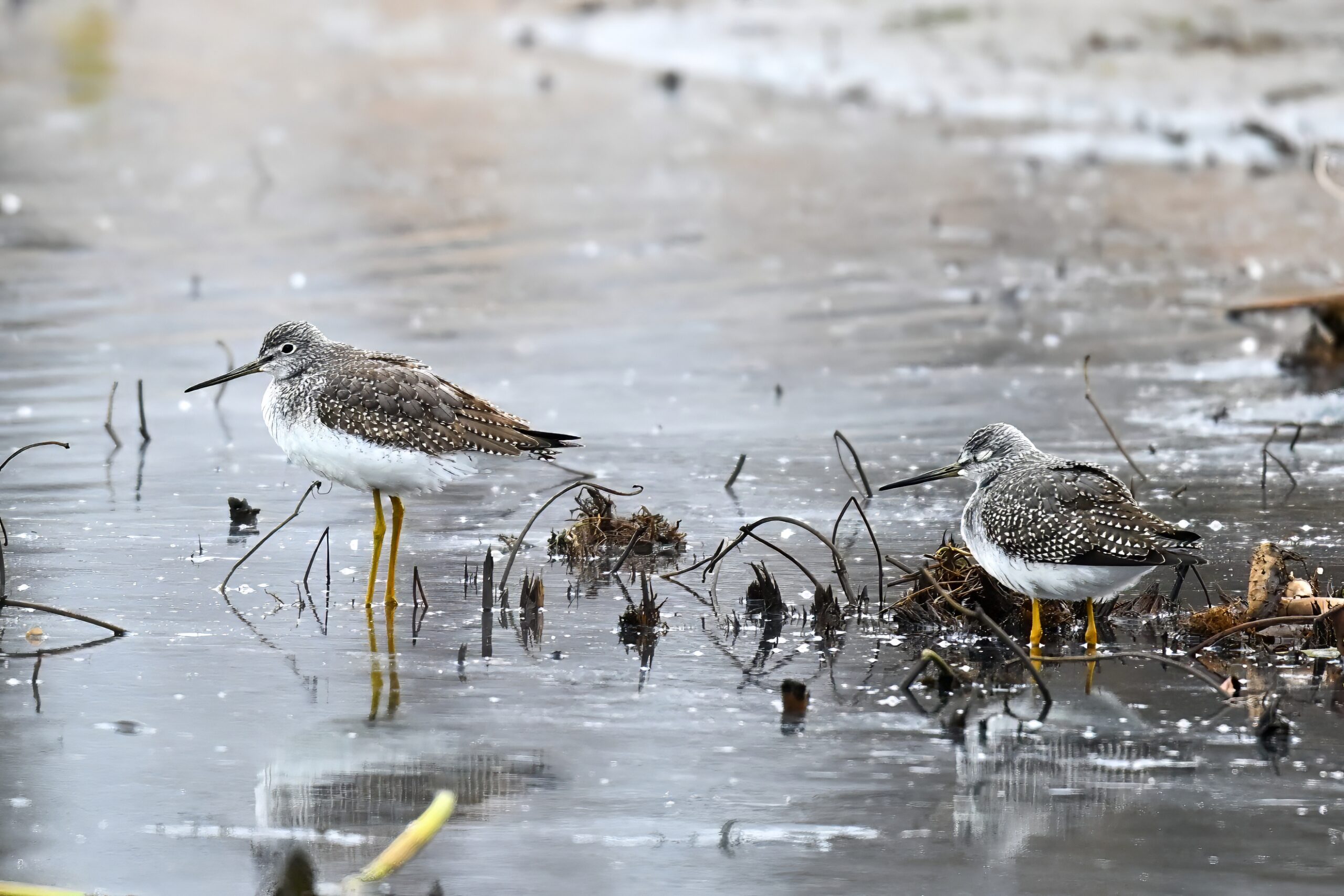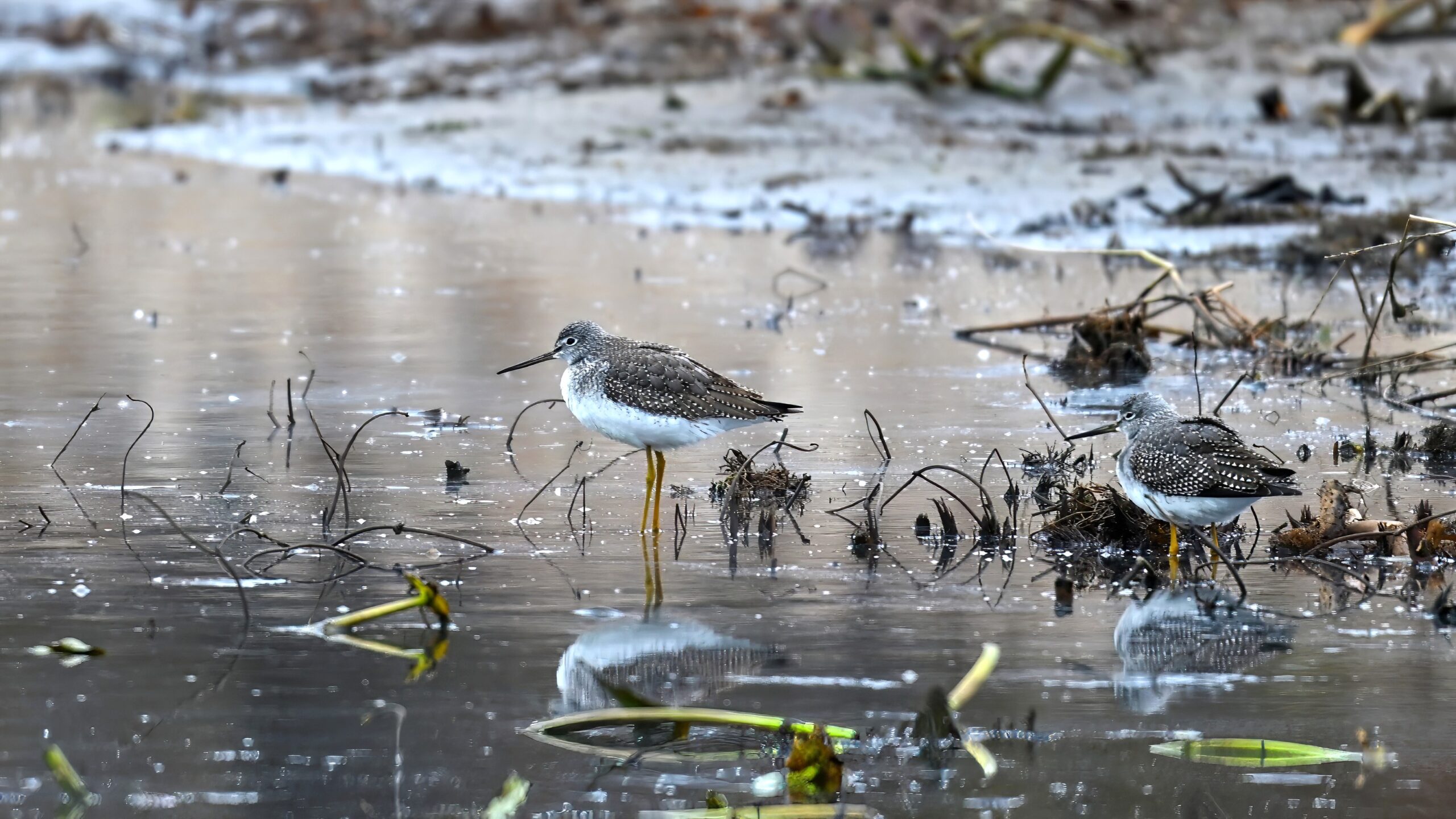 Luckily, these Yellowlegs vocalized loudly, otherwise wouldn’t have known they were around (hard to spot against the mottled/muddy shoreline). Also, best way (vocal ID w/ the Merlin app) to distinguish from Lesser Yellowlegs.