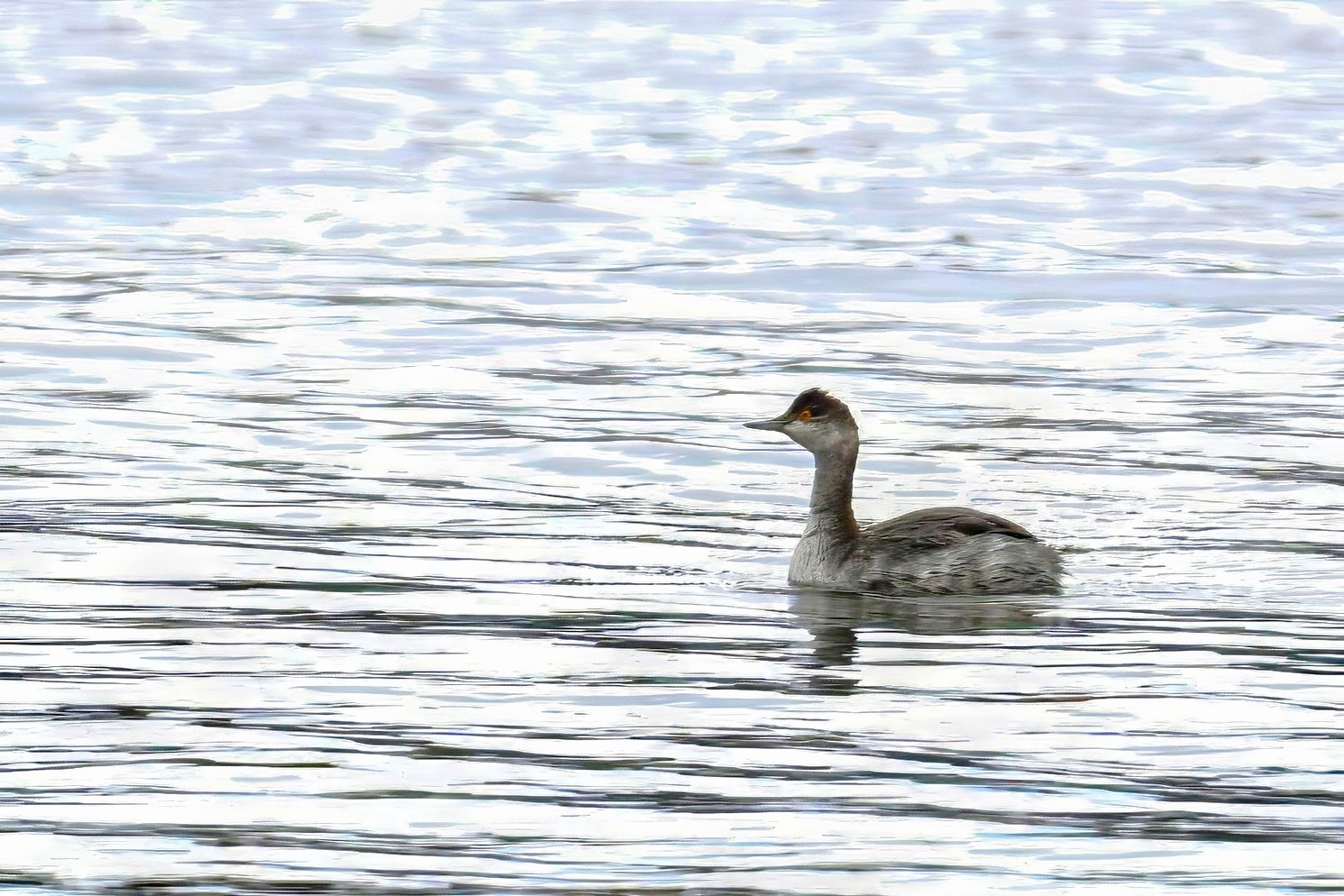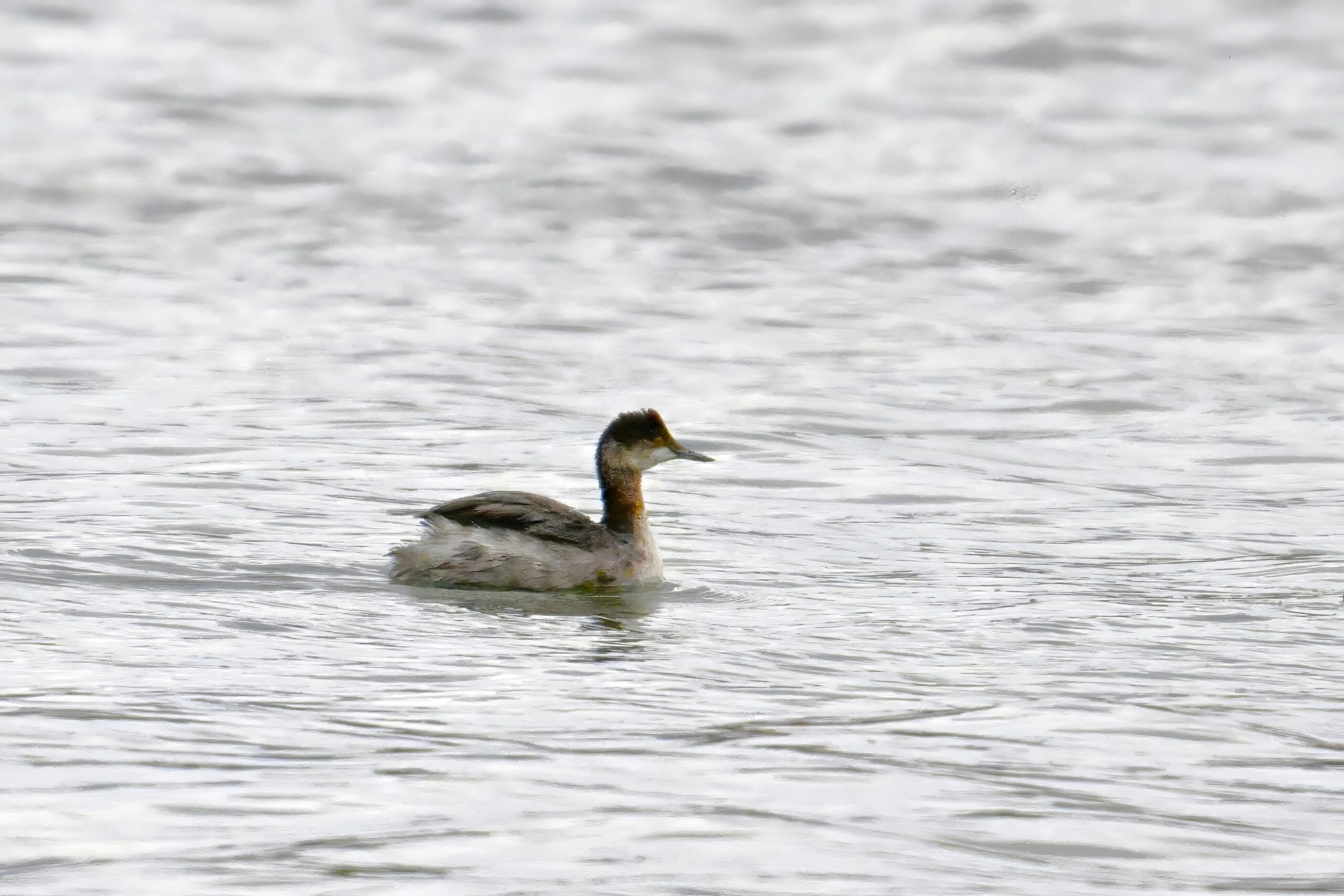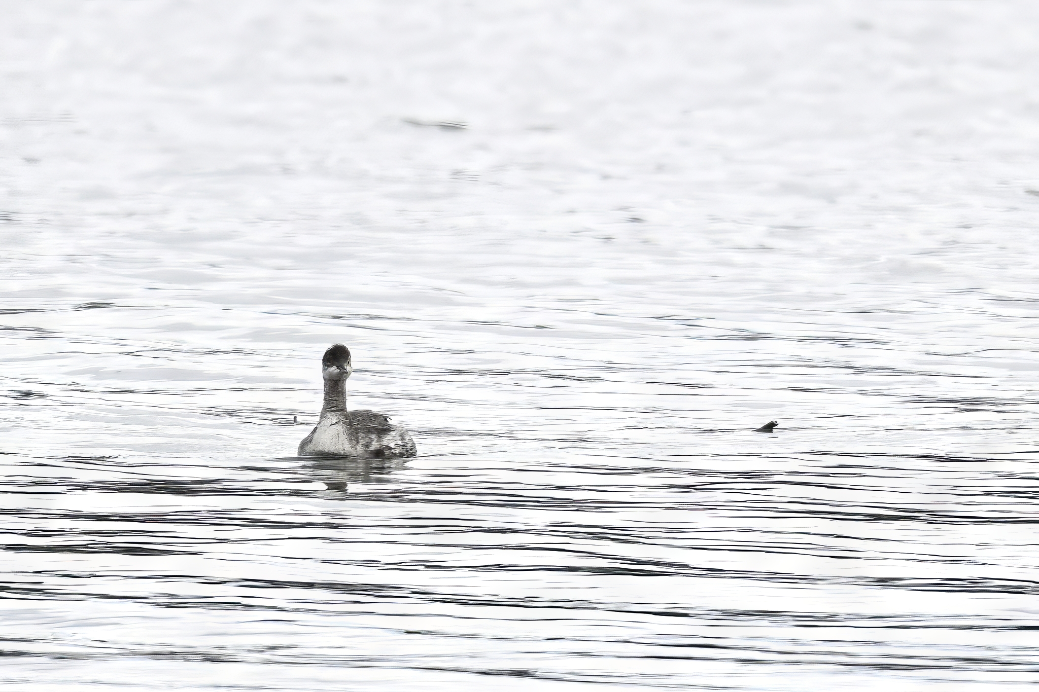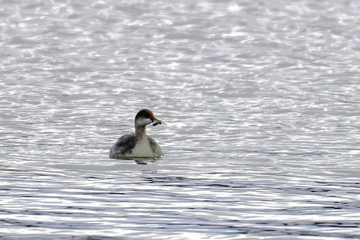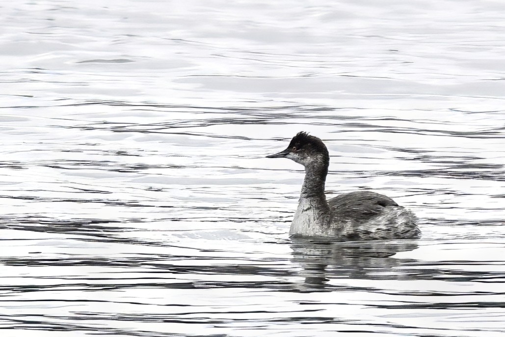 Big bird news at Presque Isle State Park this week was the prolonged visit of a rare (at this location) Eared Grebe (Podiceps nigricollis) off Leo’s Landing. ID tips @ non-breeding plumage: gray neck, steep forehead, smudgy cheek, and small/pointy/dark bill; lacks the white-tipped bill and clearly demarcated cap/cheek line of more common Horned Grebe. These rather bad pictures taken under cloudy/rainy/snowy/dark conditions: