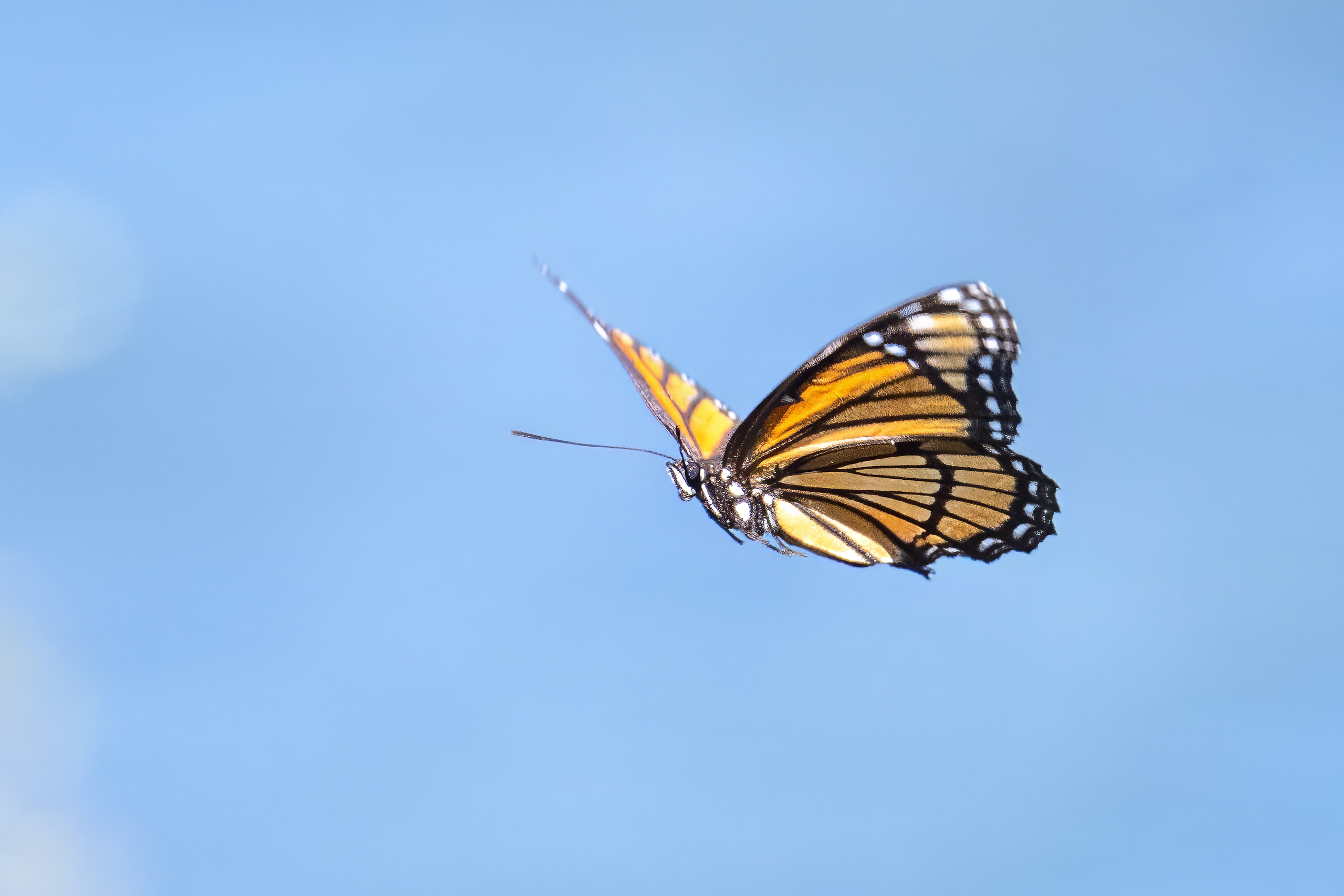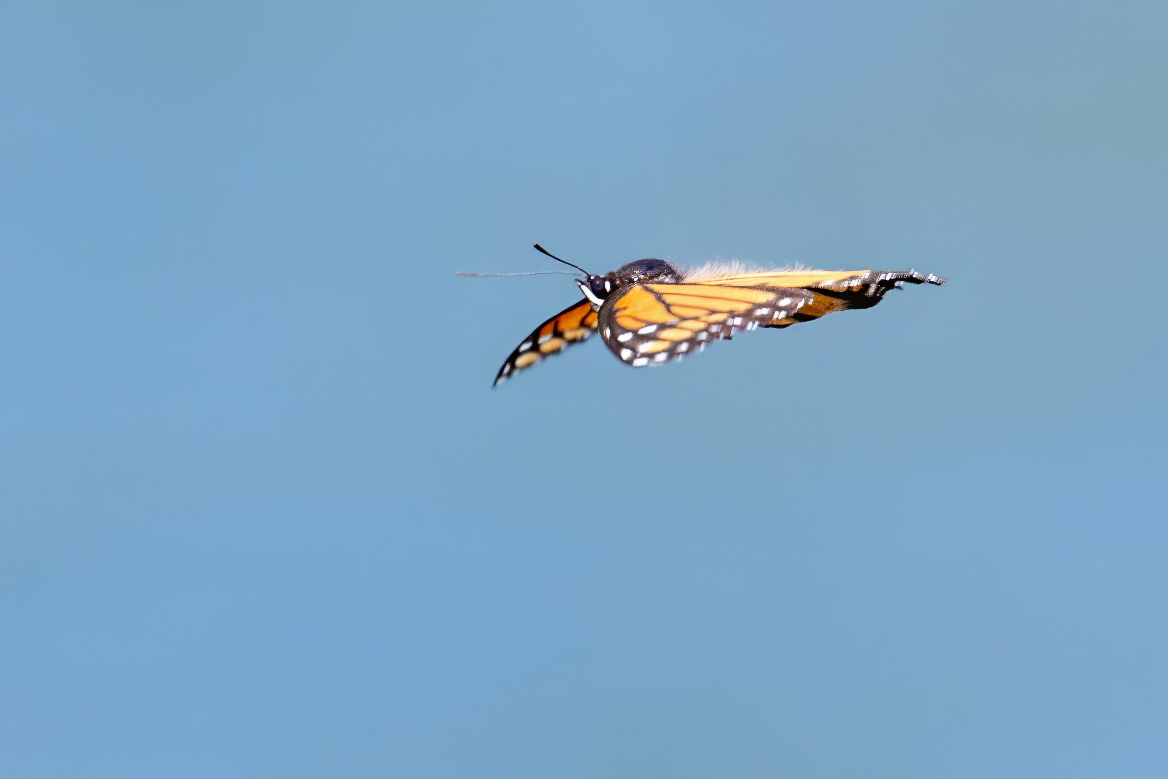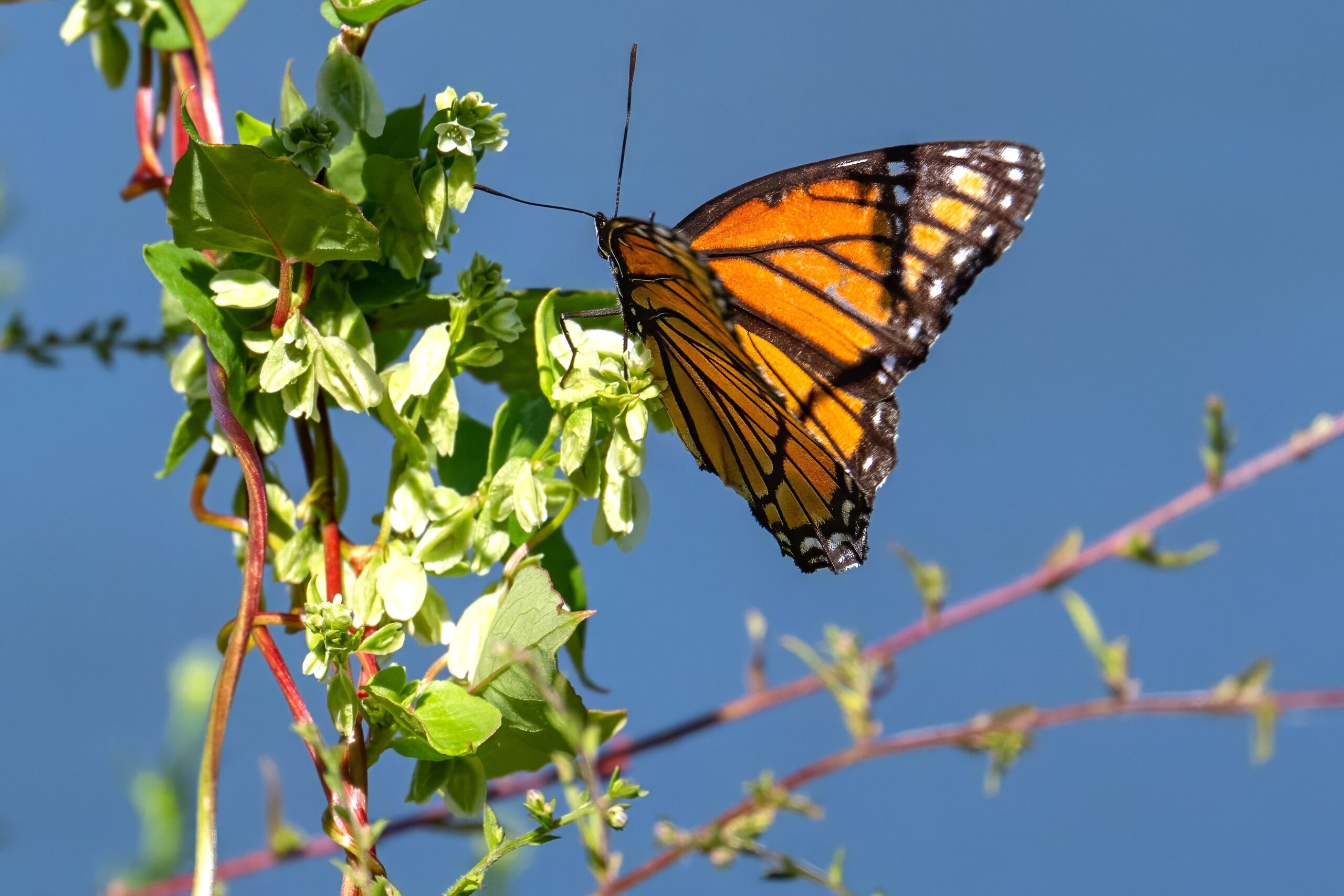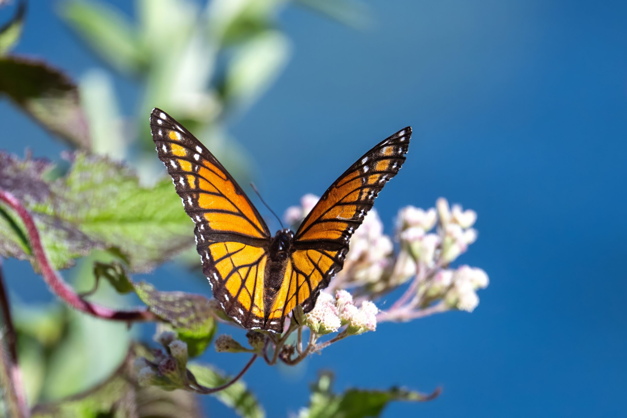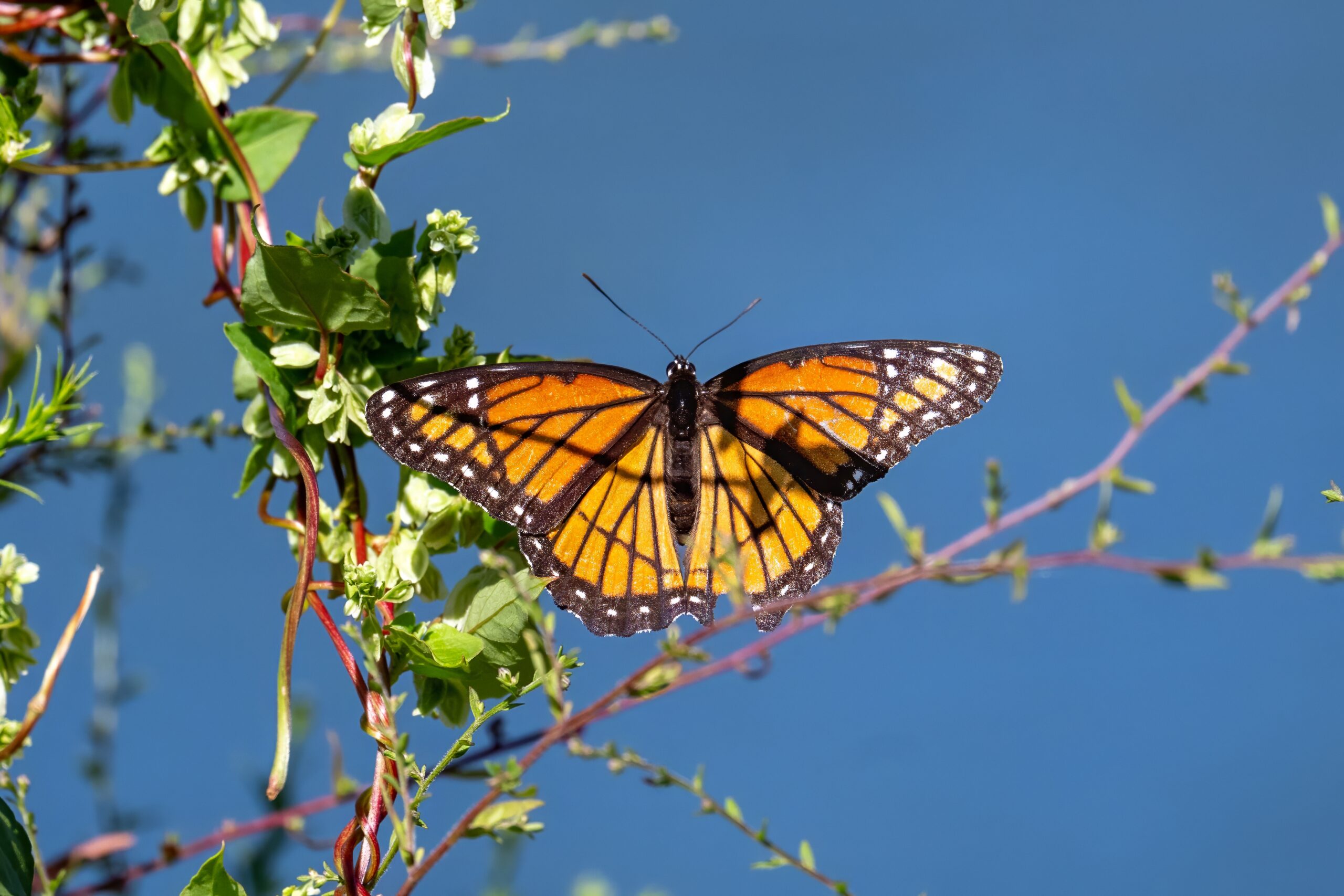 ID tips: Monarch has copious white spotting on the head and thorax (front part of main body) that Viceroy lacks; Monarch larger in size.