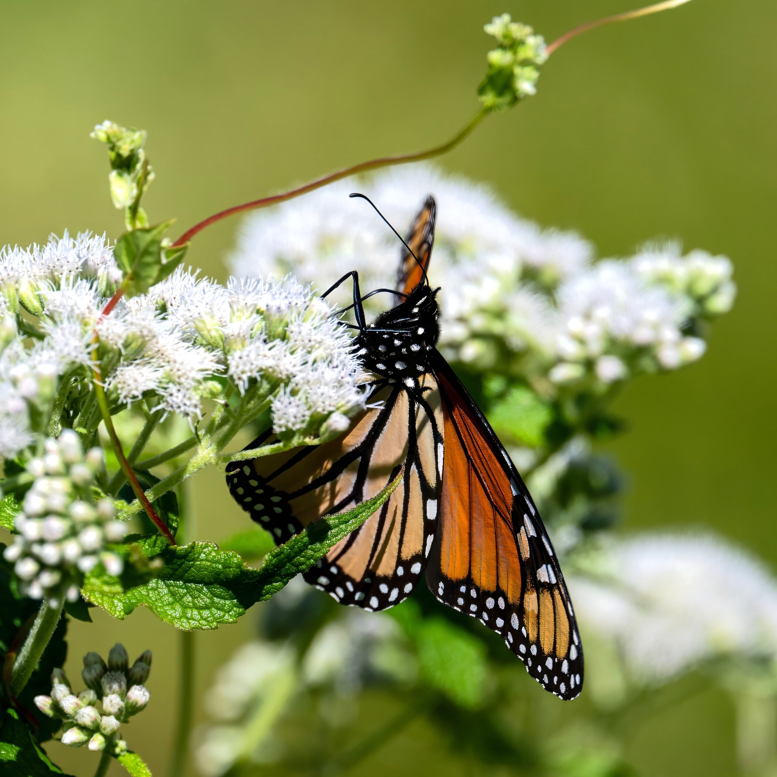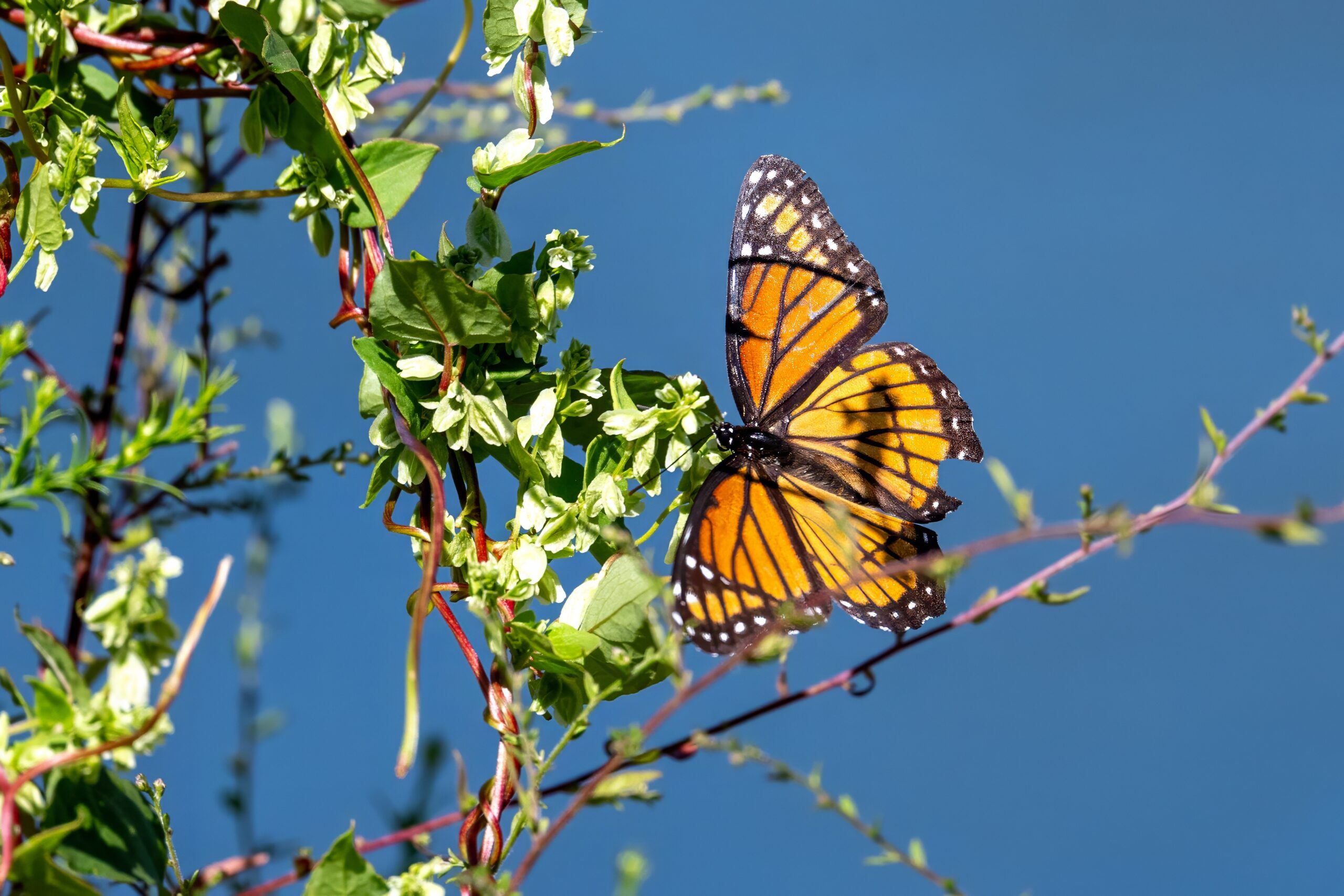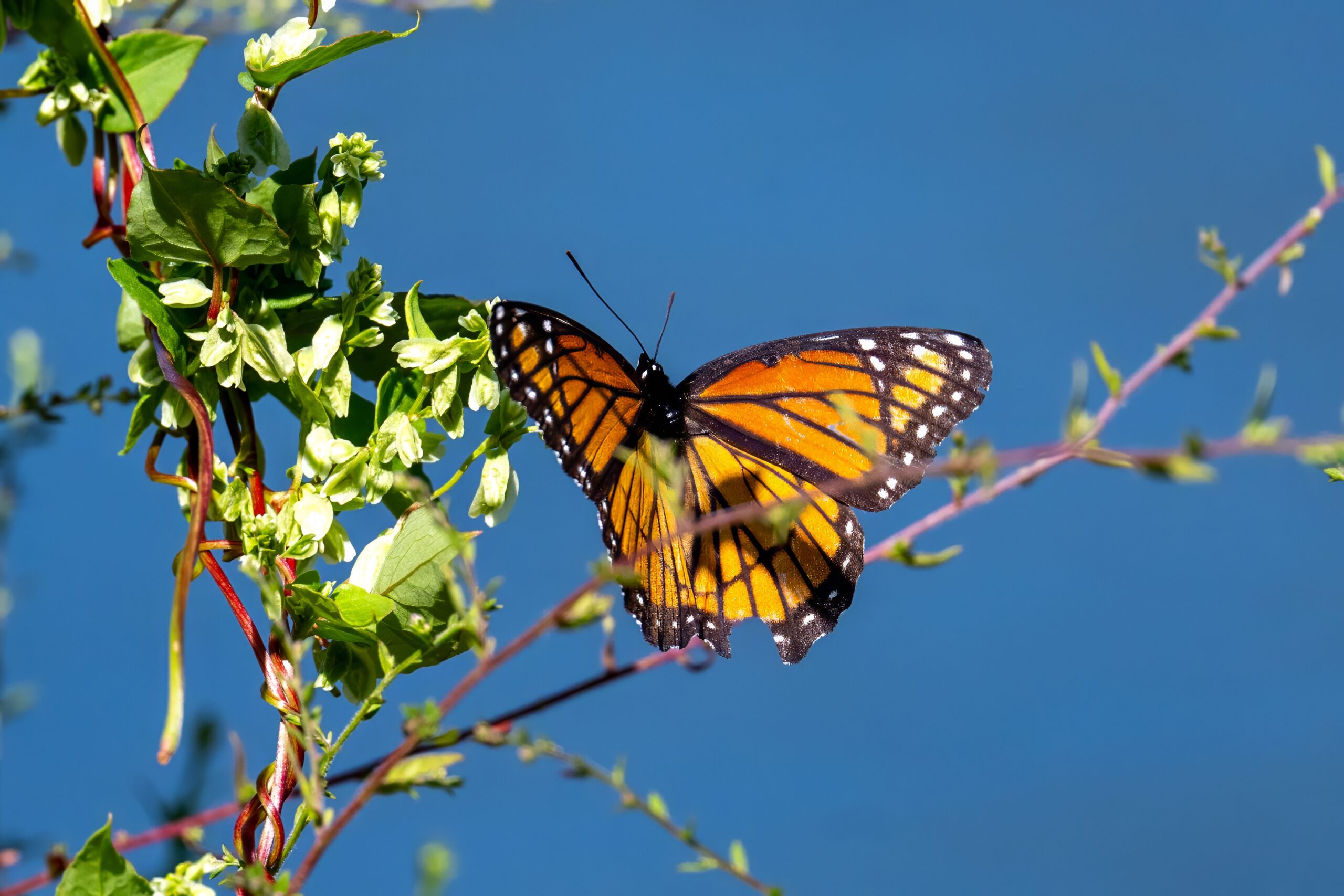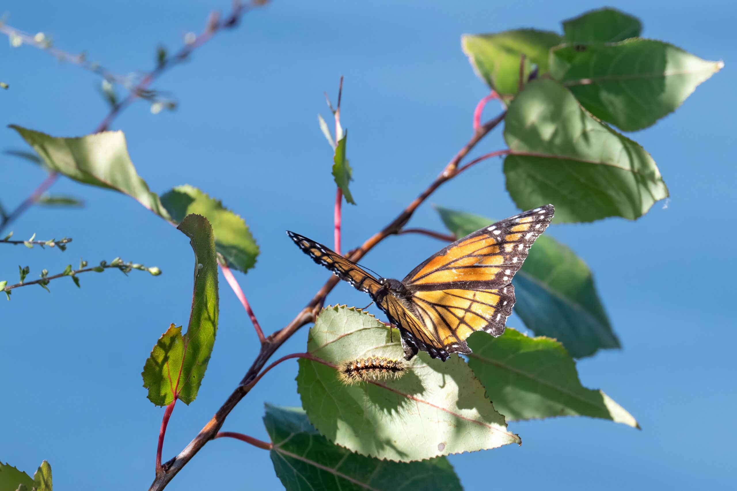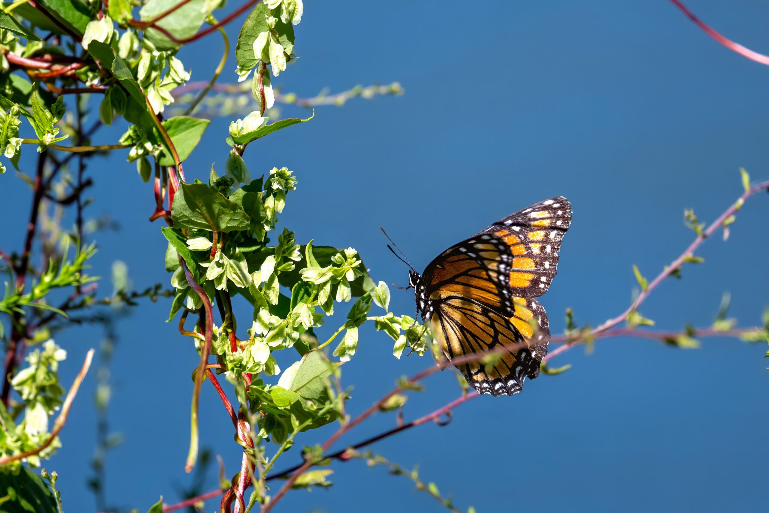 ID tips: Monarch has copious white spotting on the head and thorax (front part of main body) that Viceroy lacks; Monarch larger in size.