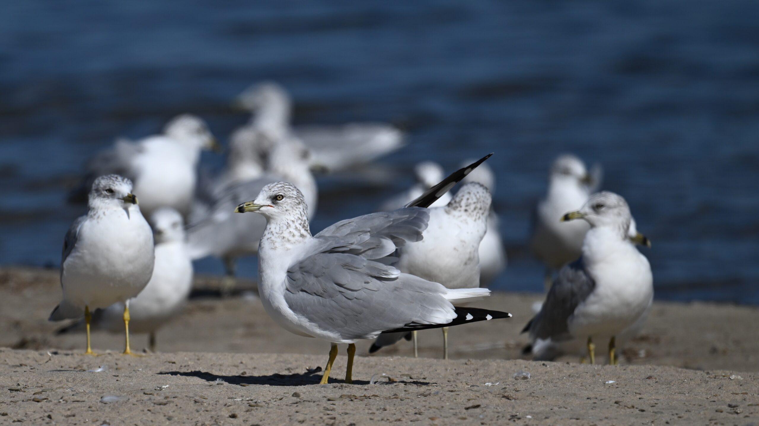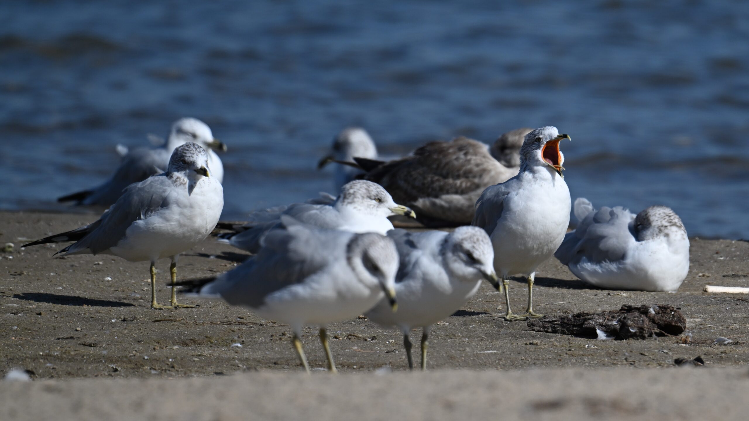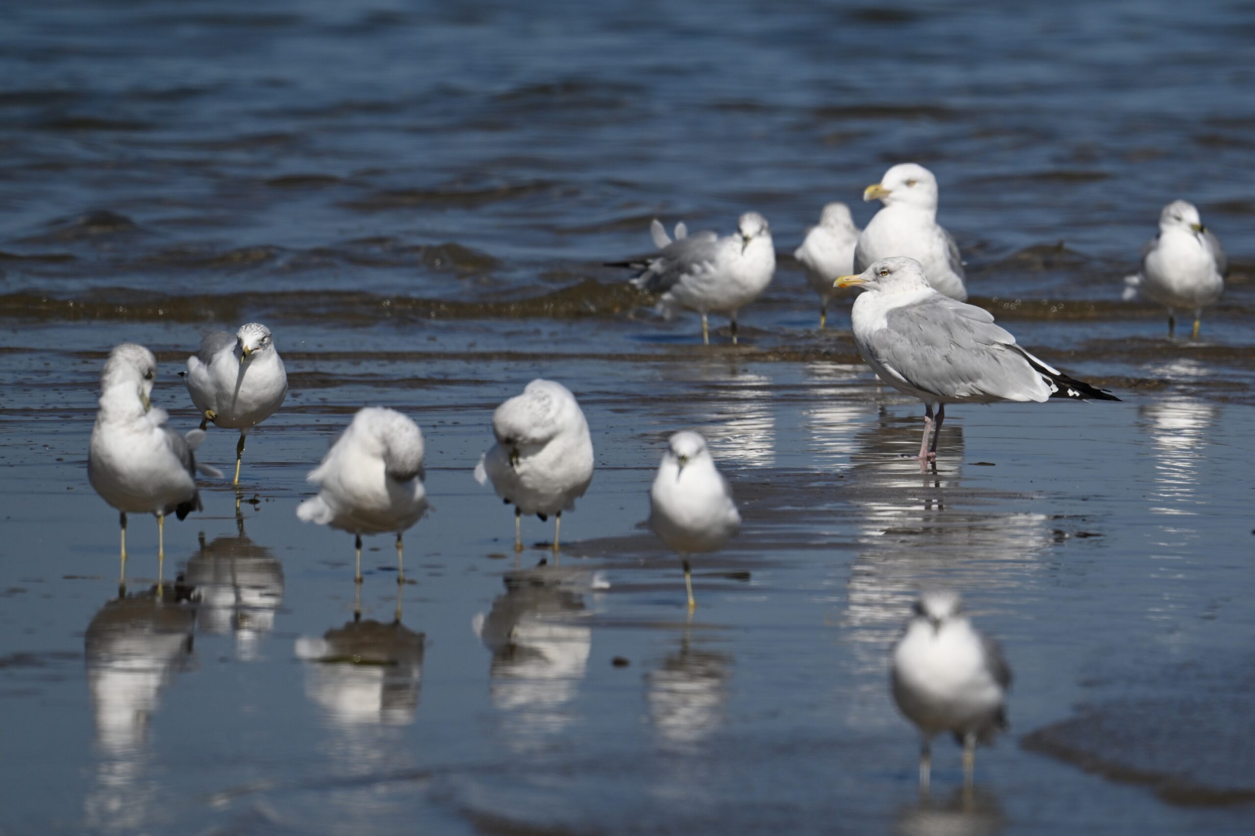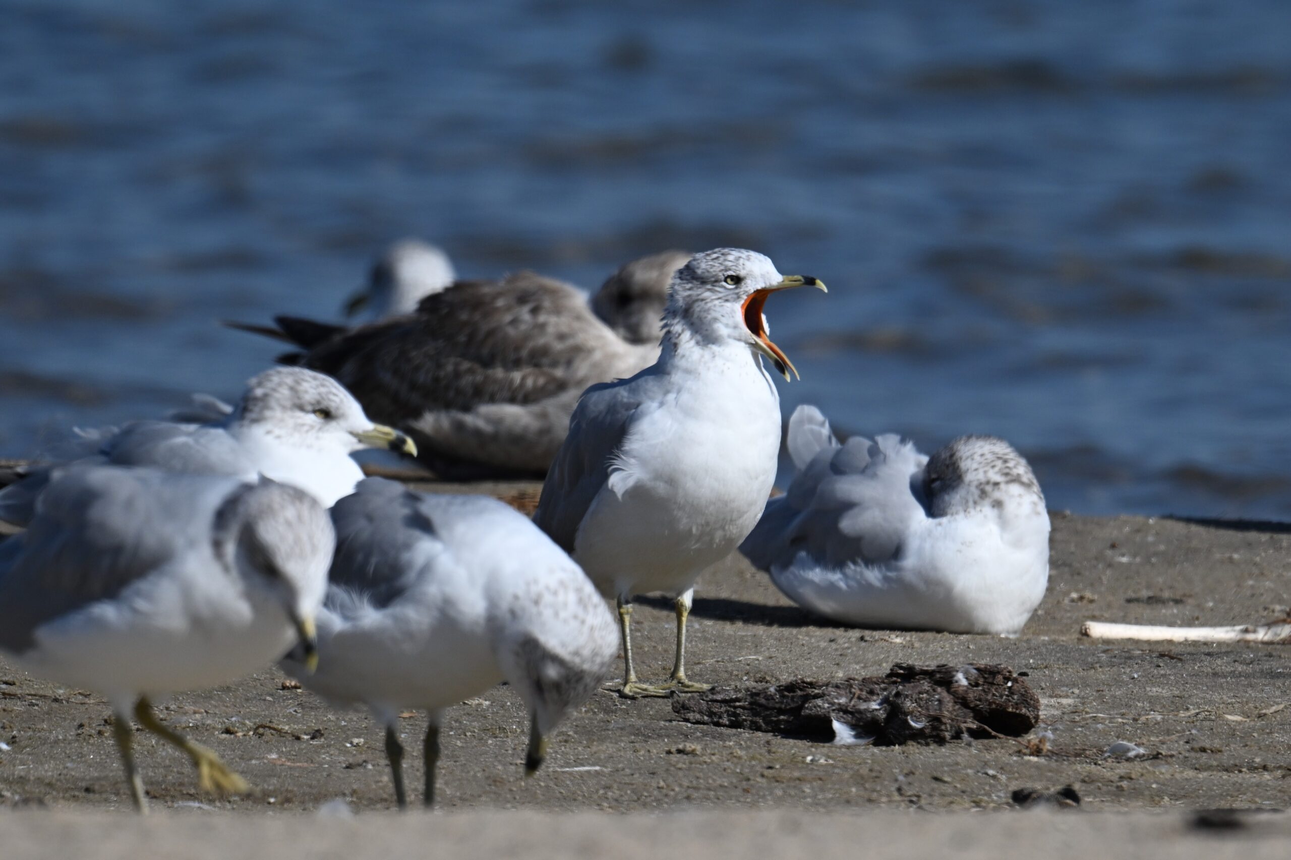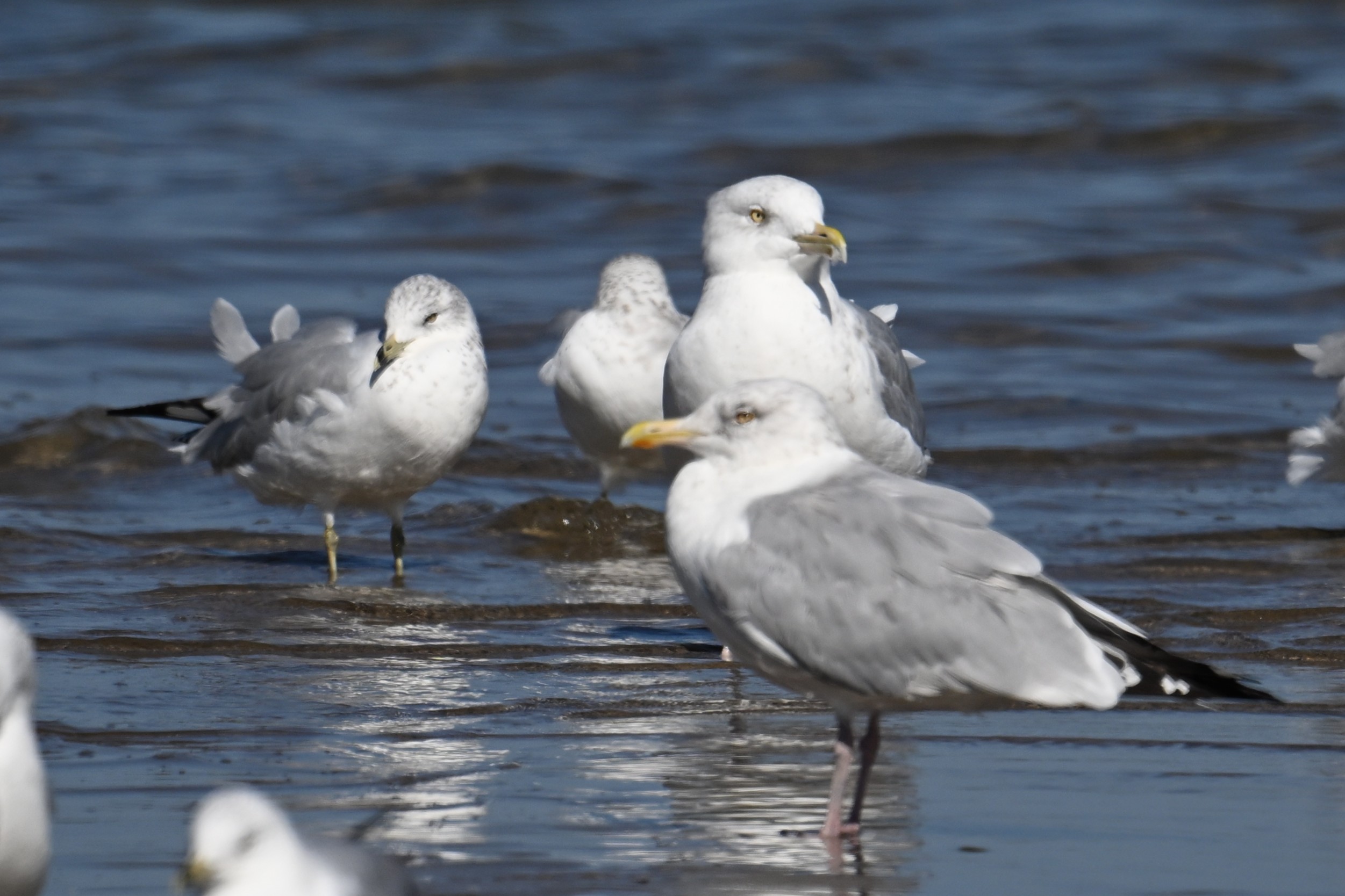 Seems like folks are always clamouring for more gull photographs, so today it’s a nice medley of gulls @ Beach No. 11 (Presque Isle State Park) plus “not that often easily photographed together” male and female Northern Cardinal same date/location (just within the tree line):