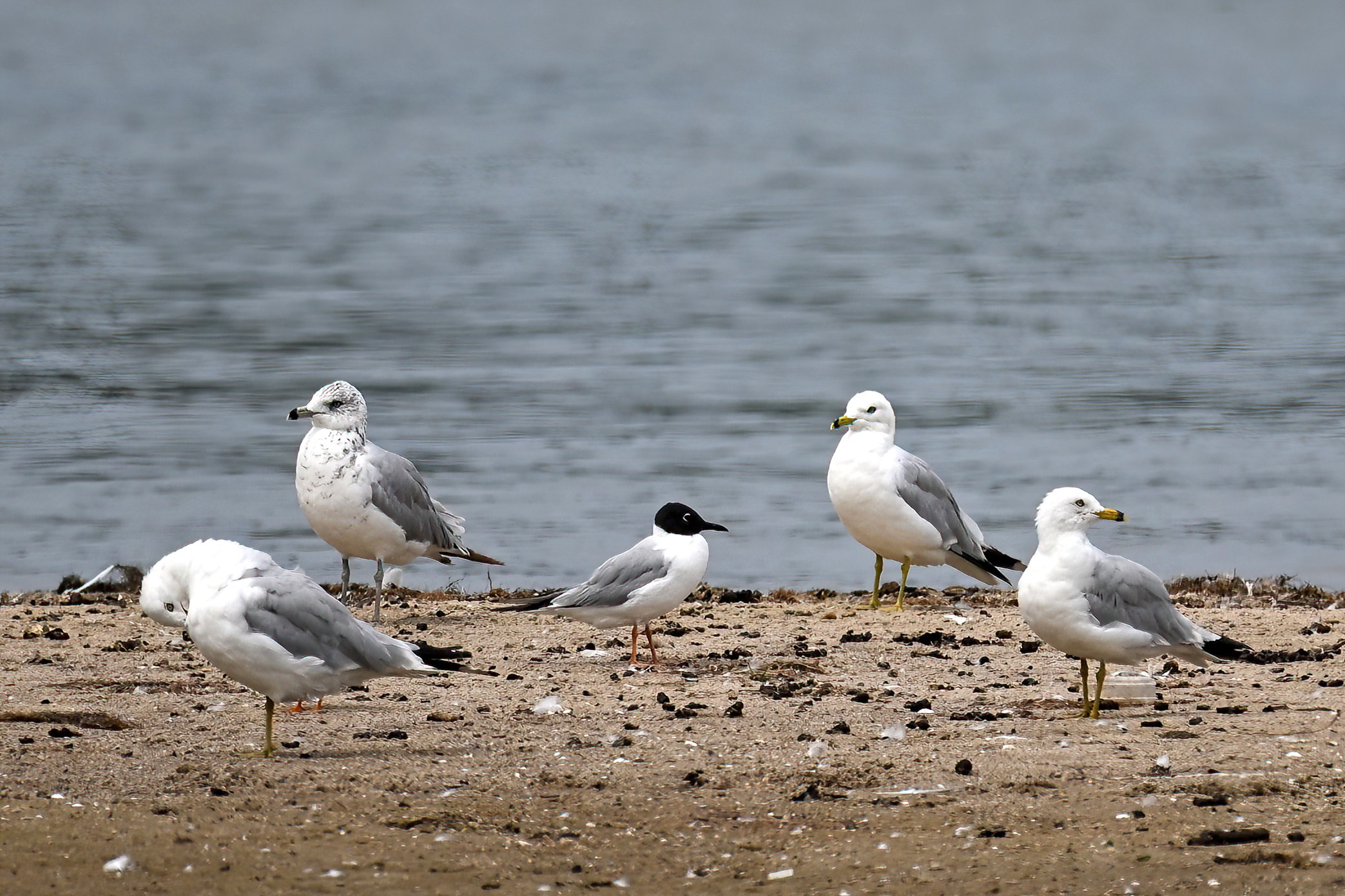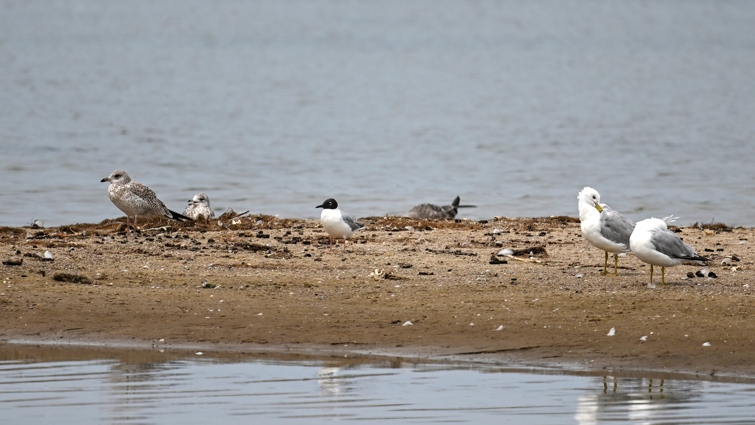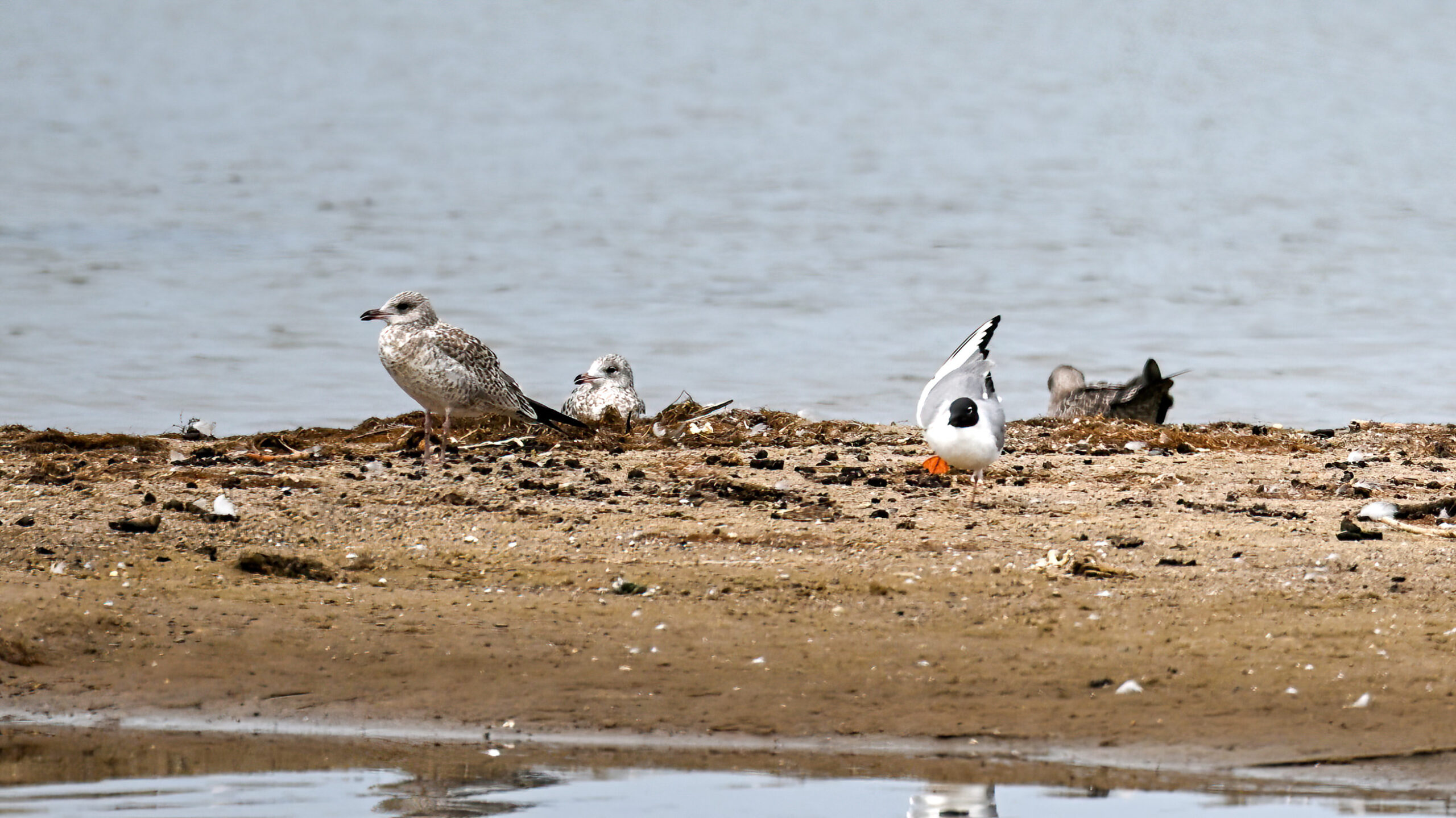 Bonaparte’s Gull (breeding plumage adult) ID: black head, white eye crescents, black bill, and light orange/red legs.